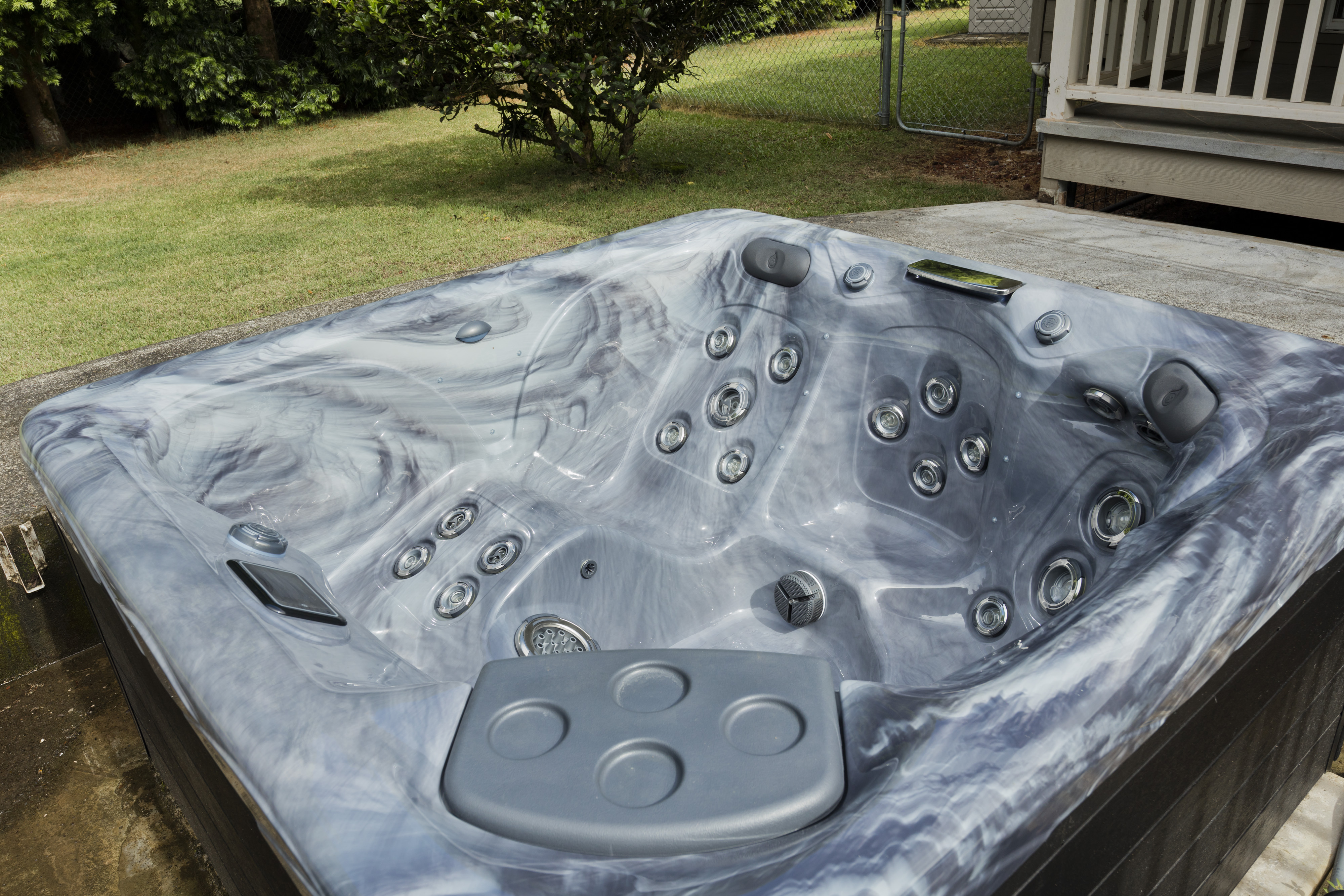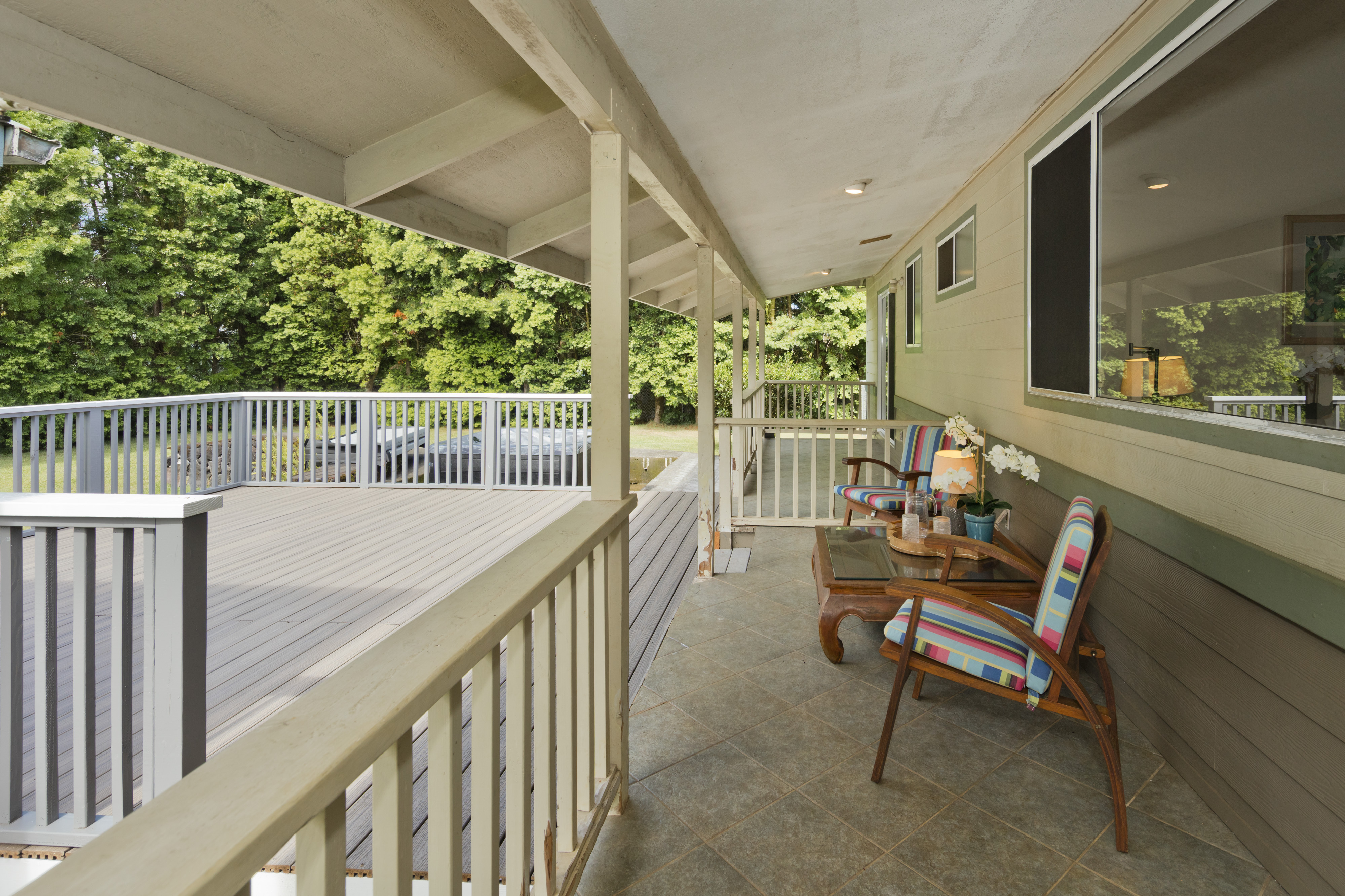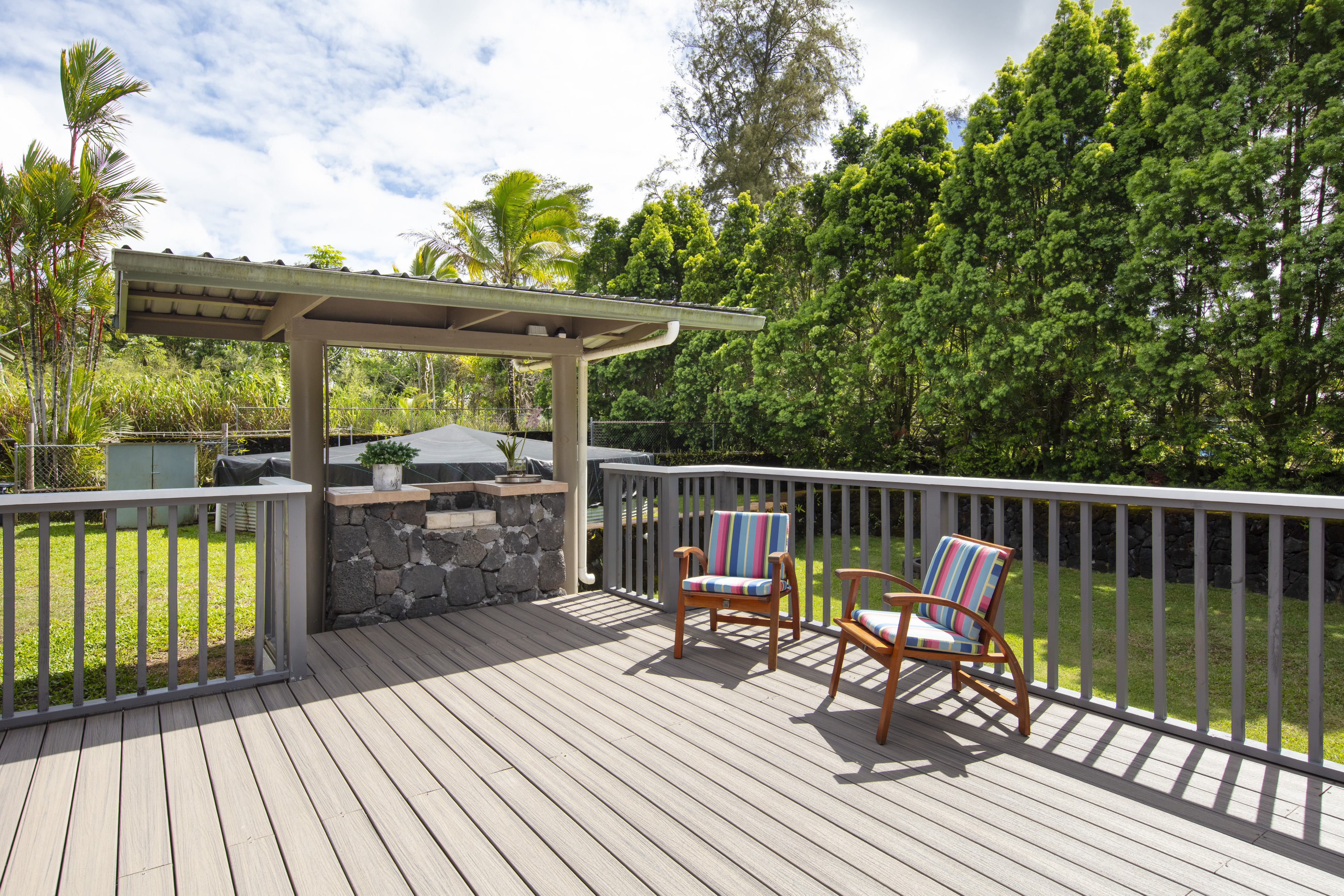 The home is accessed via a tasteful driveway, curved to enhance privacy and guide you to your home toward the rear of your property for more seclusion. A new deck invites outdoor living day or night, with a six-month-new hot tub perfect for soaking under a starlit sky. The back lanai, with a lava rock BBQ, elevates your everyday living, effortlessly blending indoor and outdoor spaces.