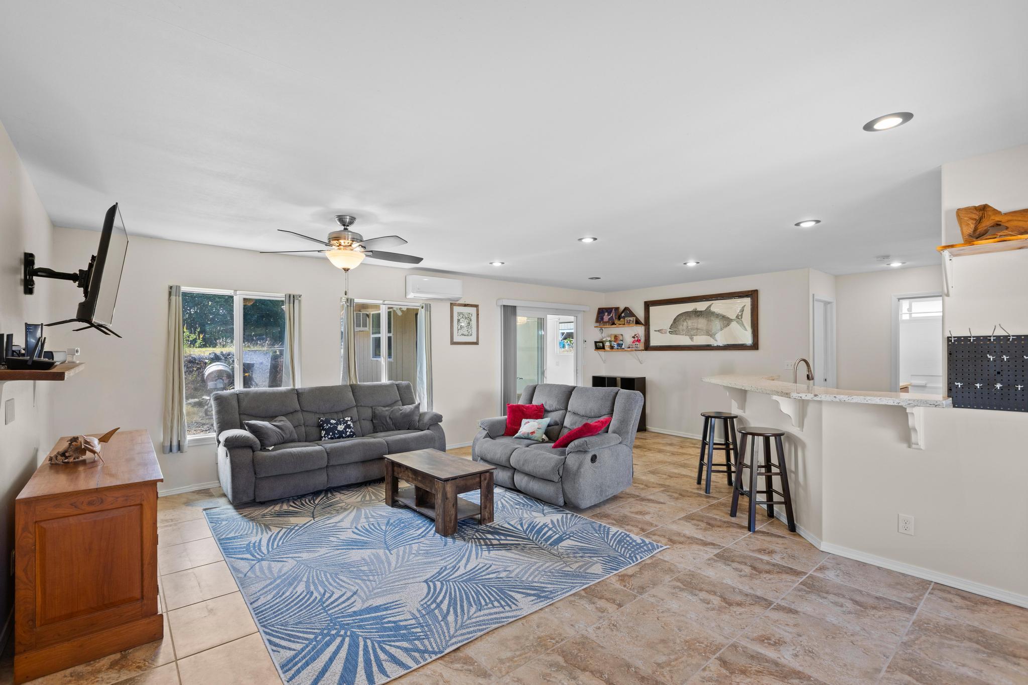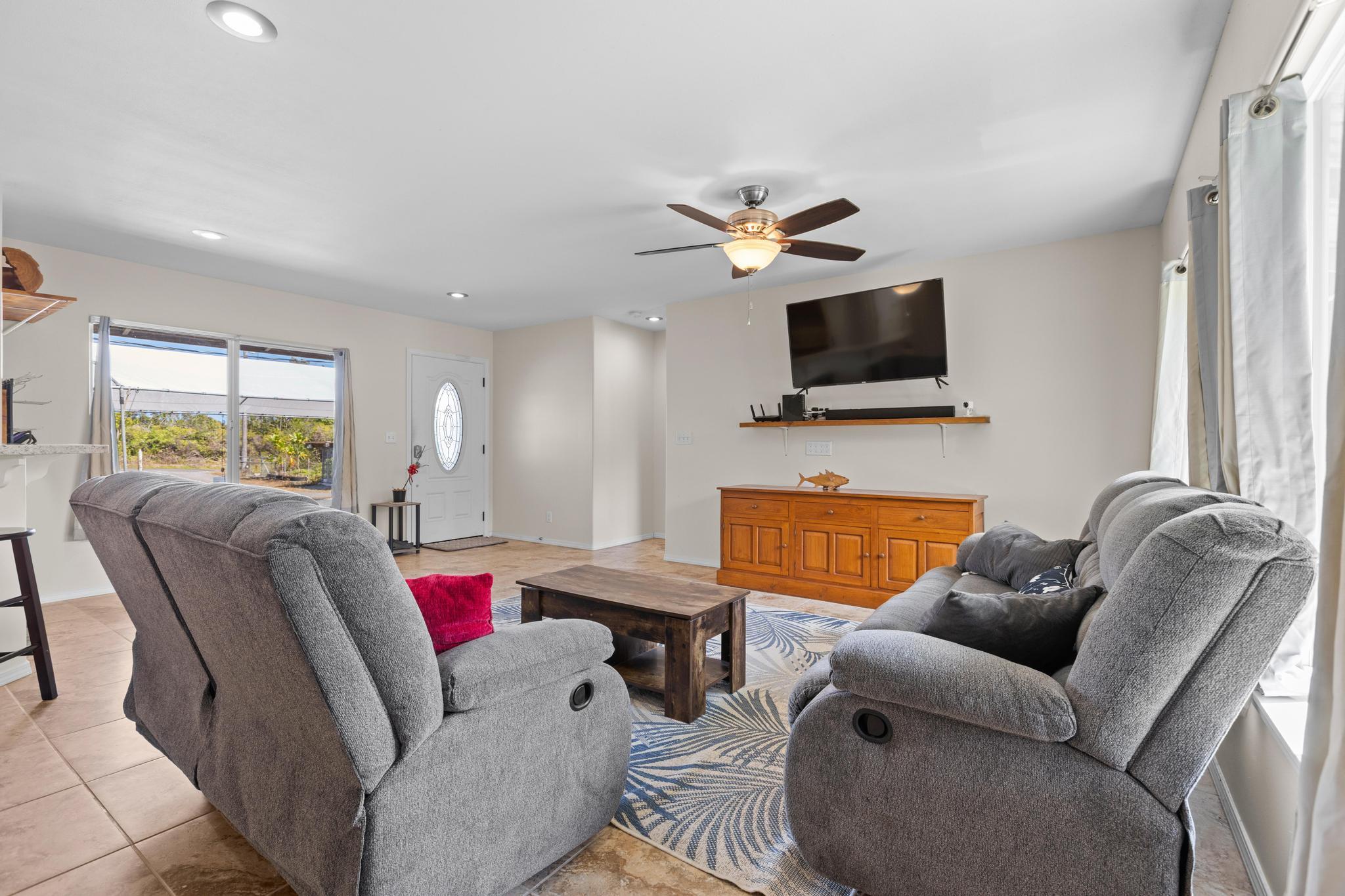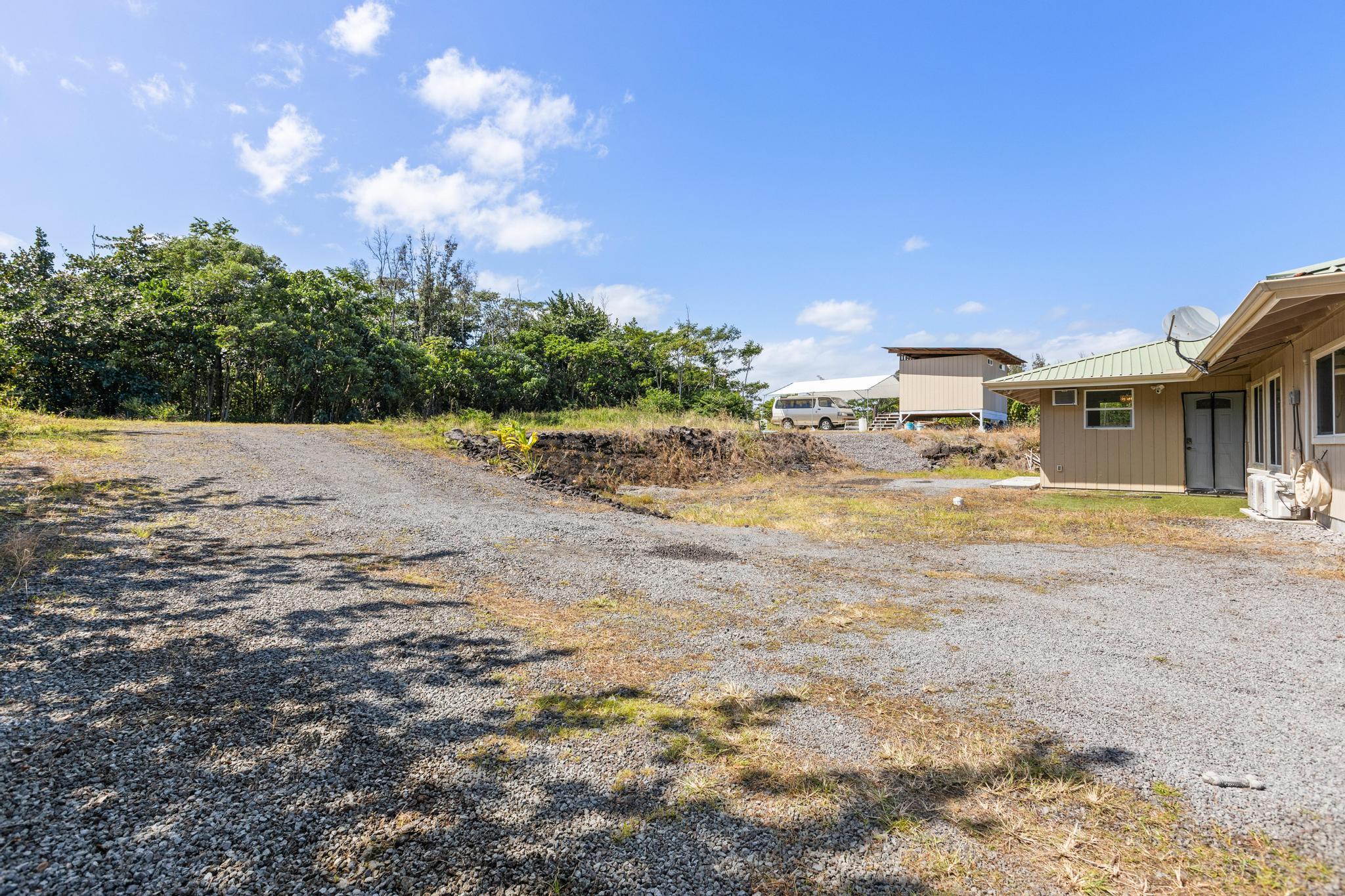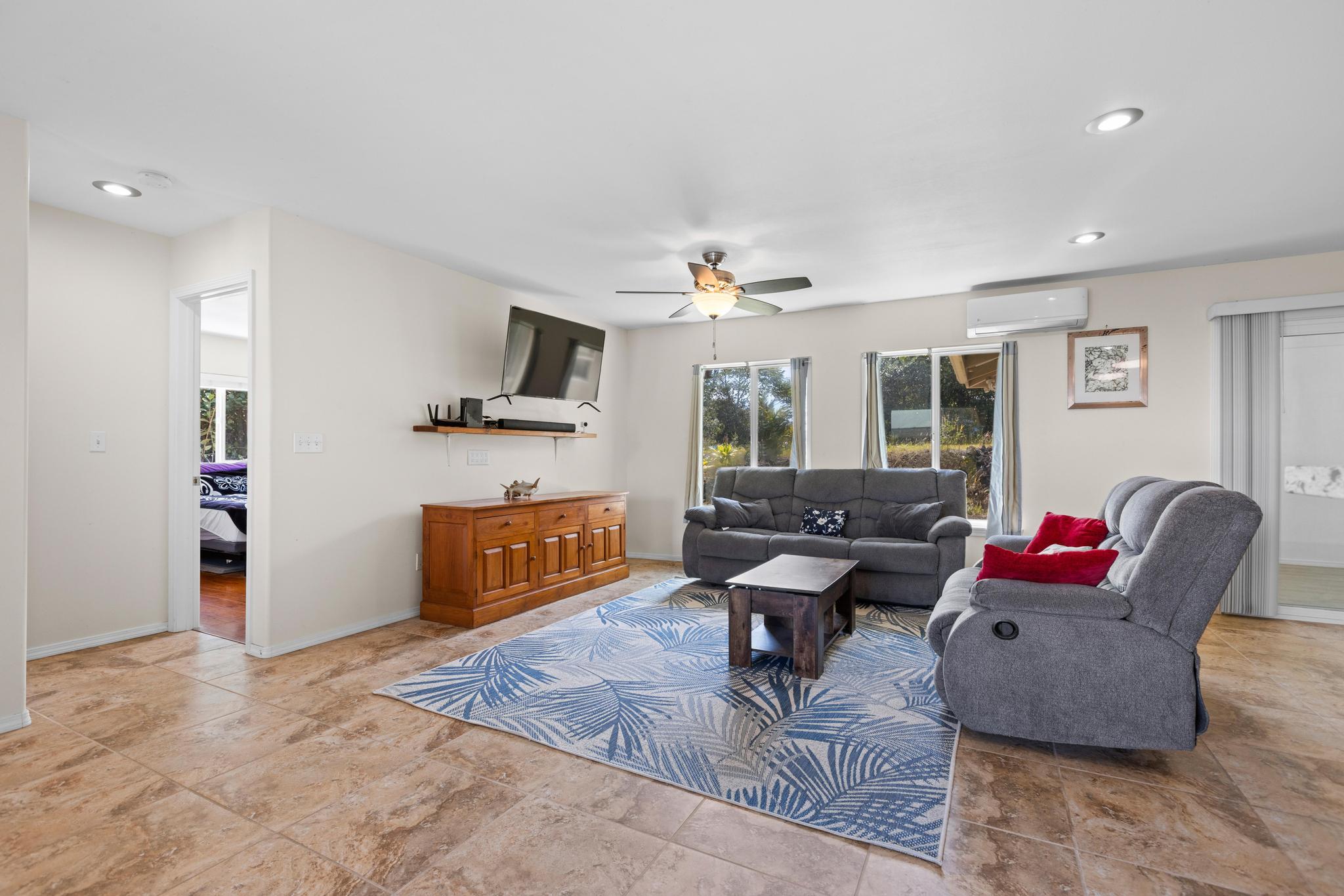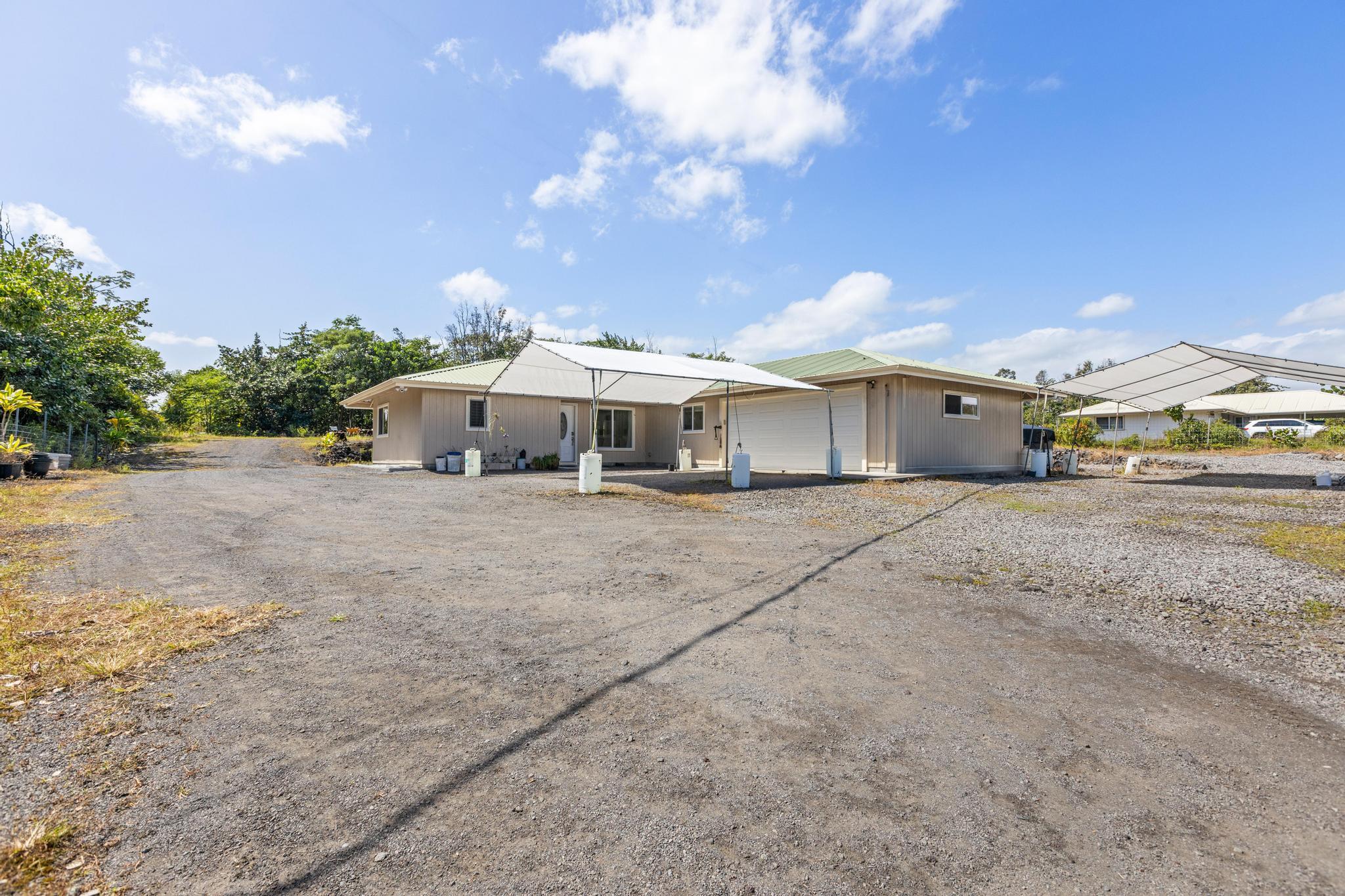 Welcome to this thoughtfully designed home, set on a fully fenced and gated lot in with a security system for added peace of mind. From the moment you arrive, this property offers comfort, functionality, and room to grow. The spacious living and dining areas feature large windows that invite in warm natural sunlight, recessed lighting, and a wide-open feel ideal for everyday living or entertaining. The kitchen is both stylish and practical with a 20 x 20 tiled floor, stainless steel refrigerator, dishwasher, microwave, and gas stove all included, creating a clean, modern workspace that flows seamlessly into the main living areas. Matching 20 x 20 tile flooring continues through the living room and bathrooms for a cohesive look and easy maintenance. The primary bedroom is a relaxing retreat with split air conditioning and a deep walk-in closet offering ample storage. The en suite bathroom is beautifully finished with quartz countertops, his-and-hers basins, elegant cabinetry, a large mirror, and a wide shower stall with two built-in seats. A second bathroom features a bathtub and a convenient storage closet, perfect for guests or family. An enclosed lanai with its own AC provides versatile additional space–ideal for a home office, gym, or lounge. The indoor laundry room includes a pocket door to maximize space and functionality. Additional highlights include split AC in the living area, an on-demand water heater, and a two-car garage with generous storage space that also houses the pressure tank and pump. Outside, the property continues to impress with a storage building and a second house pad located at the back of the lot, offering exciting potential for future expansion. With privacy, upgrades, and flexibility all in one, this Kea?au property is ready to welcome you home.