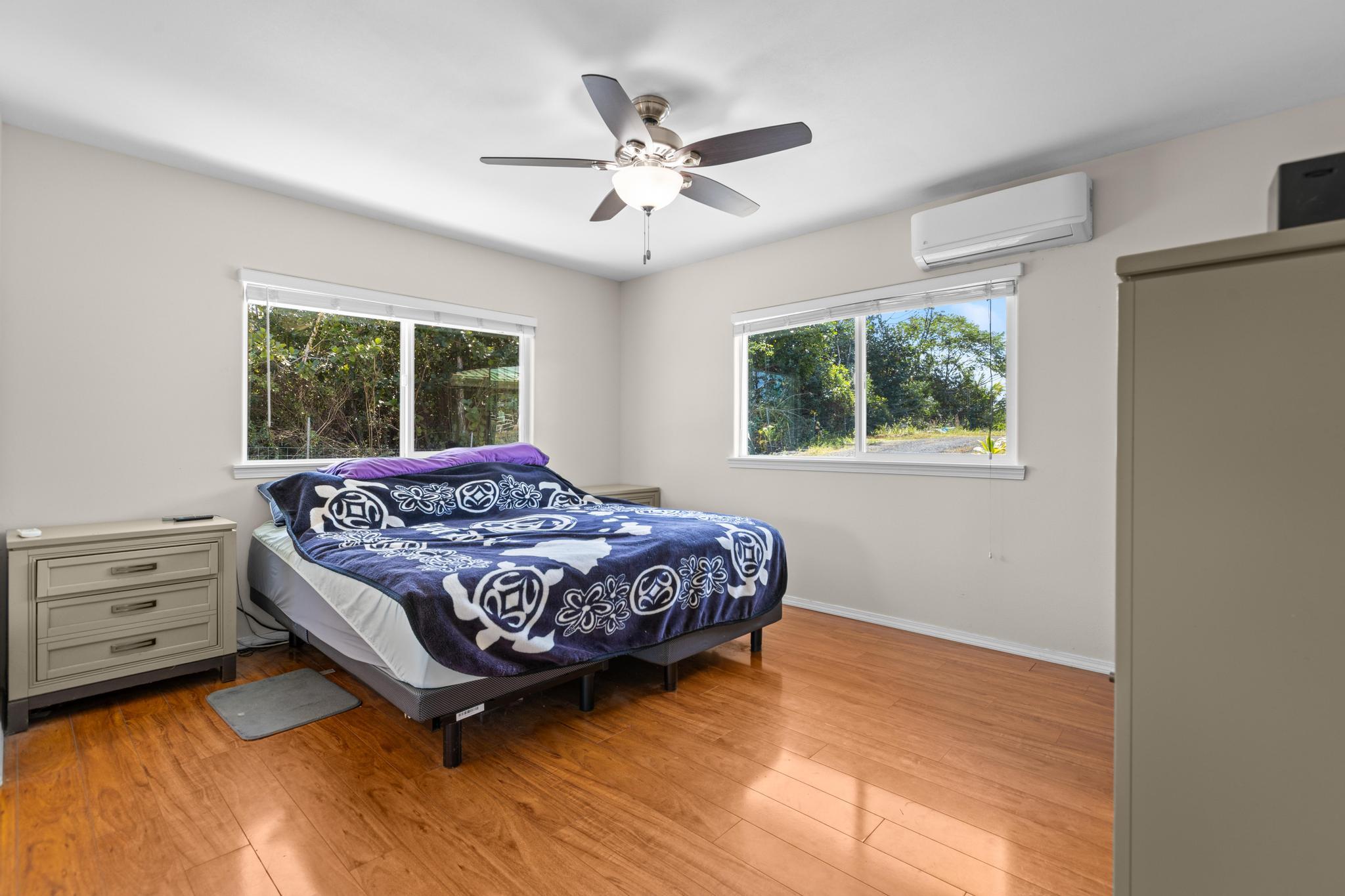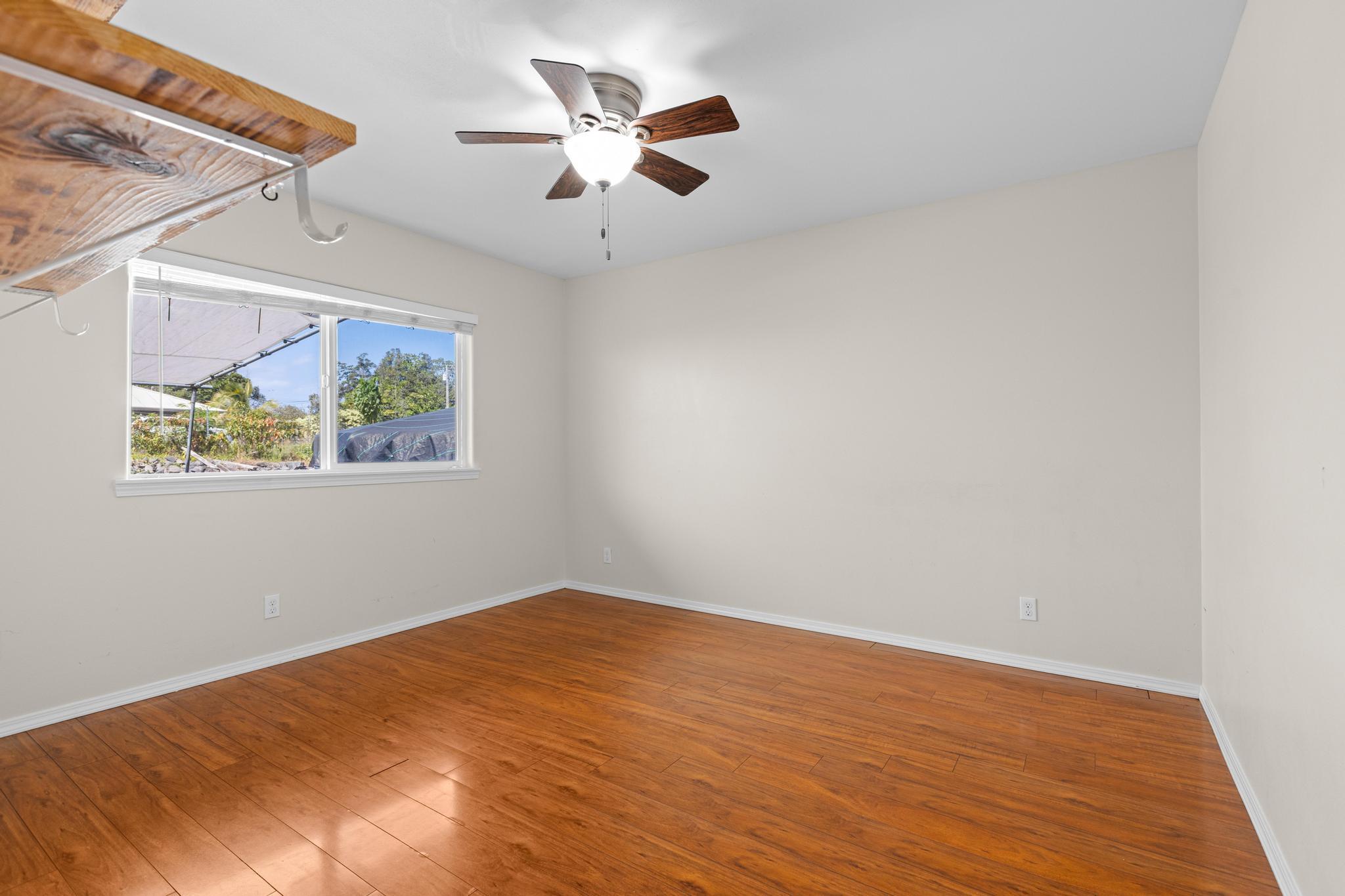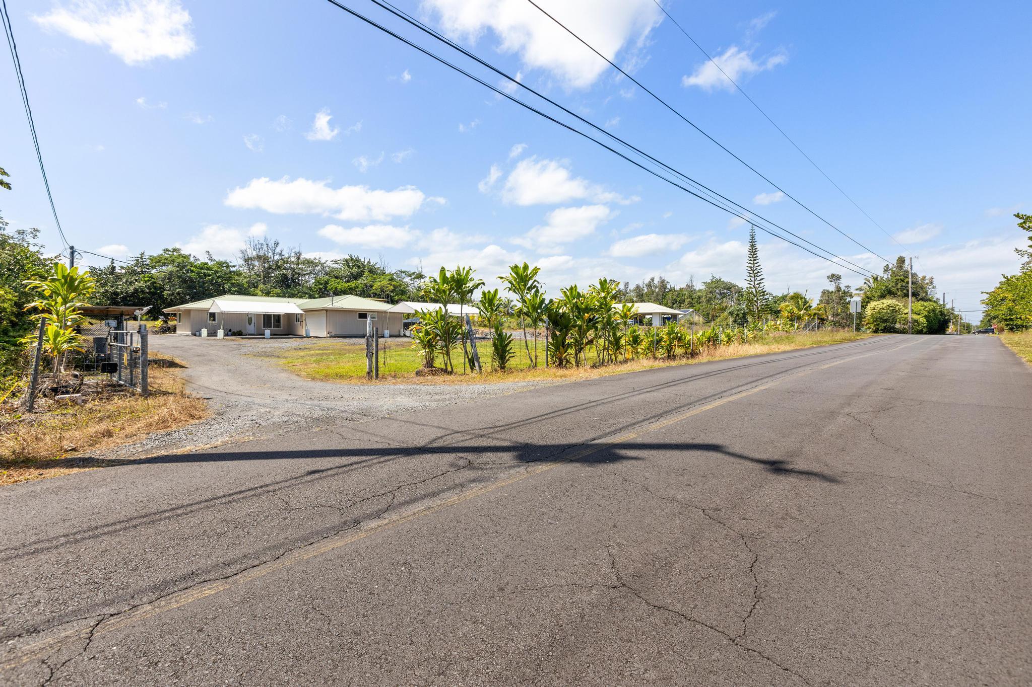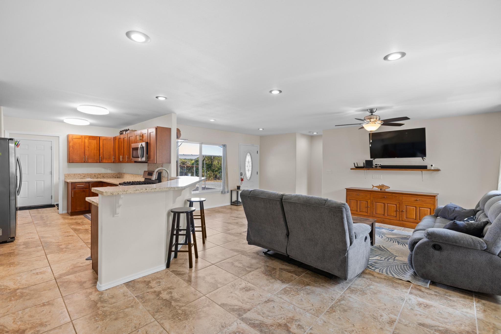 Welcome to this thoughtfully designed home, set on a fully fenced and gated lot in with a security system for added peace of mind. From the moment you arrive, this property offers comfort, functionality, and room to grow. The spacious living and dining areas feature large windows that invite in warm natural sunlight, recessed lighting, and a wide-open feel ideal for everyday living or entertaining. The kitchen is both stylish and practical with a 20 x 20 tiled floor, stainless steel refrigerator, dishwasher, microwave, and gas stove all included, creating a clean, modern workspace that flows seamlessly into the main living areas. Matching 20 x 20 tile flooring continues through the living room and bathrooms for a cohesive look and easy maintenance. The primary bedroom is a relaxing retreat with split air conditioning and a deep walk-in closet offering ample storage. The en suite bathroom is beautifully finished with quartz countertops, his-and-hers basins, elegant cabinetry, a large mirror, and a wide shower stall with two built-in seats. A second bathroom features a bathtub and a convenient storage closet, perfect for guests or family. An enclosed lanai with its own AC provides versatile additional space–ideal for a home office, gym, or lounge. The indoor laundry room includes a pocket door to maximize space and functionality. Additional highlights include split AC in the living area, an on-demand water heater, and a two-car garage with generous storage space that also houses the pressure tank and pump. Outside, the property continues to impress with a storage building and a second house pad located at the back of the lot, offering exciting potential for future expansion. With privacy, upgrades, and flexibility all in one, this Kea?au property is ready to welcome you home.