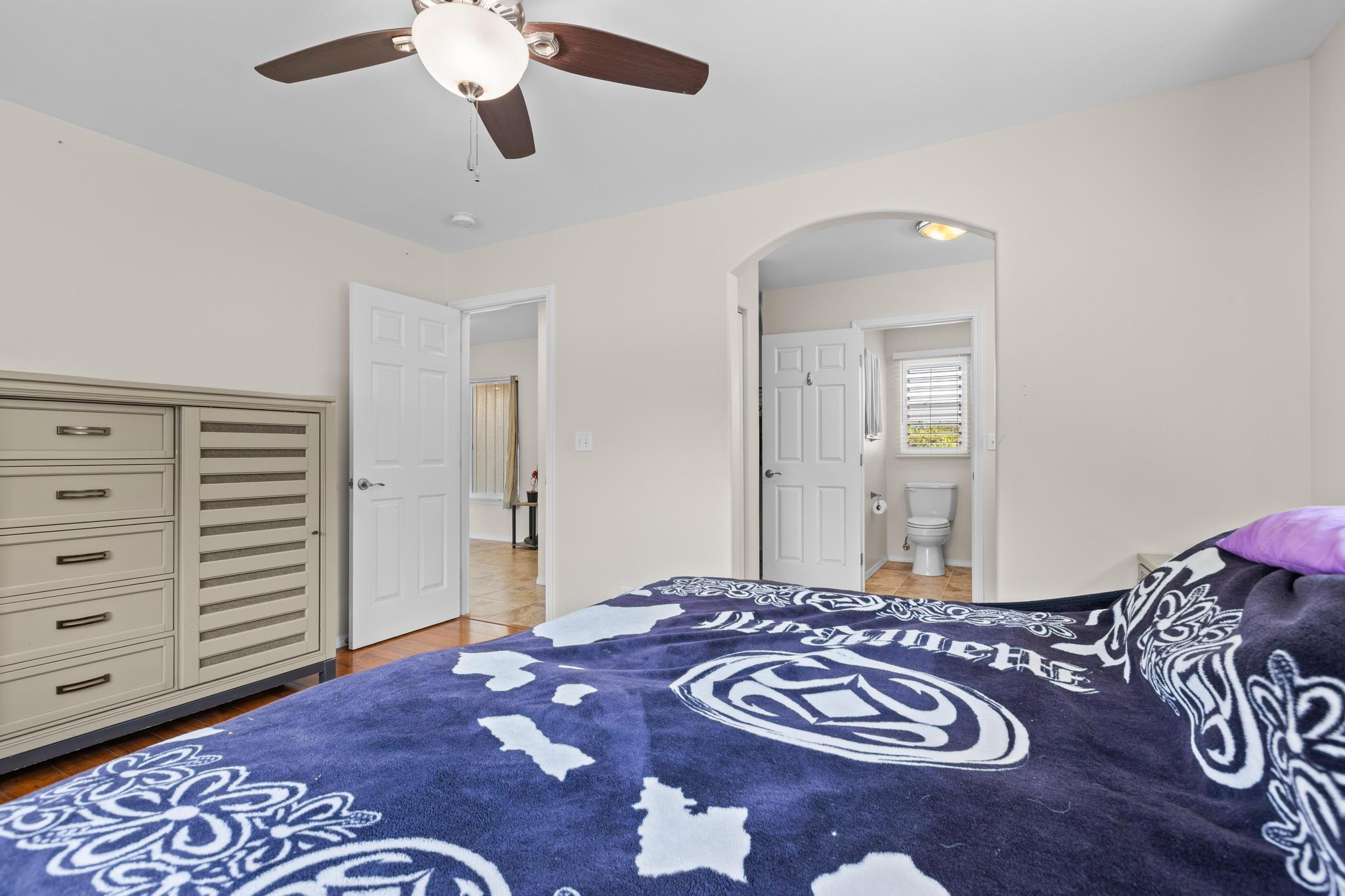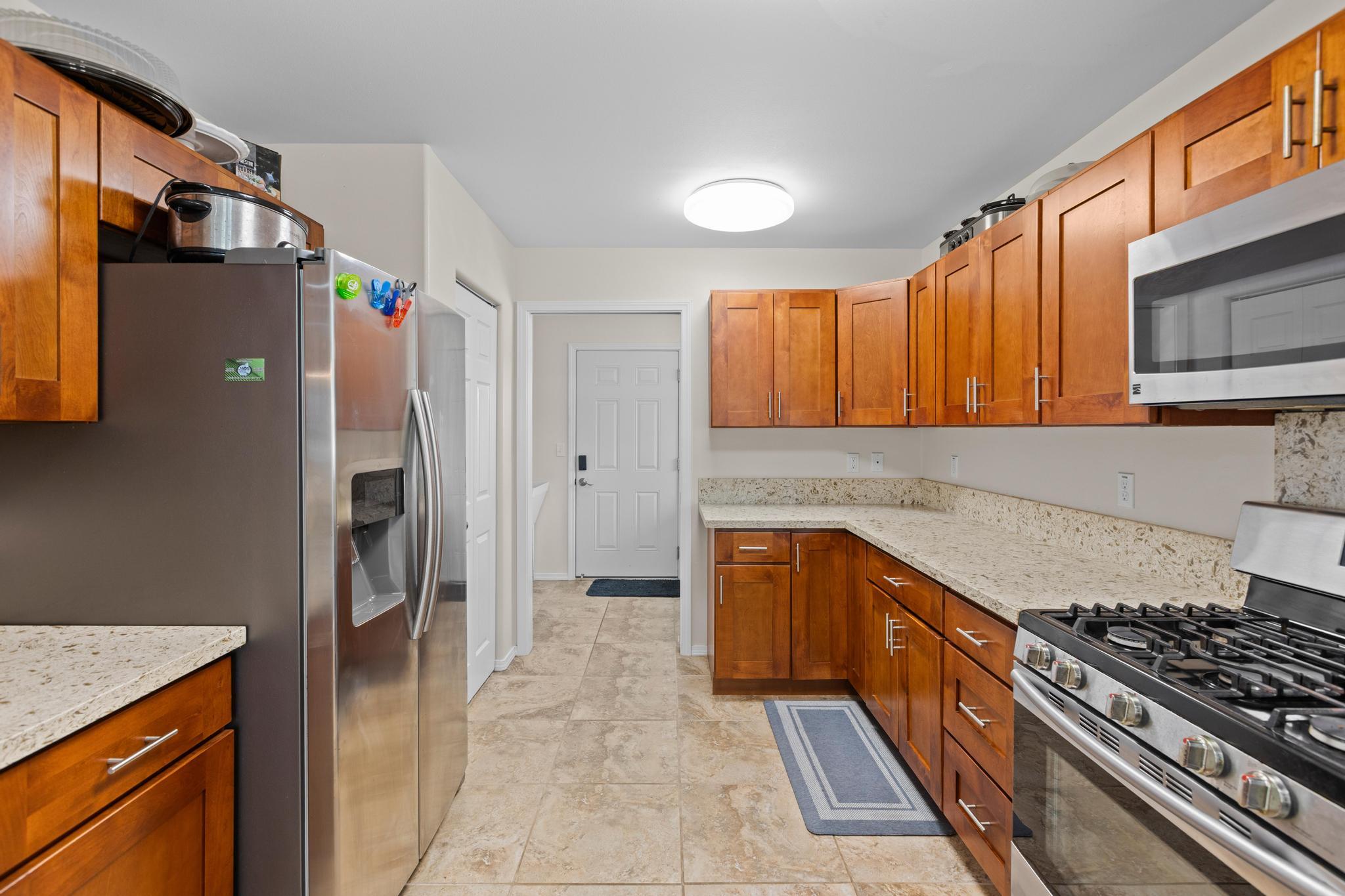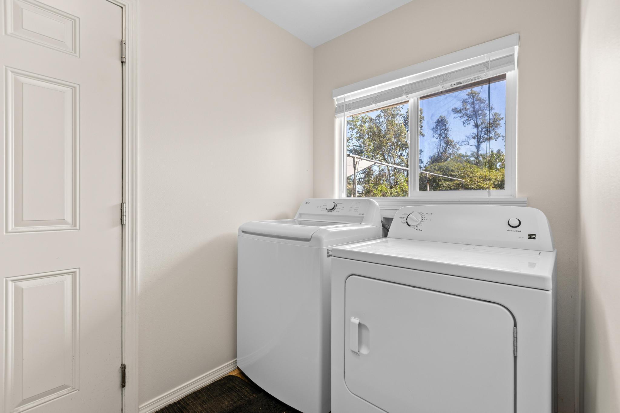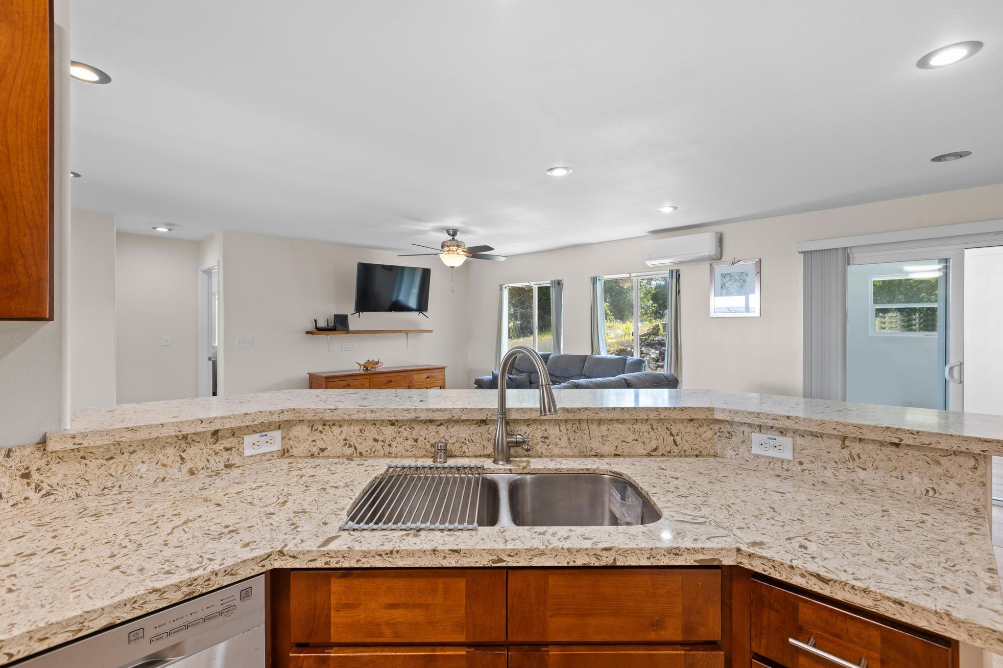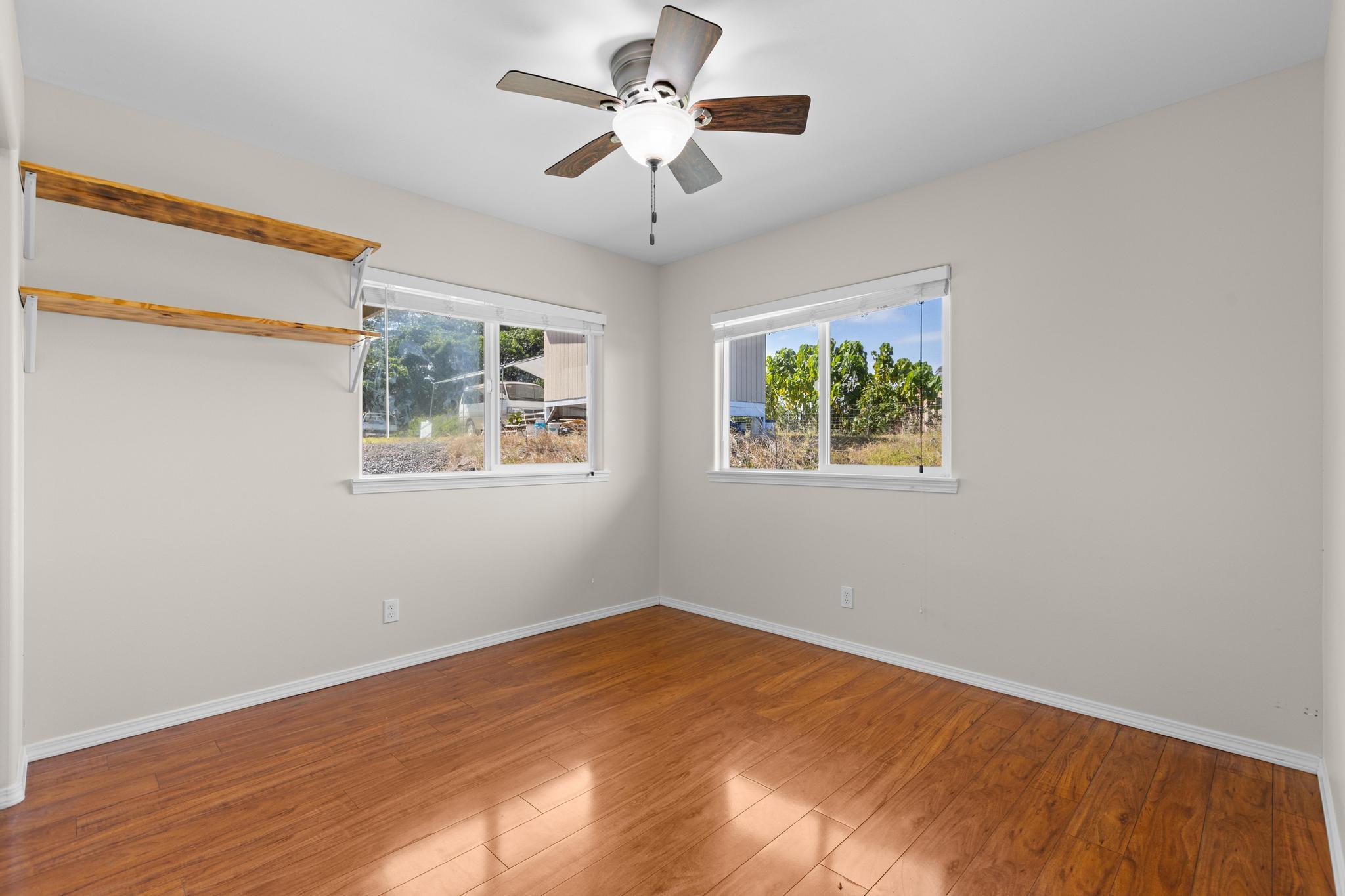 Welcome to this thoughtfully designed home, set on a fully fenced and gated lot in with a security system for added peace of mind. From the moment you arrive, this property offers comfort, functionality, and room to grow. The spacious living and dining areas feature large windows that invite in warm natural sunlight, recessed lighting, and a wide-open feel ideal for everyday living or entertaining. The kitchen is both stylish and practical with a 20 x 20 tiled floor, stainless steel refrigerator, dishwasher, microwave, and gas stove all included, creating a clean, modern workspace that flows seamlessly into the main living areas. Matching 20 x 20 tile flooring continues through the living room and bathrooms for a cohesive look and easy maintenance. The primary bedroom is a relaxing retreat with split air conditioning and a deep walk-in closet offering ample storage. The en suite bathroom is beautifully finished with quartz countertops, his-and-hers basins, elegant cabinetry, a large mirror, and a wide shower stall with two built-in seats. A second bathroom features a bathtub and a convenient storage closet, perfect for guests or family. An enclosed lanai with its own AC provides versatile additional space–ideal for a home office, gym, or lounge. The indoor laundry room includes a pocket door to maximize space and functionality. Additional highlights include split AC in the living area, an on-demand water heater, and a two-car garage with generous storage space that also houses the pressure tank and pump. Outside, the property continues to impress with a storage building and a second house pad located at the back of the lot, offering exciting potential for future expansion. With privacy, upgrades, and flexibility all in one, this Kea?au property is ready to welcome you home.
