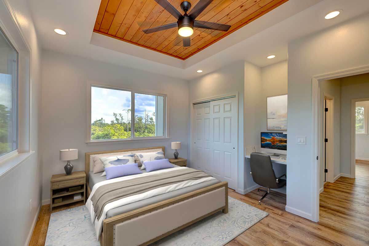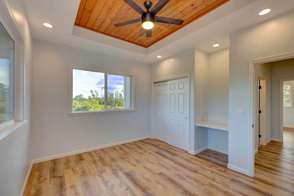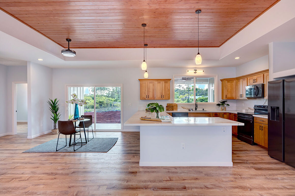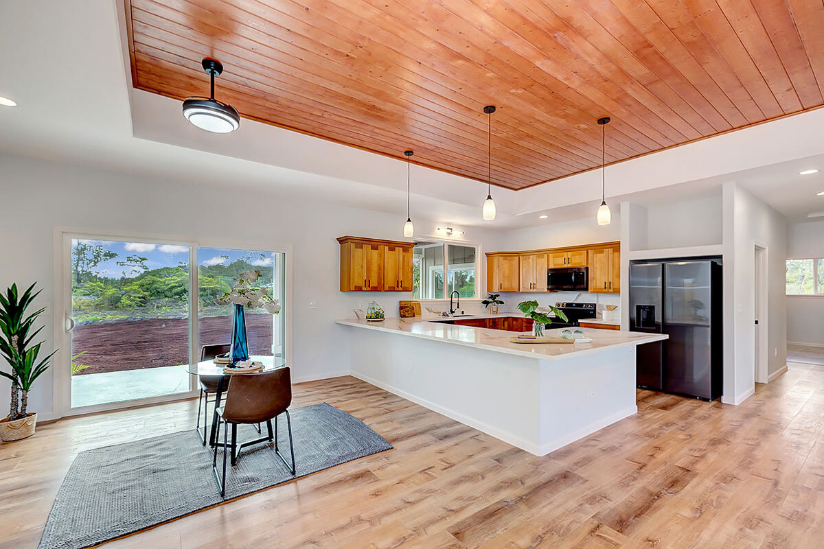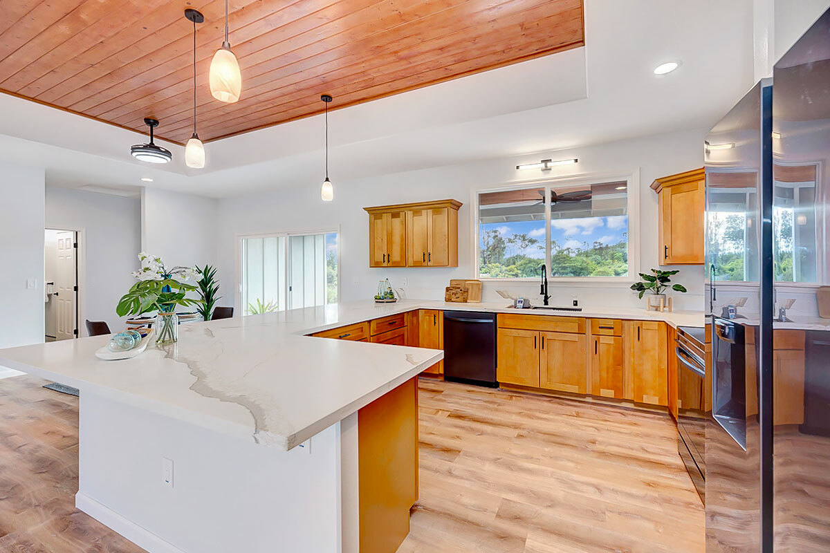 Discover an exceptional opportunity in the oceanside community of Hawaiian Paradise Park on the East side of the Big Island of Hawai?i. This custom-built, single-level home offers 1,973 square feet of thoughtfully designed living space on a private 1-acre lot along 2nd Avenue, surrounded by other quality custom homes and located just a short distance from the ocean. This inviting residence features 3 spacious bedrooms and 2.5 bathrooms. The primary suite is a true retreat, offering a large en-suite bathroom with a large walk-in shower accented by custom tile to the ceiling, private water closet area, and dual sinks. The generous walk-in closet provides excellent storage. The open, split floor plan enhances privacy and comfort, with the two guest bedrooms featuring large picture windows with greenery views, and one with a built-in desk area–ideal for guests or a home office. The well-appointed kitchen showcases shaker-style wood cabinetry, stainless steel appliances, quartz countertops, and a large island with pendant lighting and bar seating, making it perfect for everyday living and entertaining. There is an extra-large panty you will love! Interior features include nine-foot walls with soffit ceilings, tongue-and-groove pine ceiling accents, recessed lighting, and durable vinyl and ceramic flooring throughout. Step outside to a large covered back lanai, offering a peaceful space to relax and enjoy the surroundings. Practical amenities include a spacious attached two-car garage with additional storage, a finished floor and a 220-volt electric charger. There is a large, dedicated laundry room with more storage. The home is serviced by a private well with UV water filtration, features Certified Presidential Shingle roofing for longevity, and Smart Board siding for durability. The expansive one-acre lot provides a blank canvas to create your own tropical oasis while enjoying proximity to the ocean and the lifestyle Hawaiian Paradise Park has to offer.