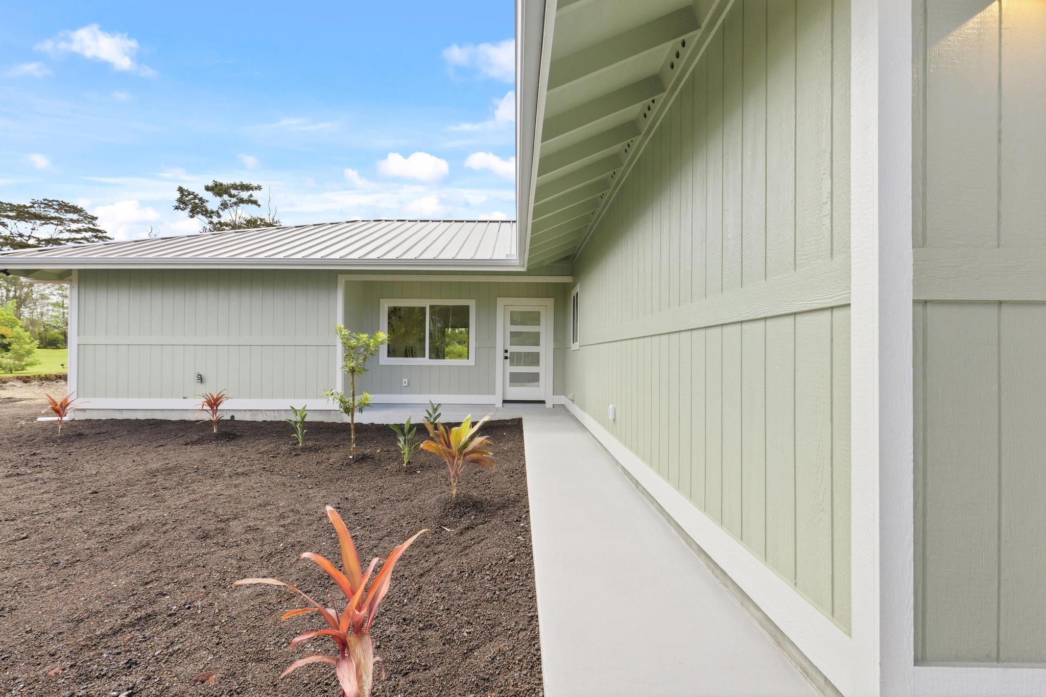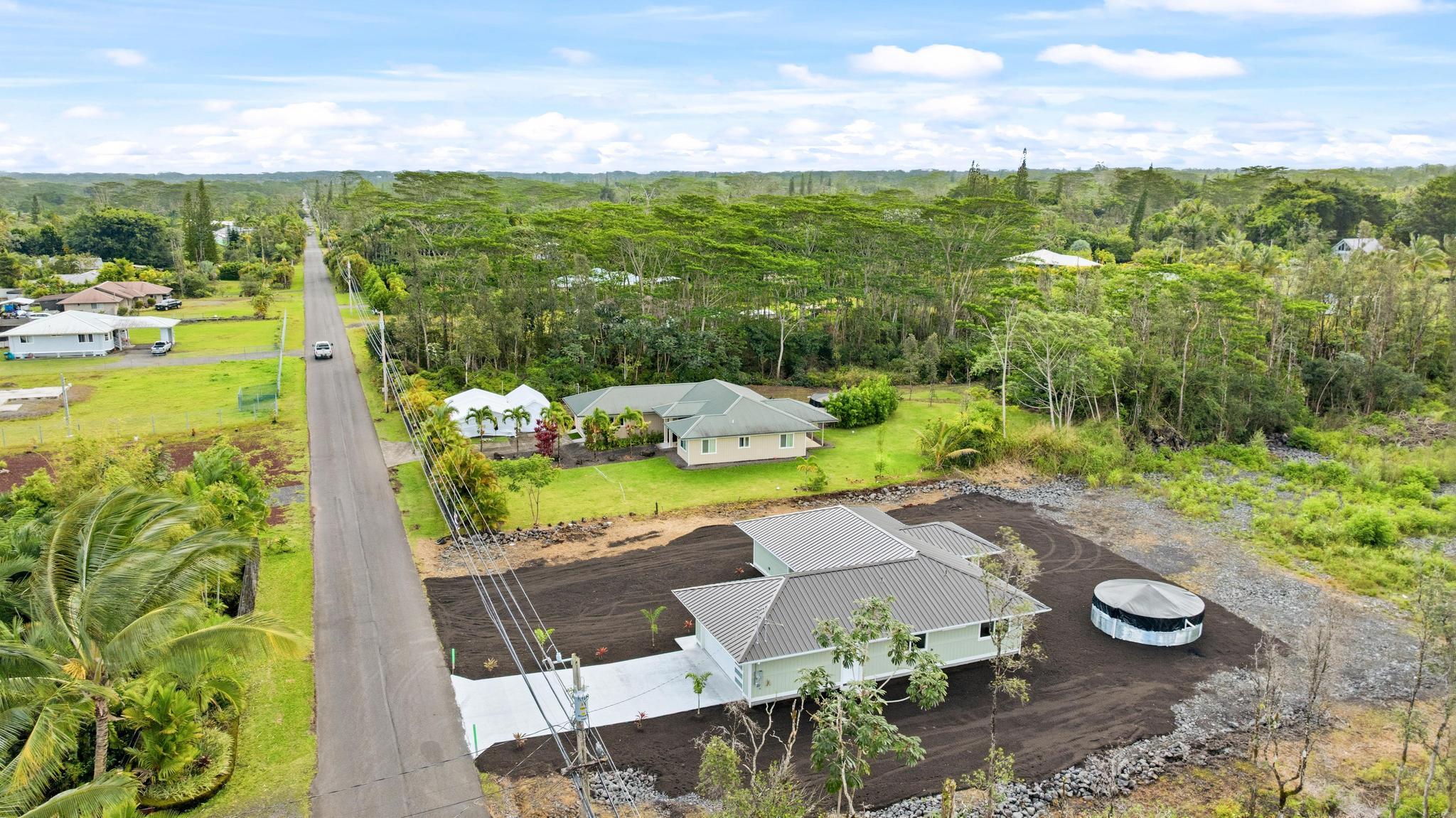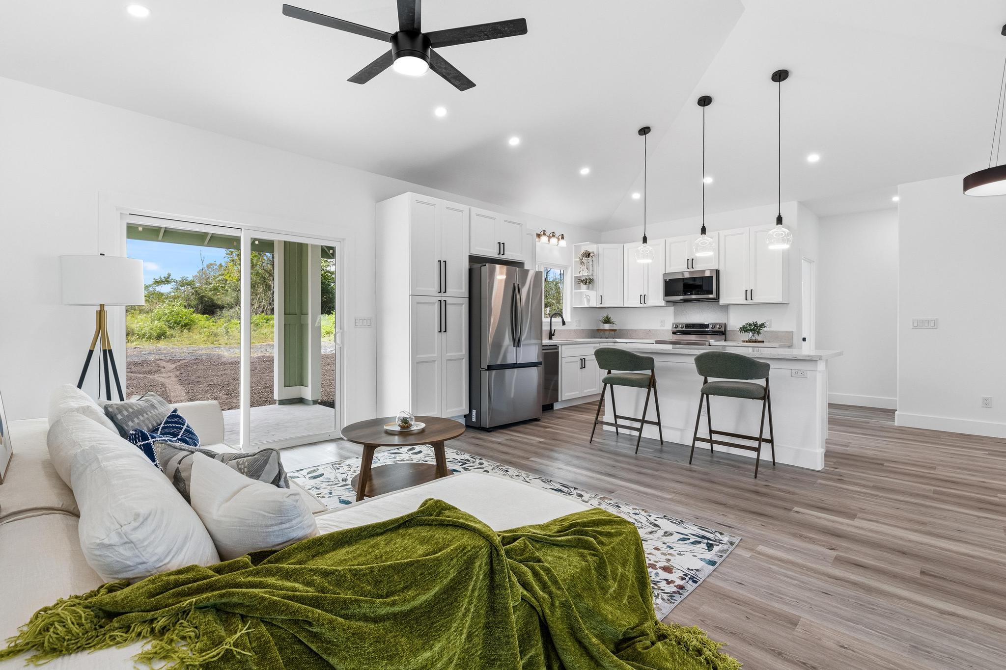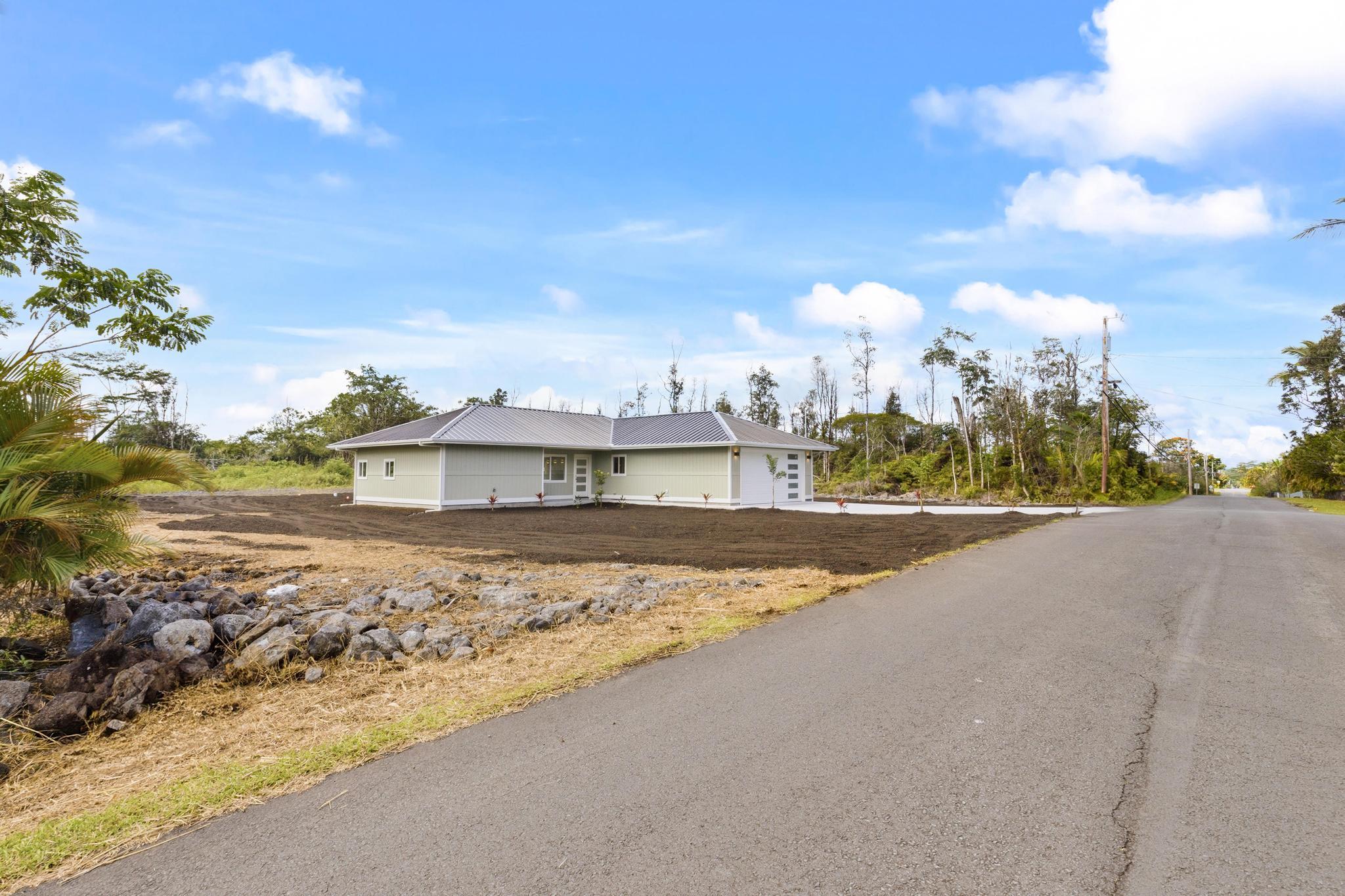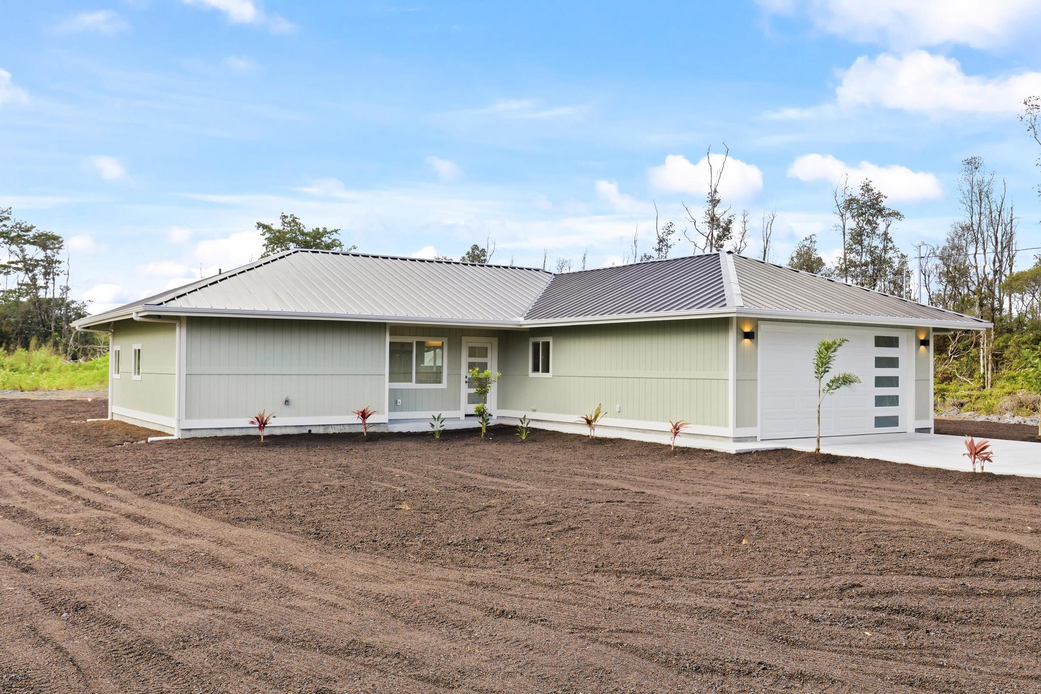 Experience the perfect blend of modern design and island living in this newly built 3 bedroom, 2 bathroom residence with a spacious two car garage, set on a full acre in Hawaiian Paradise Park. A concrete driveway and freshly planted landscaping create a welcoming first impression and beautiful curb appeal. Inside, the home opens to a light filled open concept living space designed for seamless flow and comfort. The kitchen is both functional and stunning, featuring quartz countertops, an expansive island with pendant lighting, an oversized sink, and brand new stainless steel appliances. Sliding glass doors lead to a covered lanai and generous backyard, creating effortless indoor outdoor living. A well appointed laundry room includes a washer, utility sink, and abundant cabinetry, with direct access to the oversized garage offering additional storage. Two spacious guest bedrooms are positioned near a beautifully finished guest bath with a tiled tub surround and modern lighted mirror. Privately located on the opposite wing of the home, the primary suite is exceptionally large and offers a spa inspired bath with dual vanities, lighted mirrors, an oversized open concept walk in shower, and a walk in closet. Set on a full acre, this property offers space, privacy, and endless potential while enjoying the comfort of brand new construction.