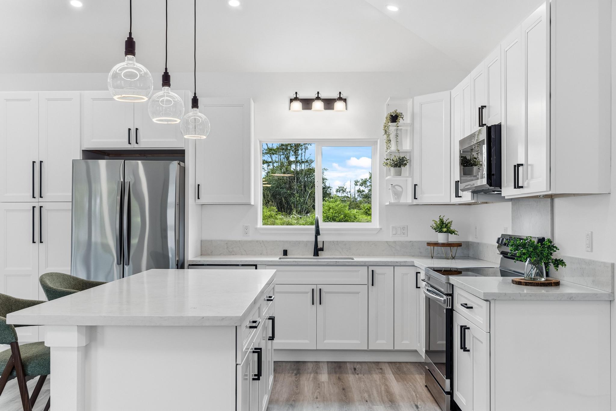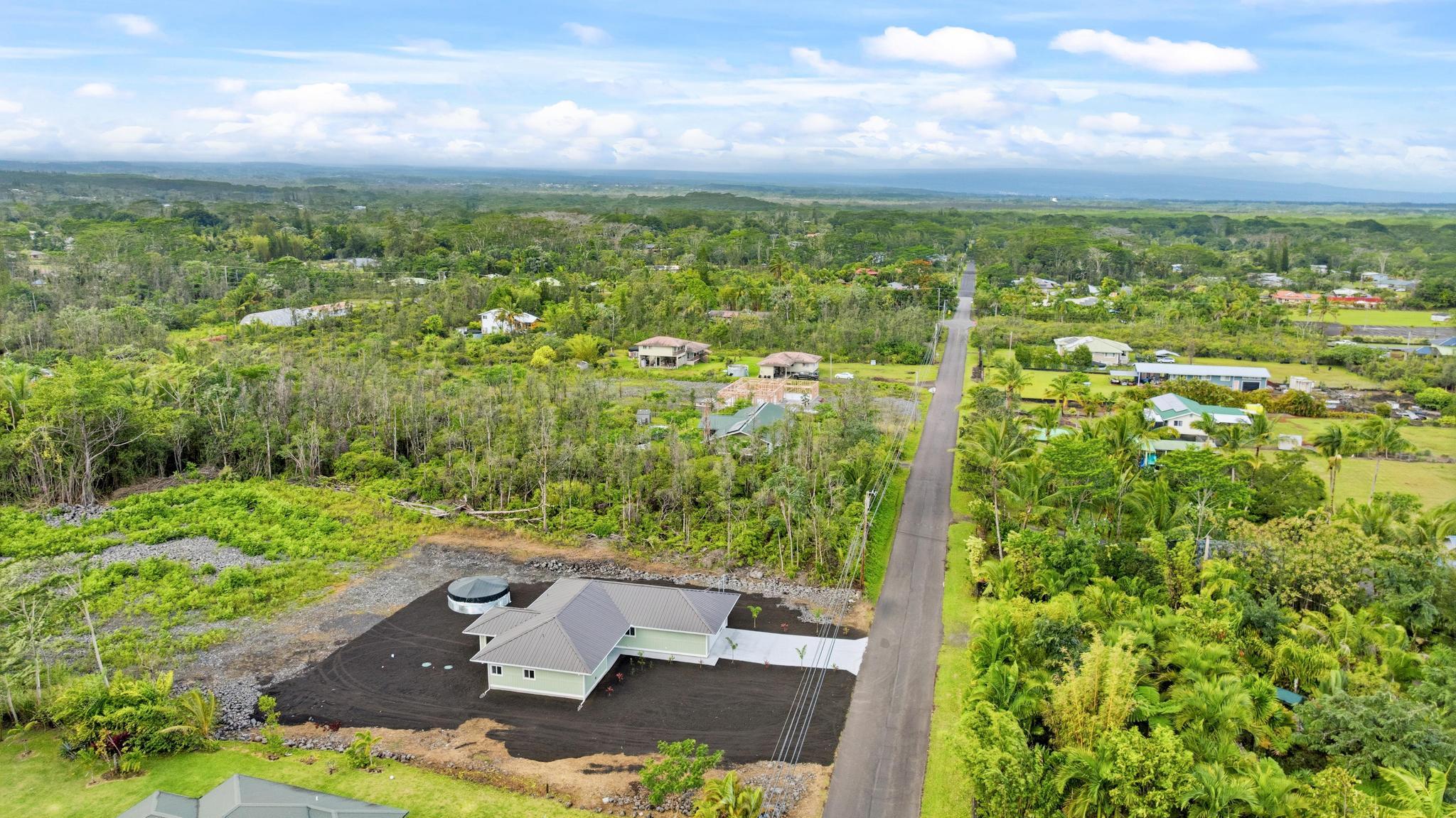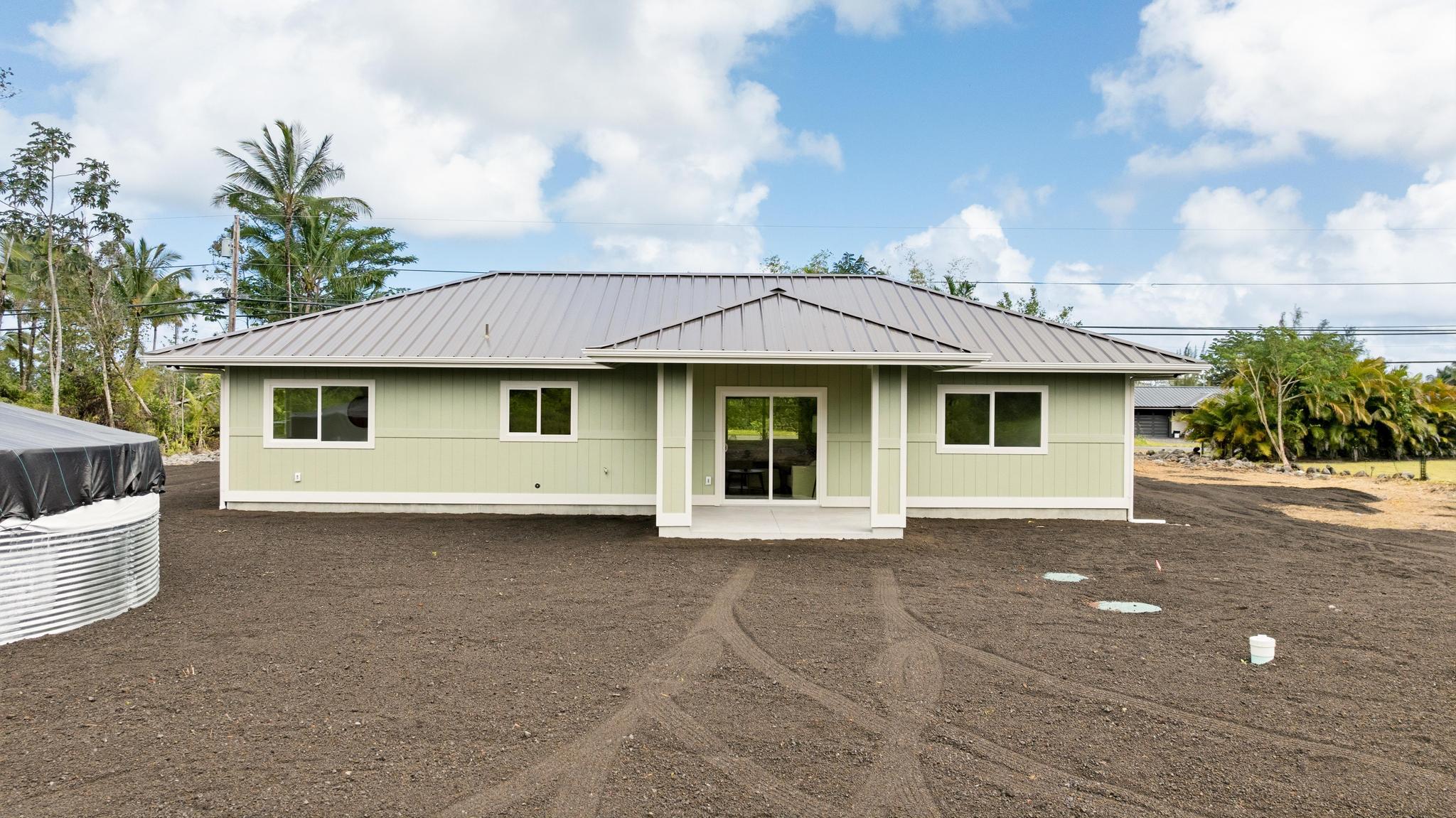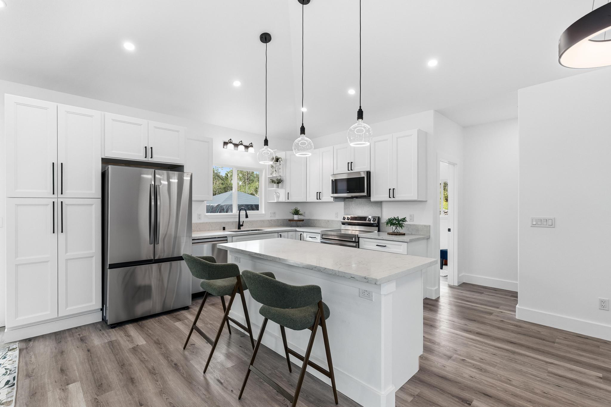 Experience the perfect blend of modern design and island living in this newly built 3 bedroom, 2 bathroom residence with a spacious two car garage, set on a full acre in Hawaiian Paradise Park. A concrete driveway and freshly planted landscaping create a welcoming first impression and beautiful curb appeal. Inside, the home opens to a light filled open concept living space designed for seamless flow and comfort. The kitchen is both functional and stunning, featuring quartz countertops, an expansive island with pendant lighting, an oversized sink, and brand new stainless steel appliances. Sliding glass doors lead to a covered lanai and generous backyard, creating effortless indoor outdoor living. A well appointed laundry room includes a washer, utility sink, and abundant cabinetry, with direct access to the oversized garage offering additional storage. Two spacious guest bedrooms are positioned near a beautifully finished guest bath with a tiled tub surround and modern lighted mirror. Privately located on the opposite wing of the home, the primary suite is exceptionally large and offers a spa inspired bath with dual vanities, lighted mirrors, an oversized open concept walk in shower, and a walk in closet. Set on a full acre, this property offers space, privacy, and endless potential while enjoying the comfort of brand new construction.