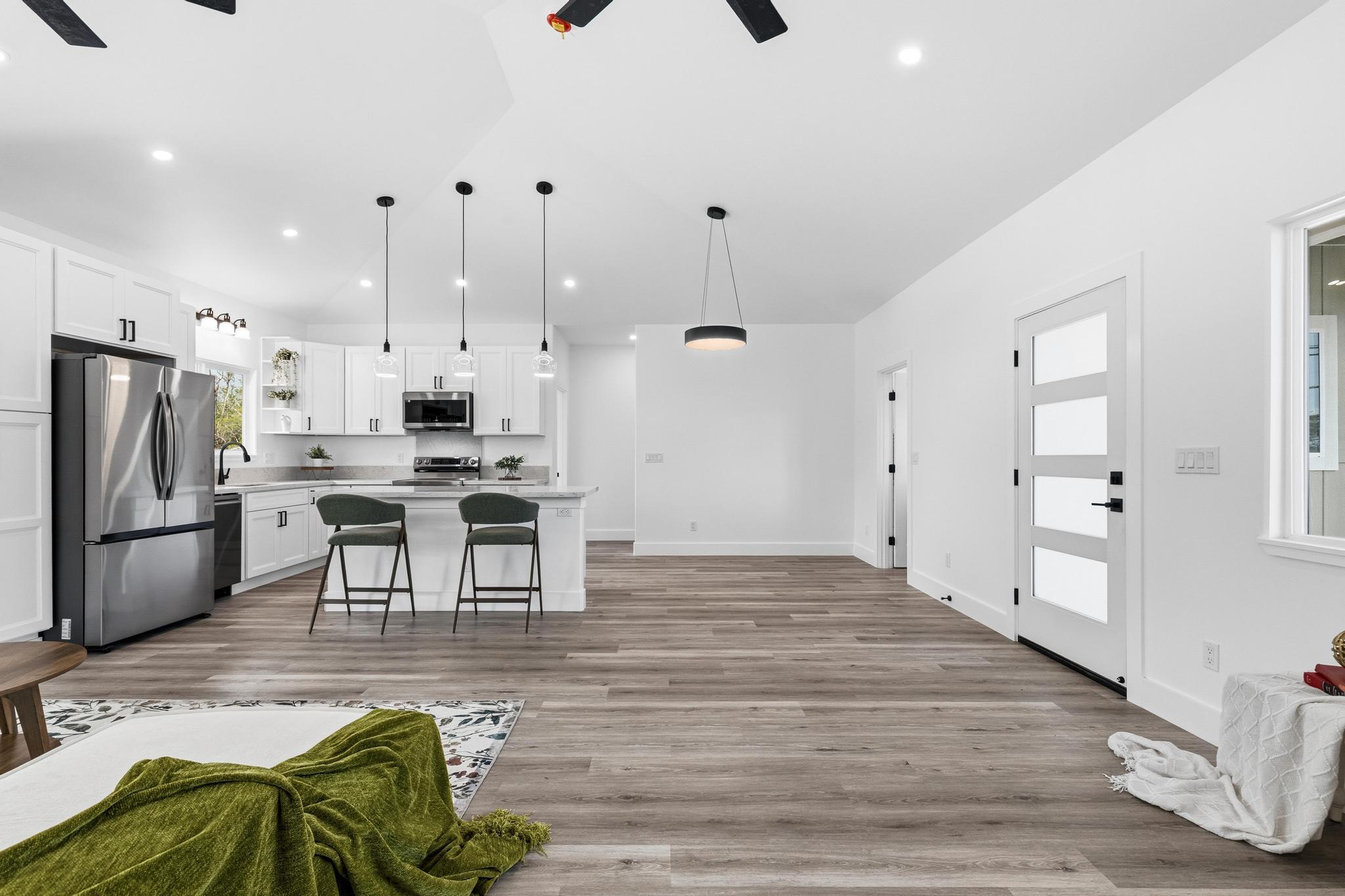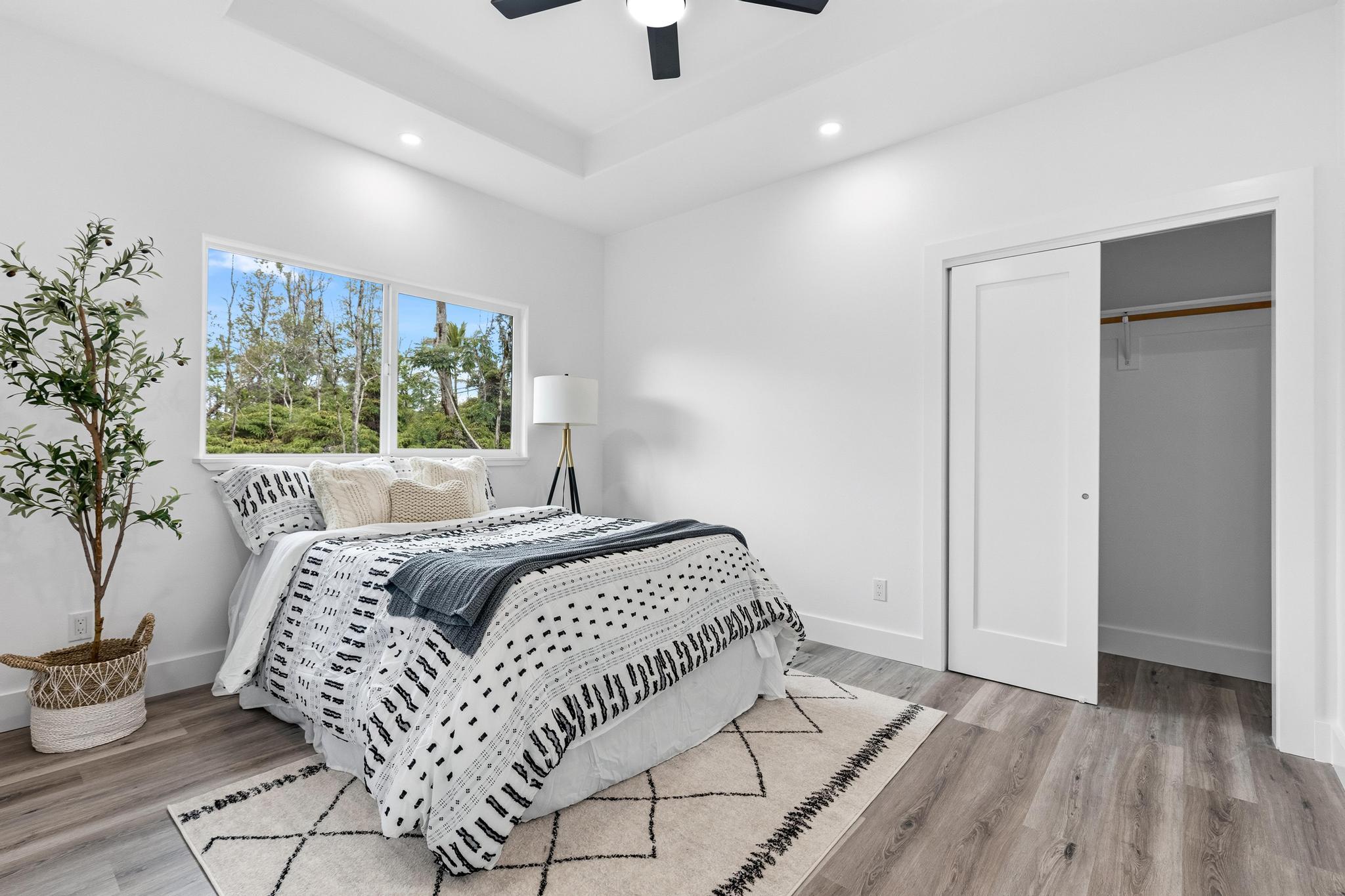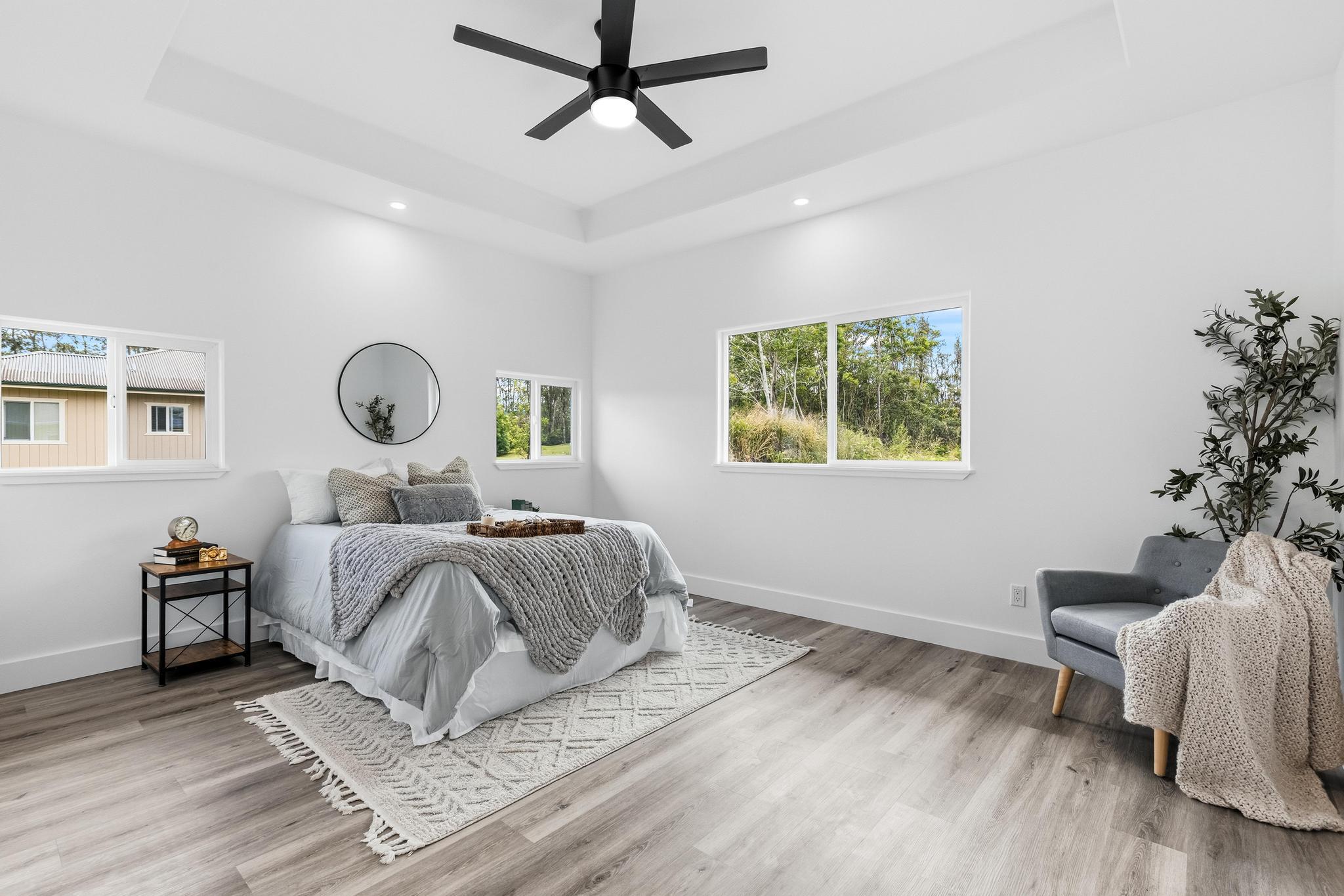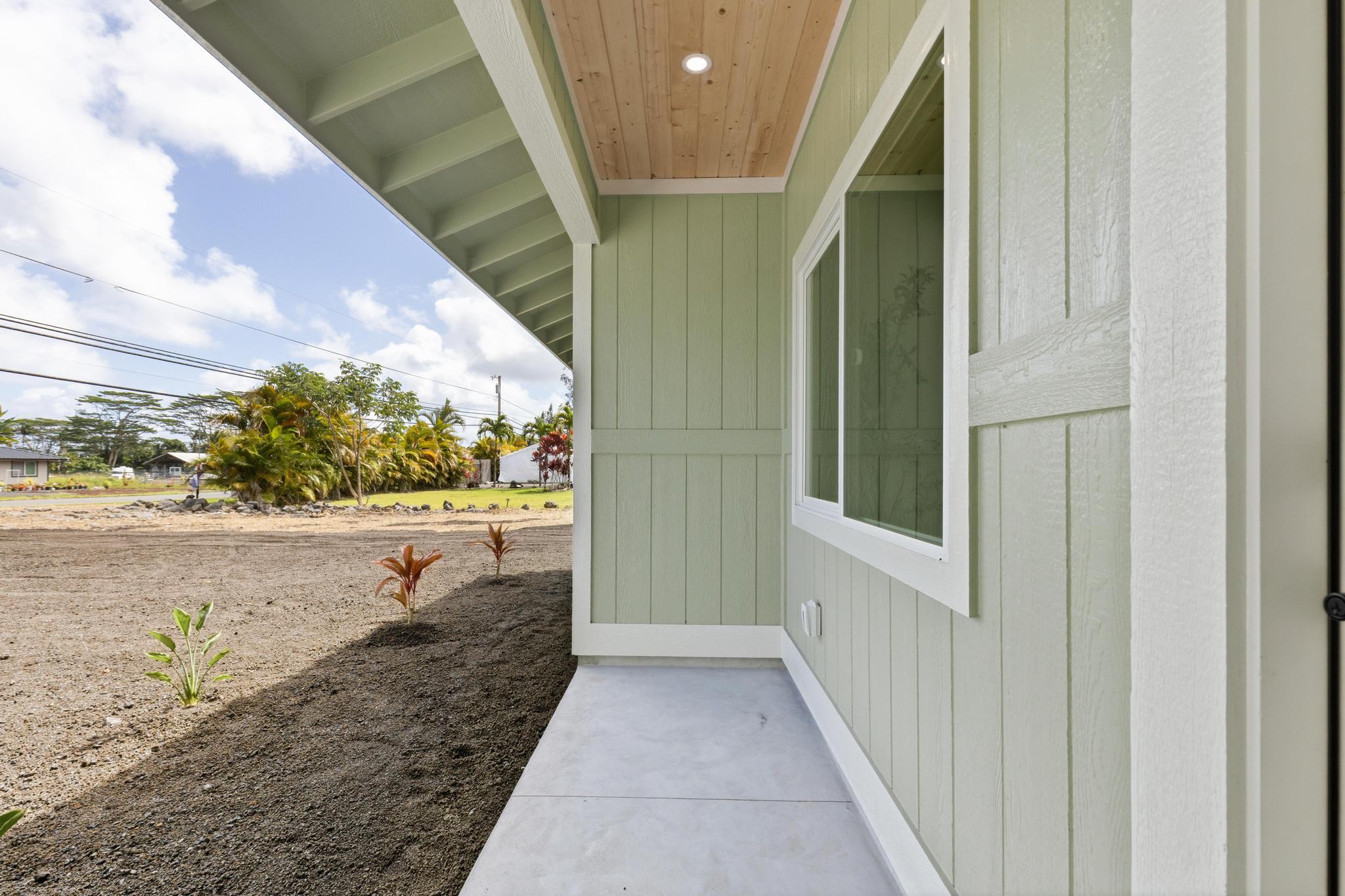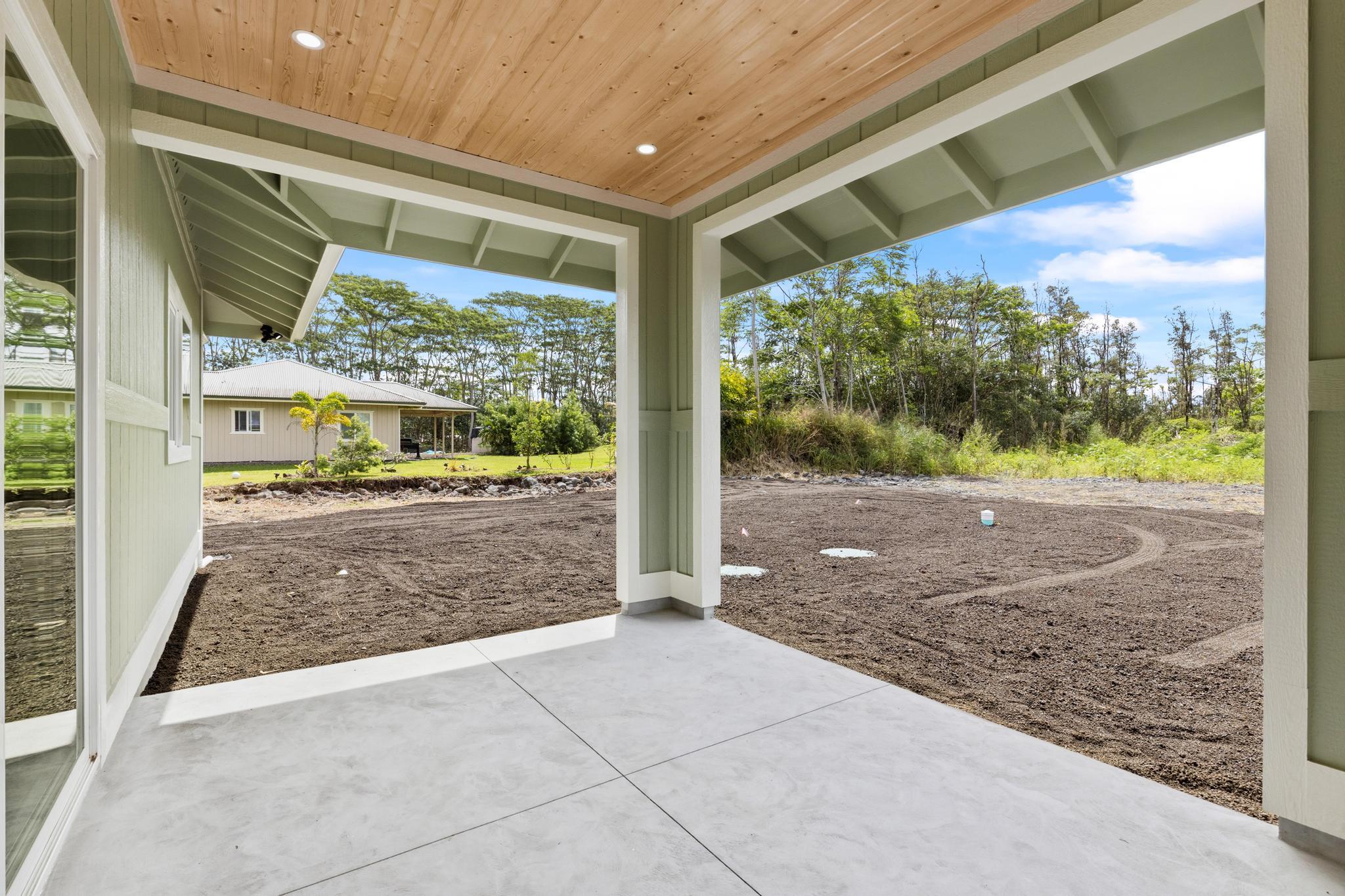 Experience the perfect blend of modern design and island living in this newly built 3 bedroom, 2 bathroom residence with a spacious two car garage, set on a full acre in Hawaiian Paradise Park. A concrete driveway and freshly planted landscaping create a welcoming first impression and beautiful curb appeal. Inside, the home opens to a light filled open concept living space designed for seamless flow and comfort. The kitchen is both functional and stunning, featuring quartz countertops, an expansive island with pendant lighting, an oversized sink, and brand new stainless steel appliances. Sliding glass doors lead to a covered lanai and generous backyard, creating effortless indoor outdoor living. A well appointed laundry room includes a washer, utility sink, and abundant cabinetry, with direct access to the oversized garage offering additional storage. Two spacious guest bedrooms are positioned near a beautifully finished guest bath with a tiled tub surround and modern lighted mirror. Privately located on the opposite wing of the home, the primary suite is exceptionally large and offers a spa inspired bath with dual vanities, lighted mirrors, an oversized open concept walk in shower, and a walk in closet. Set on a full acre, this property offers space, privacy, and endless potential while enjoying the comfort of brand new construction.