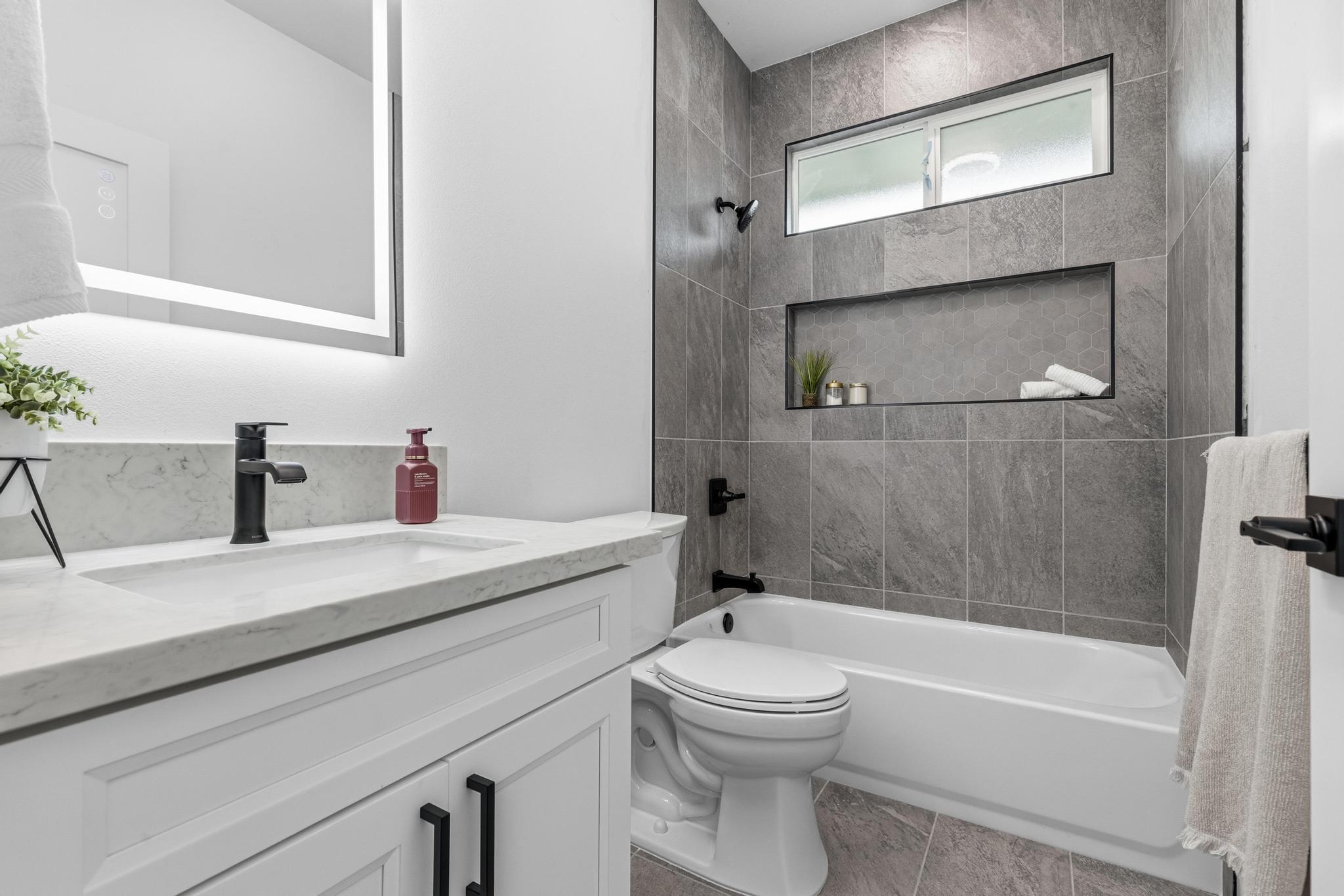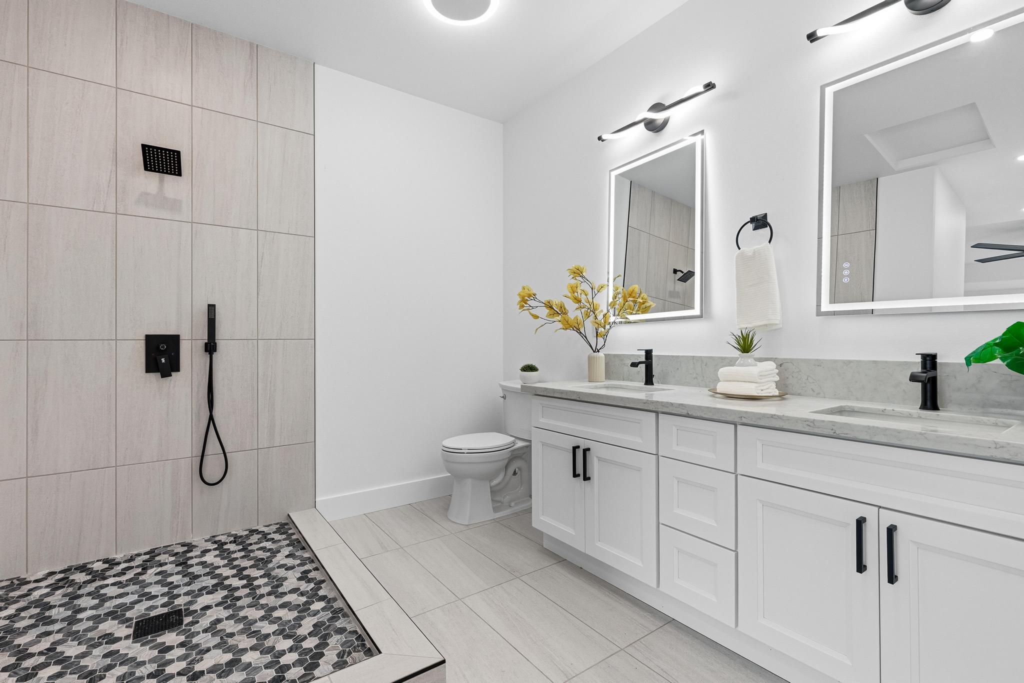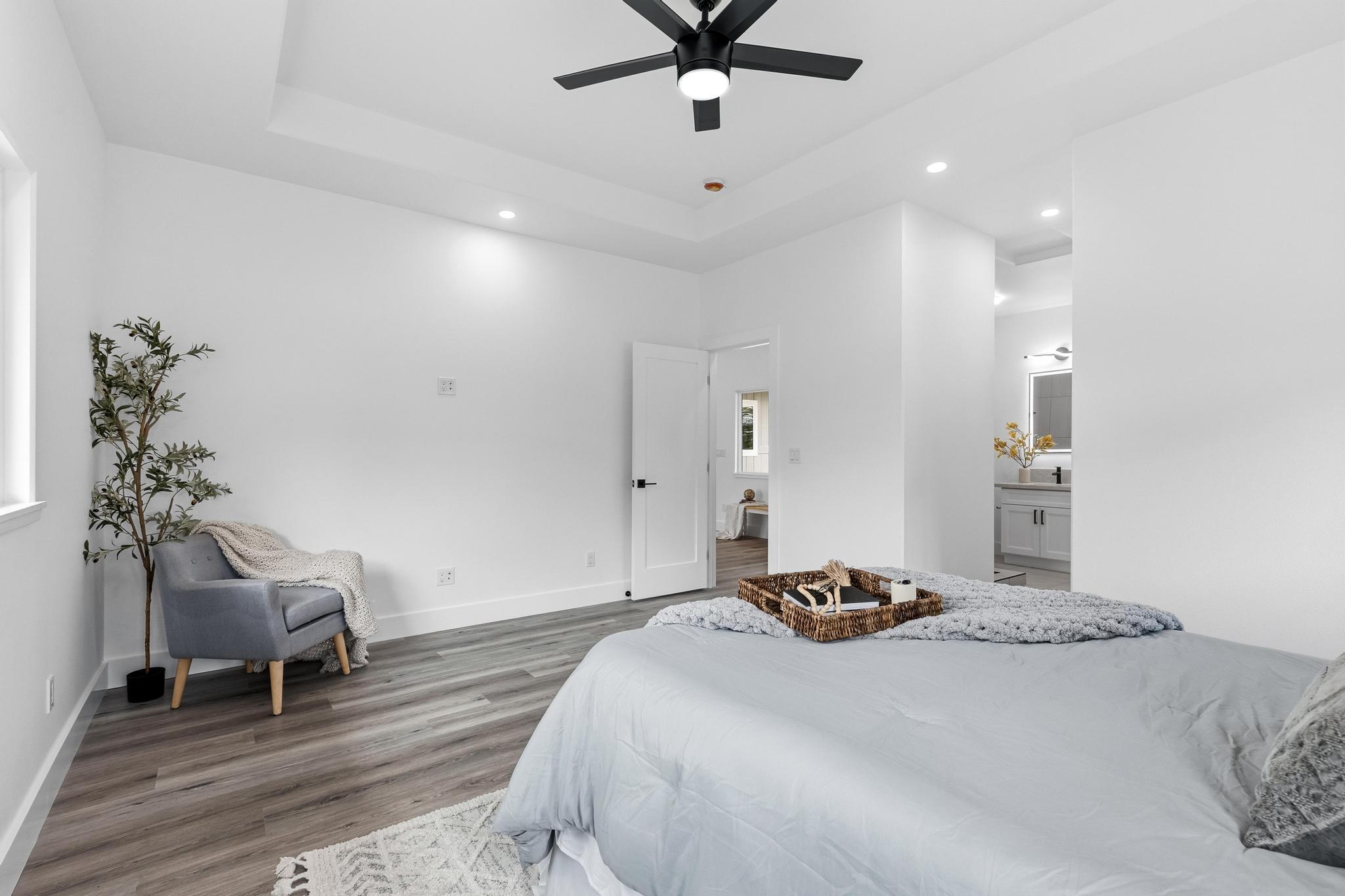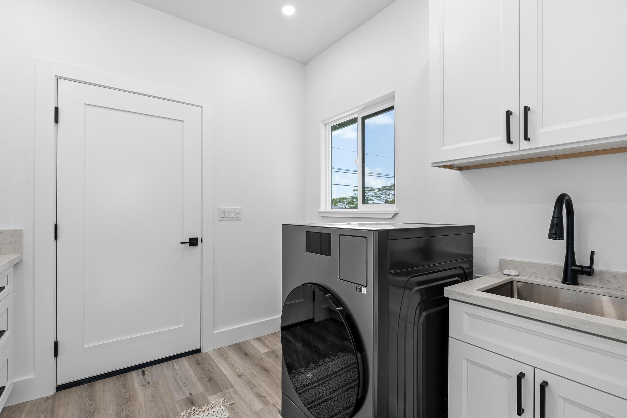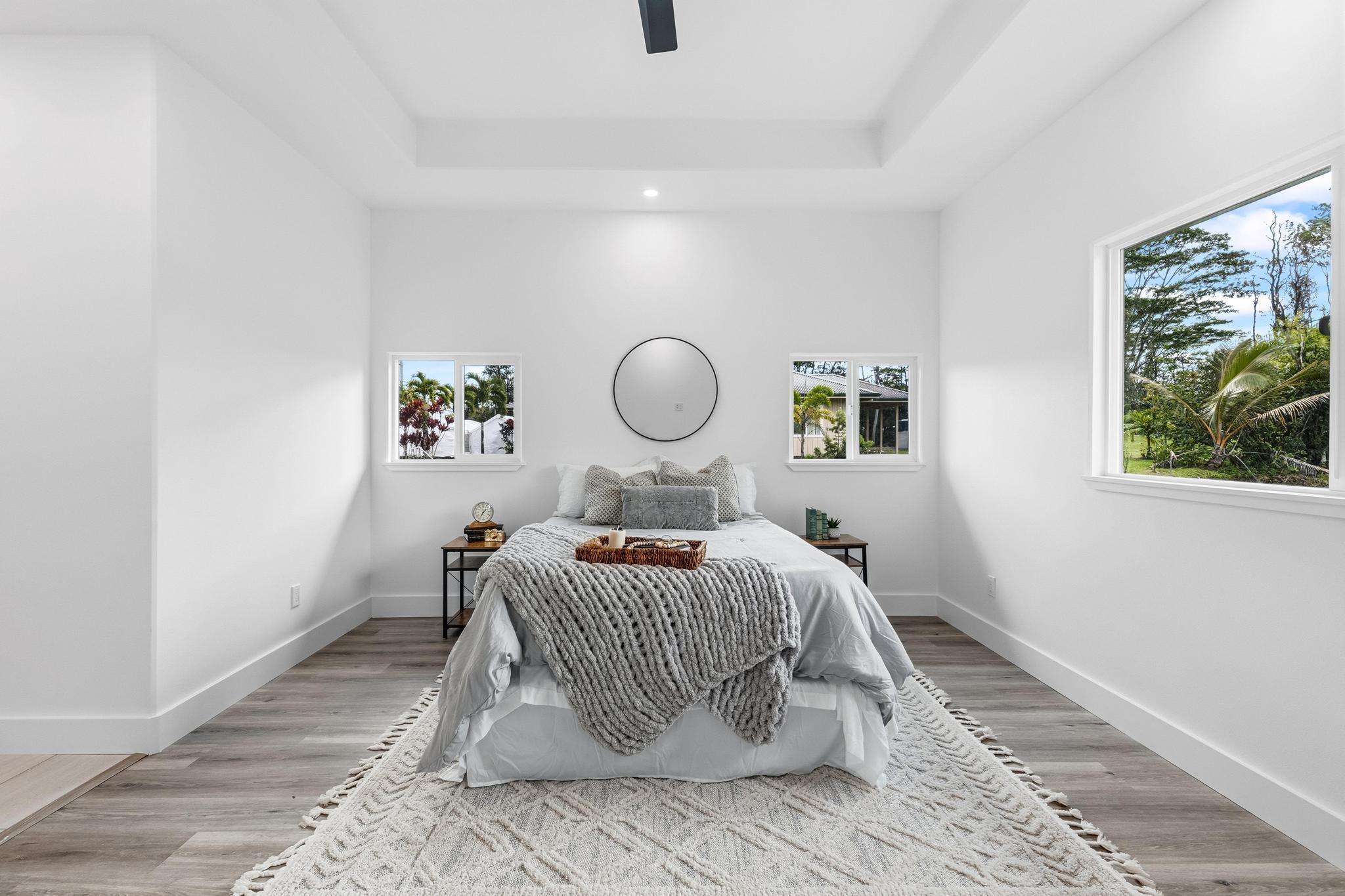 Experience the perfect blend of modern design and island living in this newly built 3 bedroom, 2 bathroom residence with a spacious two car garage, set on a full acre in Hawaiian Paradise Park. A concrete driveway and freshly planted landscaping create a welcoming first impression and beautiful curb appeal. Inside, the home opens to a light filled open concept living space designed for seamless flow and comfort. The kitchen is both functional and stunning, featuring quartz countertops, an expansive island with pendant lighting, an oversized sink, and brand new stainless steel appliances. Sliding glass doors lead to a covered lanai and generous backyard, creating effortless indoor outdoor living. A well appointed laundry room includes a washer, utility sink, and abundant cabinetry, with direct access to the oversized garage offering additional storage. Two spacious guest bedrooms are positioned near a beautifully finished guest bath with a tiled tub surround and modern lighted mirror. Privately located on the opposite wing of the home, the primary suite is exceptionally large and offers a spa inspired bath with dual vanities, lighted mirrors, an oversized open concept walk in shower, and a walk in closet. Set on a full acre, this property offers space, privacy, and endless potential while enjoying the comfort of brand new construction.