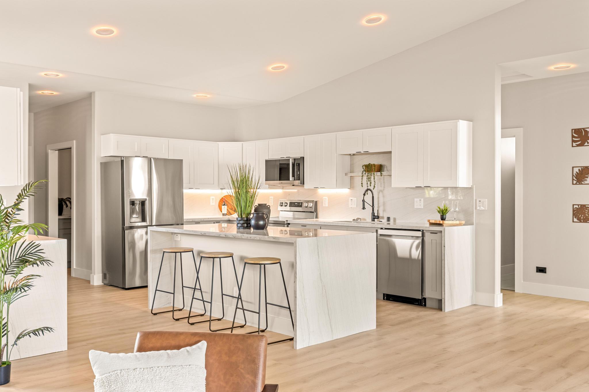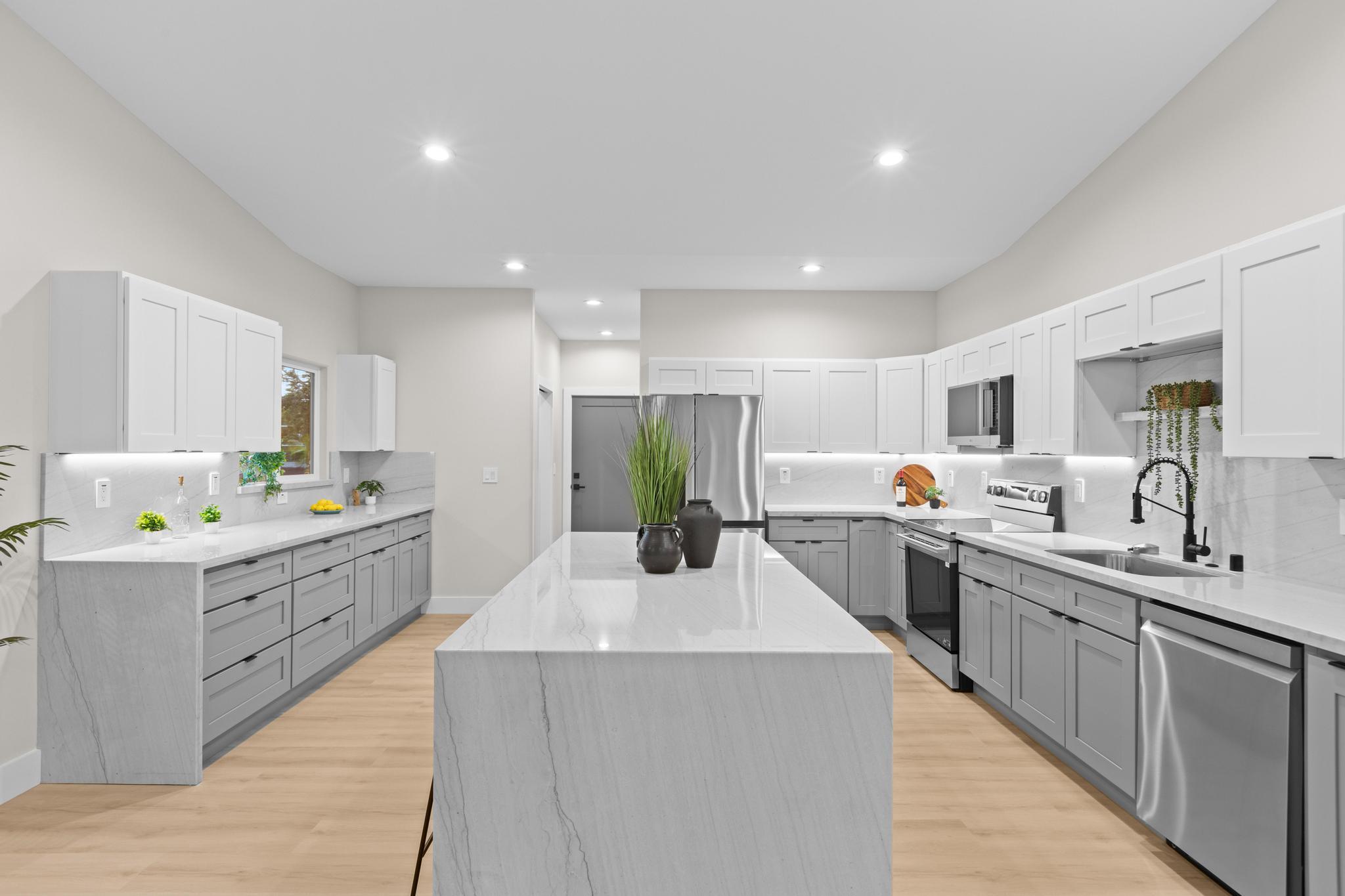 - Sophisticated Kitchen with Under-Cabinet Lighting, large Island, and Waterfall Edges