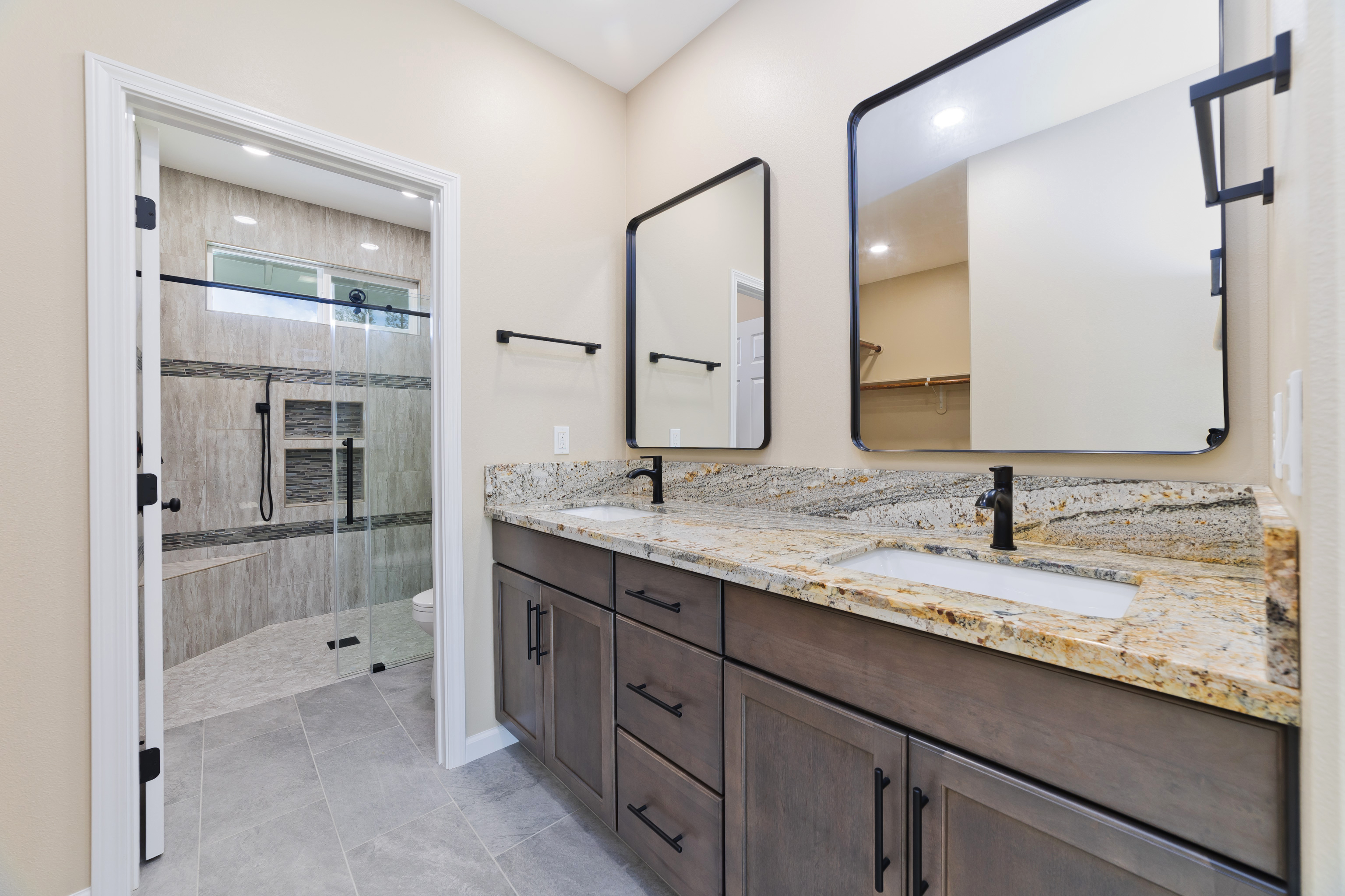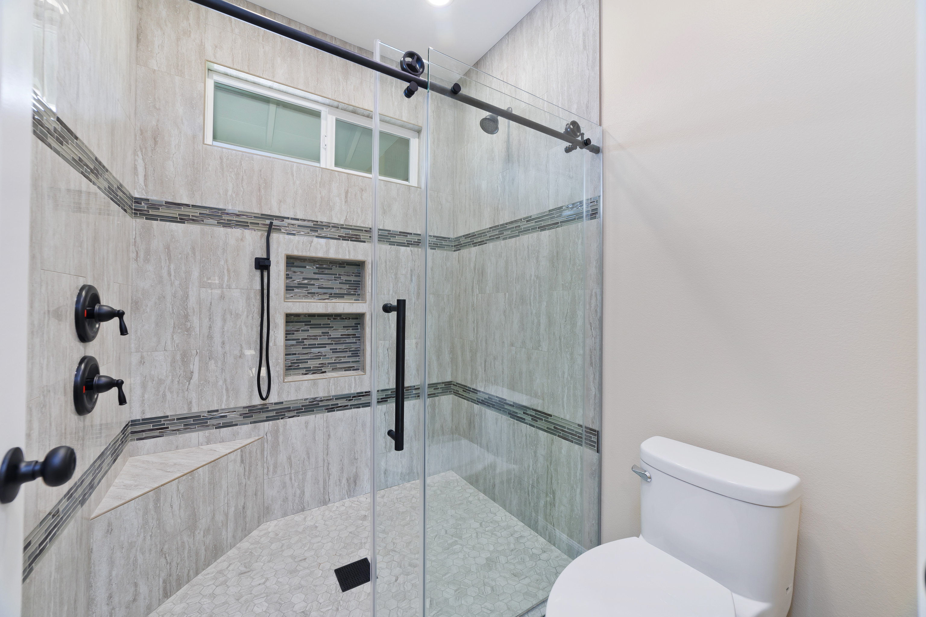 The spacious Primary Ensuite is a true retreat, boasting an elegant popped ceiling and a private sliding door that offers access to the back lanai. The attached bath includes a double vanity, a large walk-in closet, and a stunning, fully tiled walk-in shower finished with a clean glass sliding door.
