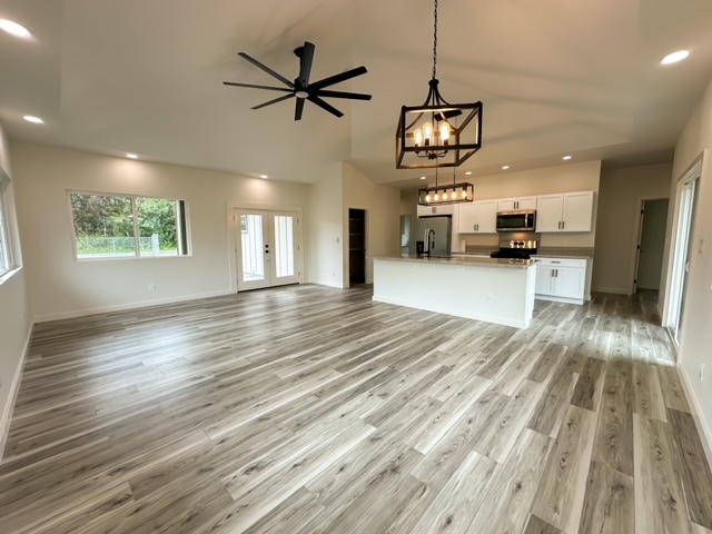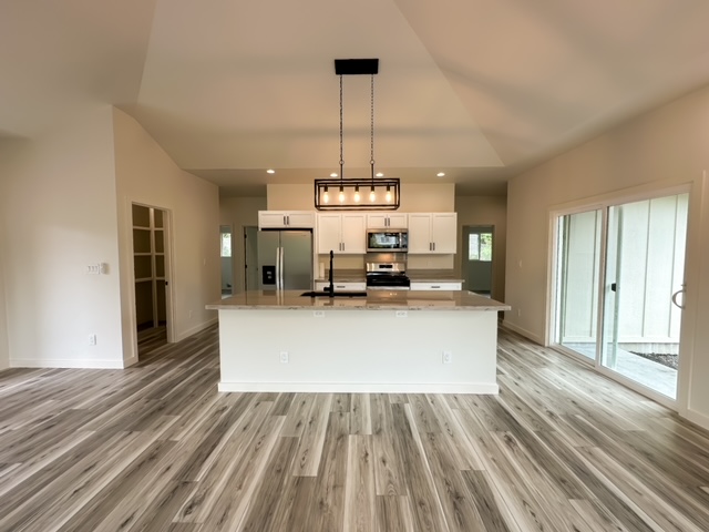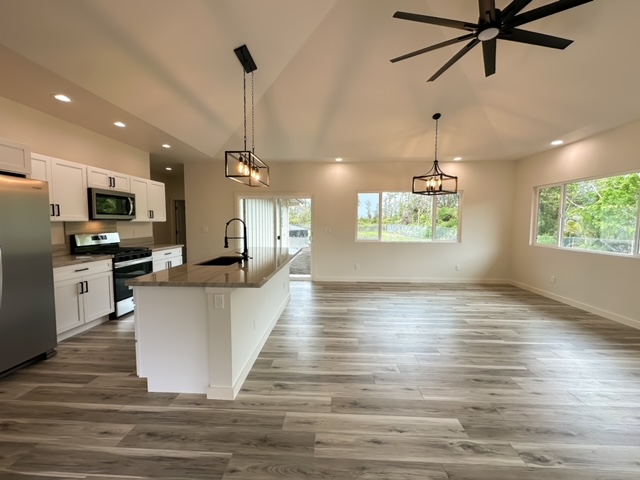 This charming 3 bedroom, 2 bathroom home is perfectly situated on a fully cleared one acre lot just minutes from the beach. Inside you'll find an open floor plan with plenty of natural light, making it feel bright and airy. The spacious living room flows into the dining area and kitchen with plenty of cabinet and counter space.