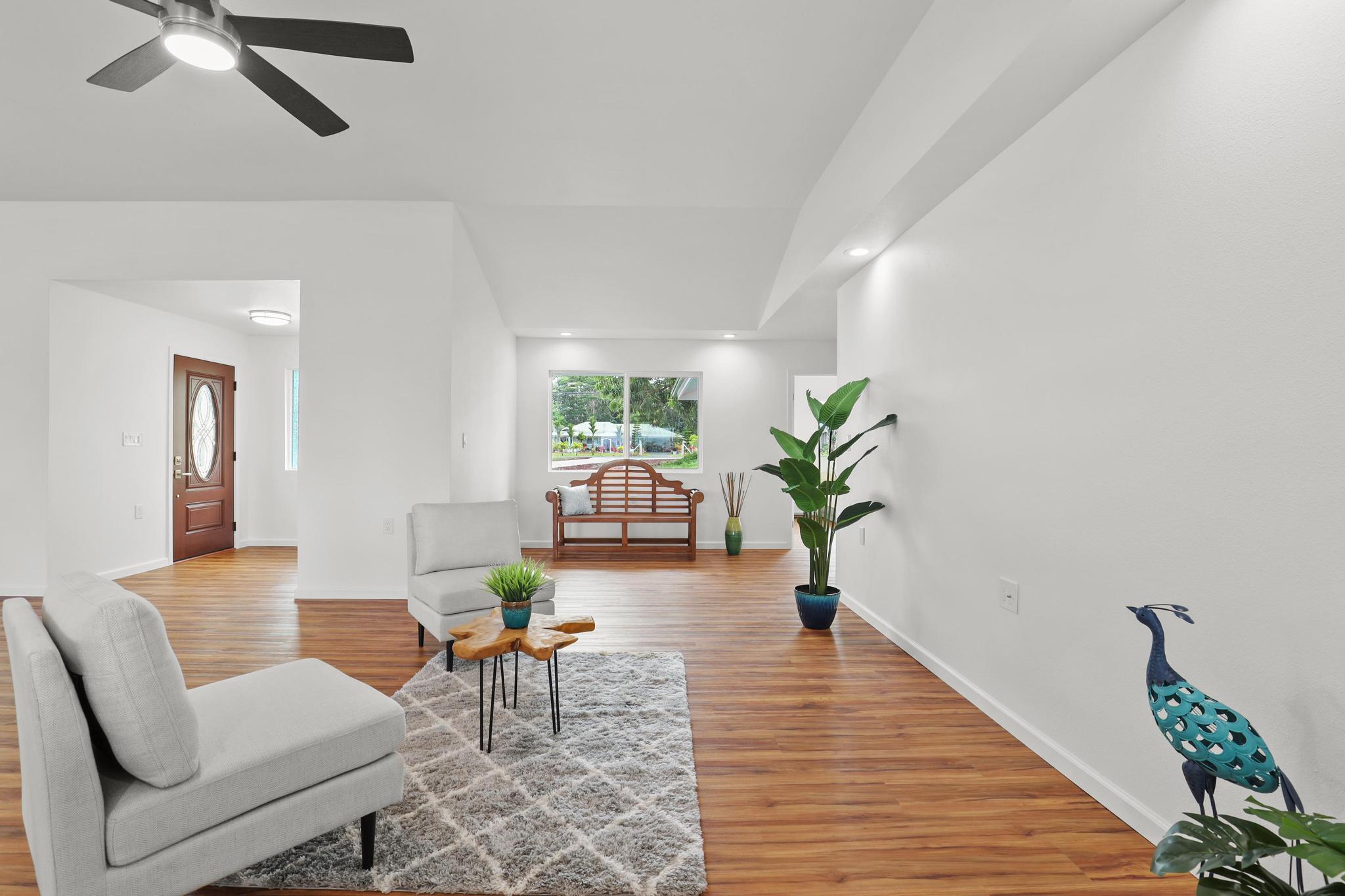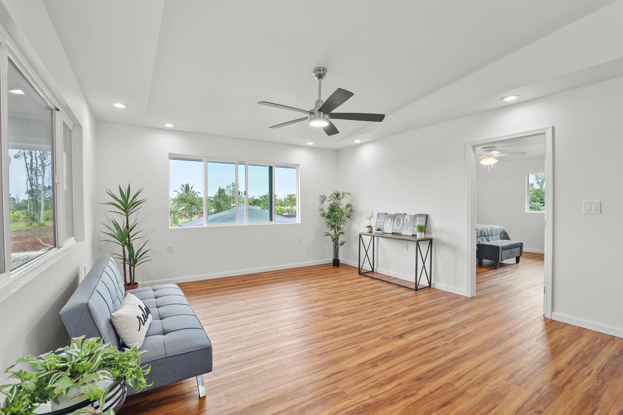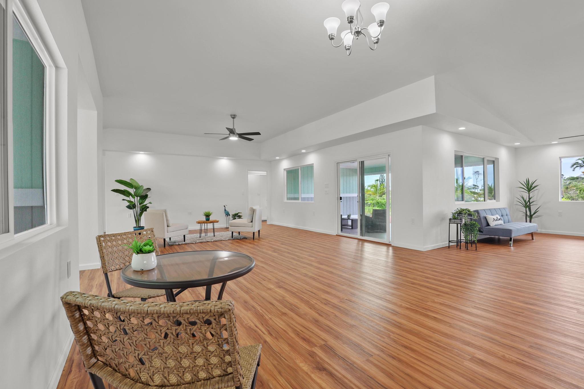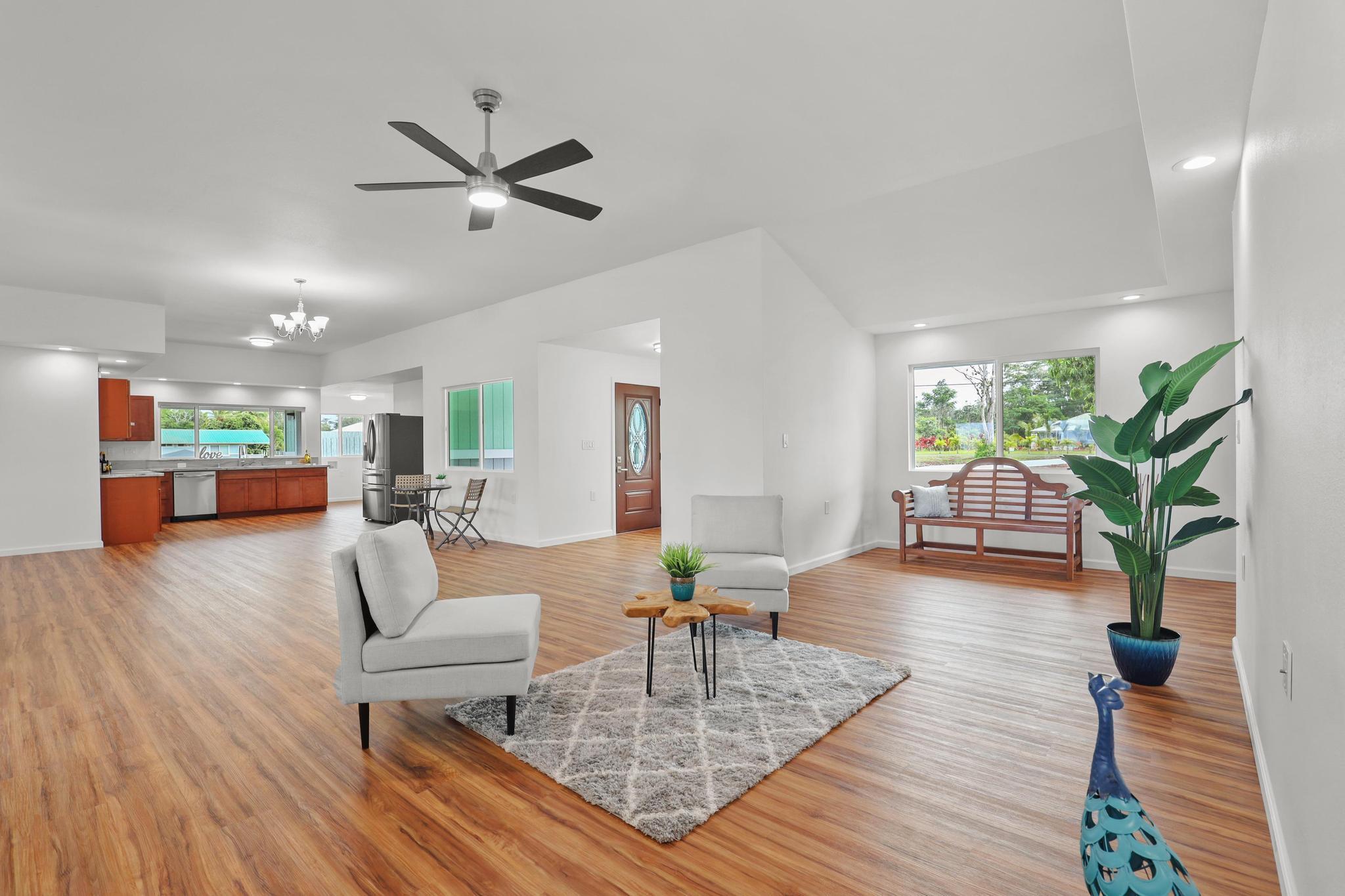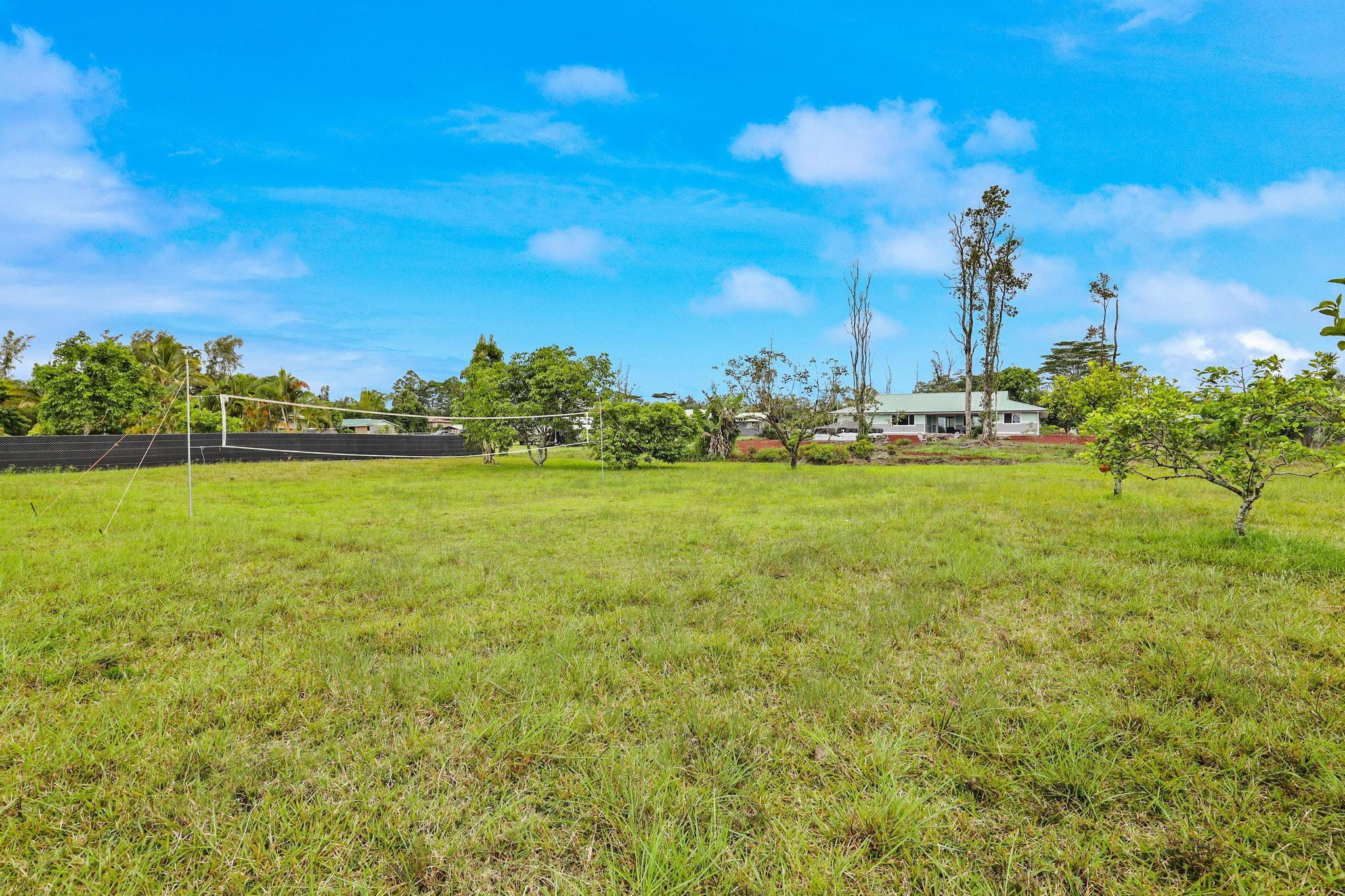 Situated on a cleared, level one-acre parcel along a paved road in Hawaiian Paradise Park, this 4-bedroom, 3.5-bath home was thoughtfully designed for easy island living with seamless indoor-outdoor flow. The expansive main living area blends the kitchen, dining, and living spaces into one impressive great room–perfect for gathering and entertaining. Abundant windows invite in natural light and refreshing cross-breezes, while 10-foot ceilings and soffit lighting enhance the open, airy feel. Set back from the road, the property offers generous space for both front and back yards, creating privacy and room to enjoy the outdoors.