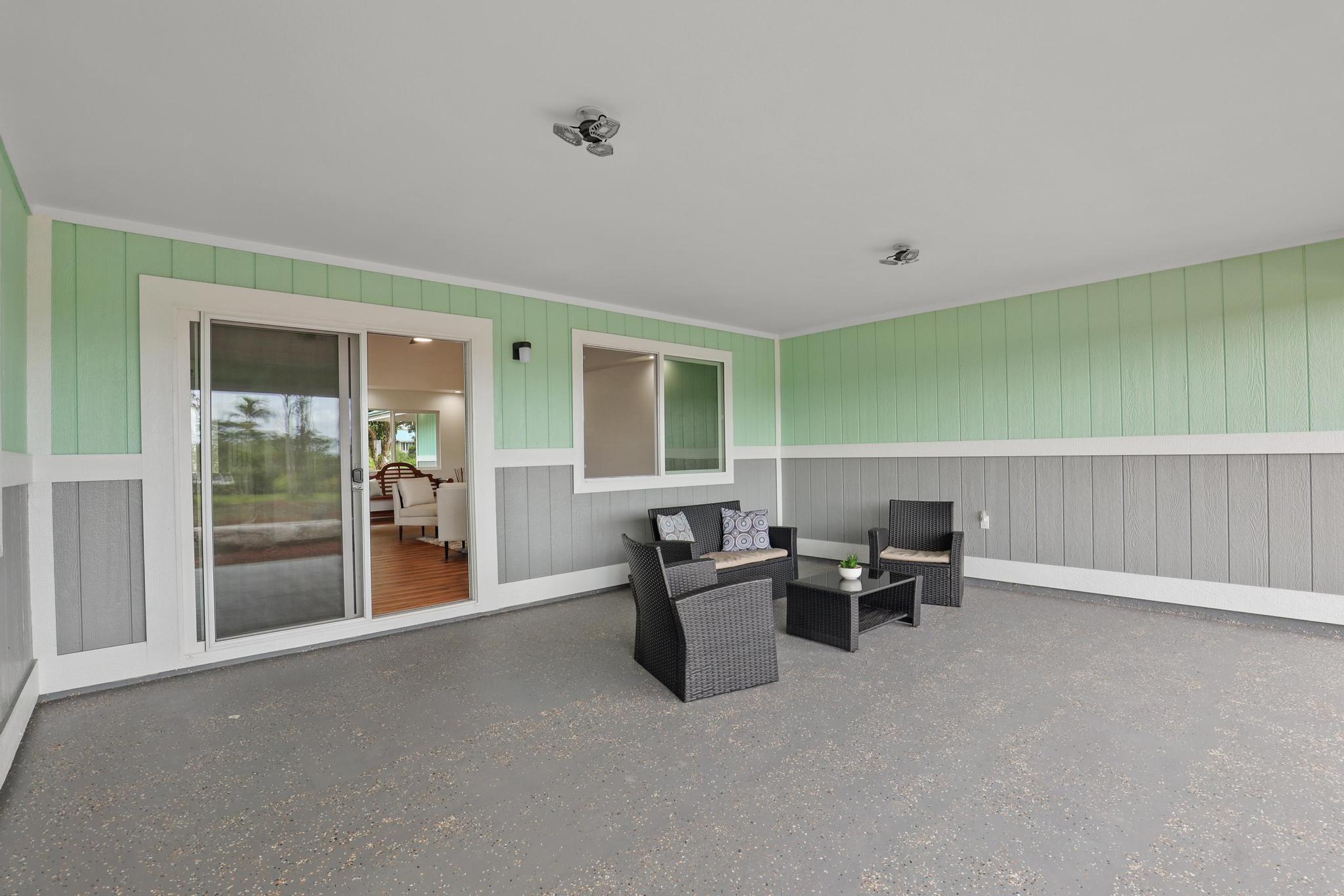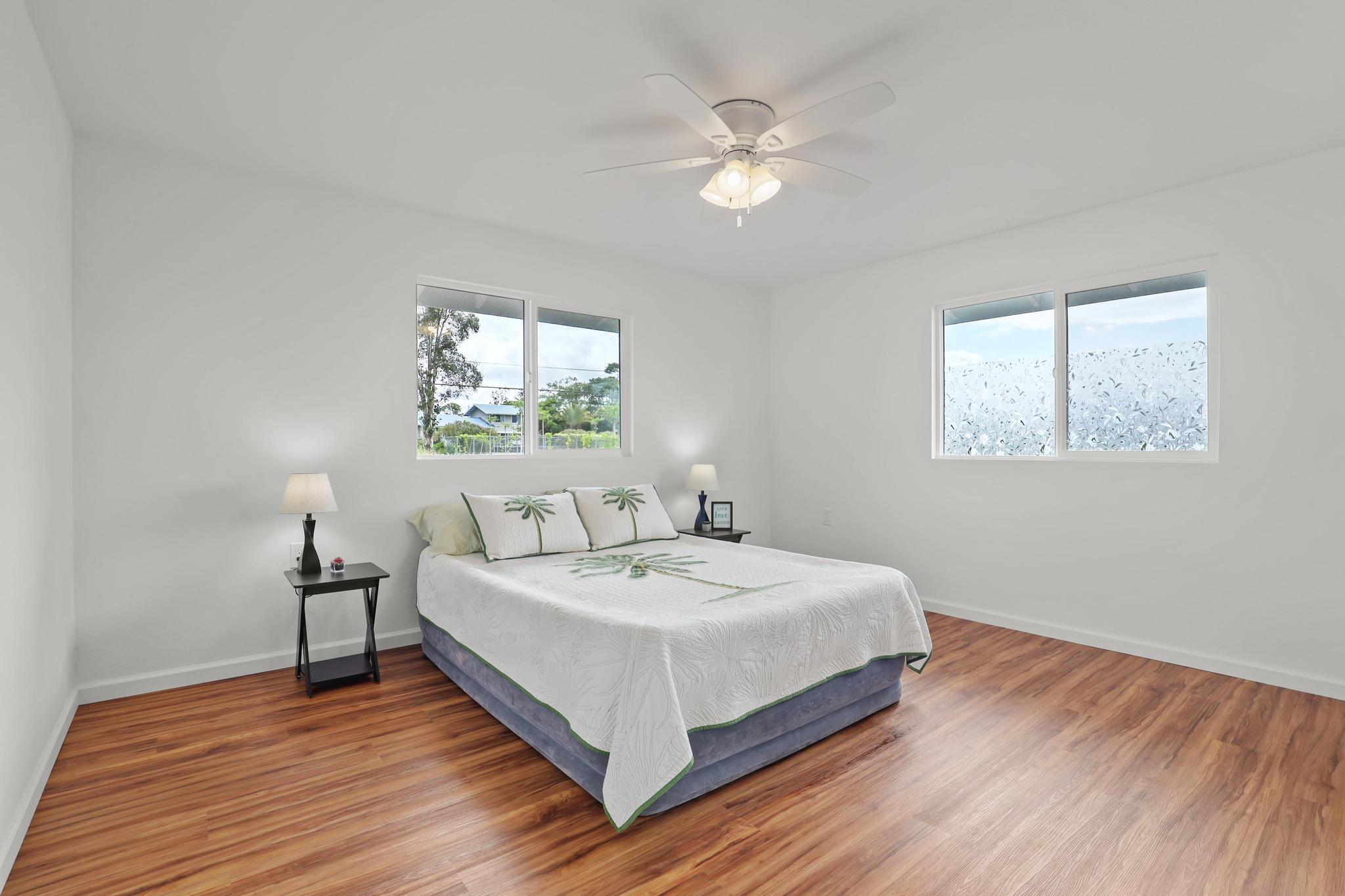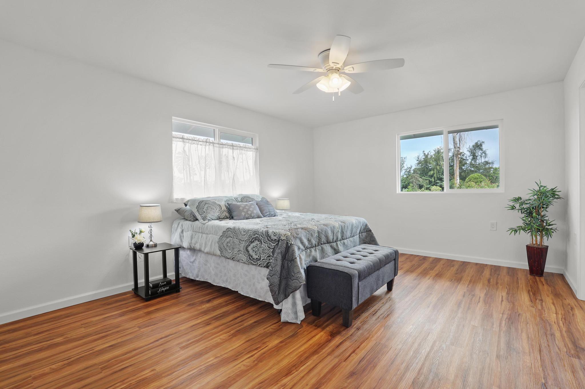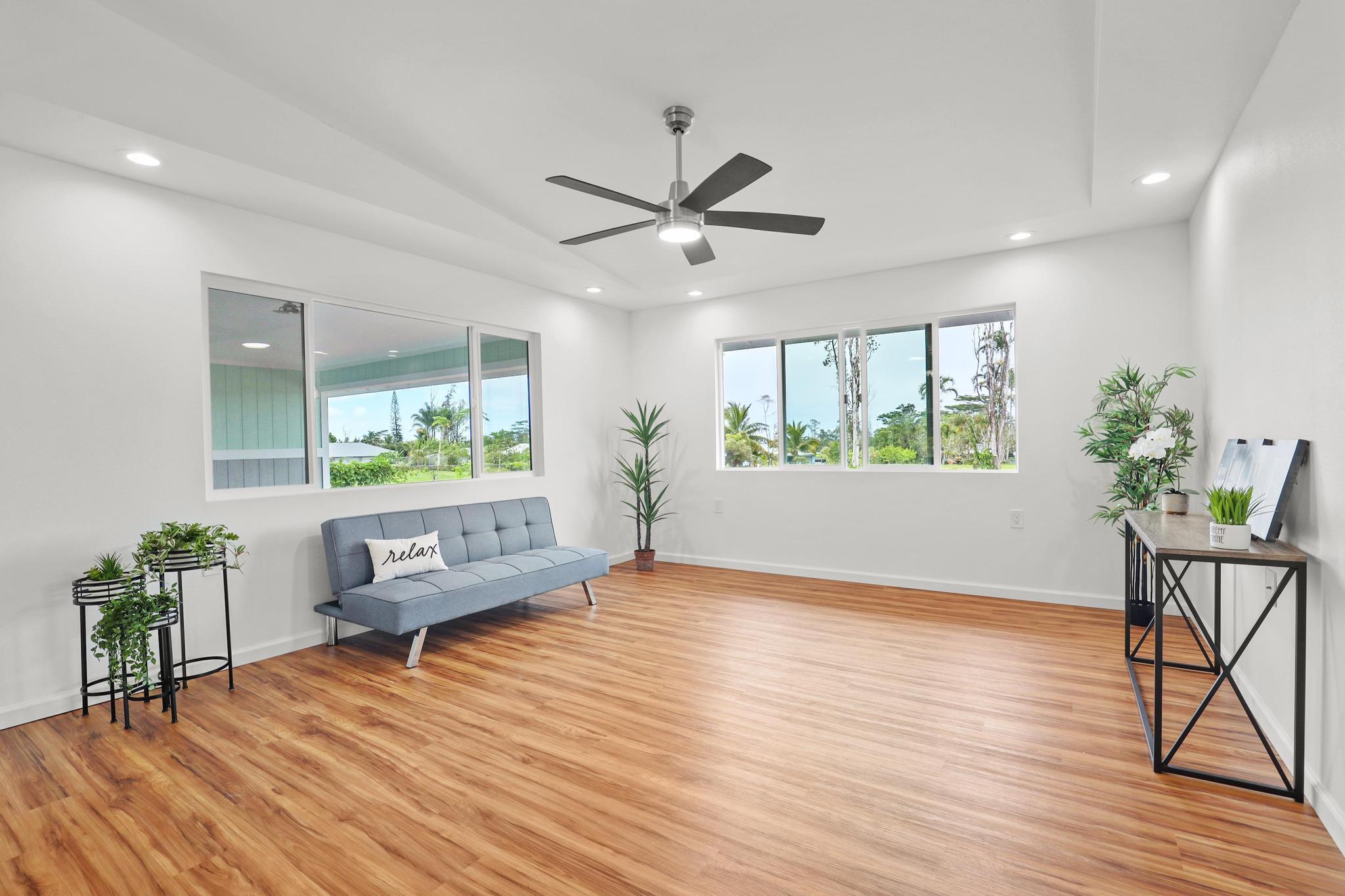Situated on a cleared, level one-acre parcel along a paved road in Hawaiian Paradise Park, this 4-bedroom, 3.5-bath home was thoughtfully designed for easy island living with seamless indoor-outdoor flow. The expansive main living area blends the kitchen, dining, and living spaces into one impressive great room–perfect for gathering and entertaining. Abundant windows invite in natural light and refreshing cross-breezes, while 10-foot ceilings and soffit lighting enhance the open, airy feel. Set back from the road, the property offers generous space for both front and back yards, creating privacy and room to enjoy the outdoors.