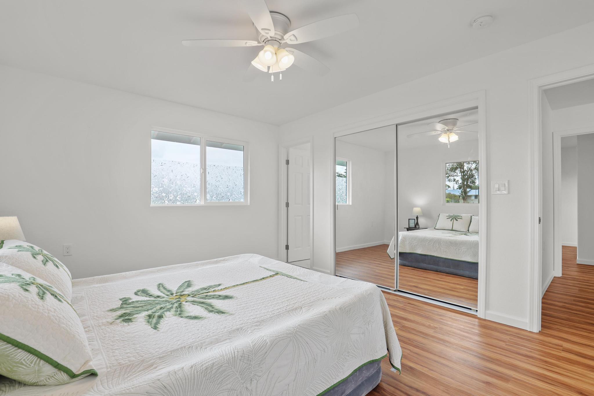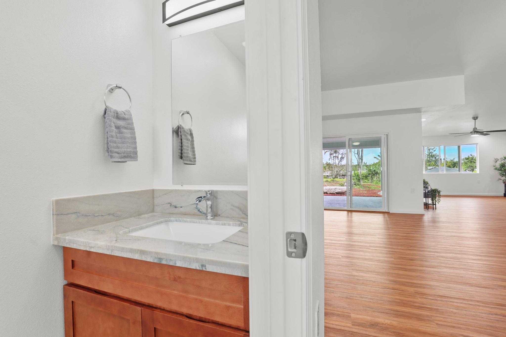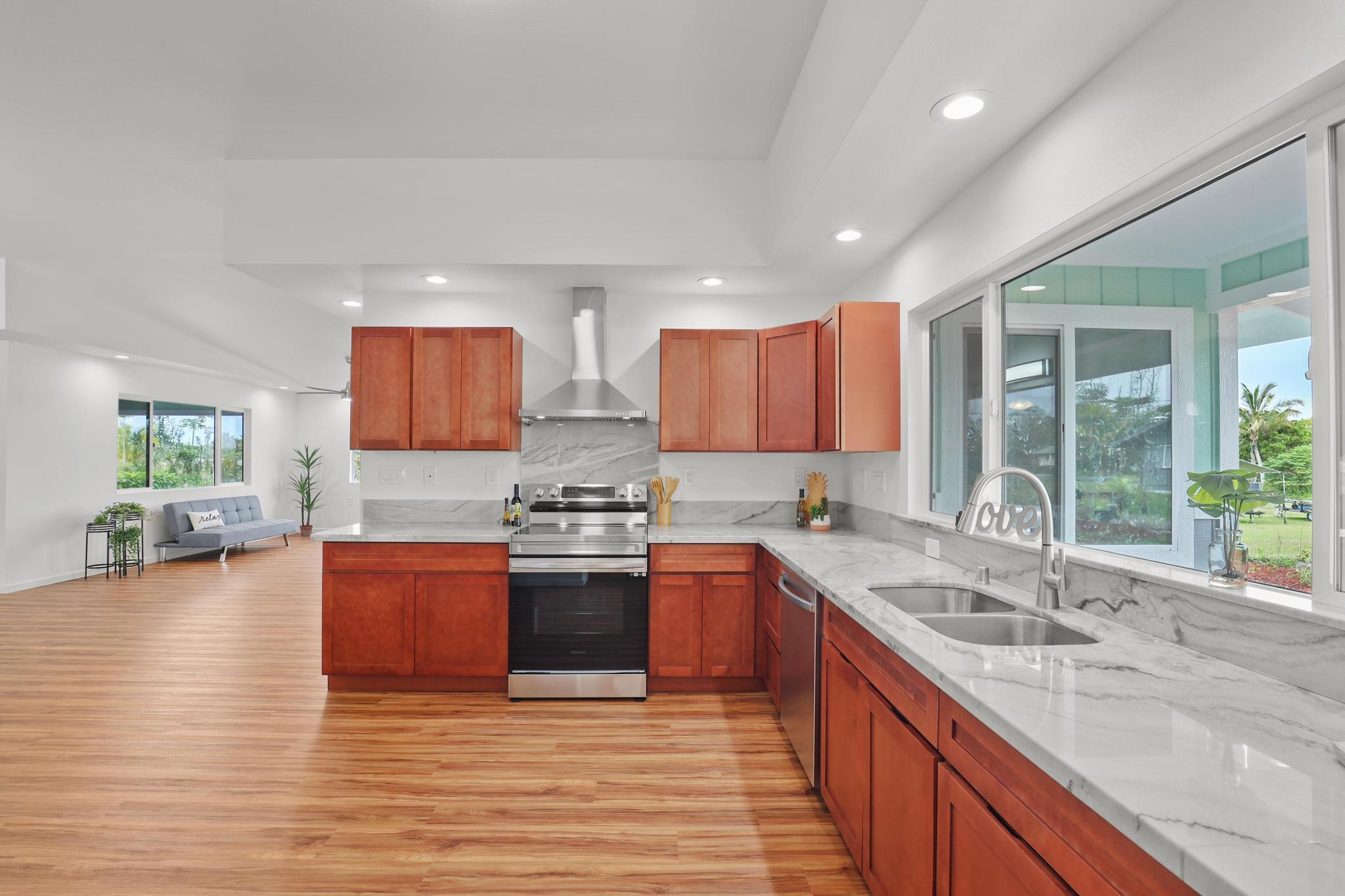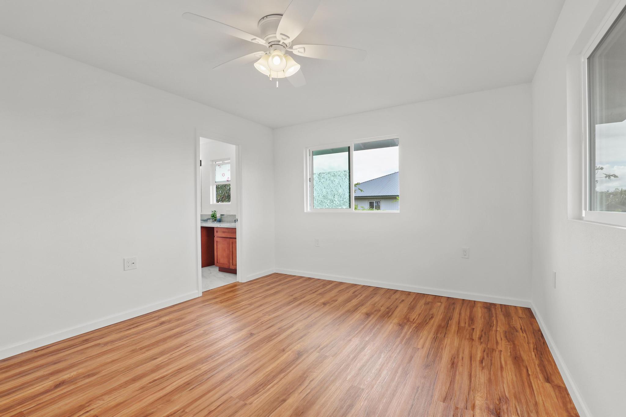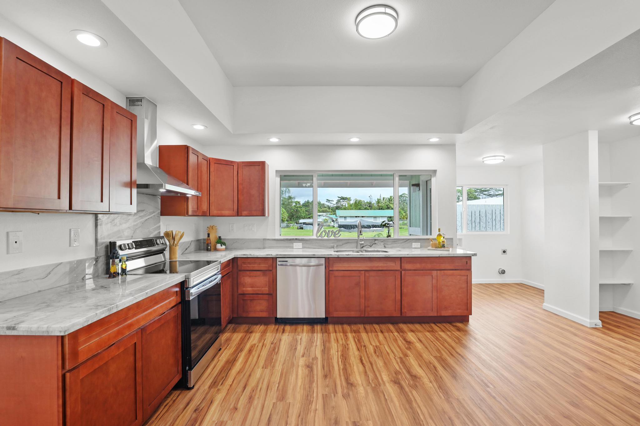 Situated on a cleared, level one-acre parcel along a paved road in Hawaiian Paradise Park, this 4-bedroom, 3.5-bath home was thoughtfully designed for easy island living with seamless indoor-outdoor flow. The expansive main living area blends the kitchen, dining, and living spaces into one impressive great room–perfect for gathering and entertaining. Abundant windows invite in natural light and refreshing cross-breezes, while 10-foot ceilings and soffit lighting enhance the open, airy feel. Set back from the road, the property offers generous space for both front and back yards, creating privacy and room to enjoy the outdoors.