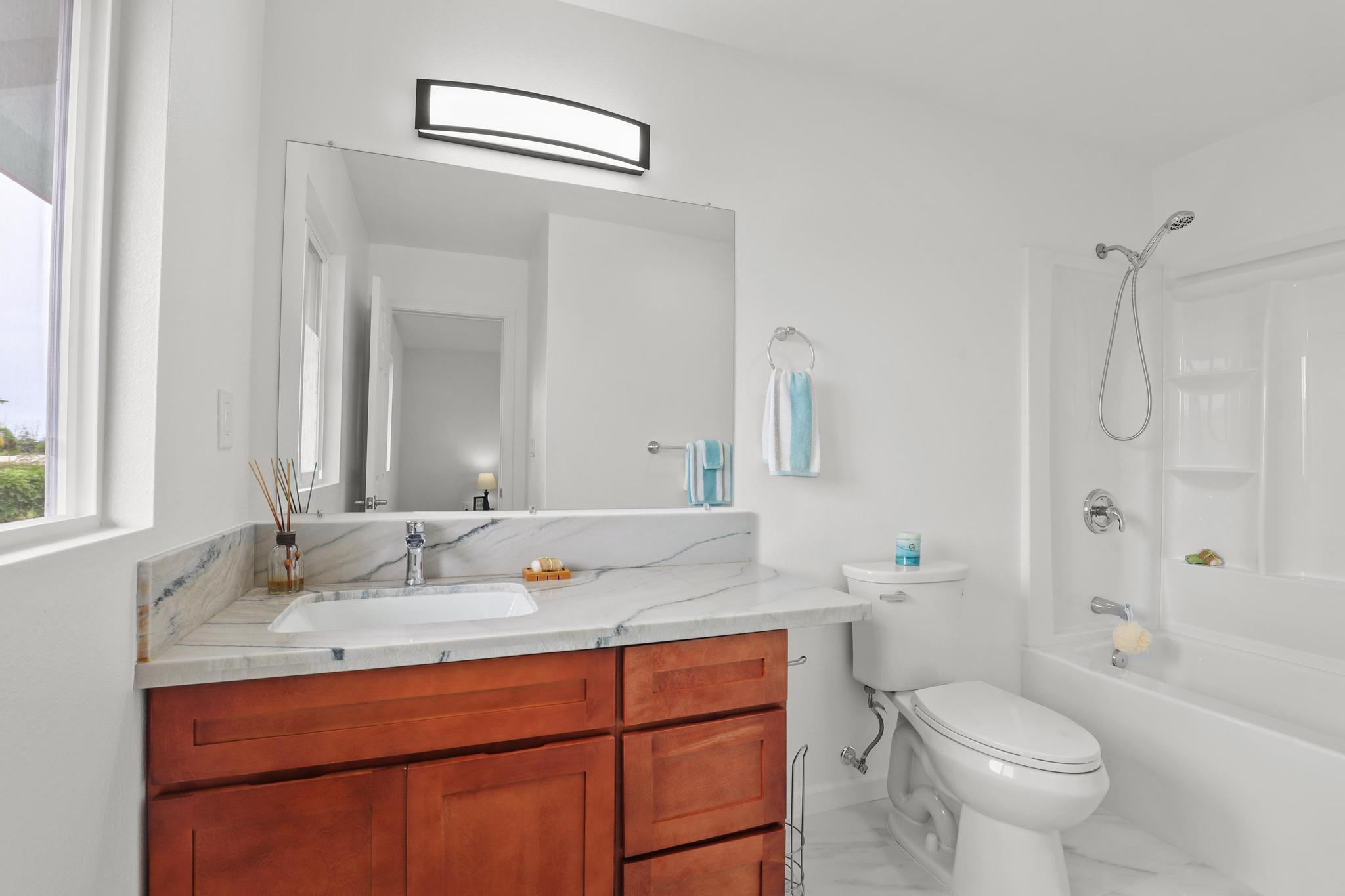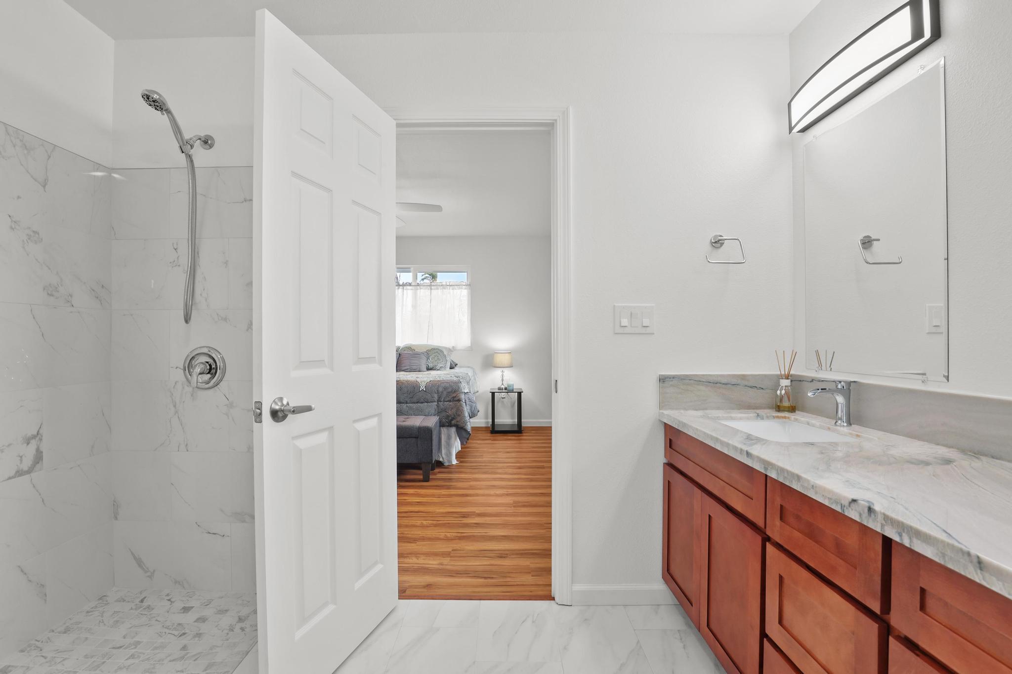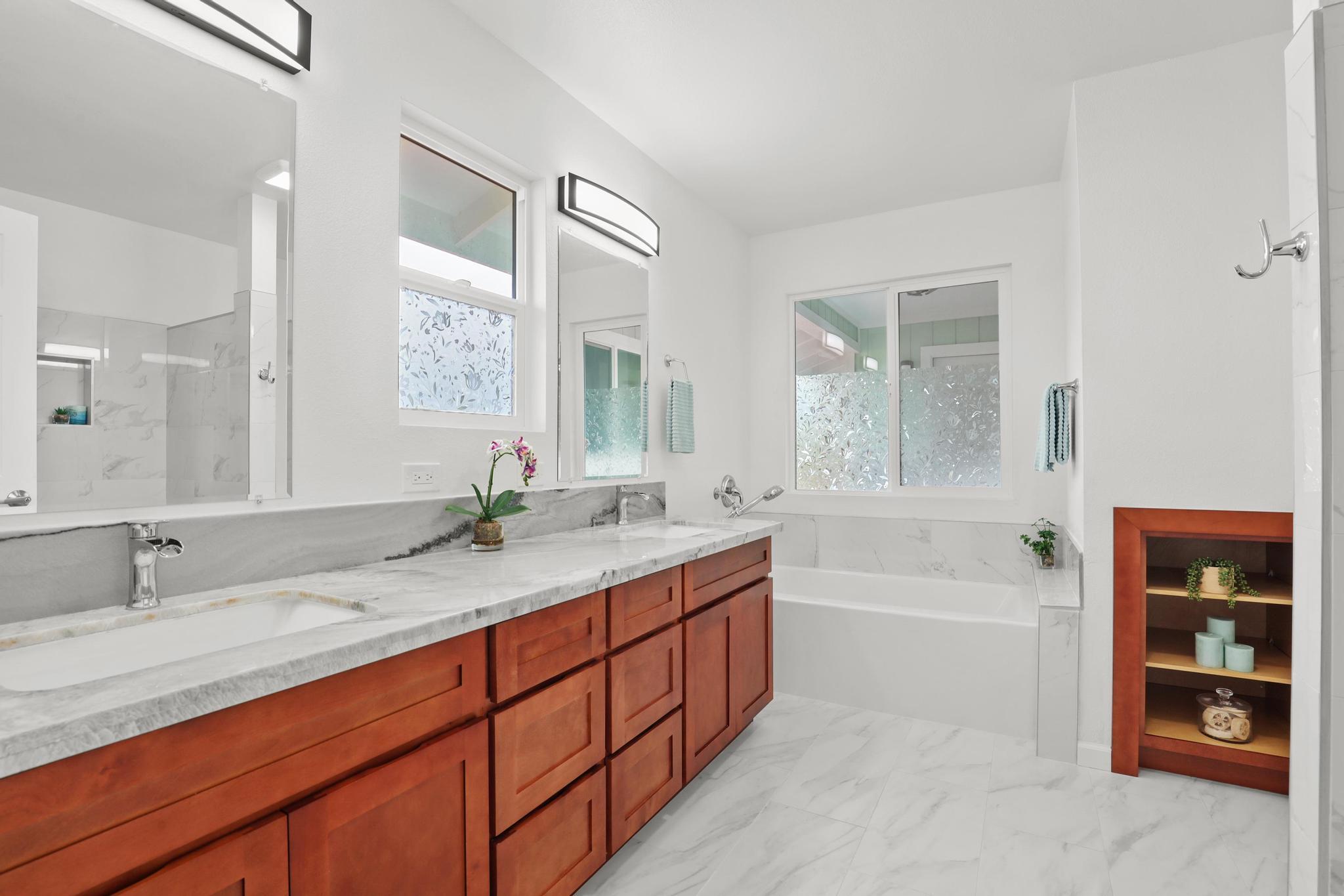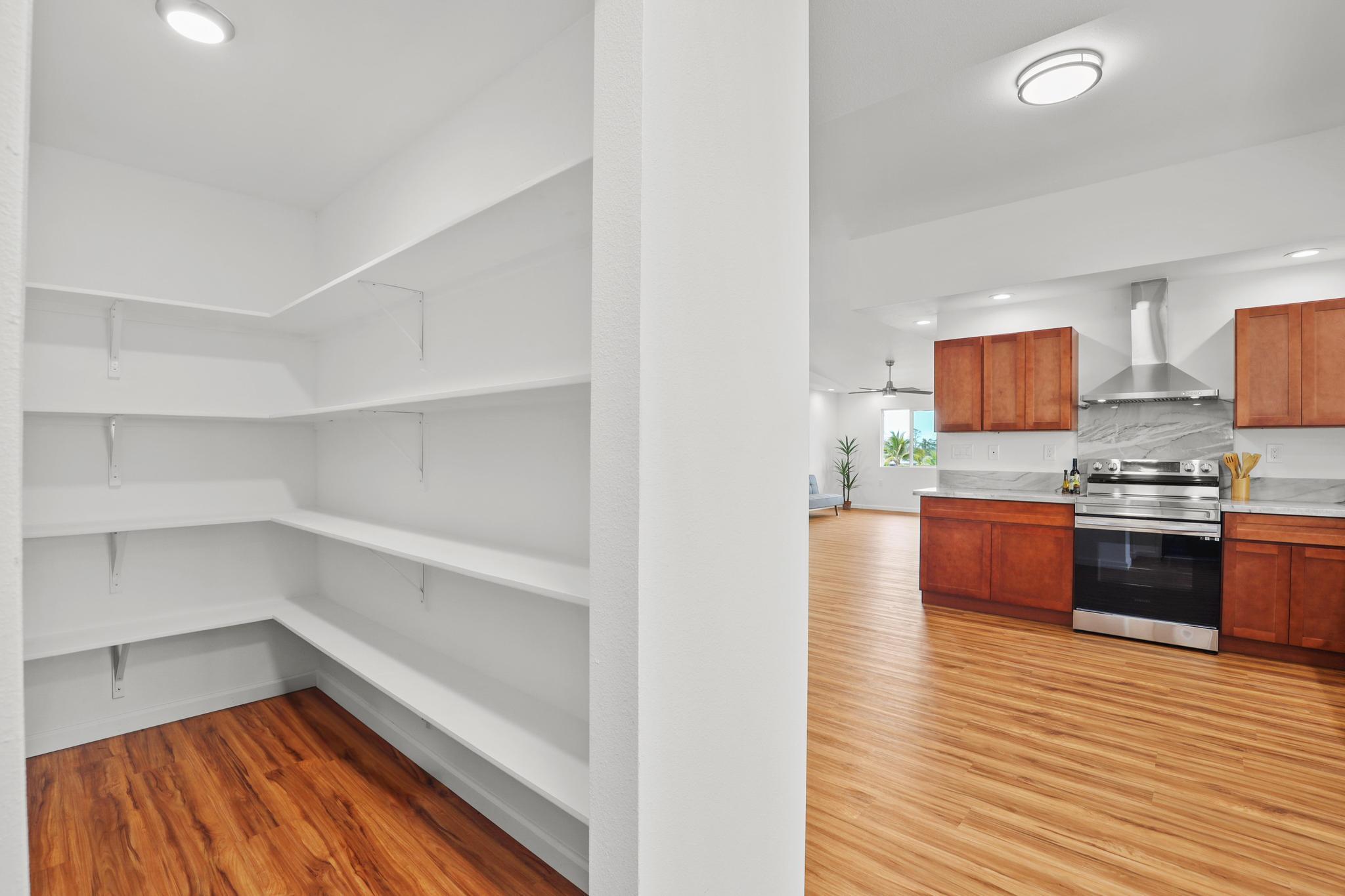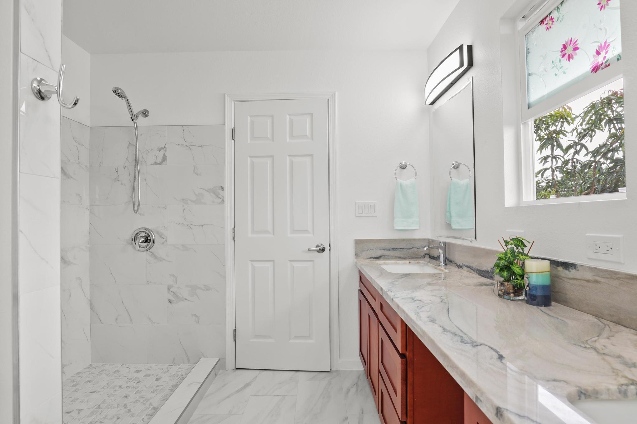 Situated on a cleared, level one-acre parcel along a paved road in Hawaiian Paradise Park, this 4-bedroom, 3.5-bath home was thoughtfully designed for easy island living with seamless indoor-outdoor flow. The expansive main living area blends the kitchen, dining, and living spaces into one impressive great room–perfect for gathering and entertaining. Abundant windows invite in natural light and refreshing cross-breezes, while 10-foot ceilings and soffit lighting enhance the open, airy feel. Set back from the road, the property offers generous space for both front and back yards, creating privacy and room to enjoy the outdoors.