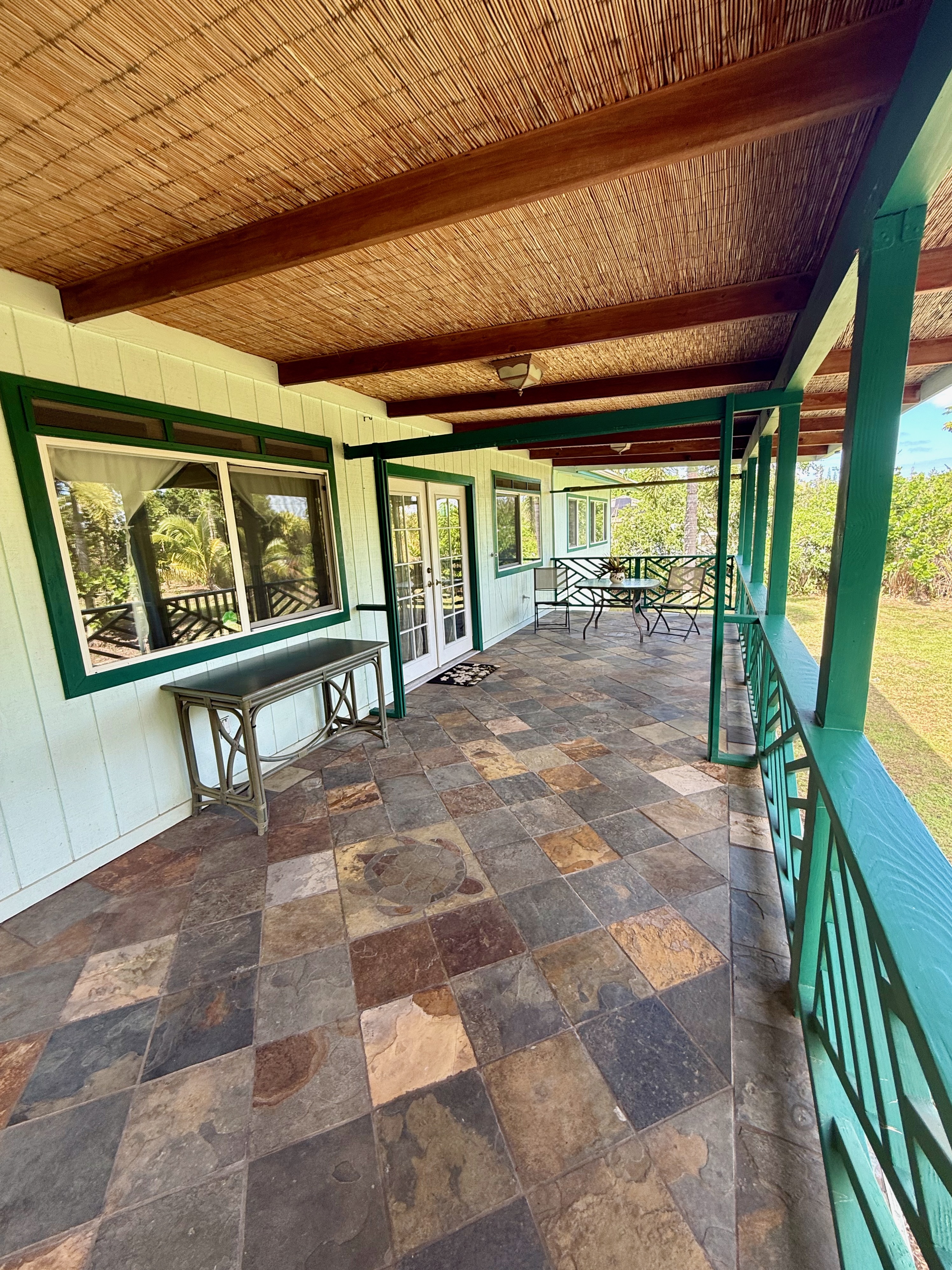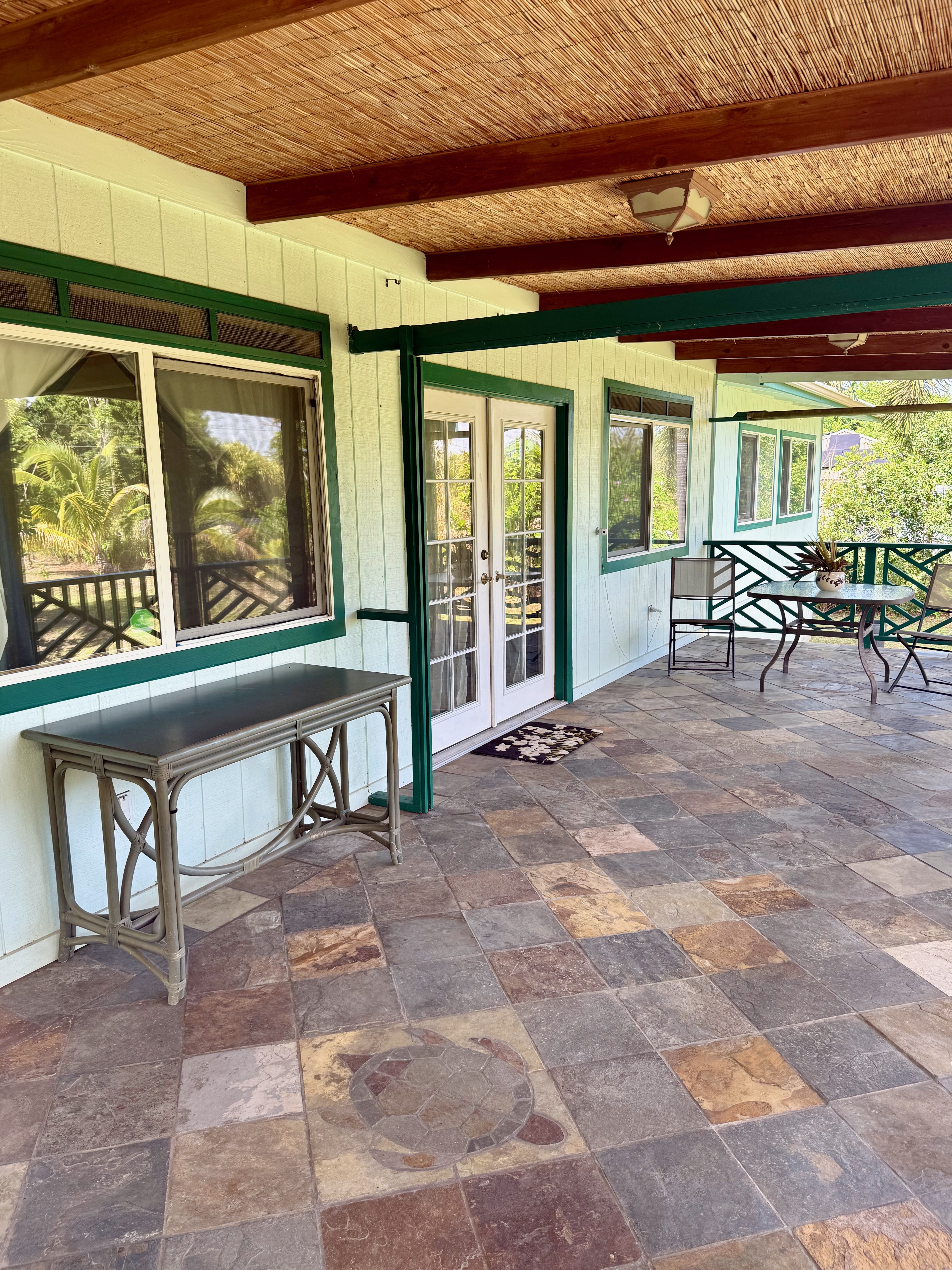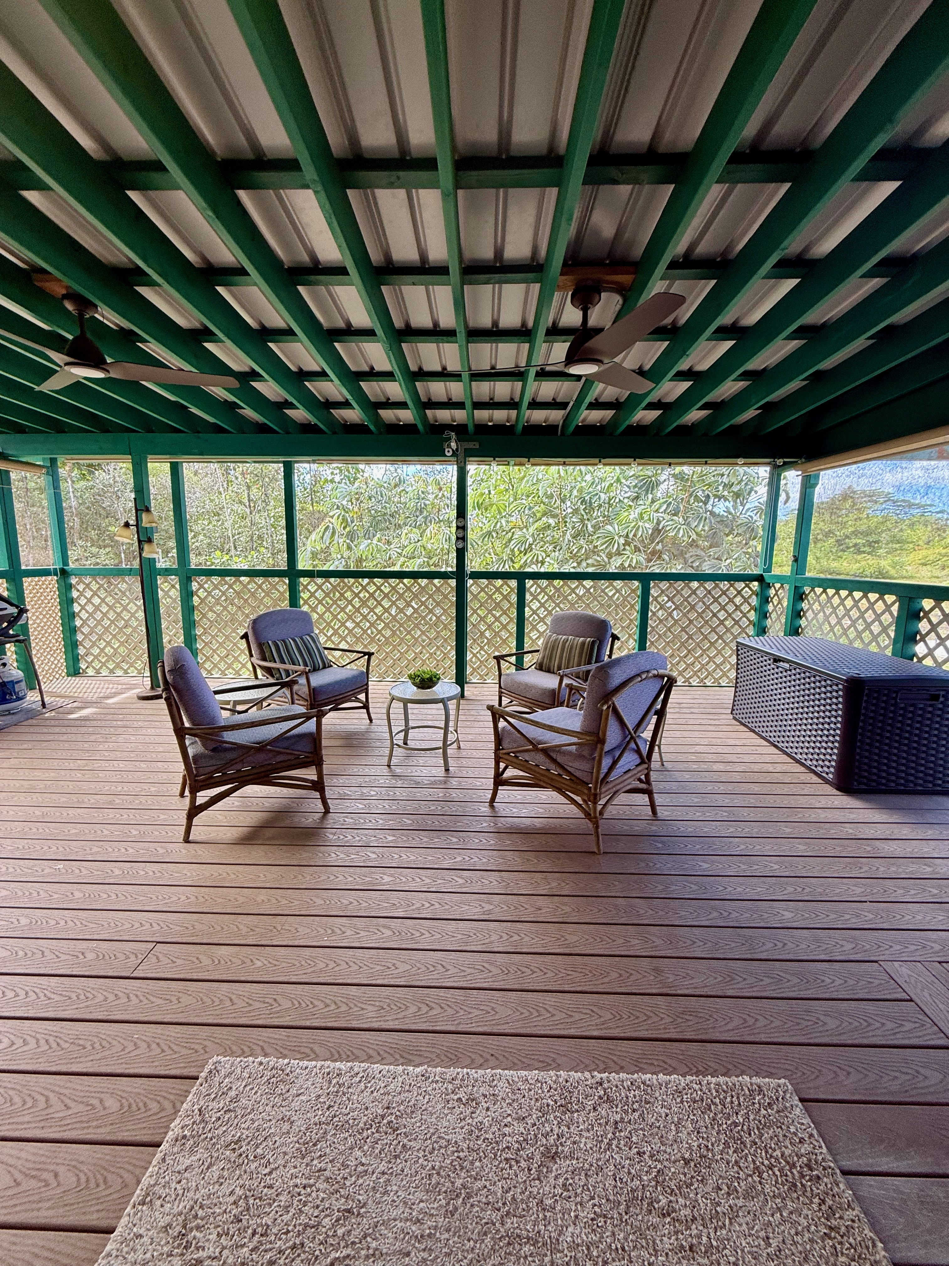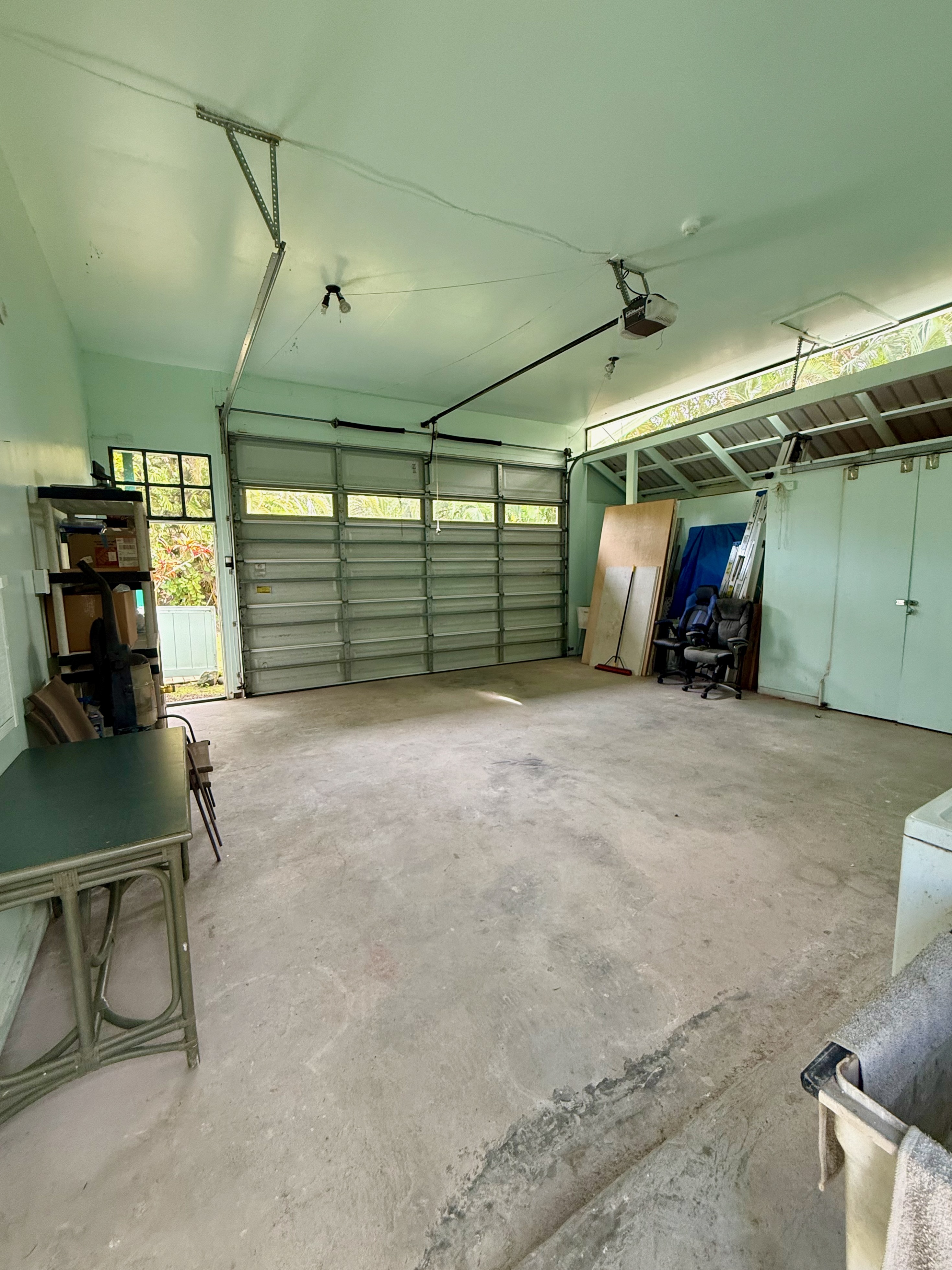 This versatile 3-bedroom, 2-bath home offers flexible living options as a single-family residence or income-producing rental. The home features high vaulted ceilings and both a front and back lanai, including a spacious screened-in back lanai overlooking a peaceful native ?Ohi?a forest, with the rear half-acre intentionally left in its natural, indigenous state. The front lanai features slate tile, providing an inviting entry and additional outdoor living space. A large passageway features a wet bar with two small refrigerators, (easily adaptable as a kitchenette) and large wooden shoji-style doors that create a semi-separate living area between the main house and the master bedroom and back lanai, allowing the property to function similarly to a duplex-style layout–ideal for multi-generational living, rental income, a home office, or a wellness practice such as massage or acupuncture. Located within one mile of the ocean in Hawaiian Paradise Park’s desirable “Sunbelt,” cooling trade winds provide year-round comfort. The main living area features durable laminate flooring, while the kitchen is finished with marble countertops. Two bedrooms share a full bathroom, and the spacious primary suite/master bedroom offers berber carpeting, a beautiful slate-tiled shower and floor, dual sinks, and a toilet and a bidet. Additional highlights include a vaulted 2-car garage with large storage closets, washer and dryer, utility sink, and automatic garage door opener for a ten foot high garage door. The front yard features a manicured lawn accented with tropical ornamental landscaping. Situated on one of the lower paved roads, the property also includes a full alarm system, and new Pergo flooring.