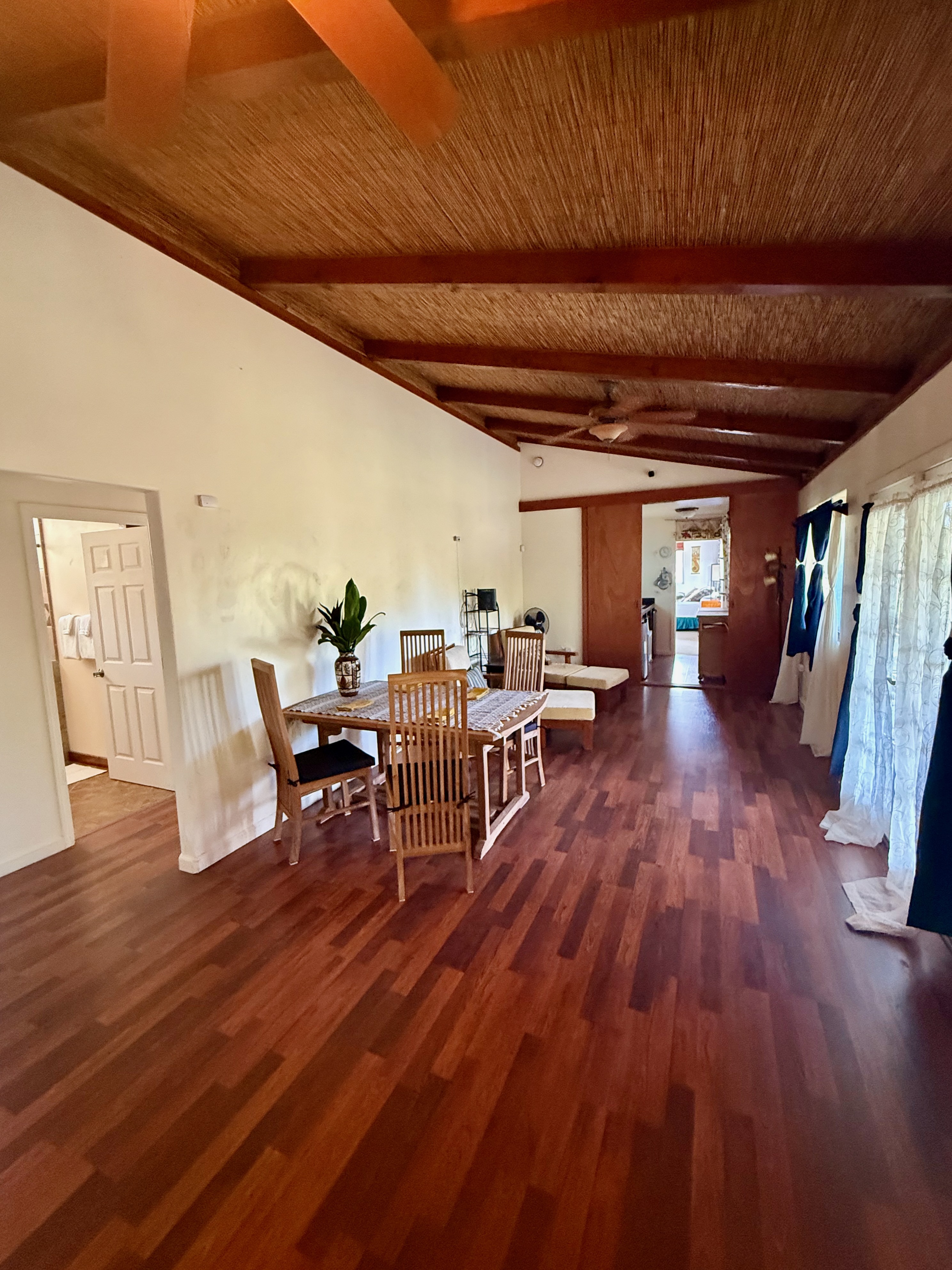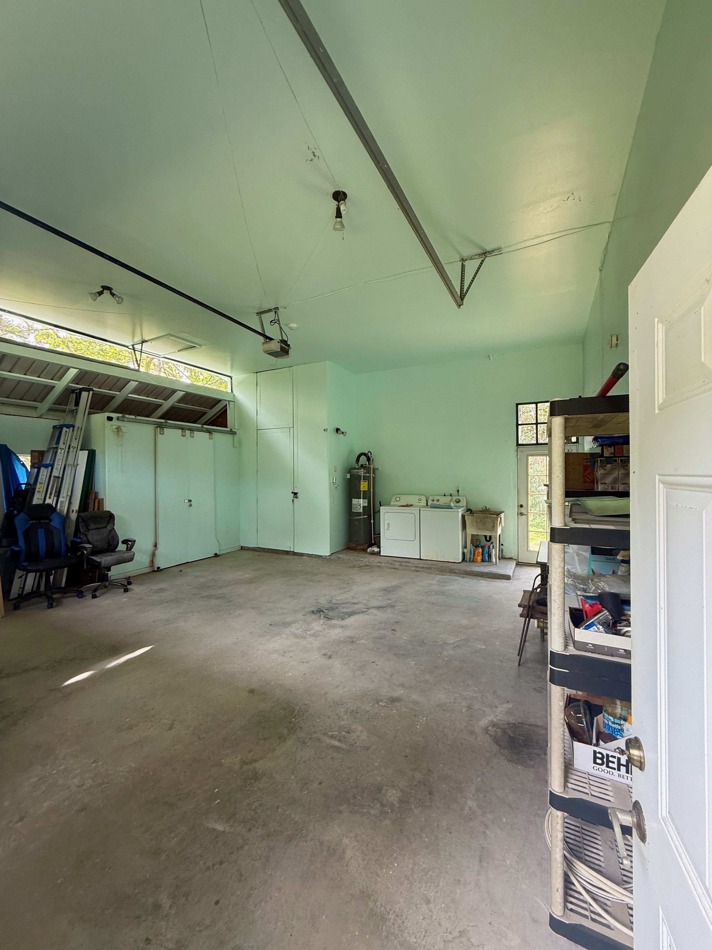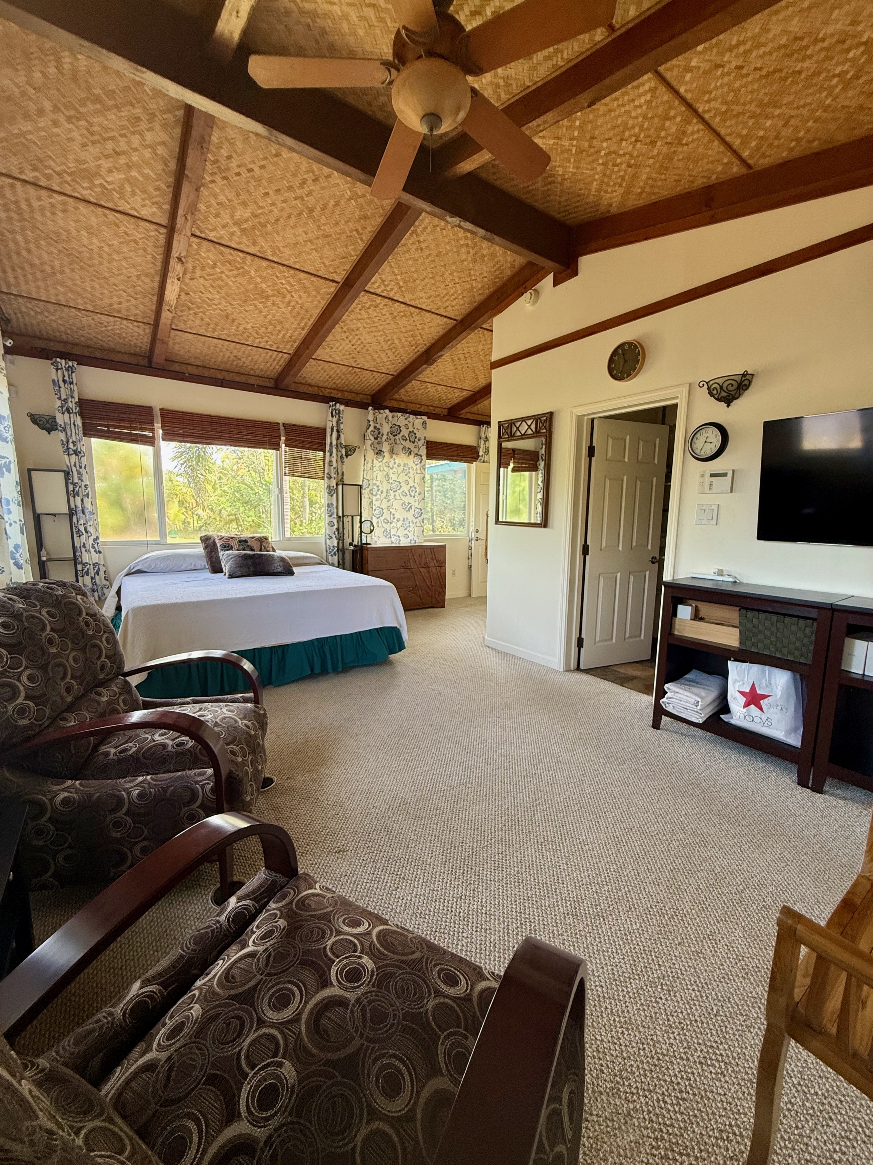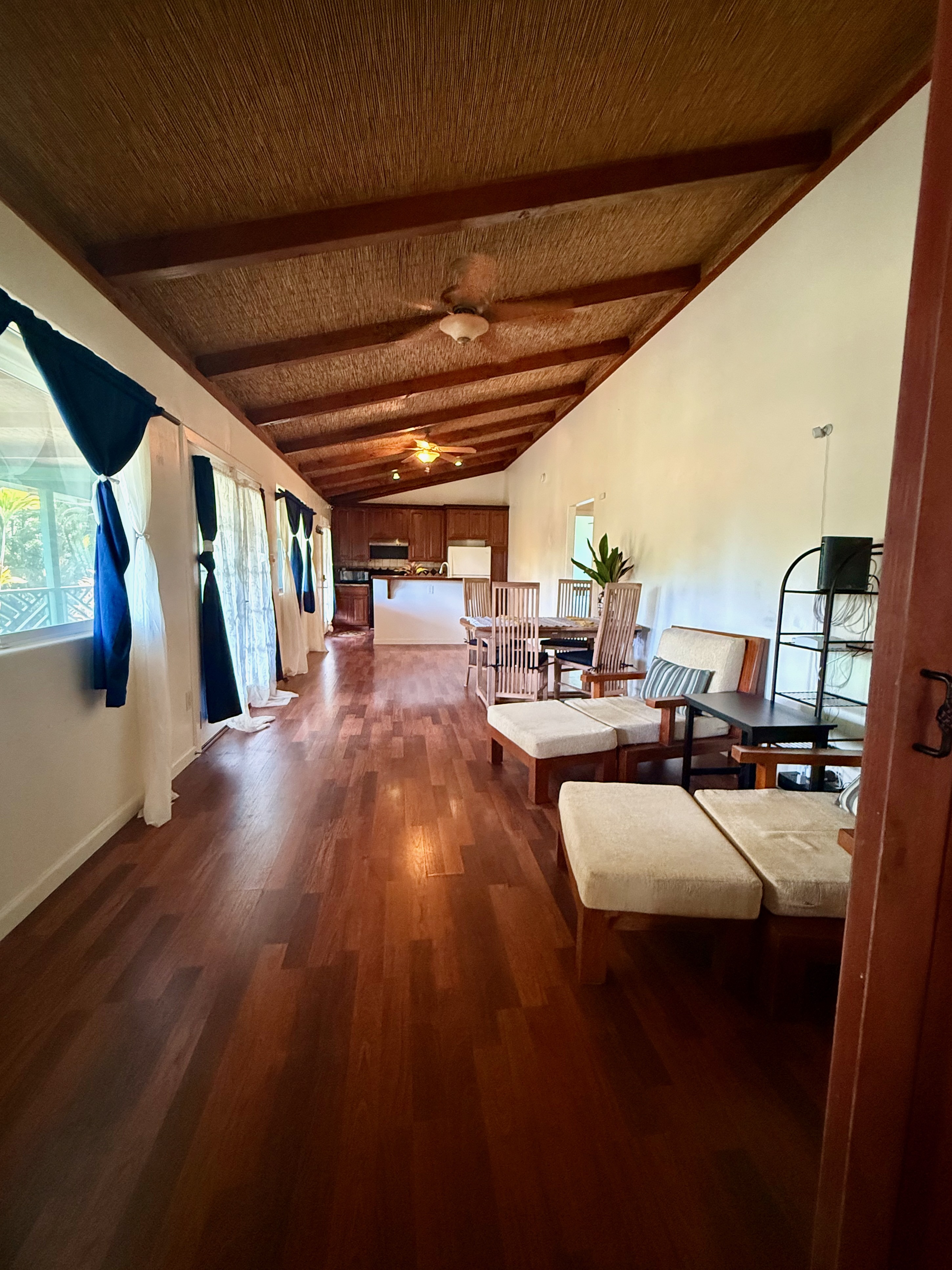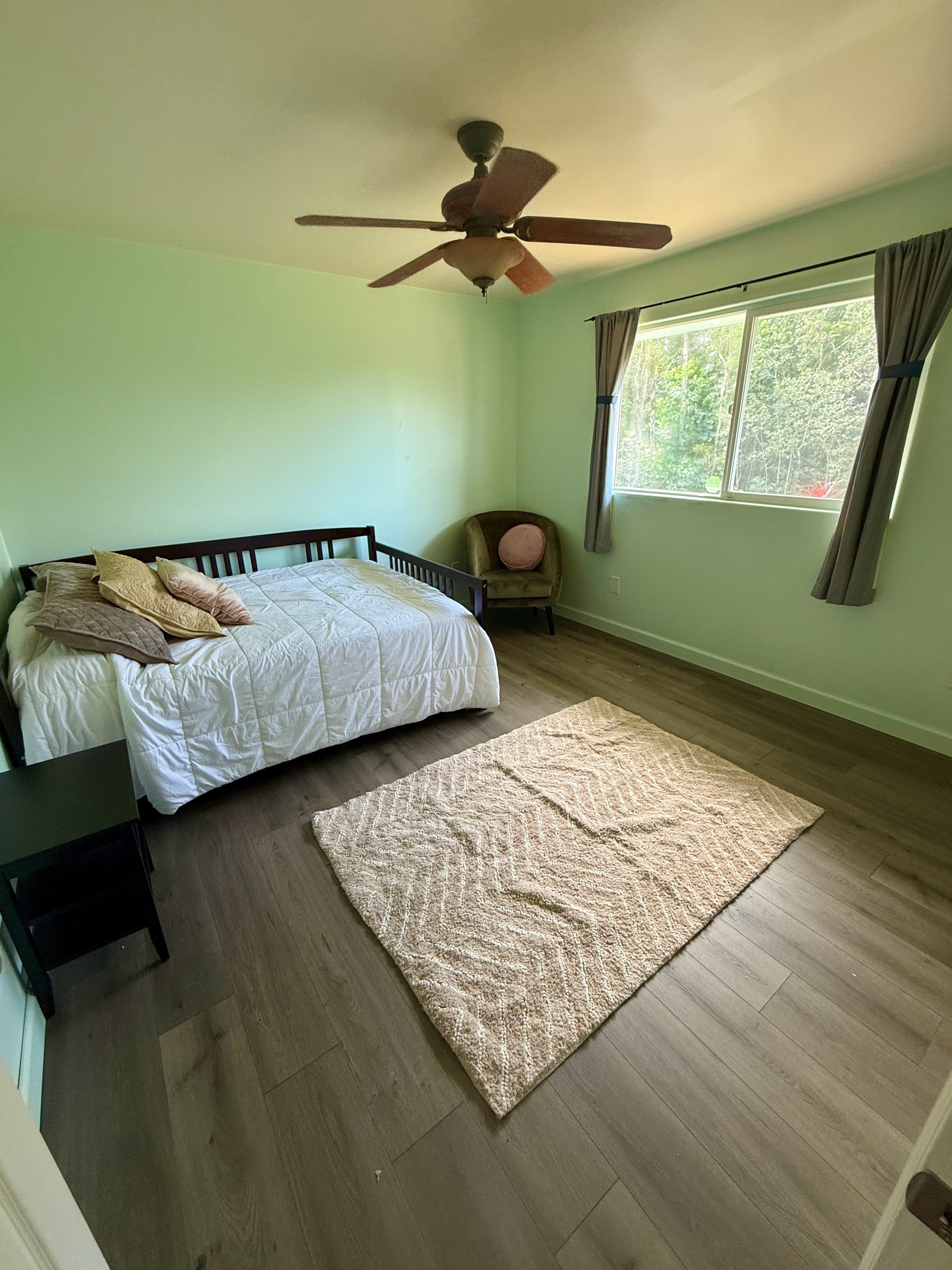 This versatile 3-bedroom, 2-bath home offers flexible living options as a single-family residence or income-producing rental. The home features high vaulted ceilings and both a front and back lanai, including a spacious screened-in back lanai overlooking a peaceful native ?Ohi?a forest, with the rear half-acre intentionally left in its natural, indigenous state. The front lanai features slate tile, providing an inviting entry and additional outdoor living space. A large passageway features a wet bar with two small refrigerators, (easily adaptable as a kitchenette) and large wooden shoji-style doors that create a semi-separate living area between the main house and the master bedroom and back lanai, allowing the property to function similarly to a duplex-style layout–ideal for multi-generational living, rental income, a home office, or a wellness practice such as massage or acupuncture. Located within one mile of the ocean in Hawaiian Paradise Park’s desirable “Sunbelt,” cooling trade winds provide year-round comfort. The main living area features durable laminate flooring, while the kitchen is finished with marble countertops. Two bedrooms share a full bathroom, and the spacious primary suite/master bedroom offers berber carpeting, a beautiful slate-tiled shower and floor, dual sinks, and a toilet and a bidet. Additional highlights include a vaulted 2-car garage with large storage closets, washer and dryer, utility sink, and automatic garage door opener for a ten foot high garage door. The front yard features a manicured lawn accented with tropical ornamental landscaping. Situated on one of the lower paved roads, the property also includes a full alarm system, and new Pergo flooring.