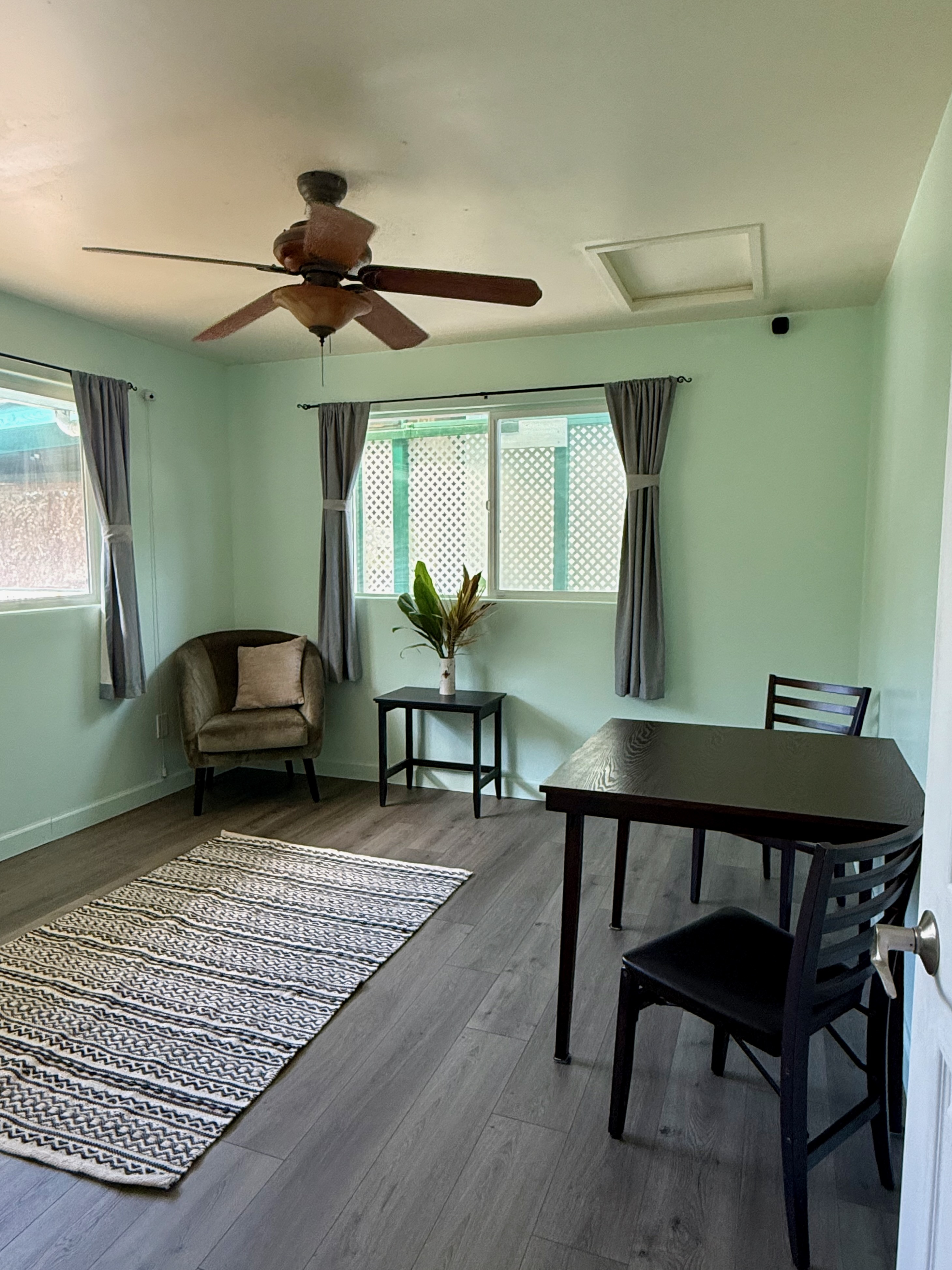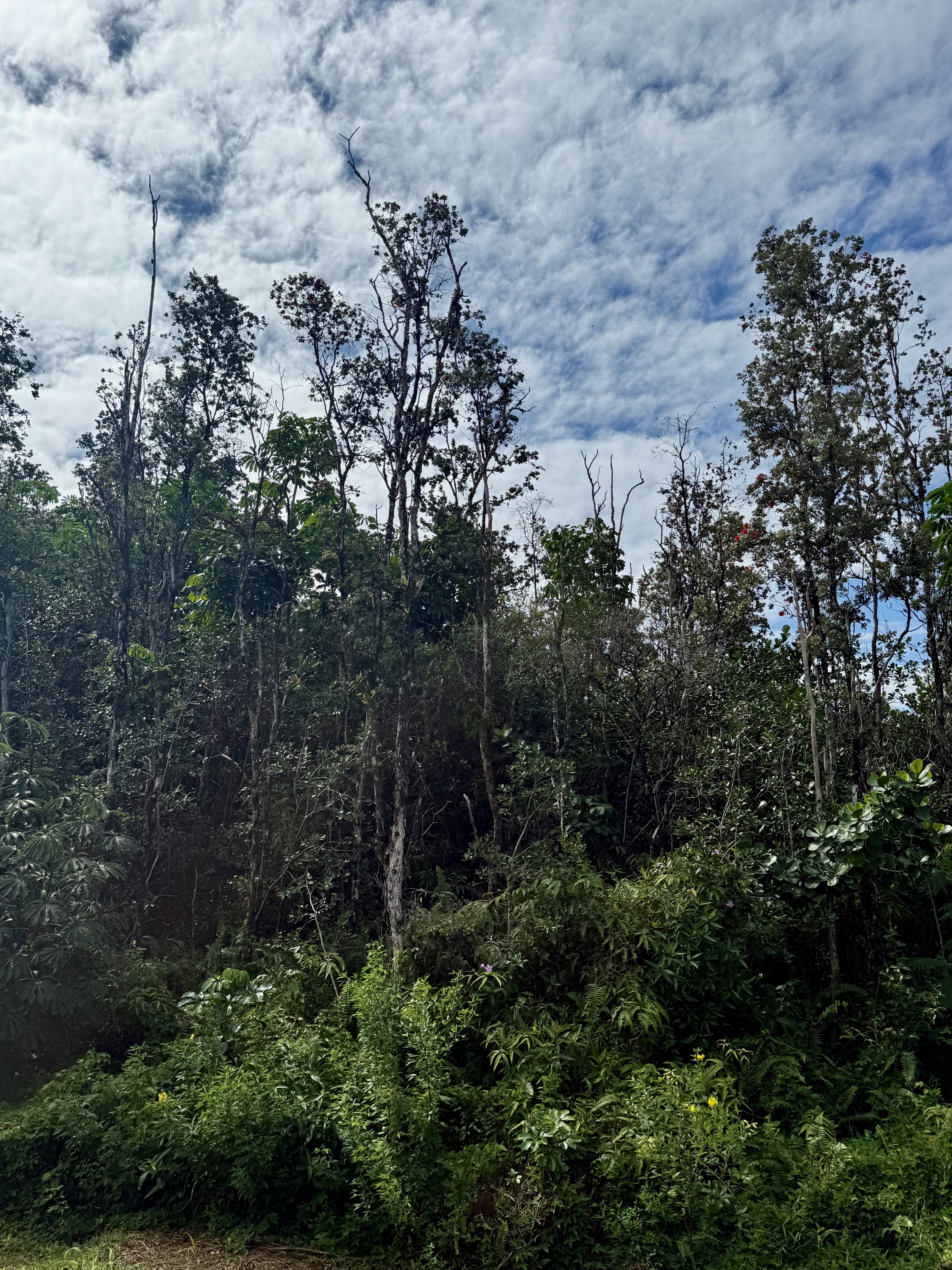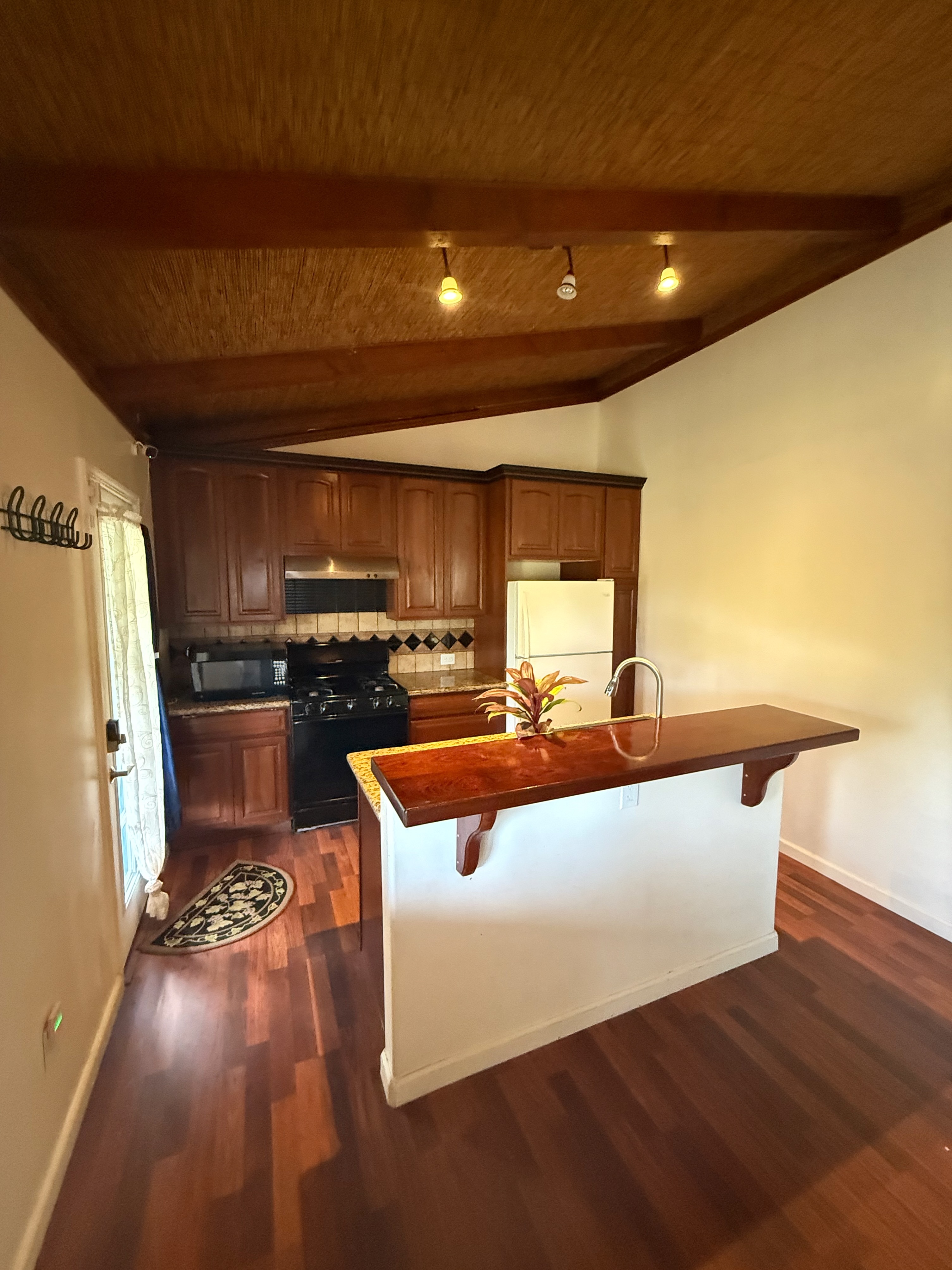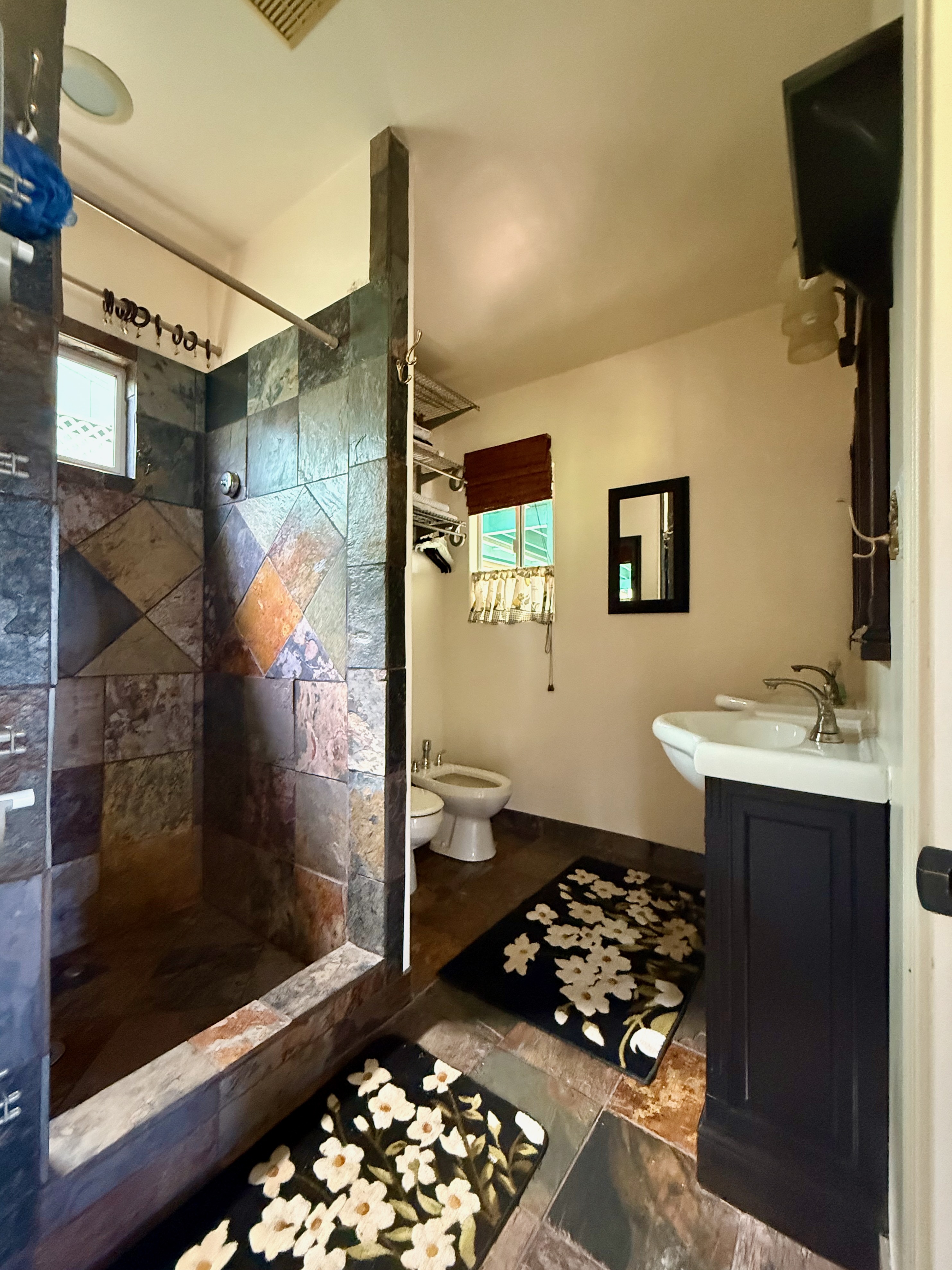 This versatile 3-bedroom, 2-bath home offers flexible living options as a single-family residence or income-producing rental. The home features high vaulted ceilings and both a front and back lanai, including a spacious screened-in back lanai overlooking a peaceful native ?Ohi?a forest, with the rear half-acre intentionally left in its natural, indigenous state. The front lanai features slate tile, providing an inviting entry and additional outdoor living space. A large passageway features a wet bar with two small refrigerators, (easily adaptable as a kitchenette) and large wooden shoji-style doors that create a semi-separate living area between the main house and the master bedroom and back lanai, allowing the property to function similarly to a duplex-style layout–ideal for multi-generational living, rental income, a home office, or a wellness practice such as massage or acupuncture. Located within one mile of the ocean in Hawaiian Paradise Park’s desirable “Sunbelt,” cooling trade winds provide year-round comfort. The main living area features durable laminate flooring, while the kitchen is finished with marble countertops. Two bedrooms share a full bathroom, and the spacious primary suite/master bedroom offers berber carpeting, a beautiful slate-tiled shower and floor, dual sinks, and a toilet and a bidet. Additional highlights include a vaulted 2-car garage with large storage closets, washer and dryer, utility sink, and automatic garage door opener for a ten foot high garage door. The front yard features a manicured lawn accented with tropical ornamental landscaping. Situated on one of the lower paved roads, the property also includes a full alarm system, and new Pergo flooring.
