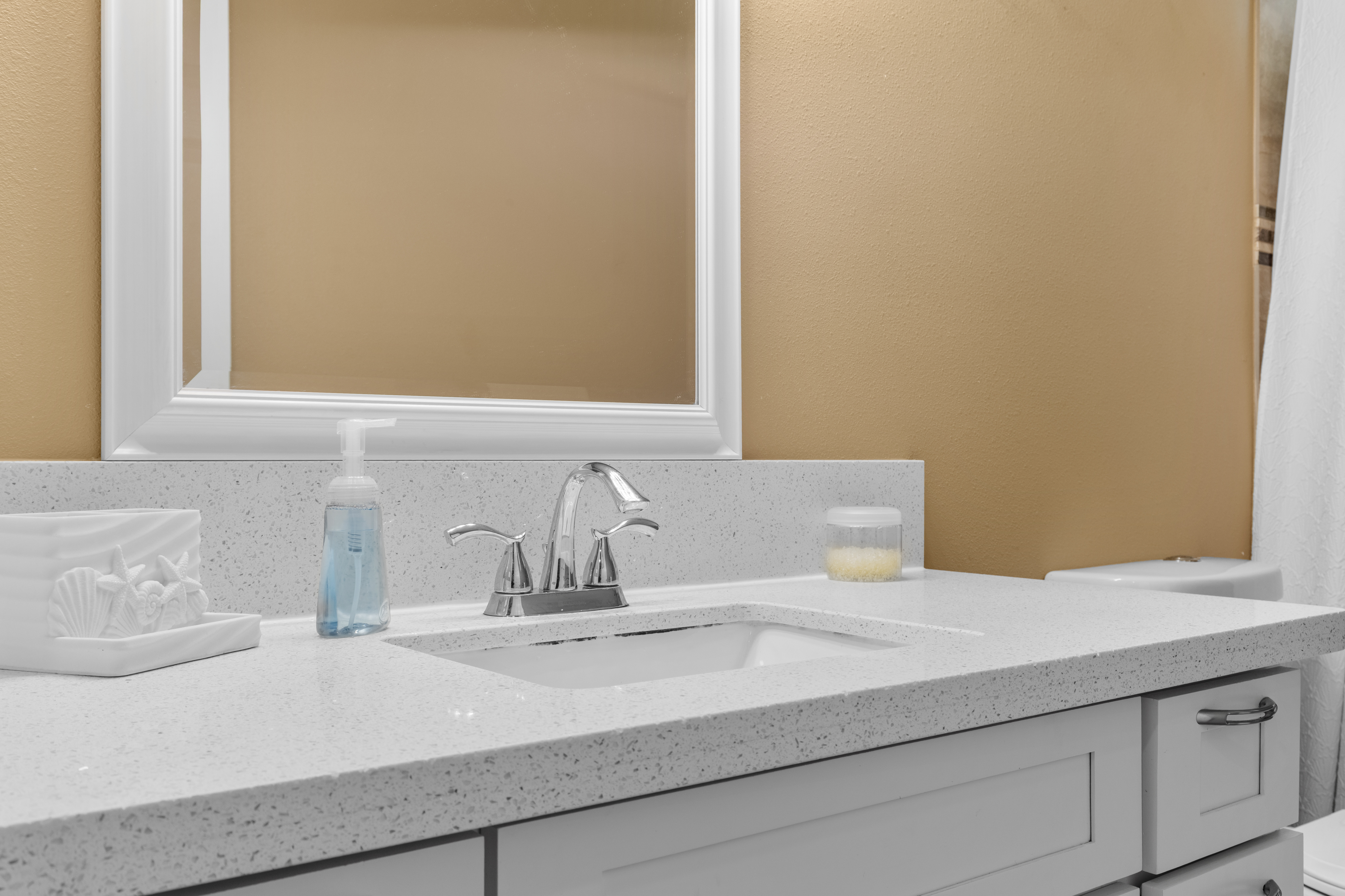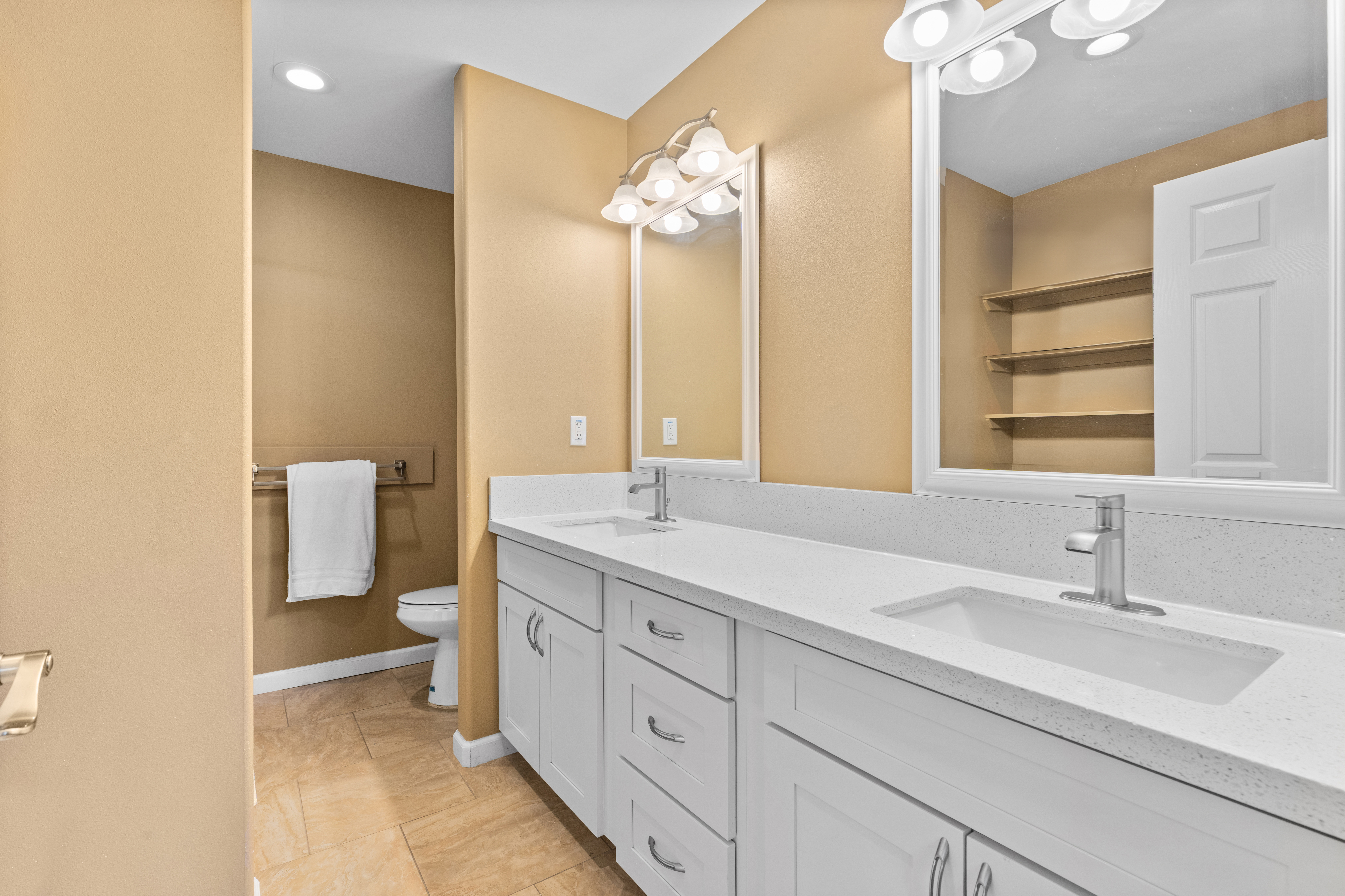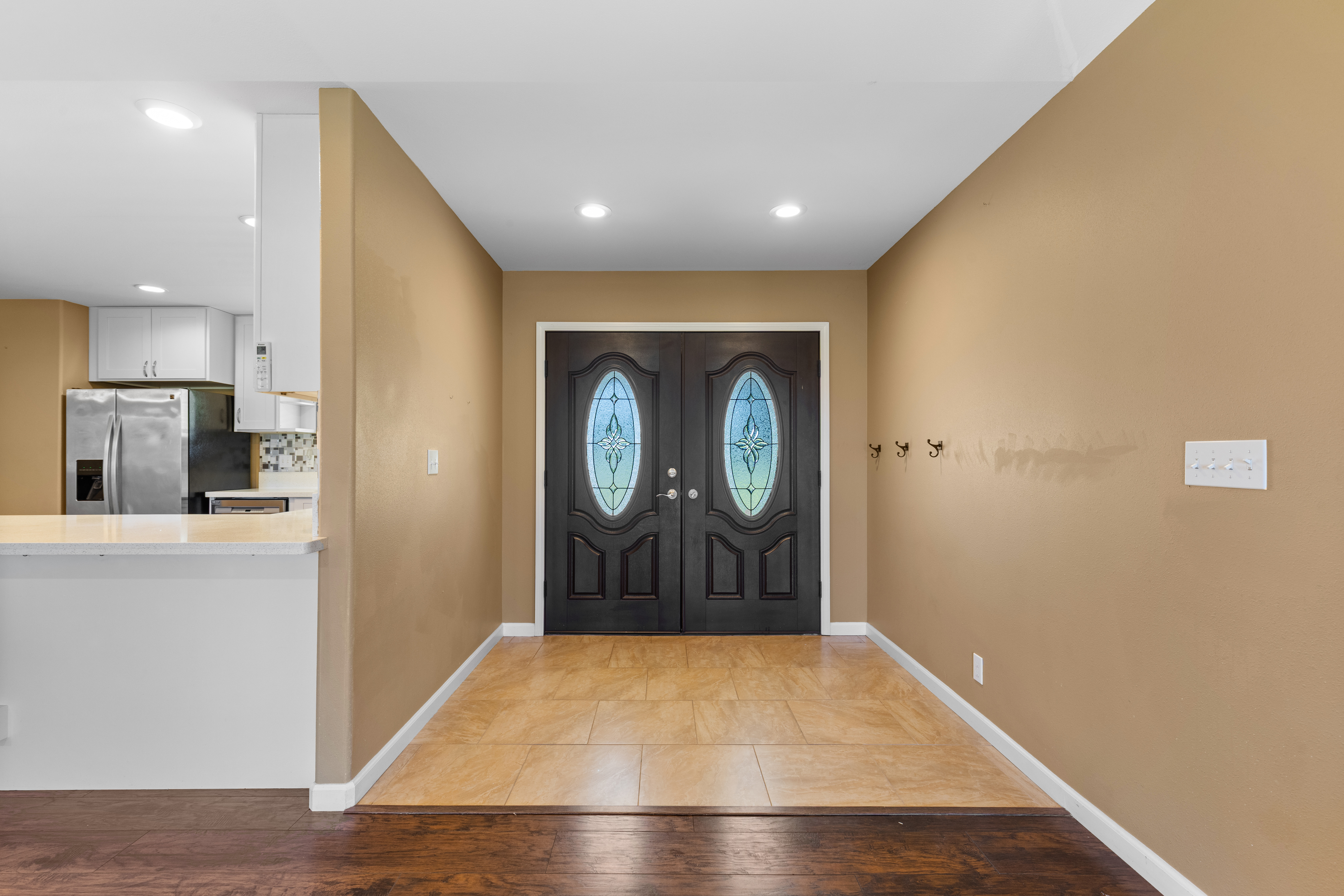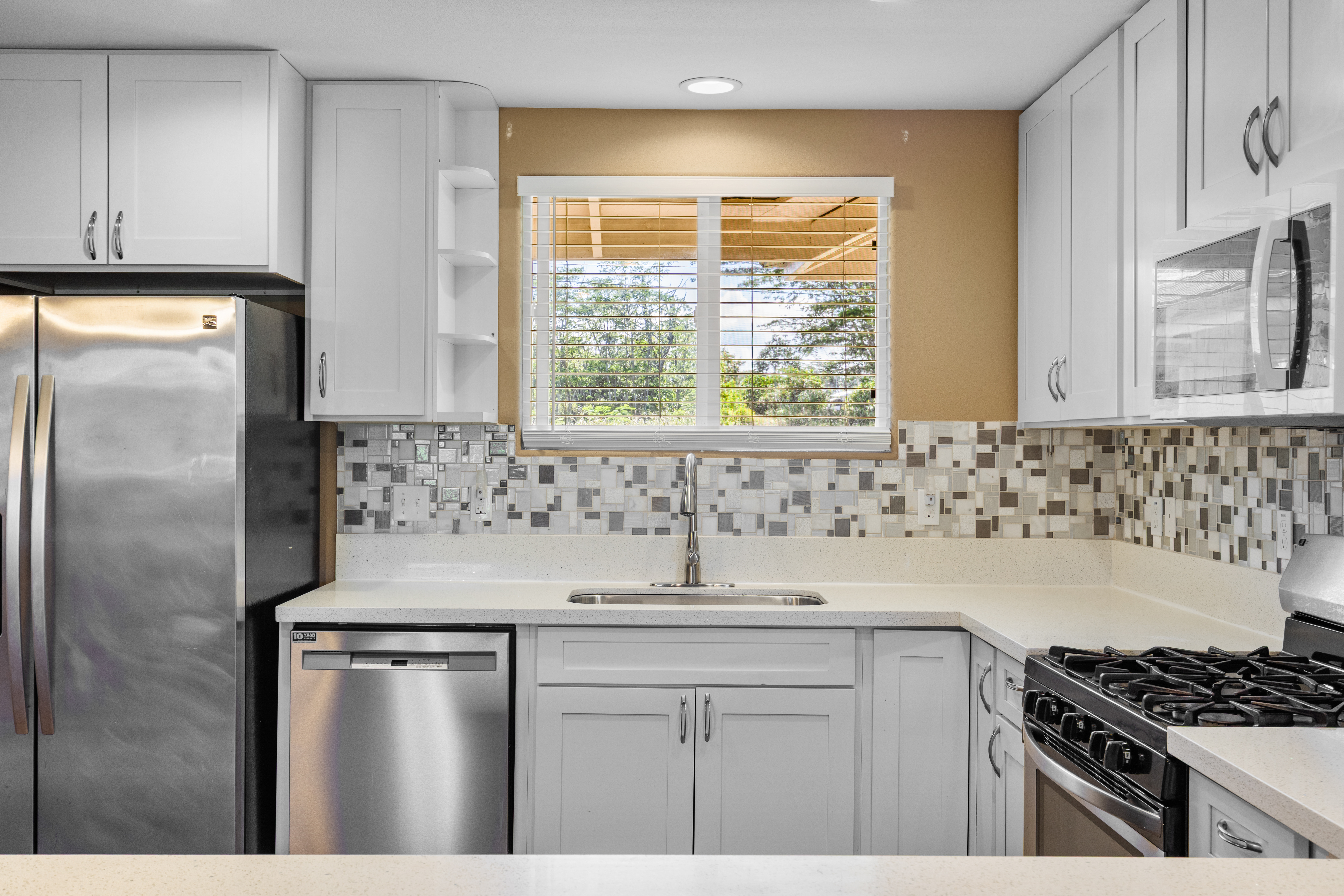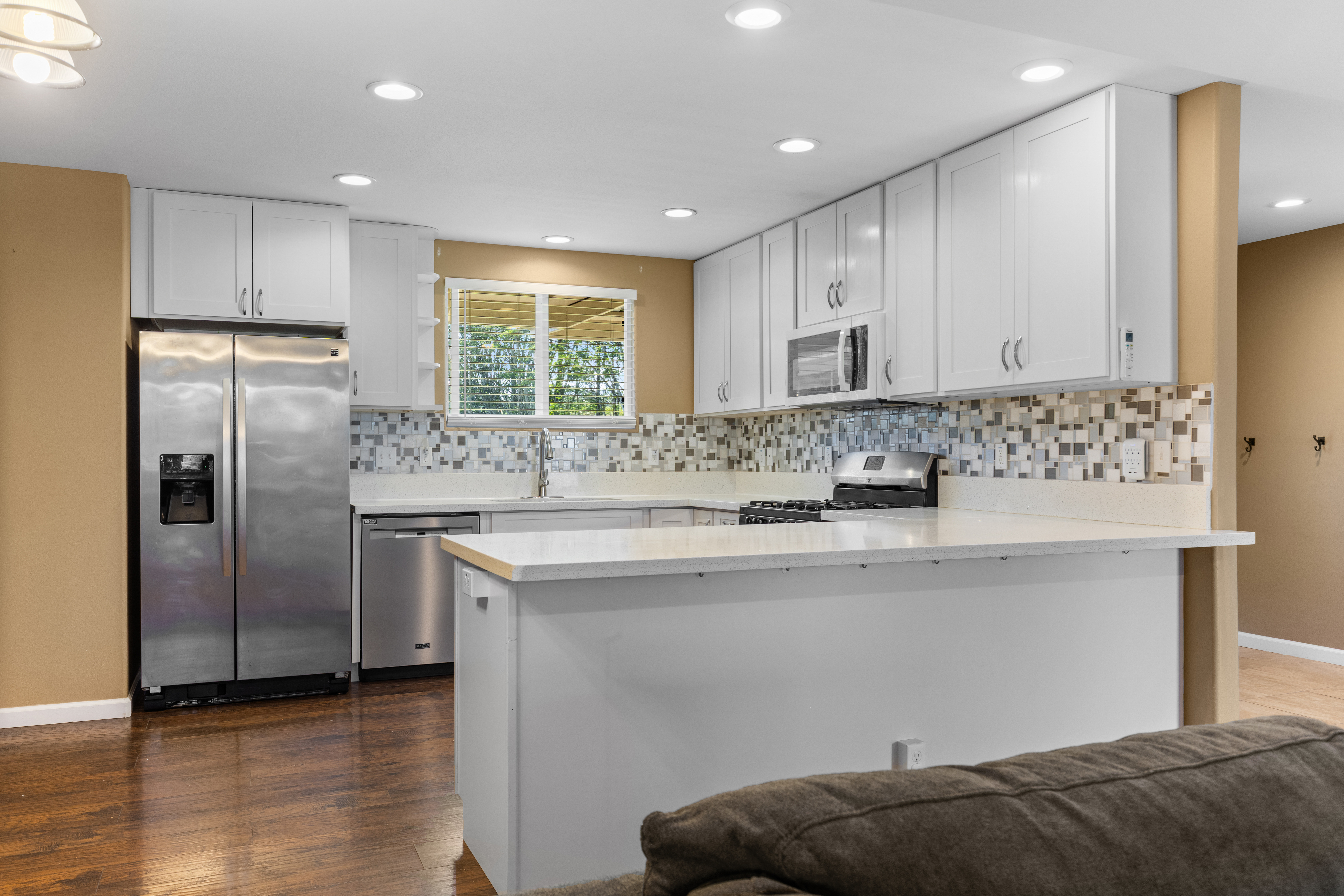 The modern kitchen offers white quartz countertops, stainless steel appliances, and soft-close cabinetry, seamlessly flowing into the living and dining areas–perfect for entertaining. Just off the kitchen is the indoor laundry room with ample storage, leading directly to the attached two-car garage.
