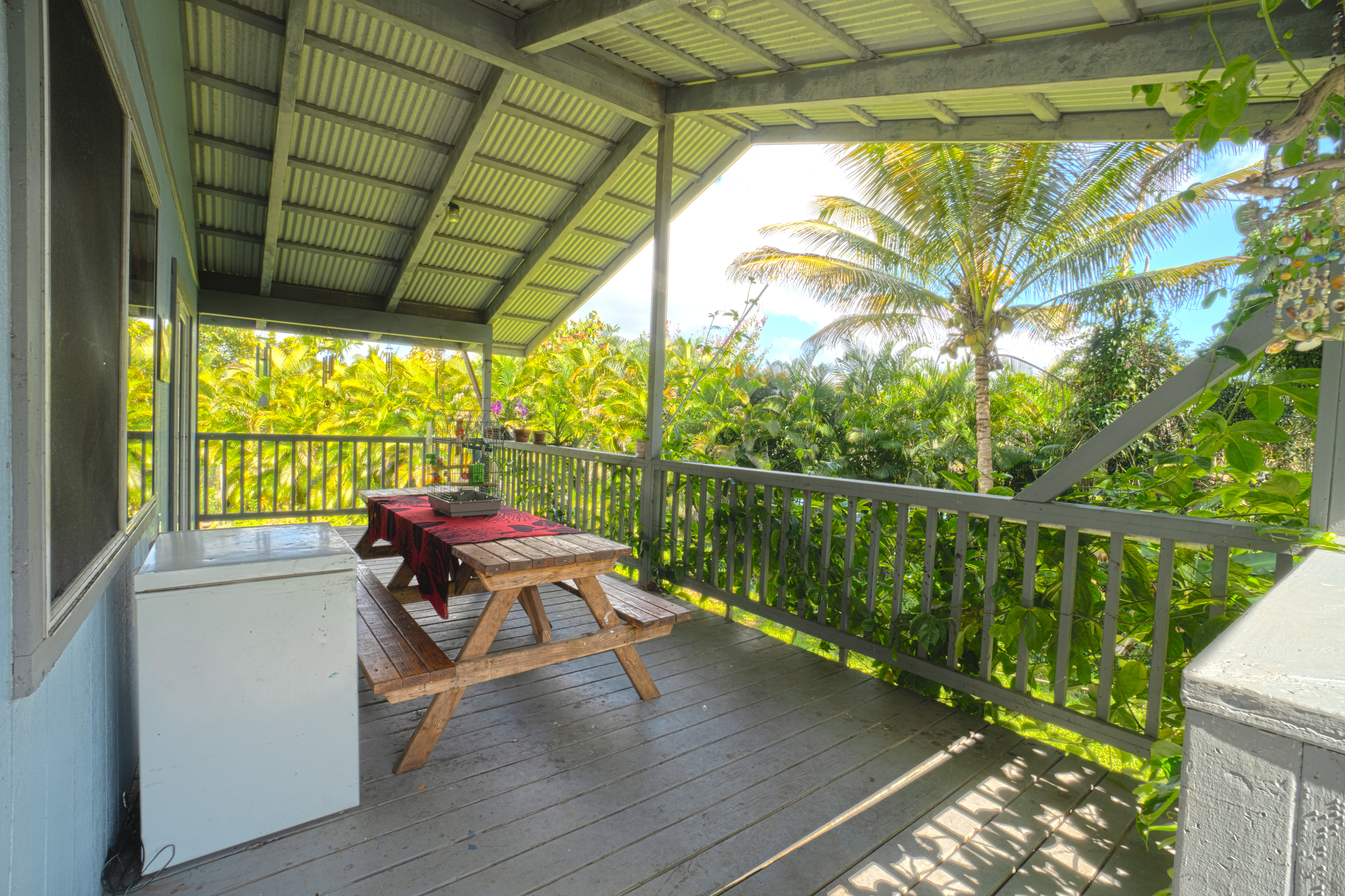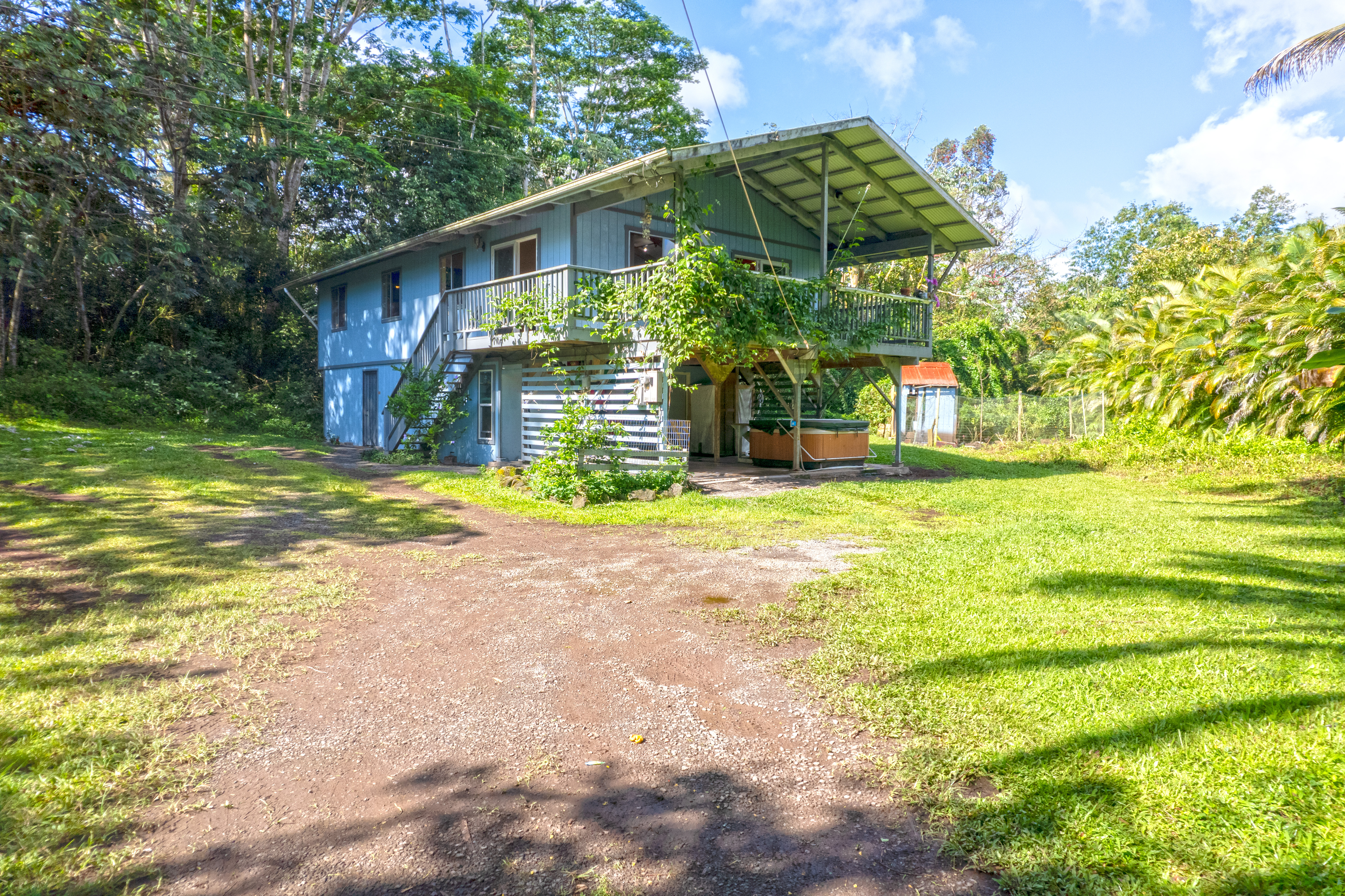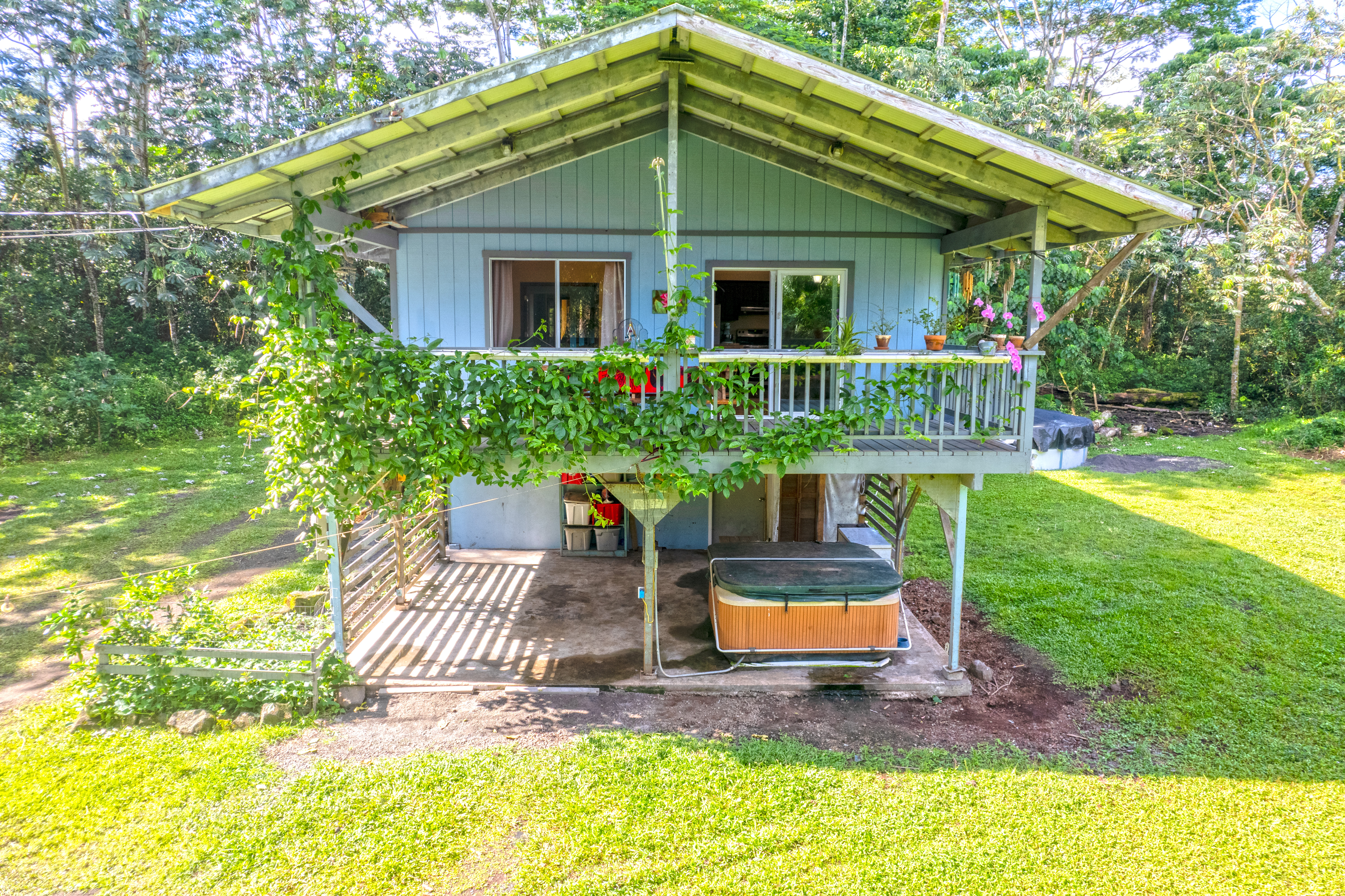 Nestled at the top of a knoll on an acre of land this two-story home is located in the middle of Hawaiian Paradise Park and surrounded by the privacy of old growth jungle. With three bedrooms and two bathrooms upstairs and two additional (Unpermitted) bedrooms downstairs, there is plenty of room for large and extended family or guests. Upstairs has an open floor plan with a large kitchen, living room, dining area, and connecting lanai. The kitchen features stainless steel appliances, new countertops, and plenty of cupboard space. Out on the lanai is a wonderful place to relax, watch the sunrise or sunset, listen to the birds, and occasionally the ocean. A five minute drive will take you directly to the shore with various trails and tide pools to explore. Bathrooms have been remodeled with new flooring, toilets, vanities, and fresh paint. The whole house has been freshly painted inside and out. Downstairs is a carport area including a hot tub. There is also a laundry/workshop area with space to expand to a sixth bedroom. Windows and doors have already been purchased and can be included with the sale. Two large rooms have already been fully finished in the downstairs and both have separate entrances. Outside there are numerous edible plants including banana, orange, butter avocado, and coconut. There is also a chicken coop with a fenced chicken run.