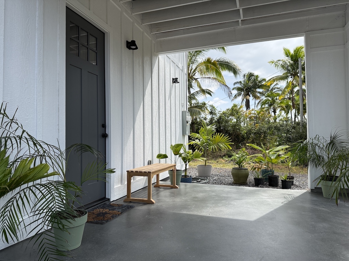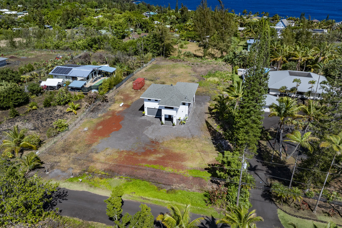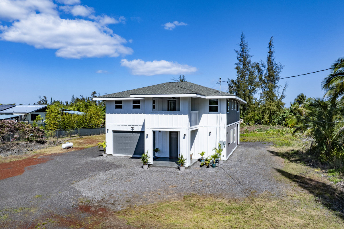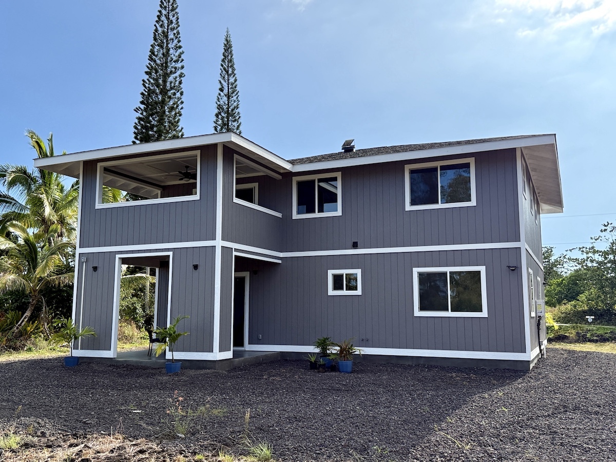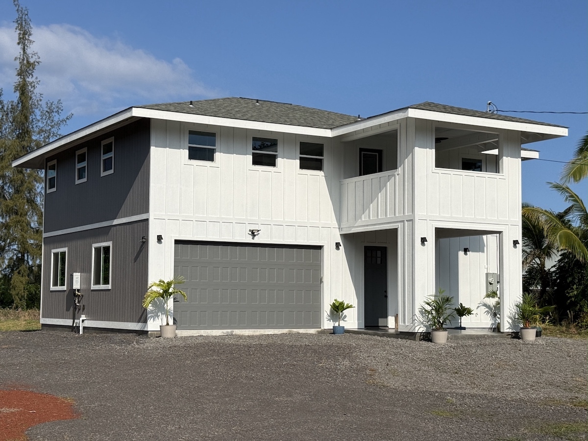 Modern design with tropical flair. Don't miss this exceptional 2-story custom home on 1 acre lot on paved 1st Ave. in HPP. Thoughtfully designed for seamless indoor/outdoor living, this 1-year new home features 2,160 sq.ft. of living space, 672 sq. ft. of covered lanais, and a 400 sq. ft., 2-car garage, for a total of 3,232 sq. ft under roof. Upstairs you'll find the large, open, living room, dining room and kitchen, the primary suite with walk-in closet, a half bath and laundry, and 2 covered lanais. Downstairs features two bedrooms, a bathroom, a rec room with kitchenette, and a second laundry, all under 10-foot ceilings. Stained concrete floors and 8' tall doors add a luxurious feel. Off the rec room is another covered lanai that leads to a large back yard, which offers ample space to add a swimming pool, boat parking, ohana unit, garden, orchard, etc. Located near the ocean for easy access to the scenic shoreline for walks or bike rides! Sold partly furnished (staging items excluded) and on a private water well. 20' shipping container available separately. This home is in like-new condition, only used on occasion by owner, and is move-in ready. See it today!