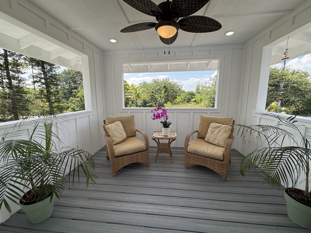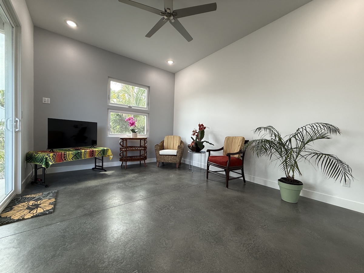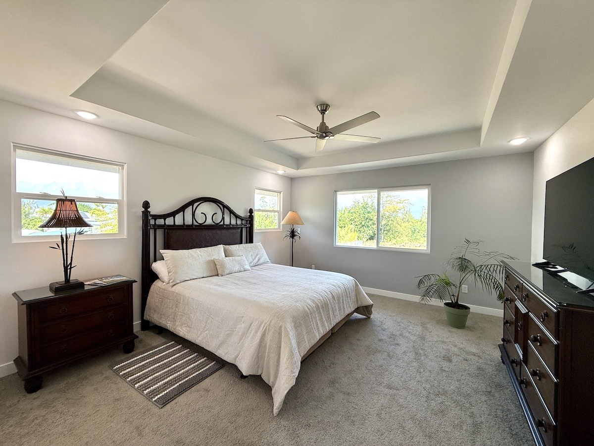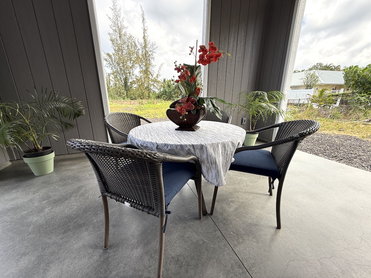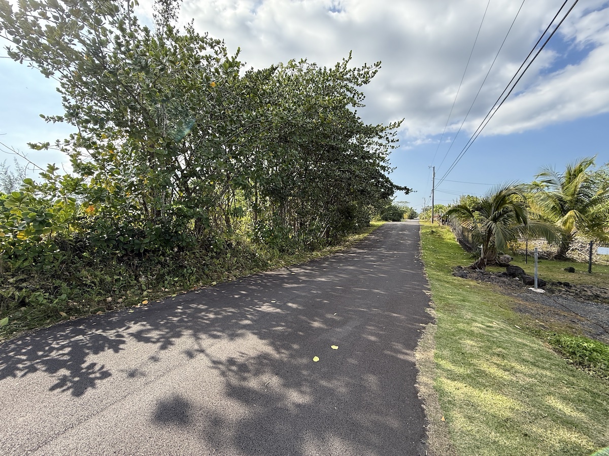 Modern design with tropical flair. Don't miss this exceptional 2-story custom home on 1 acre lot on paved 1st Ave. in HPP. Thoughtfully designed for seamless indoor/outdoor living, this 1-year new home features 2,160 sq.ft. of living space, 672 sq. ft. of covered lanais, and a 400 sq. ft., 2-car garage, for a total of 3,232 sq. ft under roof. Upstairs you'll find the large, open, living room, dining room and kitchen, the primary suite with walk-in closet, a half bath and laundry, and 2 covered lanais. Downstairs features two bedrooms, a bathroom, a rec room with kitchenette, and a second laundry, all under 10-foot ceilings. Stained concrete floors and 8' tall doors add a luxurious feel. Off the rec room is another covered lanai that leads to a large back yard, which offers ample space to add a swimming pool, boat parking, ohana unit, garden, orchard, etc. Located near the ocean for easy access to the scenic shoreline for walks or bike rides! Sold partly furnished (staging items excluded) and on a private water well. 20' shipping container available separately. This home is in like-new condition, only used on occasion by owner, and is move-in ready. See it today!