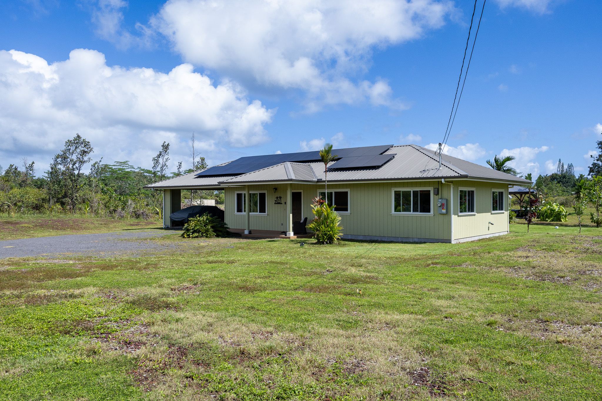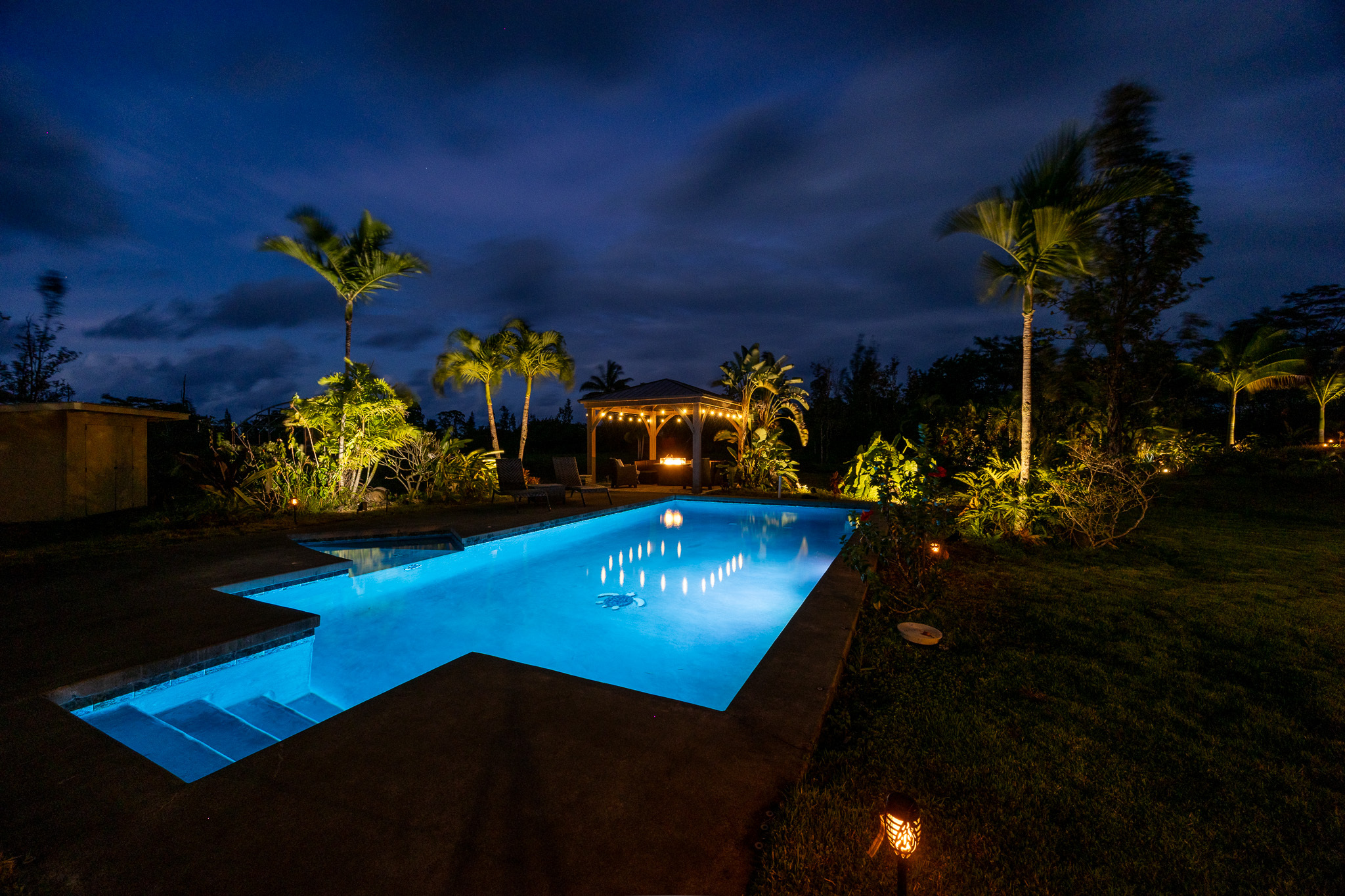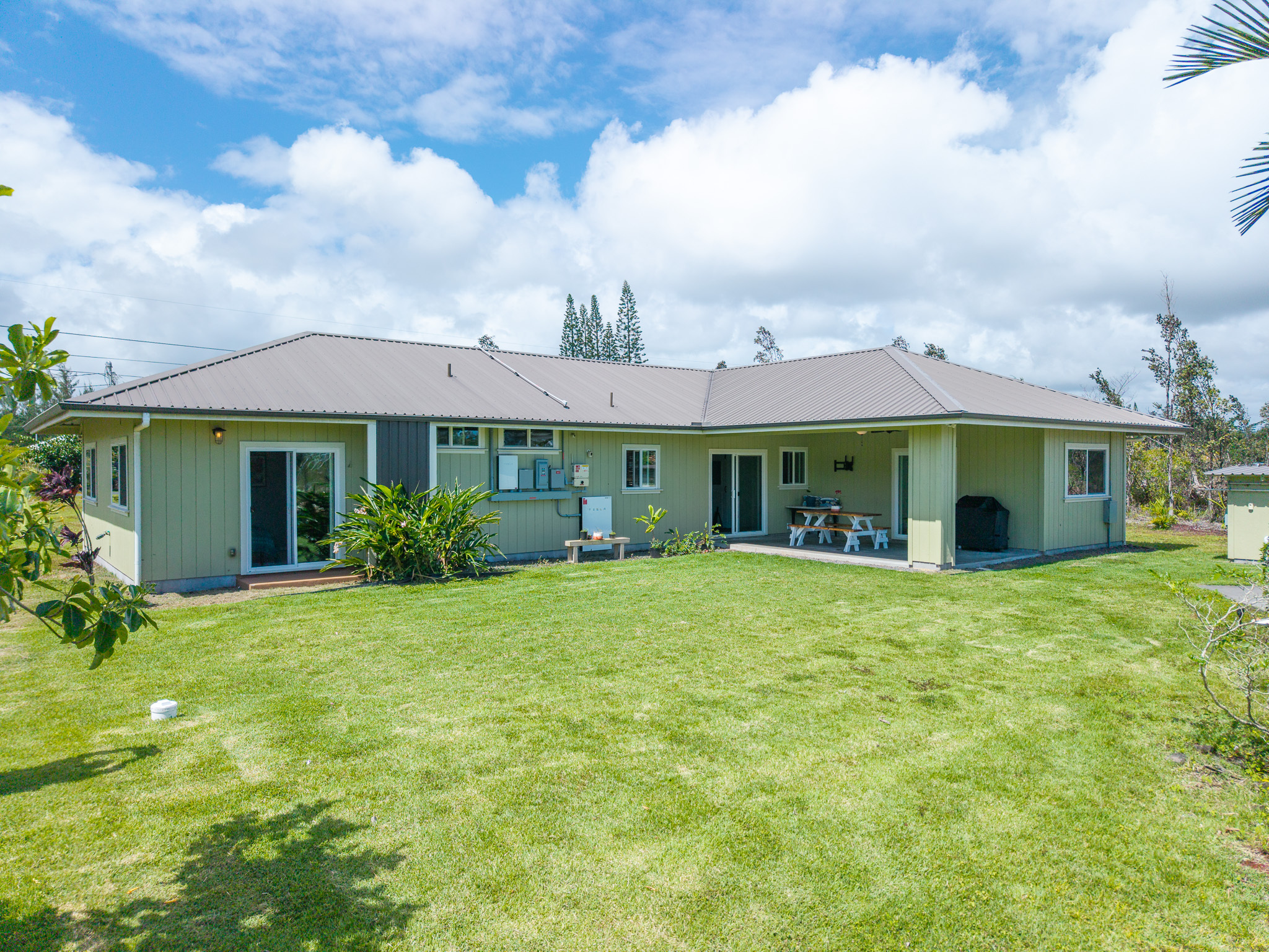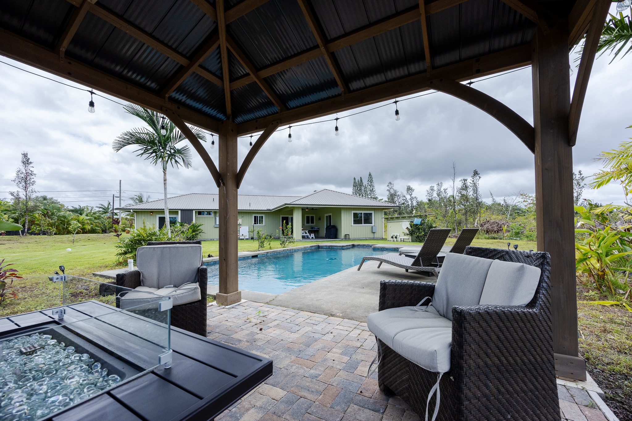 Welcome to this beautiful 4-bedroom, 3-bath home situated on a full acre in Hawaiian Paradise Park, offering the perfect blend of comfort, privacy, and island-style outdoor living. The property has been thoughtfully improved, with the lot recently cleared and leveled, fresh grass seed planted, and Areca palms and vibrant bromeliads added along the front for a welcoming tropical landscape. Enjoy your own private outdoor retreat featuring an in-ground pool, a gorgeous newly built gazebo, paver patio, and gas fire table–perfect for relaxing evenings or entertaining under the Hawaiian sky. An open lanai and outdoor shower add to the home’s effortless indoor-outdoor lifestyle. Inside, the home is bright and inviting with brand new blinds installed last year. On its own well and furnished, energy efficiency is also a standout feature with an owned photovoltaic solar system paired with a Tesla Powerwall battery, providing sustainability, energy savings, and valuable backup power. The home also features an attached additional living area offering flexibility for guests, extended family, workspace, or a variety of living arrangements. Set on a full acre in Lava Zone 3, this property offers the space, privacy, and relaxed lifestyle that make Big Island living so special. Located in Hawaiian Paradise Park, just a short drive to the dramatic ocean cliffs at the end of Paradise Drive, where you can experience breathtaking coastal views and the natural beauty of the island. Hawaiian Paradise Park Owners Association road maintenance fees apply. Ask your Realtor to see the 3D walkthrough video floorpan virtual tour.