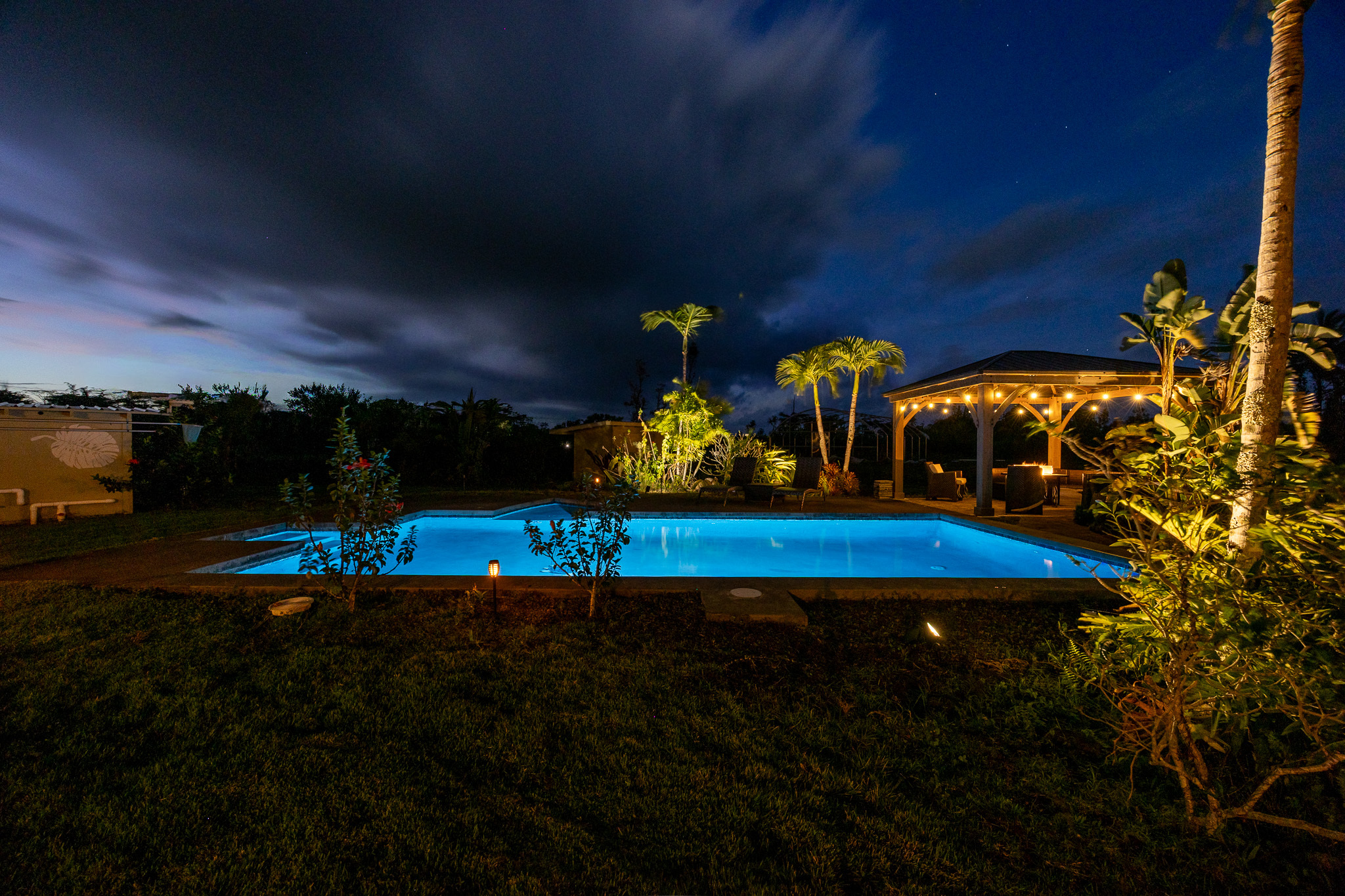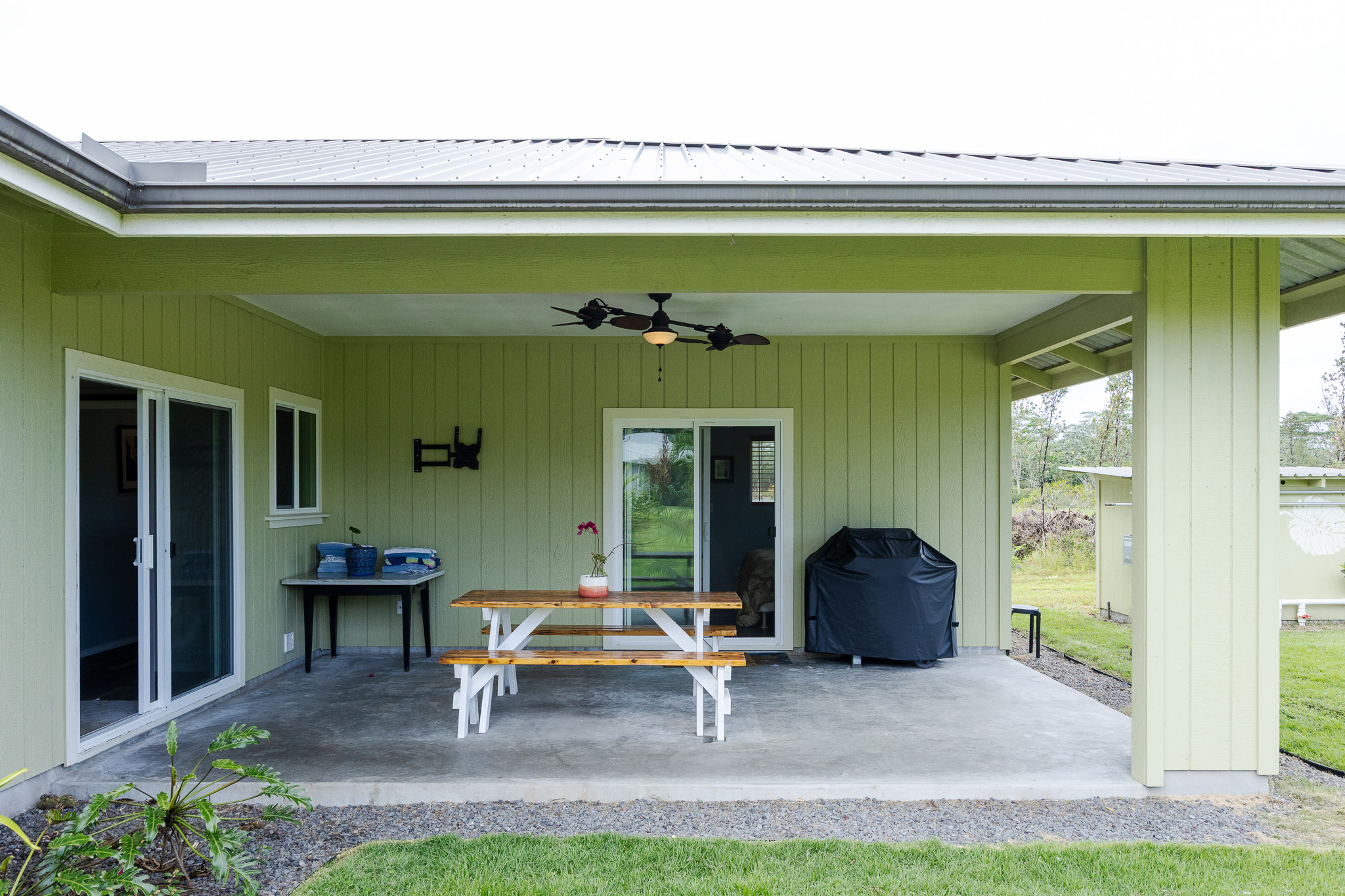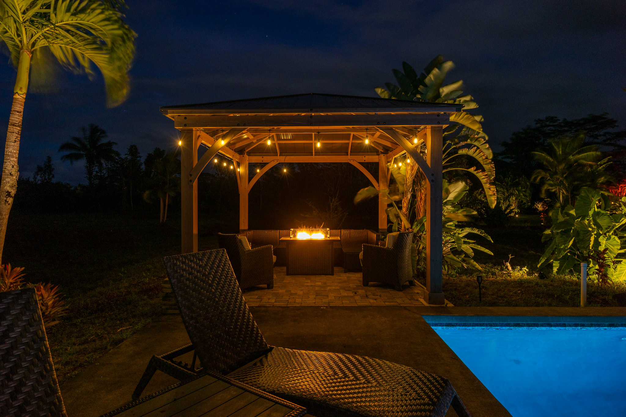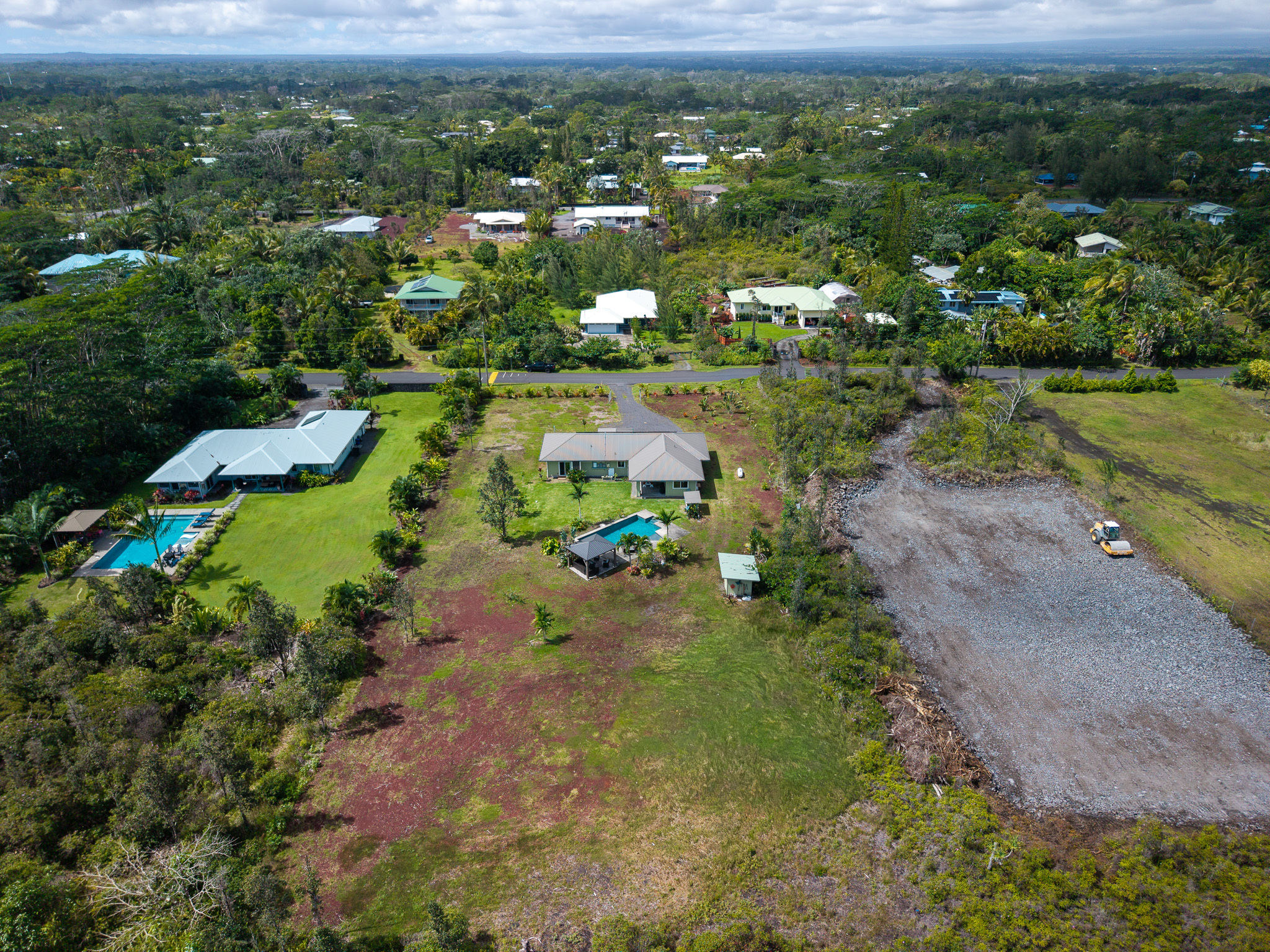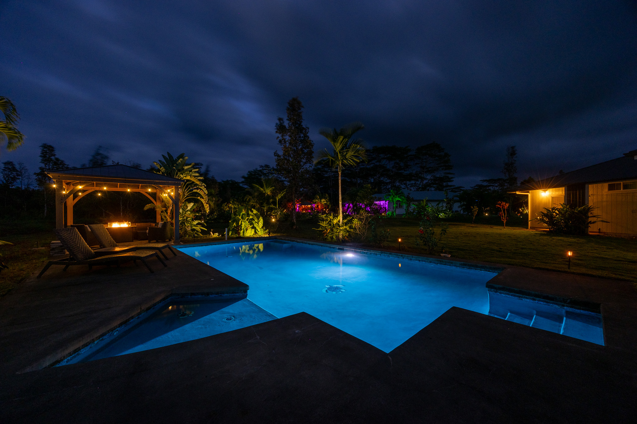 Welcome to this beautiful 4-bedroom, 3-bath home situated on a full acre in Hawaiian Paradise Park, offering the perfect blend of comfort, privacy, and island-style outdoor living. The property has been thoughtfully improved, with the lot recently cleared and leveled, fresh grass seed planted, and Areca palms and vibrant bromeliads added along the front for a welcoming tropical landscape. Enjoy your own private outdoor retreat featuring an in-ground pool, a gorgeous newly built gazebo, paver patio, and gas fire table–perfect for relaxing evenings or entertaining under the Hawaiian sky. An open lanai and outdoor shower add to the home’s effortless indoor-outdoor lifestyle. Inside, the home is bright and inviting with brand new blinds installed last year. On its own well and furnished, energy efficiency is also a standout feature with an owned photovoltaic solar system paired with a Tesla Powerwall battery, providing sustainability, energy savings, and valuable backup power. The home also features an attached additional living area offering flexibility for guests, extended family, workspace, or a variety of living arrangements. Set on a full acre in Lava Zone 3, this property offers the space, privacy, and relaxed lifestyle that make Big Island living so special. Located in Hawaiian Paradise Park, just a short drive to the dramatic ocean cliffs at the end of Paradise Drive, where you can experience breathtaking coastal views and the natural beauty of the island. Hawaiian Paradise Park Owners Association road maintenance fees apply. Ask your Realtor to see the 3D walkthrough video floorpan virtual tour.