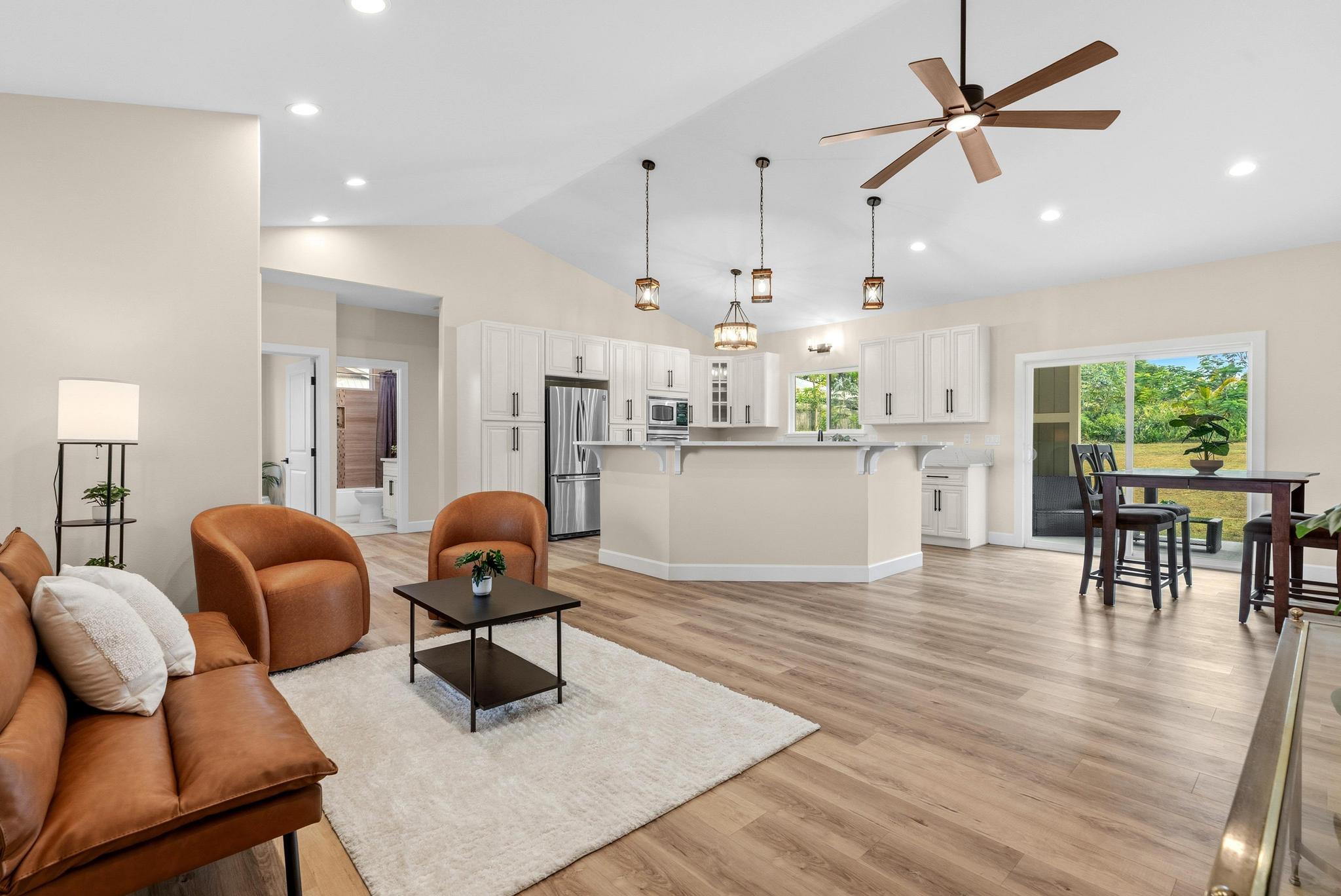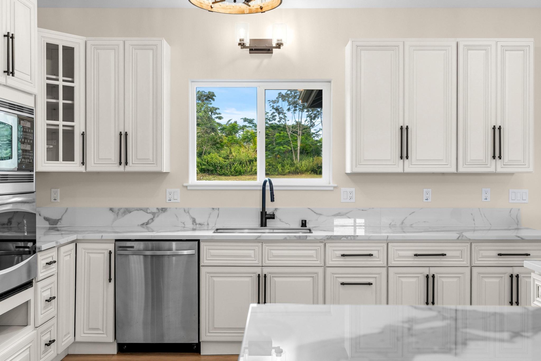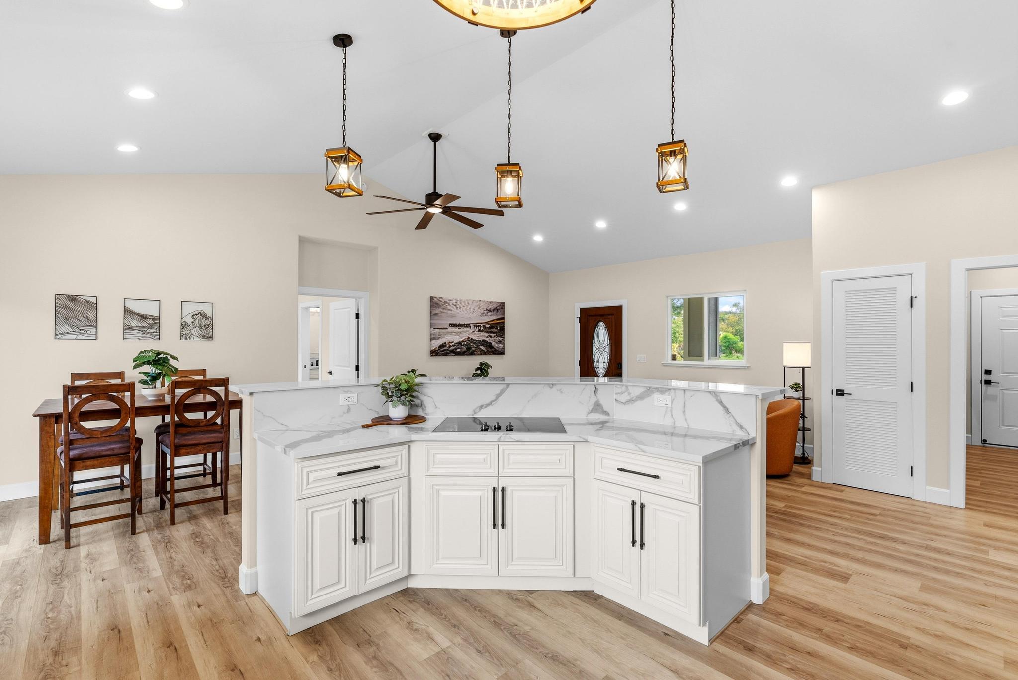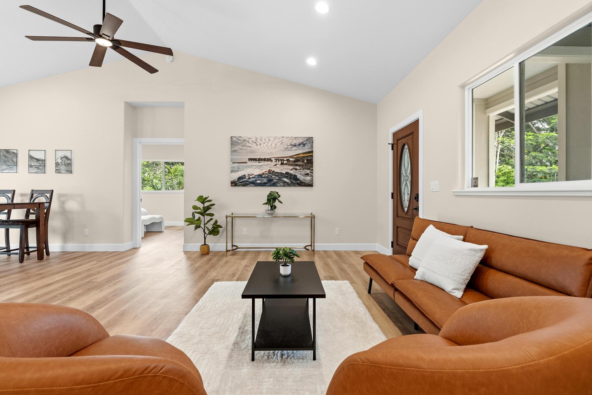 Quality and Comfort with Private Well Water and priced under $550K–this is Hawaiian Paradise Park value at its best. This move-in-ready home on paved 7th Ave delivers space, value, and sustainability rarely found at this price. Just over 2,000 sq ft under roof includes garage and lanai, a private water well, and fresh interior paint on walls, doors, and trim make this property truly turnkey. Vaulted ceilings fill the open layout with natural light. The large kitchen features modern appliances and generous counter space, all included with the sale. Step out to the back patio for seamless indoor-outdoor living. An enclosed garage, laundry room, and custom closet shelving throughout add everyday convenience. Wonderful grassy lot is ready to enjoy from day one. HIGHLIGHTS: - Under $550K with a Private Well Water – rare Big Island value - Newly painted interior walls, doors & trim! - Desirable Split Style floor plan - Just over 2,000 sq ft under roof with Garage and Lanai - Primary bathroom with Double Sinks and Walk-in Tile Shower - Paved Road - Concrete Driveway - In the Keaau School District - Well Water and UV Water Filtration - High Vaulted Ceilings - All appliances included: Dishwasher, Fridge, Oven, Cooktop, Microwave, Washer and Dryer - Two car Garage - Laundry Room with counters and cabinets - Custom closet shelving - Back patio lanai for outdoor living - Partial fenced dog run Located in the desirable Hawaiian Paradise Park community – enjoy the serenity of island living just minutes from Pahoa shops, Hilo, and Keaau. This is your opportunity to own a piece of paradise at an unbeatable price. Video: https://canva.link/gzfu0mmrf76f19g 15-1736 7th ave, Keaau HI 96749 ~ MLS 729569 Home is Staged (art & staging not included)