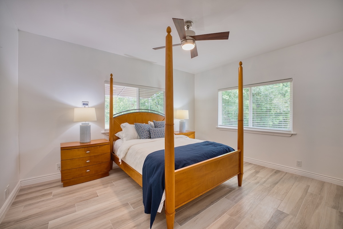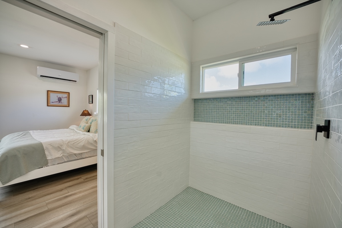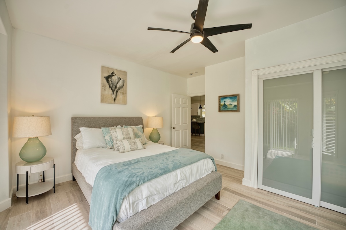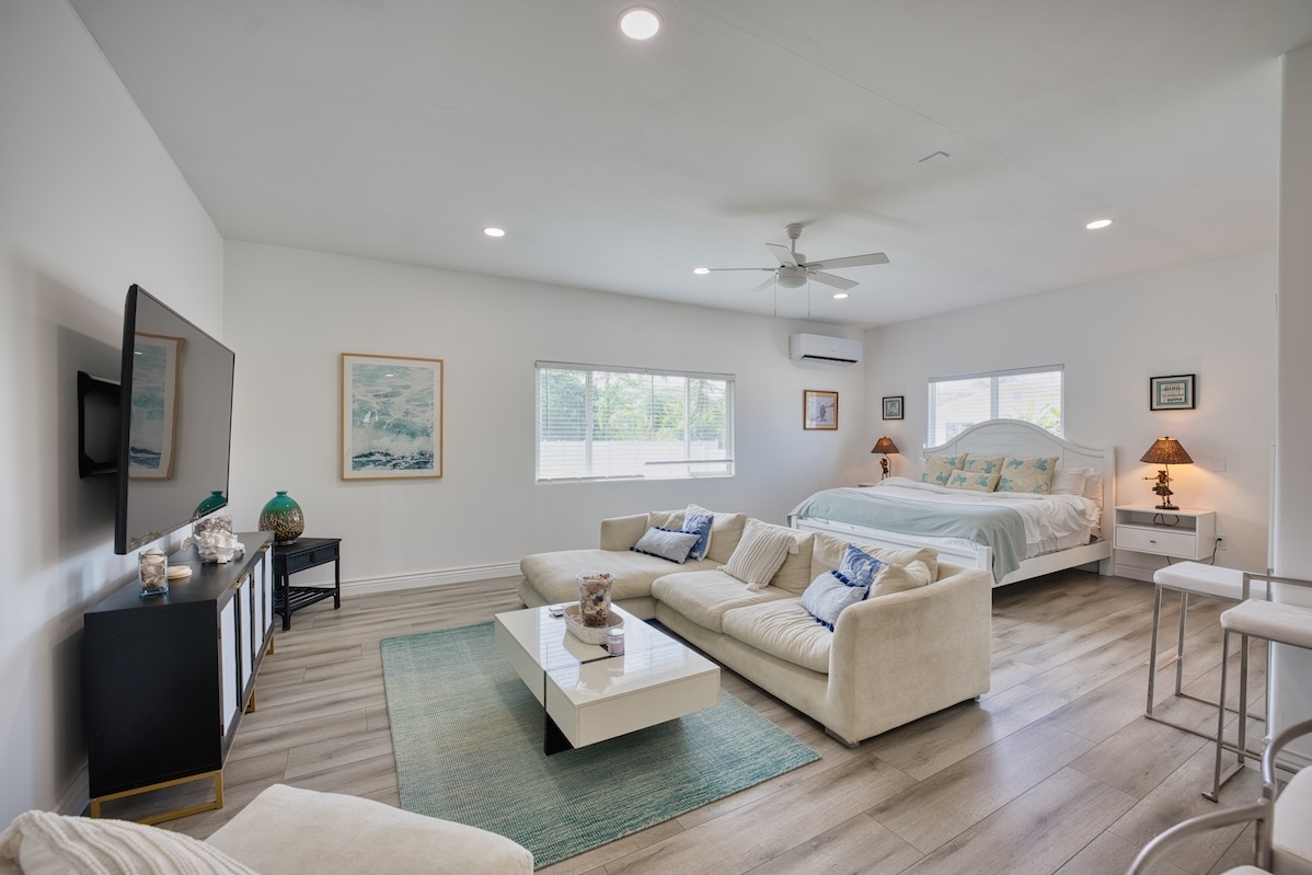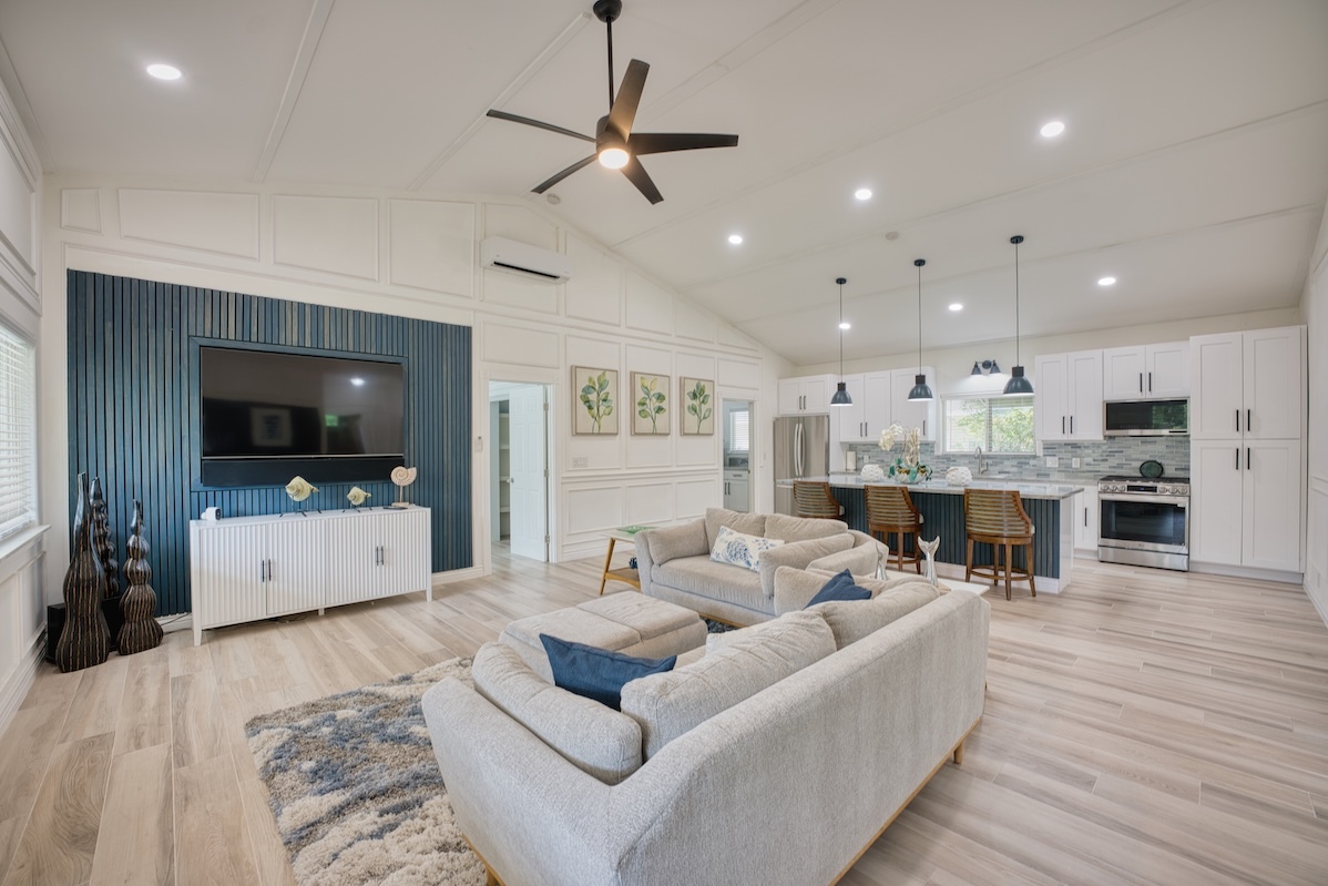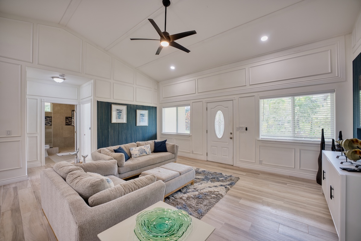 The light-filled open floor plan features vaulted ceilings and elegant plank porcelain tile. The 3-bedroom, 2-bath main home includes: