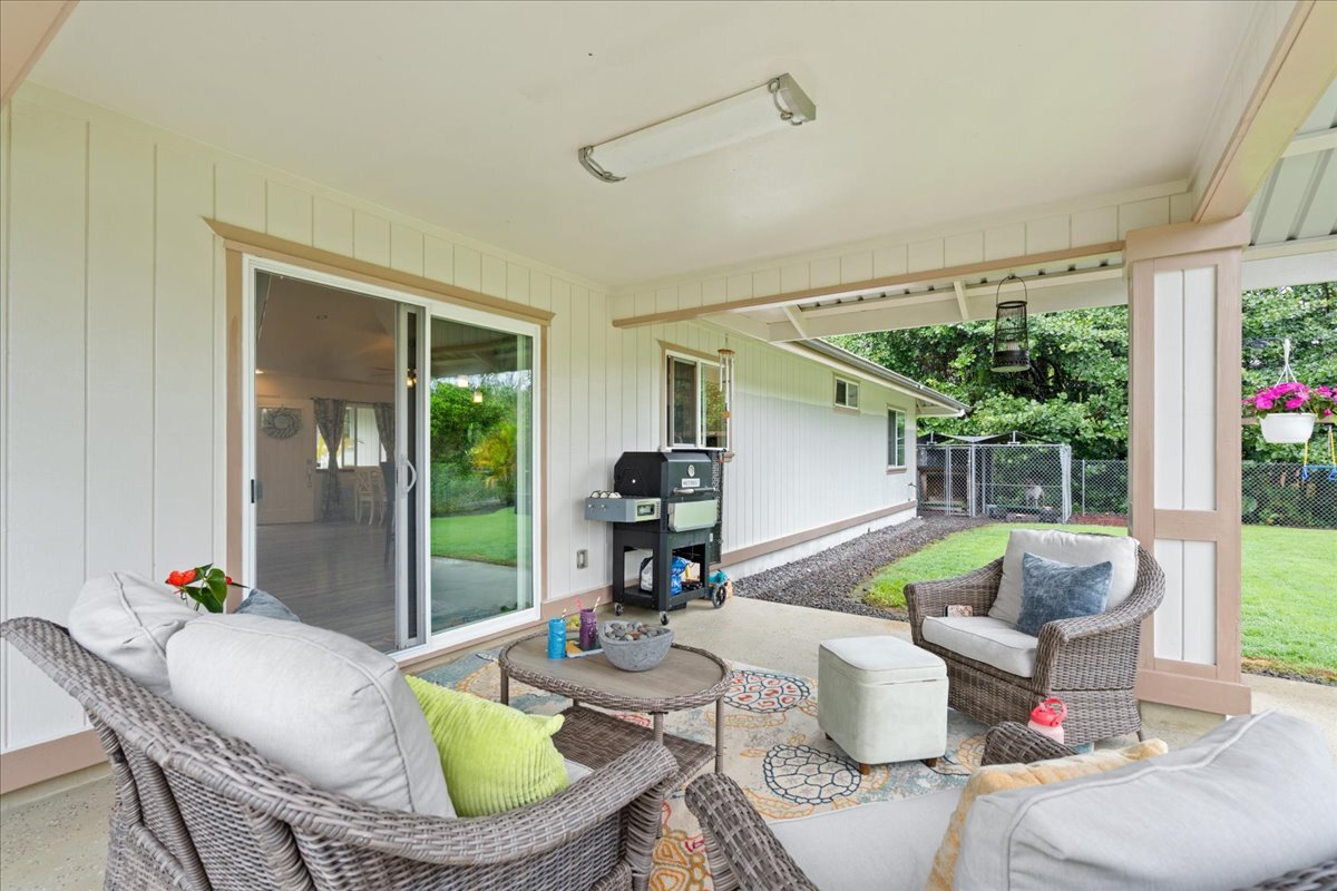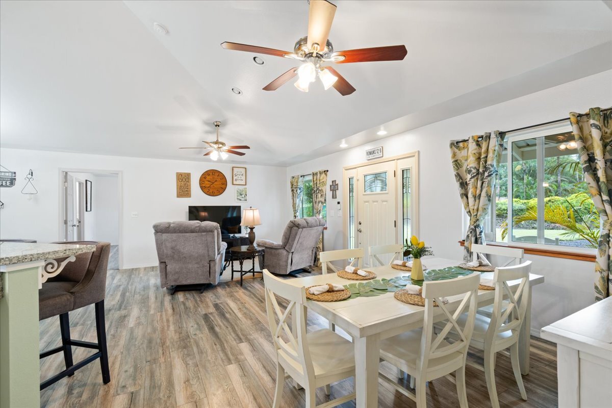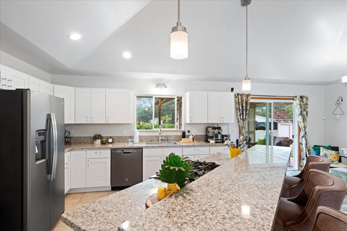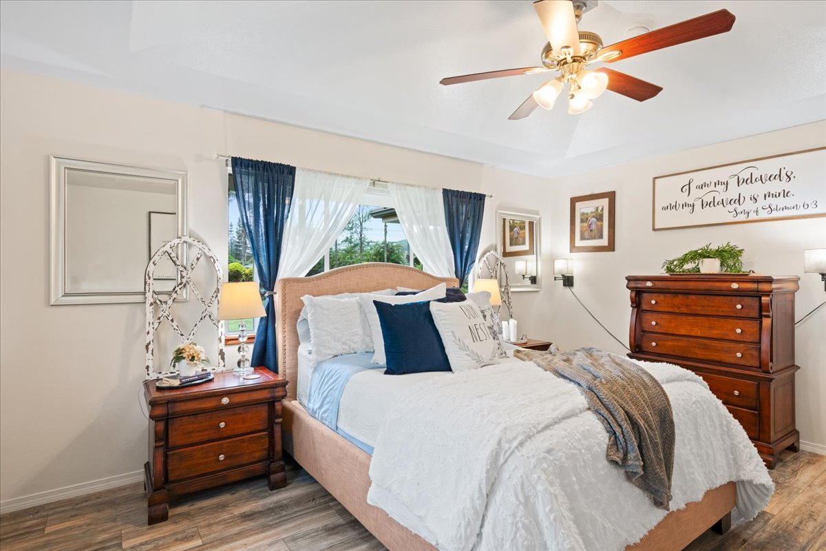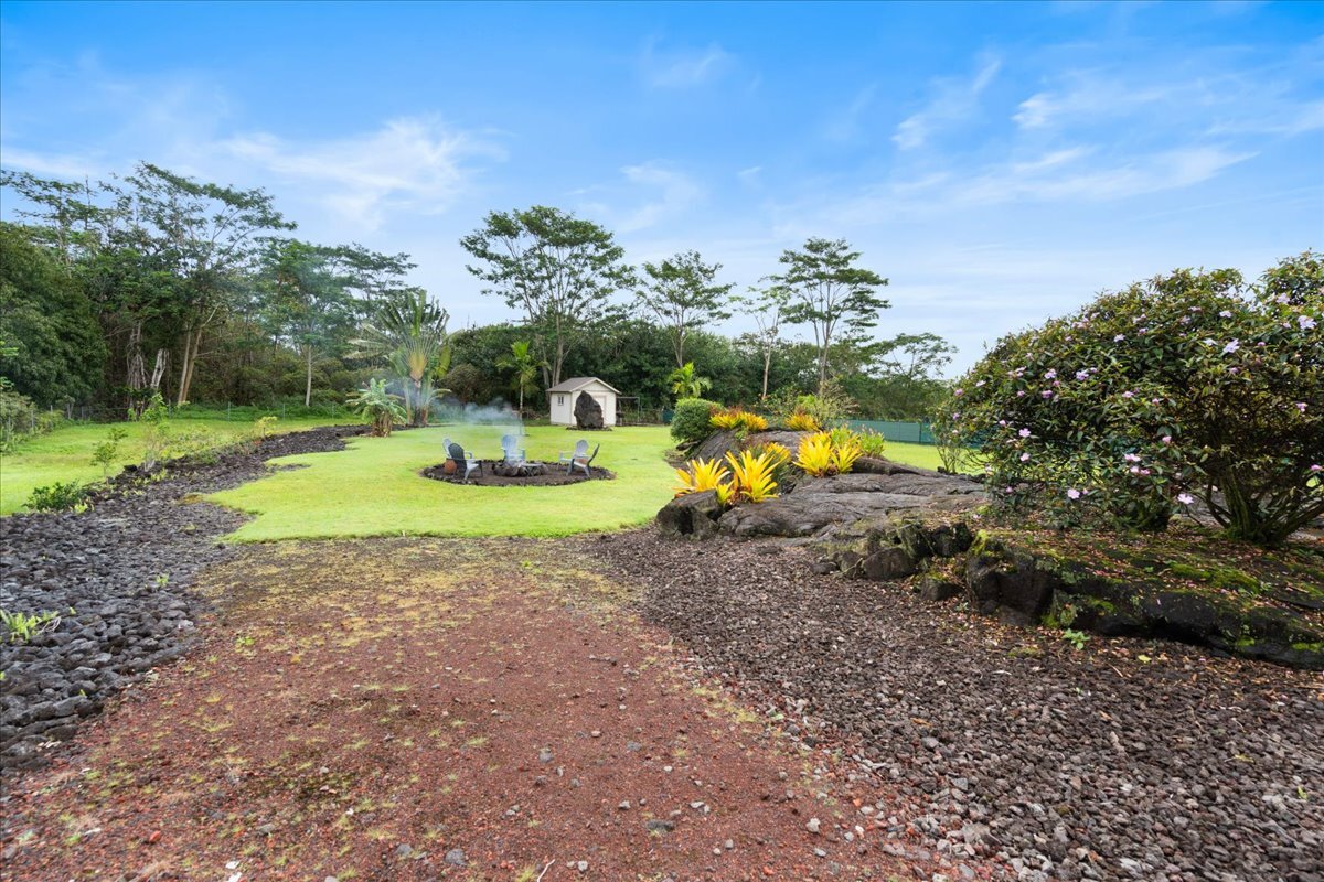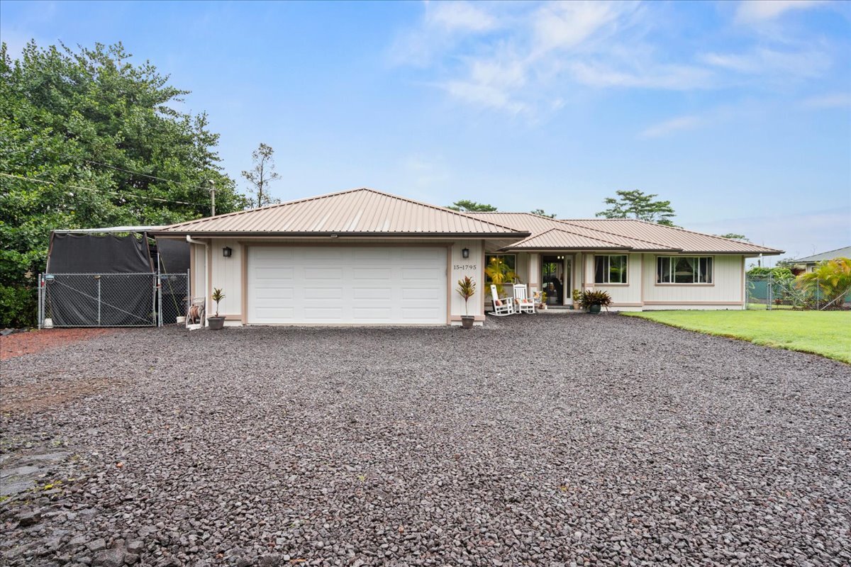 Beautiful, well-maintained custom turn-key home in the desirable Hawaiian Paradise Park on Hawai?i Island. This thoughtfully and well cared-for property sits on a fully landscaped and hand-cleared 1-acre lot, where the owners have invested significant time and resources into creating a private tropical setting. Kitchen & Living -Granite countertops -Window over kitchen sink for natural light -Built-in island with seating -Sliding glass door to back lanai (ideal for indoor-outdoor living) -Spacious walk-in pantry (~12 ft) with built-in shelving and decorative frosted door Primary Suite -Vaulted ceilings -Ceiling fan -Walk-in closet -En-suite bathroom with: Dual vanities Tiled walk-in shower Built-in seating bench Additional Interior Features -Pull-down attic ladder in hallway -Plywood-lined attic for excellent storage Landscaping & Grounds Beautiful natural lava rock formations and a wide variety of mature fruit trees and tropical plantings, including: Avocado, lime, orange, tangerine Dragon fruit, lilikoi, Jamaican passion fruit Apple banana, banana, pineapple June pear, mulberry, sugar cane Hibiscus, palms, bougainvillea, ficus Traveler’s palm, blue agave Exterior & Access -Fully gated property with automatic gate opener -Two driveways -Separate fenced and gated rear portion of the property -Grassy backyard and lanai area A must-see property that combines comfort, functionality, and lush island living.