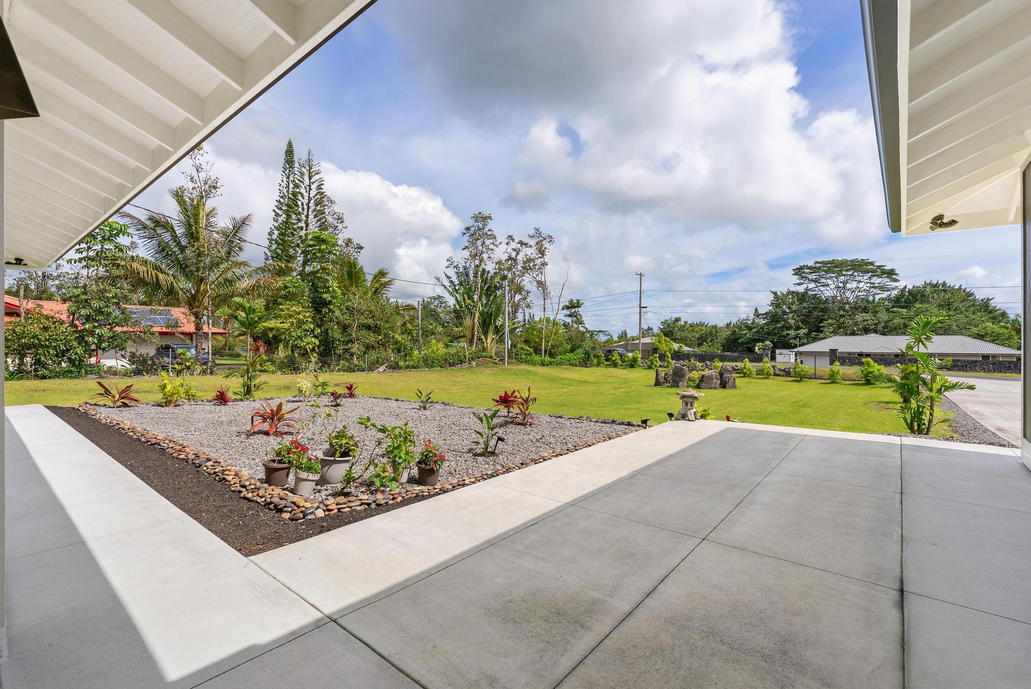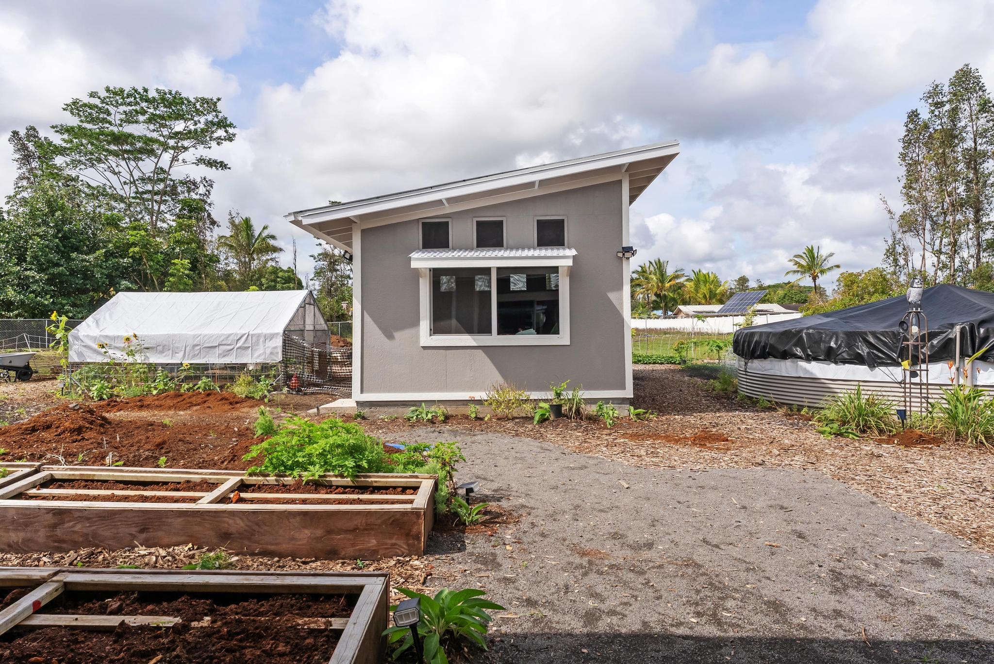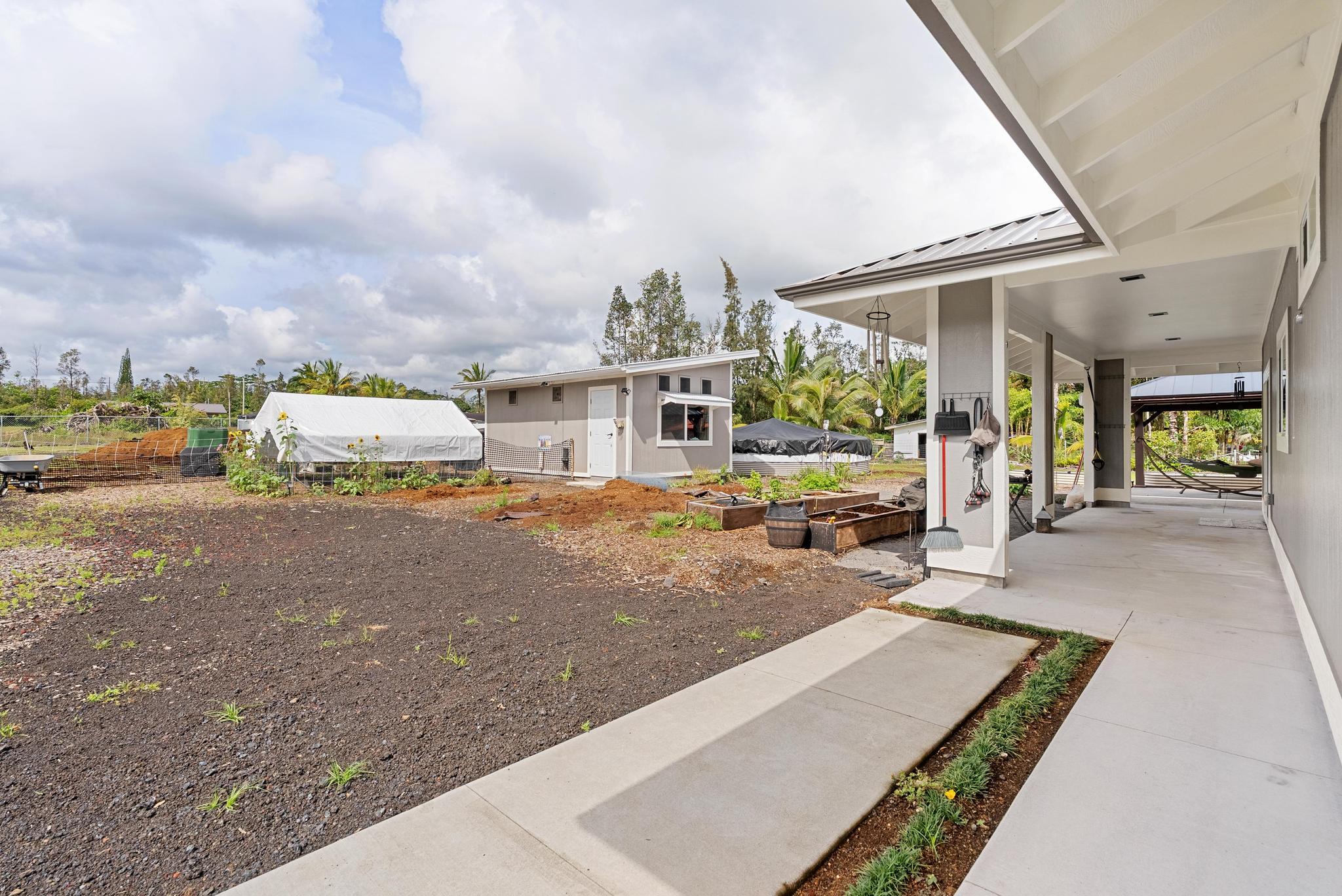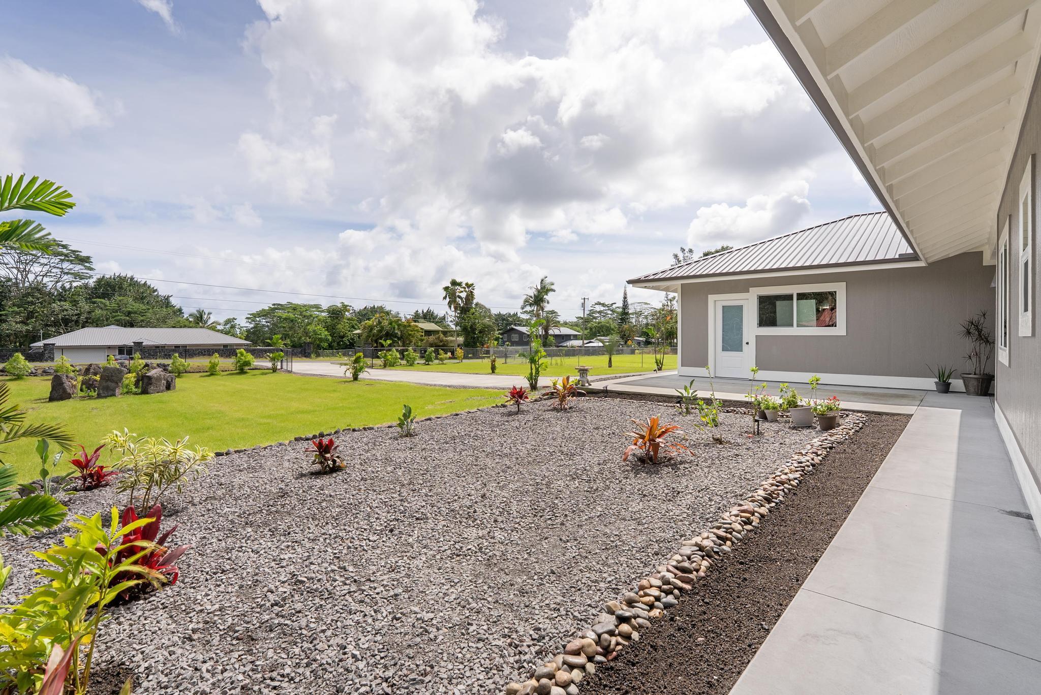 Location, location, location! 15-1818 31st Avenue, Keaau; one of East Hawai‘i’s most desirable tropical neighborhoods near the top of Hawaiian Paradise Park. This newer single-level, move-in ready home where thoughtful design meets everyday functionality, flexibility, and style. Set on a beautifully leveled, fully fenced one-acre lot with a gated entrance and wide paved driveway, this bright and spacious 4-bedroom, 3-bathroom home offers an ideal layout for easy access and comfortable living. Inside, you’ll find two ductless climate control systems, a grand entrance walkway with French doors, and a well-designed floor plan with comfortable separation of space. The open concept kitchen, dining, and living areas are filled with extras, including vaulted ceilings, a large island, walk-in pantry, abundant storage, and an advanced RO ECO drinking water system. Durable LVP flooring throughout creates a clean, modern, low-maintenance feel. The primary suite is a standout, featuring a spacious bedroom with large sliding glass doors leading to the gazebo and lanai areas. The suite also includes a walk-in closet and beautiful white marble en suite bathroom with a walk-in shower. Adjacent to the entrance and primary suite is the second bedroom, ideal as an office, nursery, or study. On the opposite side of the home are two additional bedrooms and two bathrooms, offering privacy and comfort. The upgraded utility and laundry room leads to the oversized 2-car garage with an epoxy-sealed floor, two side entrances, solar water heater, and whole-home water filtration system. Outside, the thoughtfully landscaped yard offers both beauty and utility. A recently custom-built 20x12 auxiliary structure with solar-powered ventilation and lighting creates possibilities for a studio, hobby room, office, or future ohana. The 16x10 gazebo creates the perfect shaded outdoor lounge area. With newer construction, flexible spaces, and clean finish, this is the one!