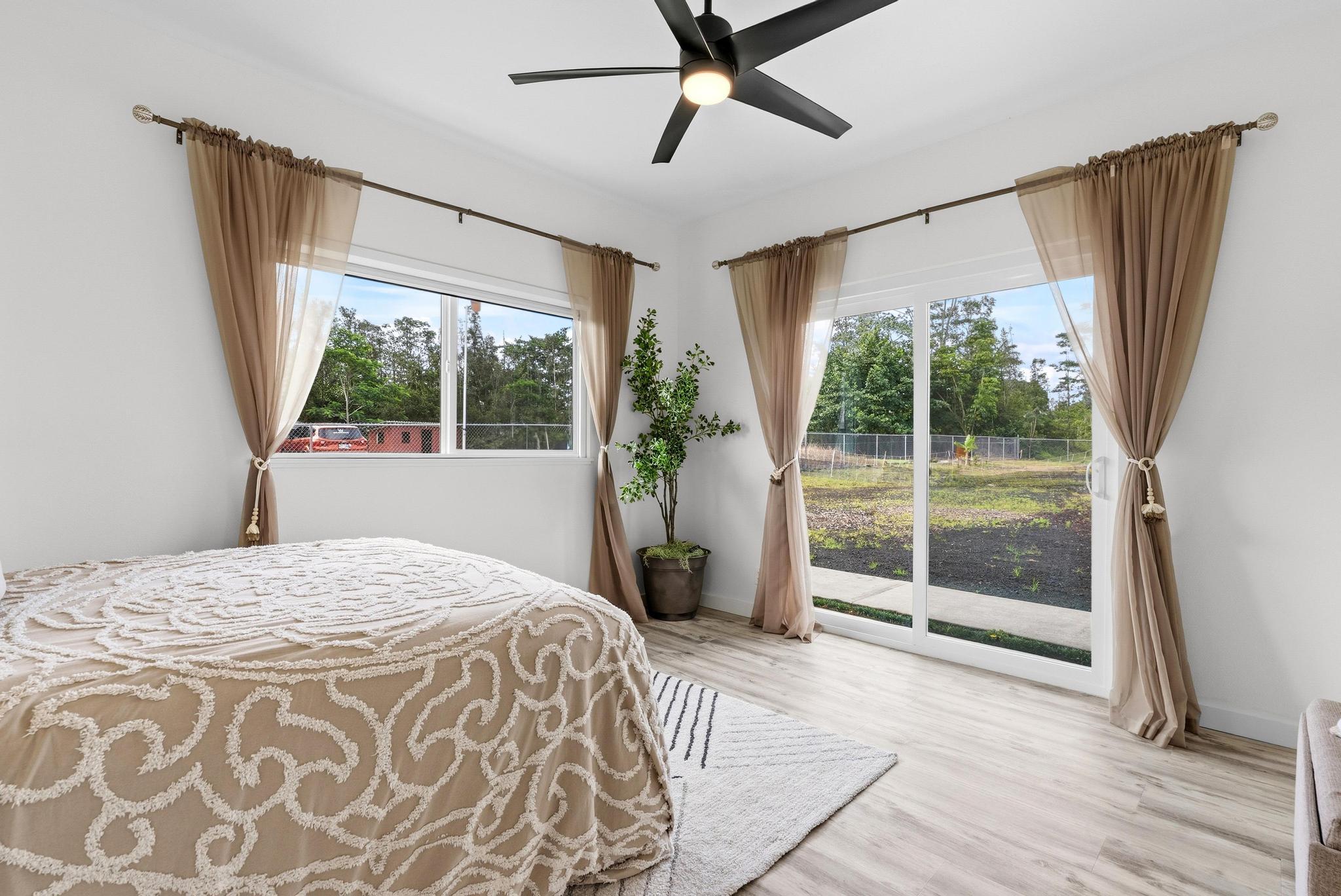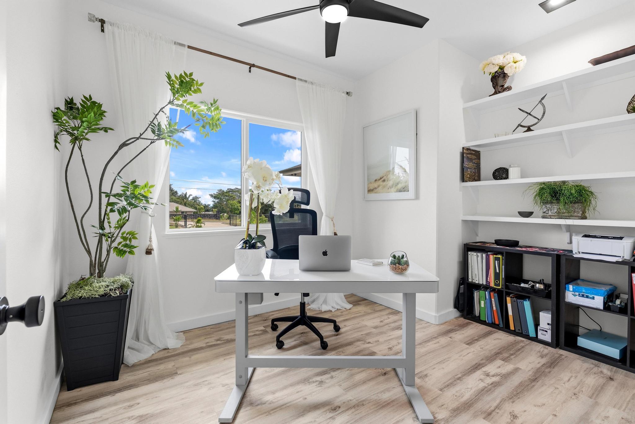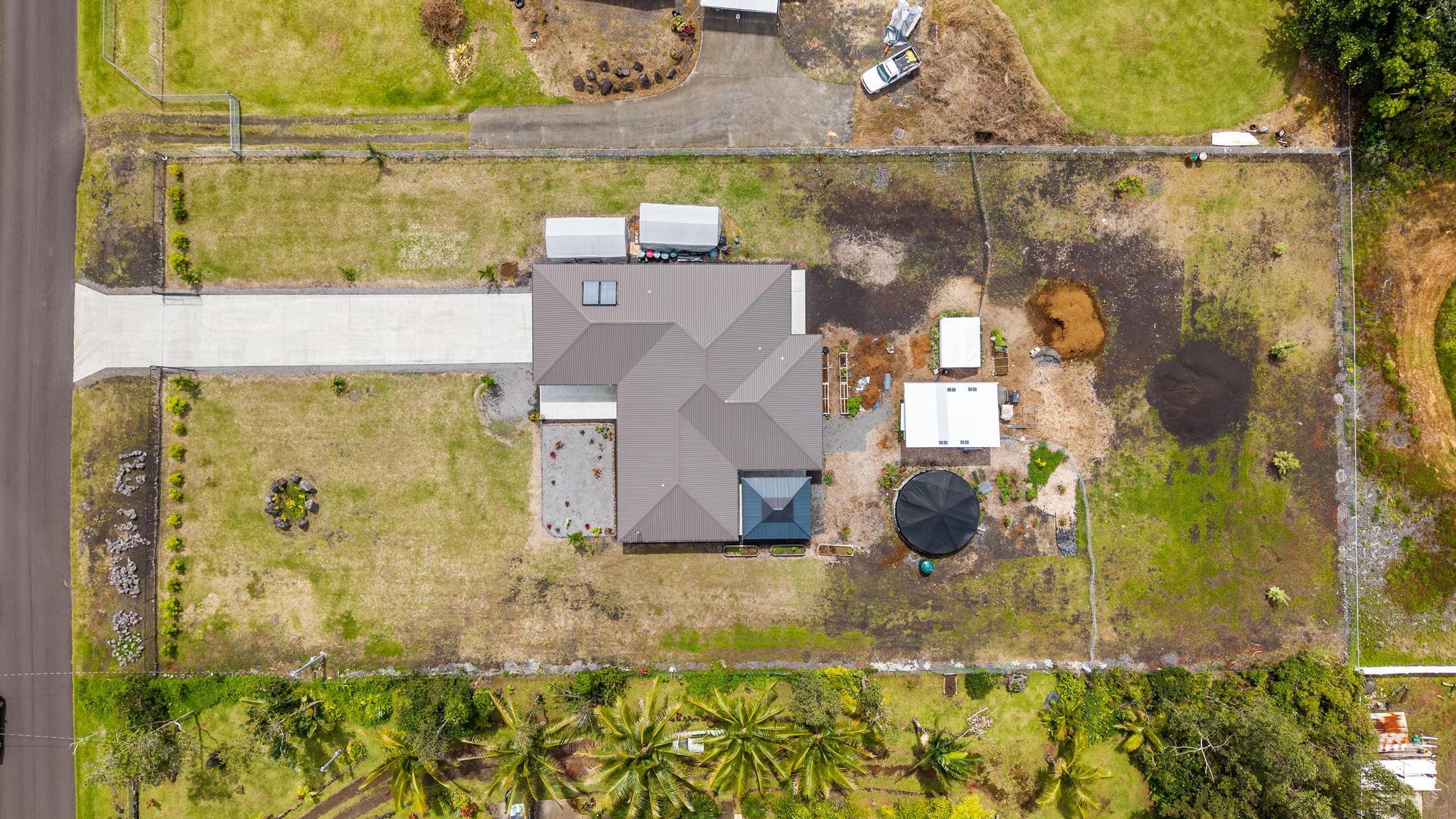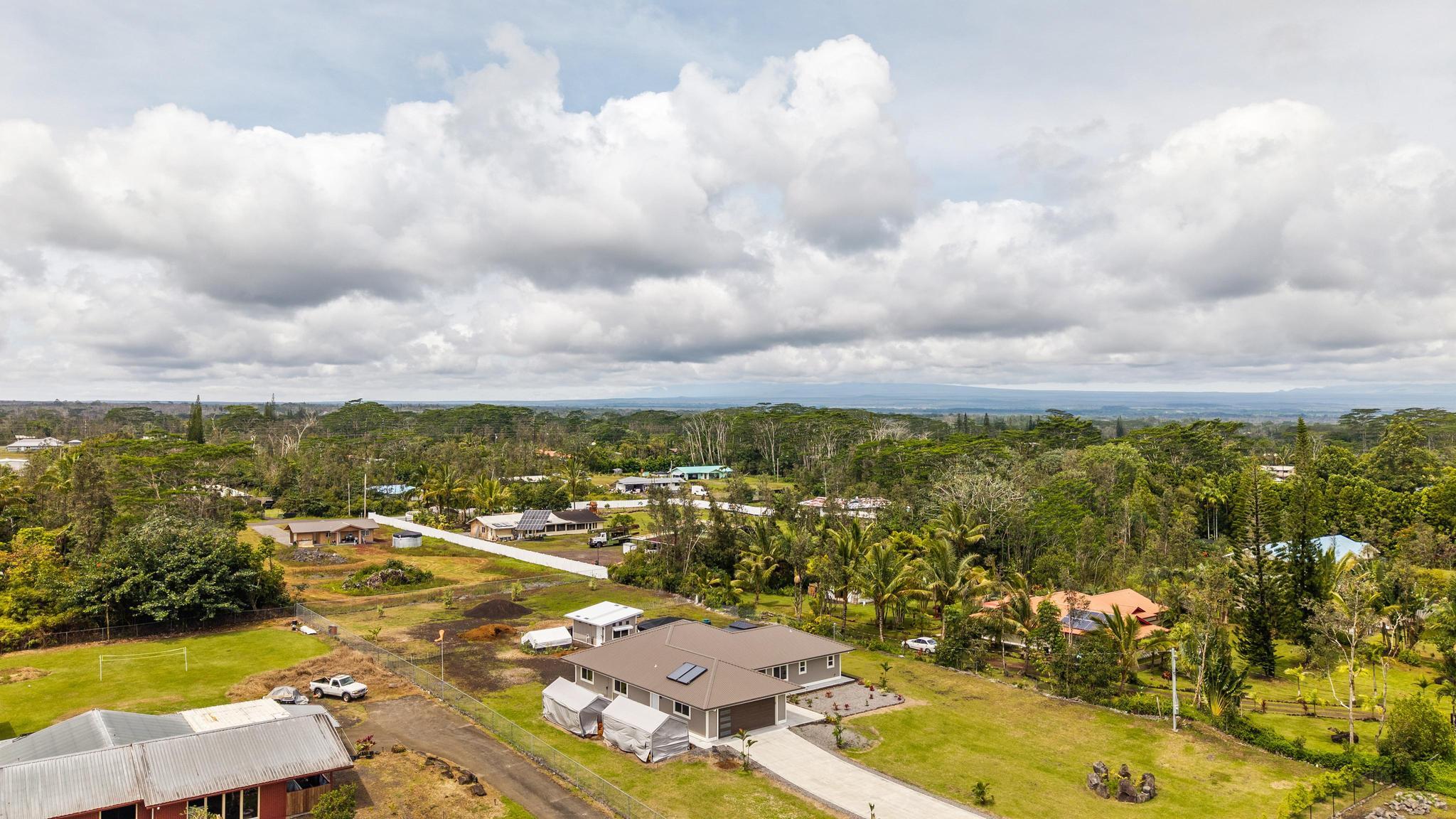 Location, location, location! 15-1818 31st Avenue, Keaau; one of East Hawai‘i’s most desirable tropical neighborhoods near the top of Hawaiian Paradise Park. This newer single-level, move-in ready home where thoughtful design meets everyday functionality, flexibility, and style. Set on a beautifully leveled, fully fenced one-acre lot with a gated entrance and wide paved driveway, this bright and spacious 4-bedroom, 3-bathroom home offers an ideal layout for easy access and comfortable living. Inside, you’ll find two ductless climate control systems, a grand entrance walkway with French doors, and a well-designed floor plan with comfortable separation of space. The open concept kitchen, dining, and living areas are filled with extras, including vaulted ceilings, a large island, walk-in pantry, abundant storage, and an advanced RO ECO drinking water system. Durable LVP flooring throughout creates a clean, modern, low-maintenance feel. The primary suite is a standout, featuring a spacious bedroom with large sliding glass doors leading to the gazebo and lanai areas. The suite also includes a walk-in closet and beautiful white marble en suite bathroom with a walk-in shower. Adjacent to the entrance and primary suite is the second bedroom, ideal as an office, nursery, or study. On the opposite side of the home are two additional bedrooms and two bathrooms, offering privacy and comfort. The upgraded utility and laundry room leads to the oversized 2-car garage with an epoxy-sealed floor, two side entrances, solar water heater, and whole-home water filtration system. Outside, the thoughtfully landscaped yard offers both beauty and utility. A recently custom-built 20x12 auxiliary structure with solar-powered ventilation and lighting creates possibilities for a studio, hobby room, office, or future ohana. The 16x10 gazebo creates the perfect shaded outdoor lounge area. With newer construction, flexible spaces, and clean finish, this is the one!