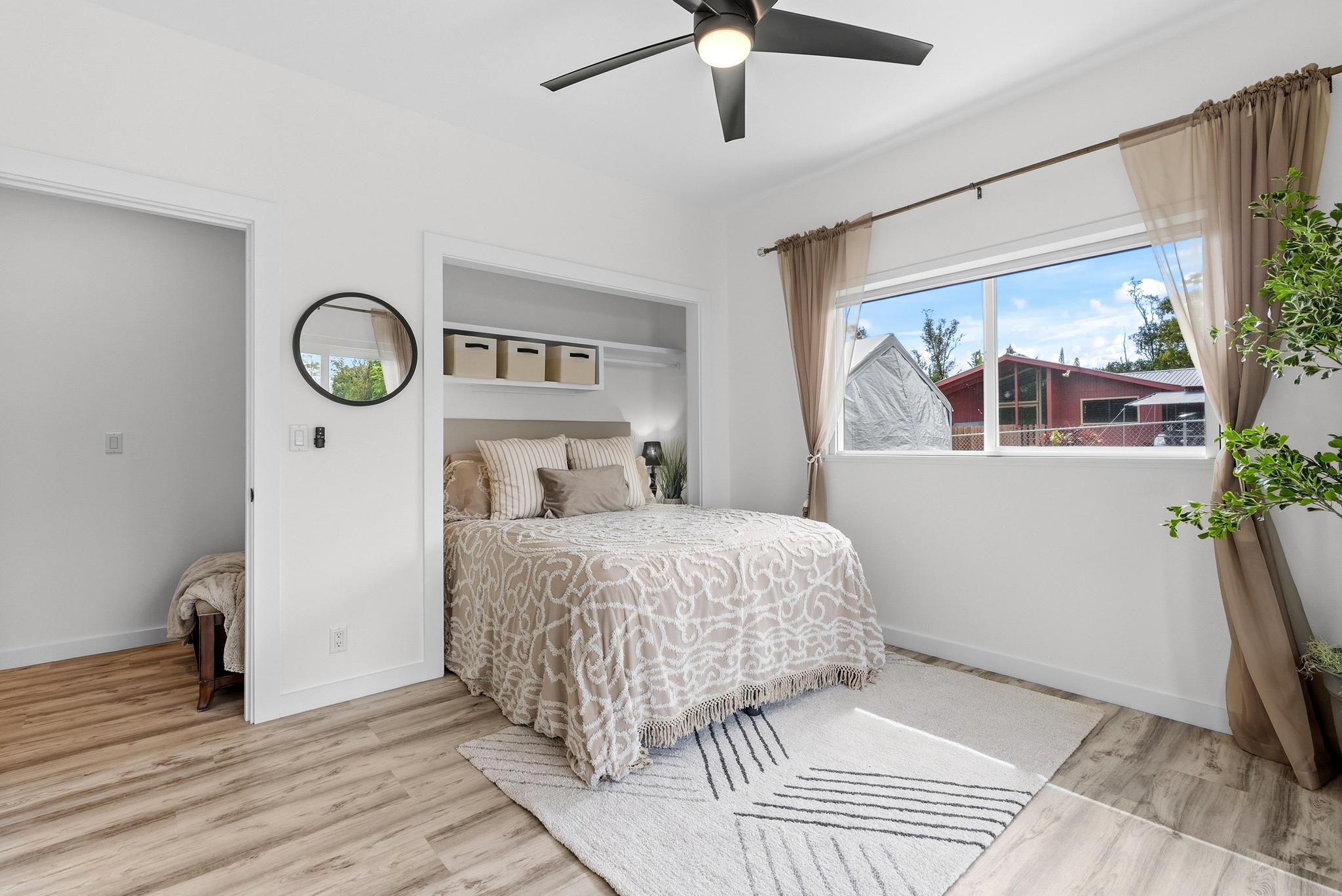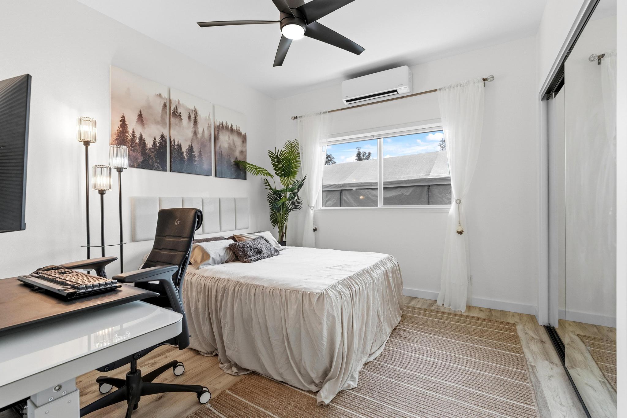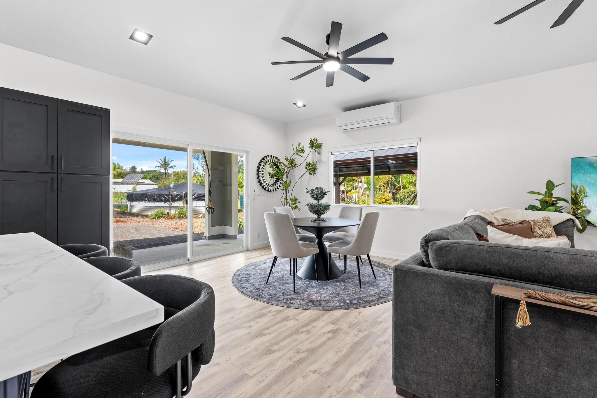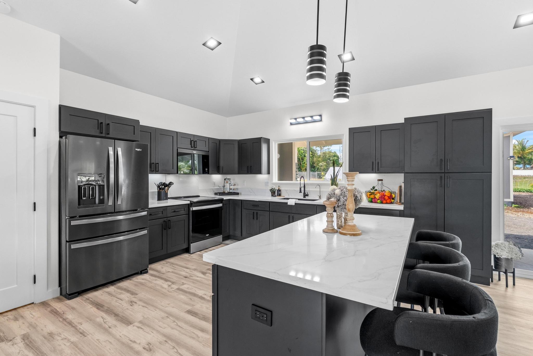 Location, location, location! 15-1818 31st Avenue, Keaau; one of East Hawai‘i’s most desirable tropical neighborhoods near the top of Hawaiian Paradise Park. This newer single-level, move-in ready home where thoughtful design meets everyday functionality, flexibility, and style. Set on a beautifully leveled, fully fenced one-acre lot with a gated entrance and wide paved driveway, this bright and spacious 4-bedroom, 3-bathroom home offers an ideal layout for easy access and comfortable living. Inside, you’ll find two ductless climate control systems, a grand entrance walkway with French doors, and a well-designed floor plan with comfortable separation of space. The open concept kitchen, dining, and living areas are filled with extras, including vaulted ceilings, a large island, walk-in pantry, abundant storage, and an advanced RO ECO drinking water system. Durable LVP flooring throughout creates a clean, modern, low-maintenance feel. The primary suite is a standout, featuring a spacious bedroom with large sliding glass doors leading to the gazebo and lanai areas. The suite also includes a walk-in closet and beautiful white marble en suite bathroom with a walk-in shower. Adjacent to the entrance and primary suite is the second bedroom, ideal as an office, nursery, or study. On the opposite side of the home are two additional bedrooms and two bathrooms, offering privacy and comfort. The upgraded utility and laundry room leads to the oversized 2-car garage with an epoxy-sealed floor, two side entrances, solar water heater, and whole-home water filtration system. Outside, the thoughtfully landscaped yard offers both beauty and utility. A recently custom-built 20x12 auxiliary structure with solar-powered ventilation and lighting creates possibilities for a studio, hobby room, office, or future ohana. The 16x10 gazebo creates the perfect shaded outdoor lounge area. With newer construction, flexible spaces, and clean finish, this is the one!
