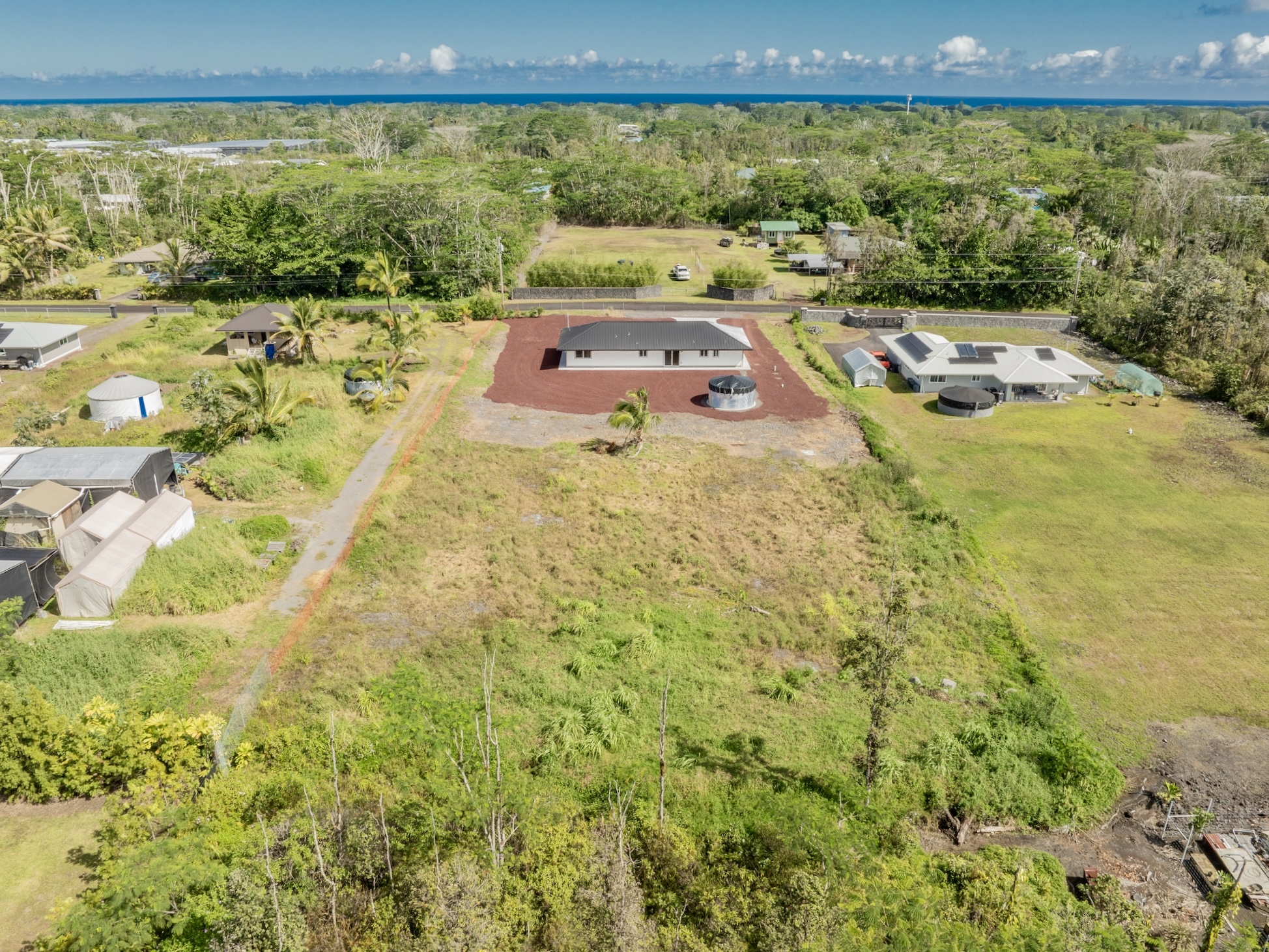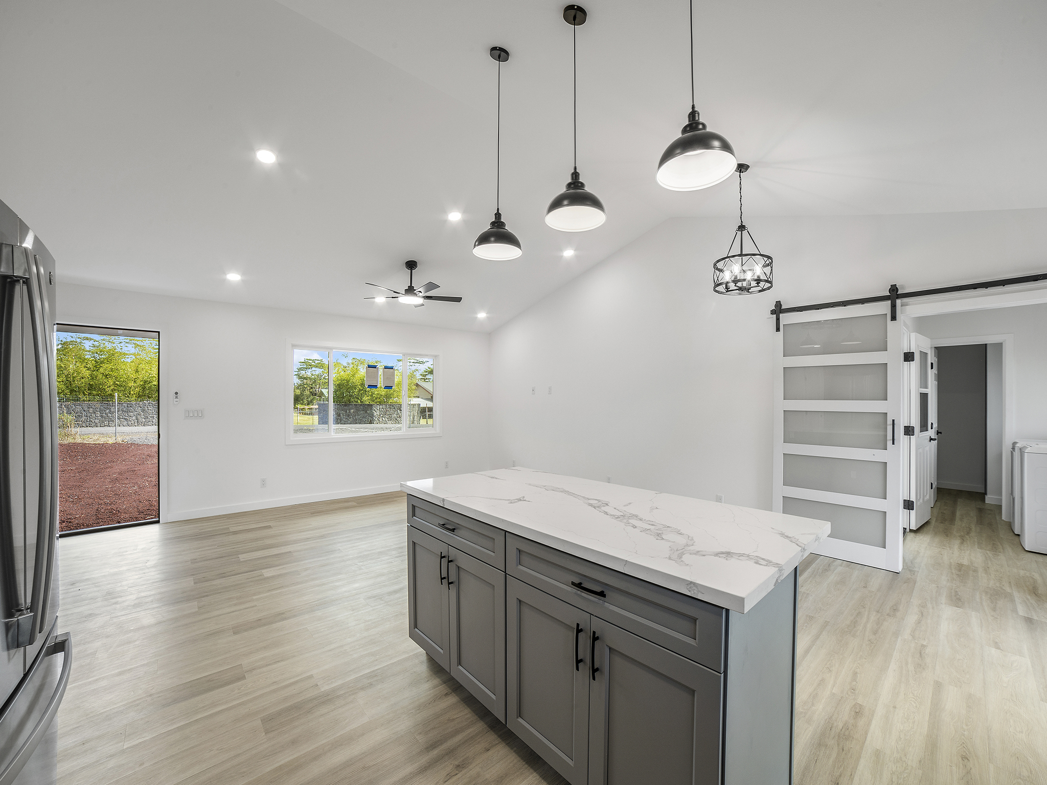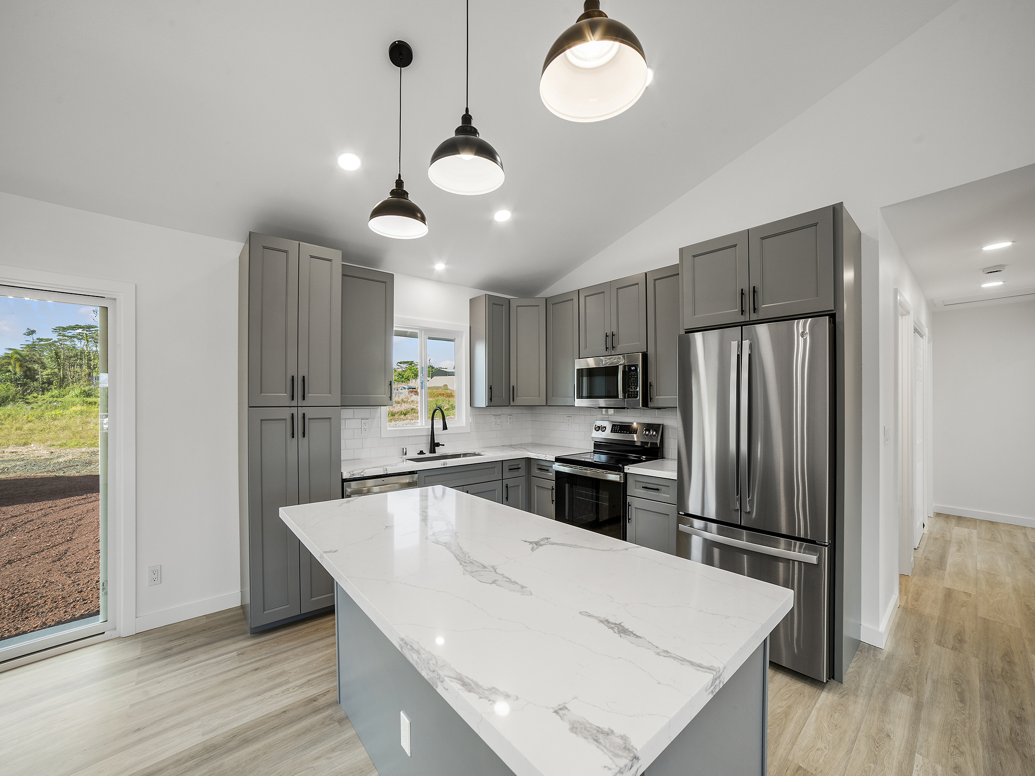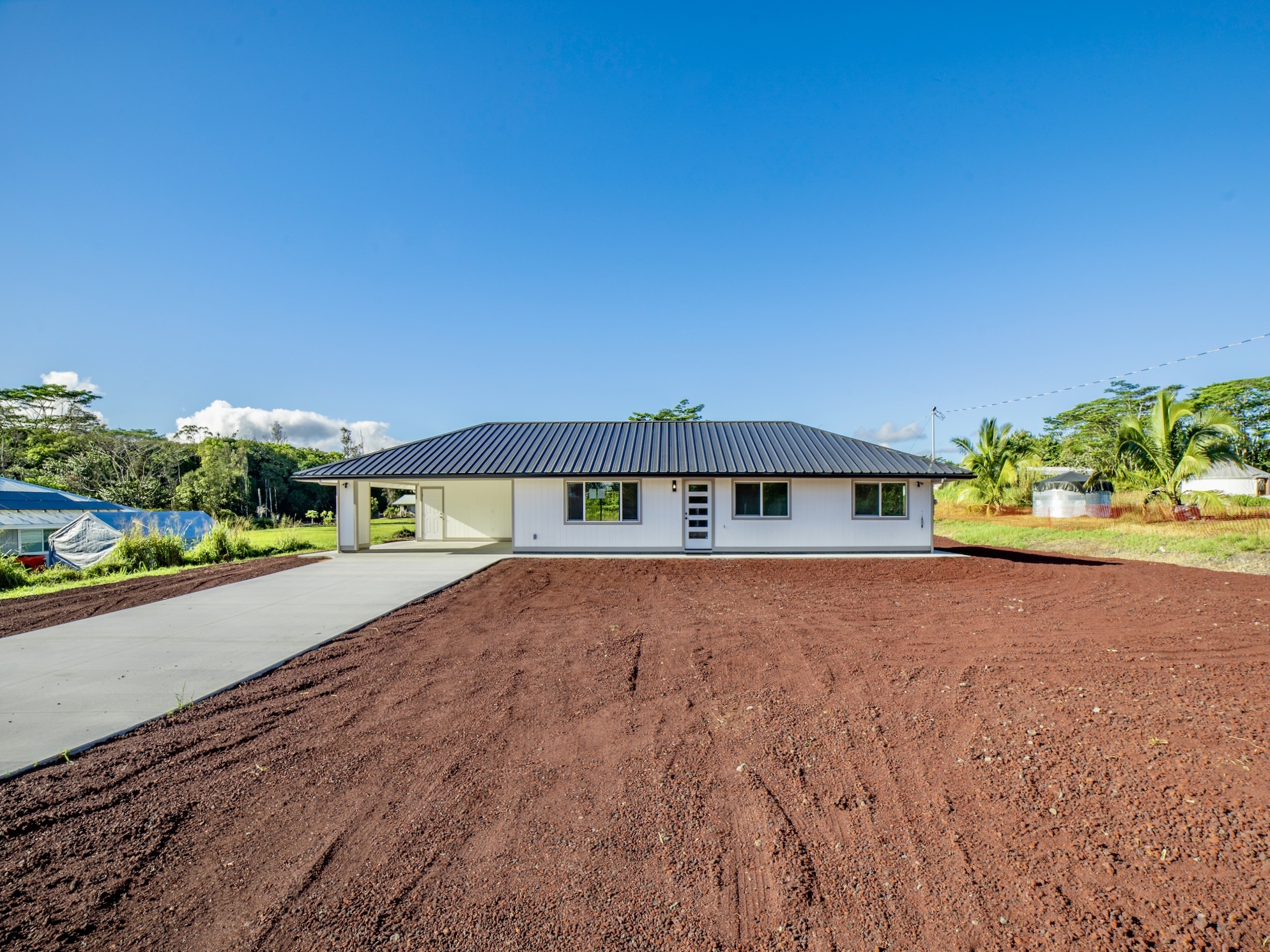 Modern New Construction on One Acre in Hawaiian Paradise Park Welcome to this well-designed new construction home located in the desirable Hawaiian Paradise Park subdivision. Situated on a full one-acre lot, this 3-bedroom, 3-bath residence offers modern style, functionality, and move-in-ready convenience. The interior features wood-look luxury vinyl plank flooring, a bright neutral color palette, and vaulted ceilings that create an open, airy feel. The open-concept living space flows seamlessly into the kitchen, which includes a large center island, stainless steel appliances, modern pendant lighting, and ample cabinetry–ideal for everyday living and entertaining. A standout feature is the dedicated laundry room, accessed through a stylish sliding barn door, complete with a washer, dryer, utility sink, and additional cabinetry for storage. Extra hallway storage adds to the home’s practical and efficient layout. The bedrooms are well-proportioned, and all bathrooms feature contemporary finishes, walk-in tiled showers, and clean modern fixtures. Ceiling fans and recessed lighting enhance comfort throughout the home. Exterior highlights include a wide concrete driveway, a 470-square-foot two-car garage, and a durable metal roof, designed for low-maintenance island living. A solar water heater adds energy efficiency and long-term savings. With plenty of room to landscape, garden, or expand, the one-acre property offers privacy and flexibility rarely found with new construction in this area. Thoughtfully built and move-in ready, this home presents an excellent opportunity to own a modern residence in Hawaiian Paradise Park. see video tour: https://www.youtube.com/watch?v=Asw85kHPaHs