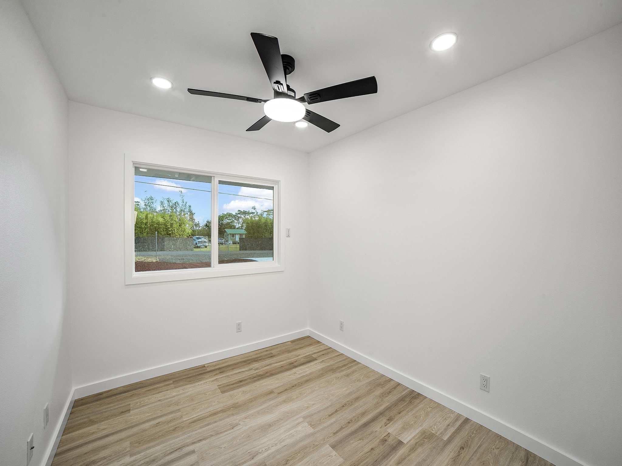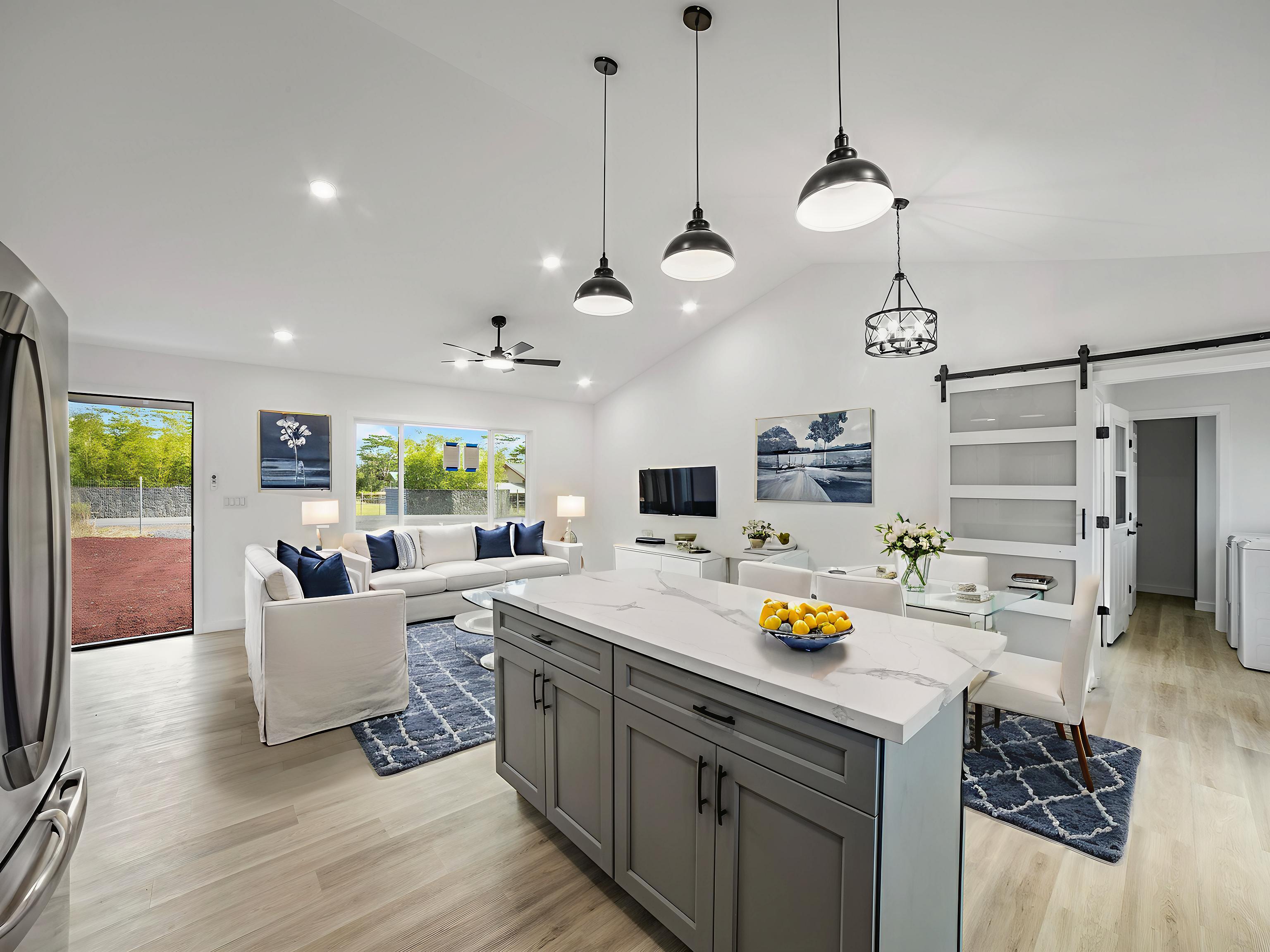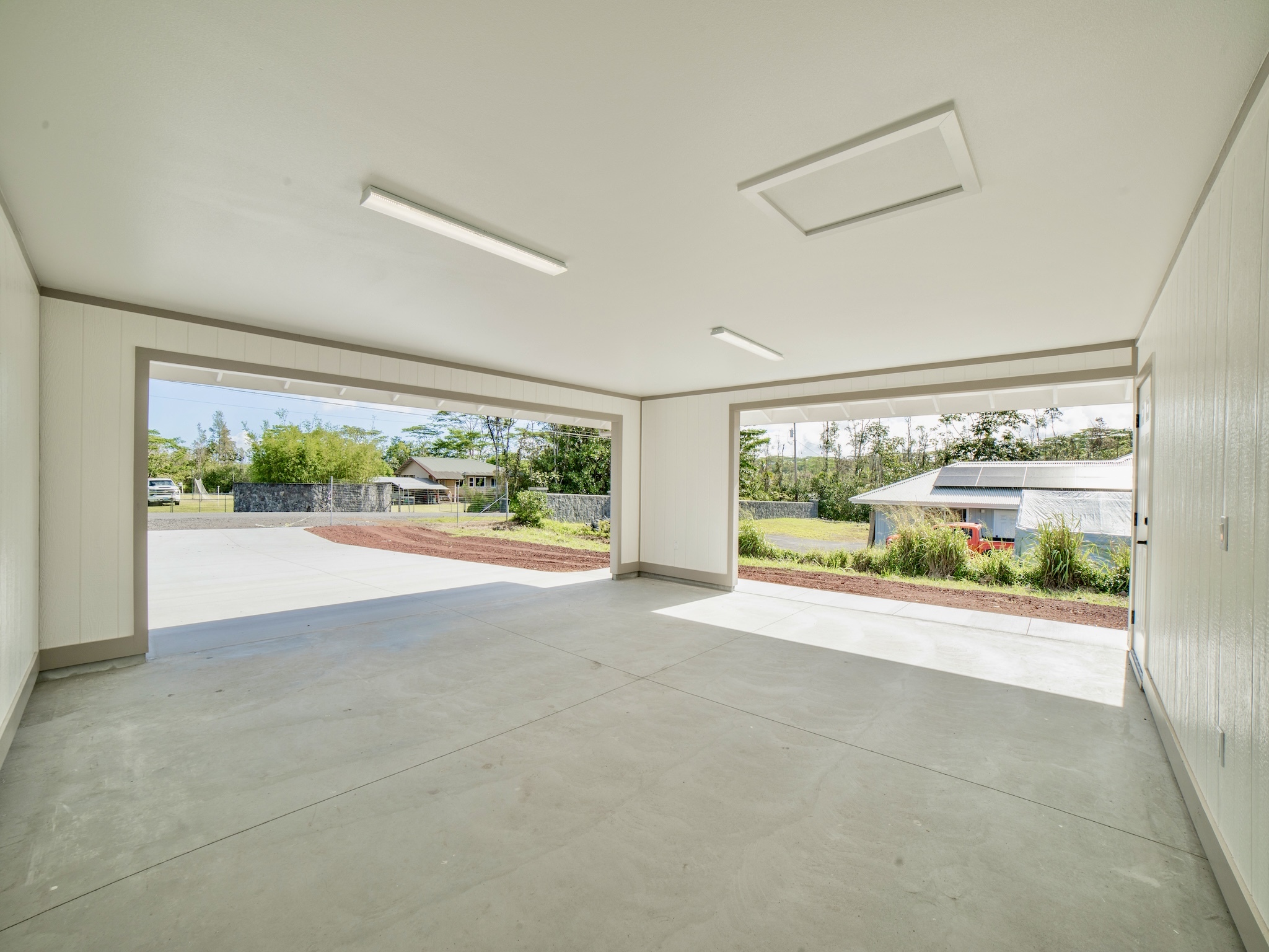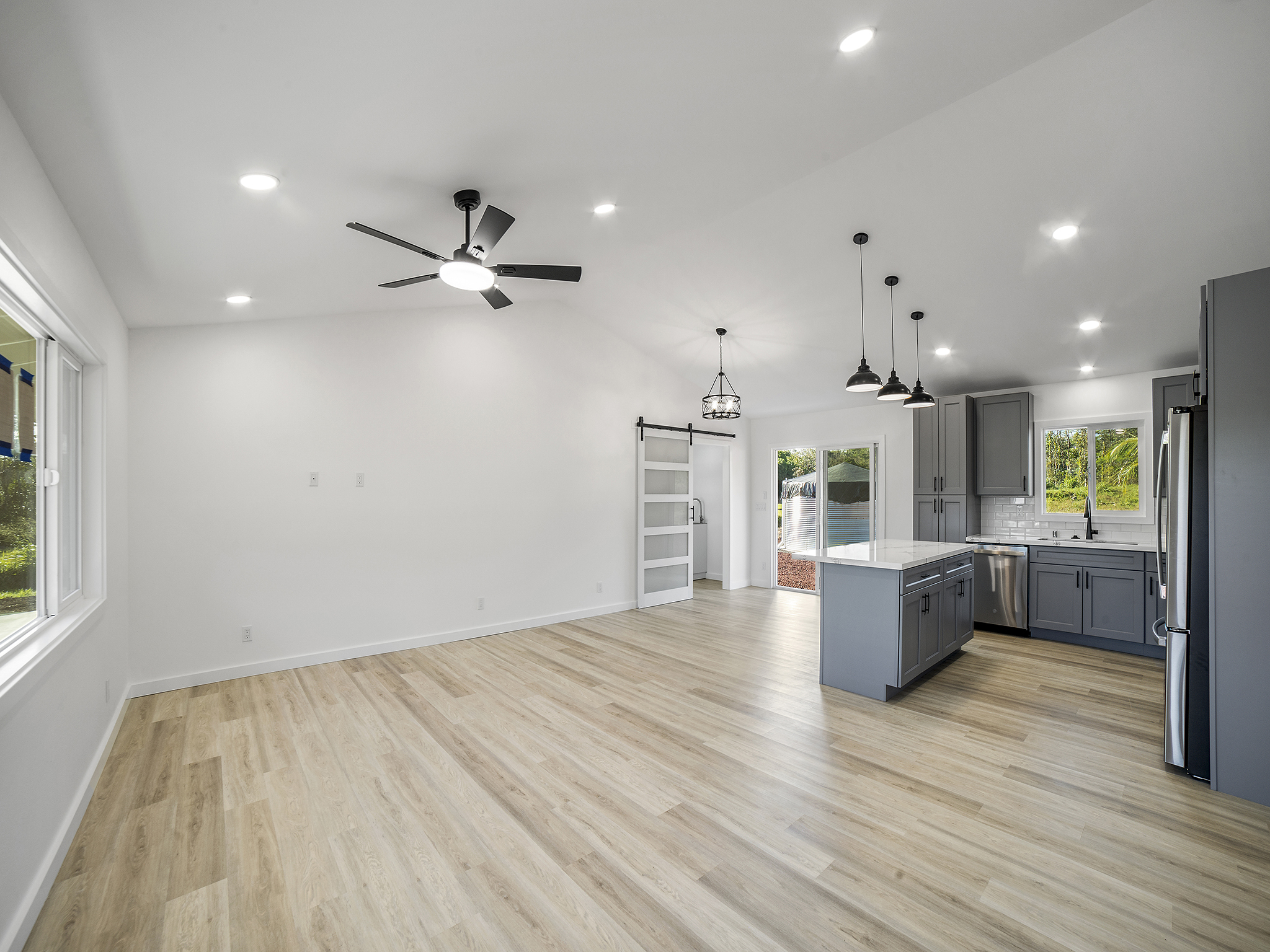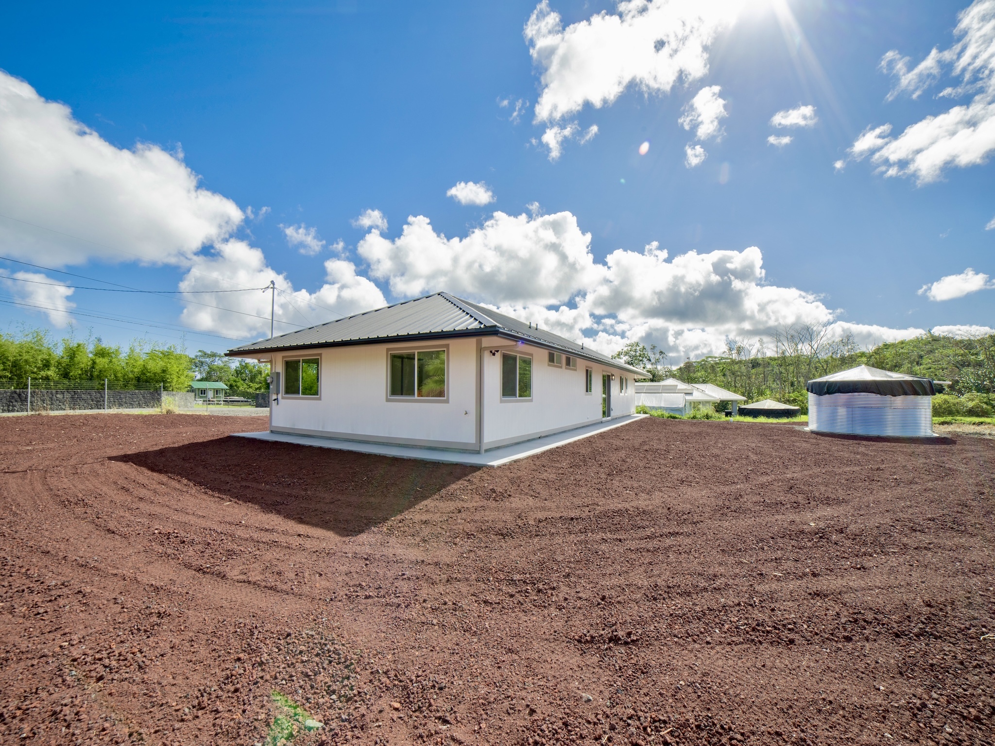 Modern New Construction on One Acre in Hawaiian Paradise Park Welcome to this well-designed new construction home located in the desirable Hawaiian Paradise Park subdivision. Situated on a full one-acre lot, this 3-bedroom, 3-bath residence offers modern style, functionality, and move-in-ready convenience. The interior features wood-look luxury vinyl plank flooring, a bright neutral color palette, and vaulted ceilings that create an open, airy feel. The open-concept living space flows seamlessly into the kitchen, which includes a large center island, stainless steel appliances, modern pendant lighting, and ample cabinetry–ideal for everyday living and entertaining. A standout feature is the dedicated laundry room, accessed through a stylish sliding barn door, complete with a washer, dryer, utility sink, and additional cabinetry for storage. Extra hallway storage adds to the home’s practical and efficient layout. The bedrooms are well-proportioned, and all bathrooms feature contemporary finishes, walk-in tiled showers, and clean modern fixtures. Ceiling fans and recessed lighting enhance comfort throughout the home. Exterior highlights include a wide concrete driveway, a 470-square-foot two-car garage, and a durable metal roof, designed for low-maintenance island living. A solar water heater adds energy efficiency and long-term savings. With plenty of room to landscape, garden, or expand, the one-acre property offers privacy and flexibility rarely found with new construction in this area. Thoughtfully built and move-in ready, this home presents an excellent opportunity to own a modern residence in Hawaiian Paradise Park. see video tour: https://www.youtube.com/watch?v=Asw85kHPaHs
