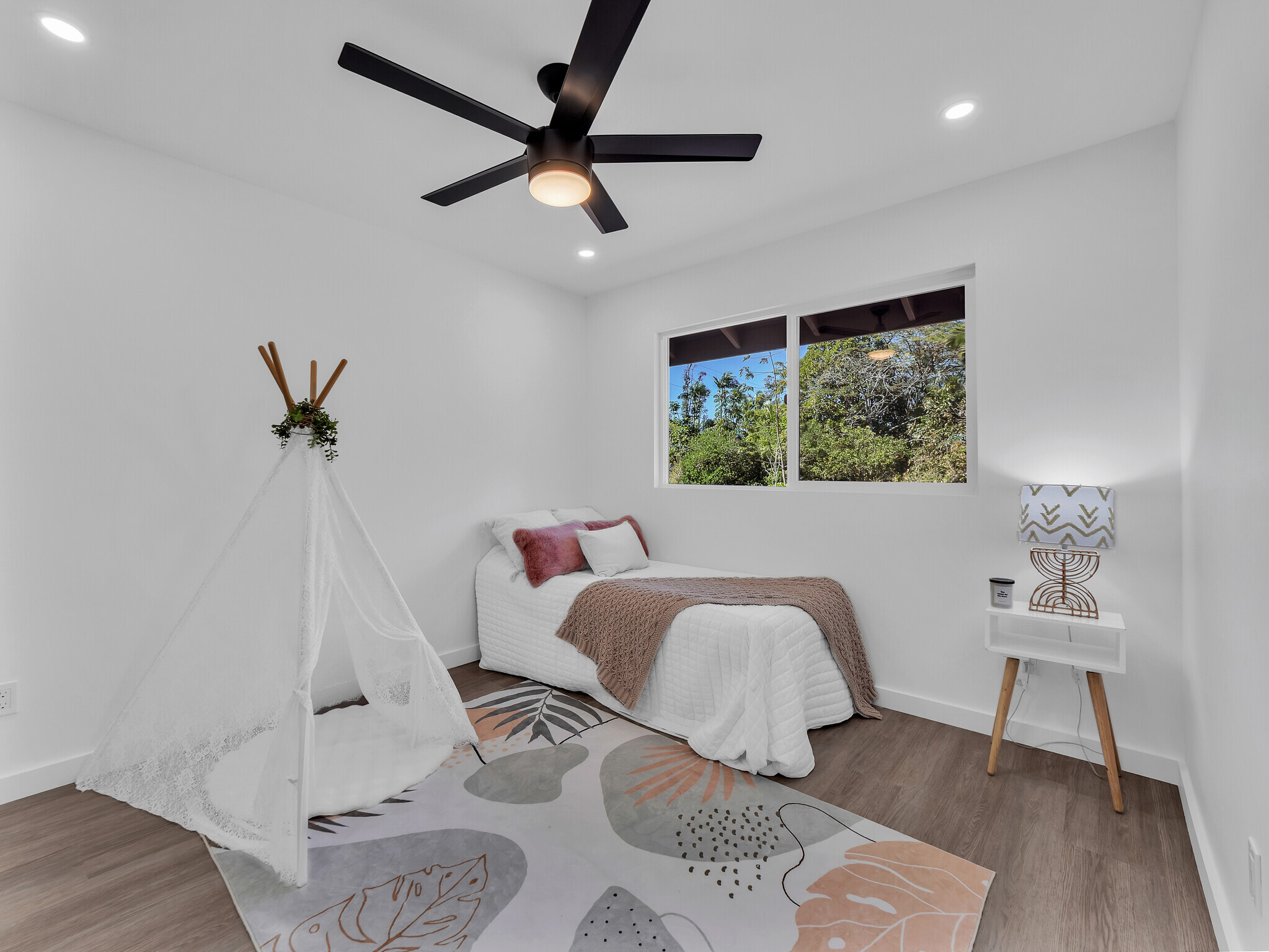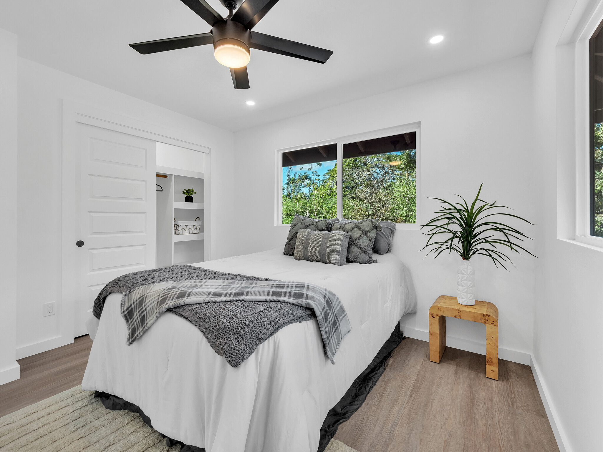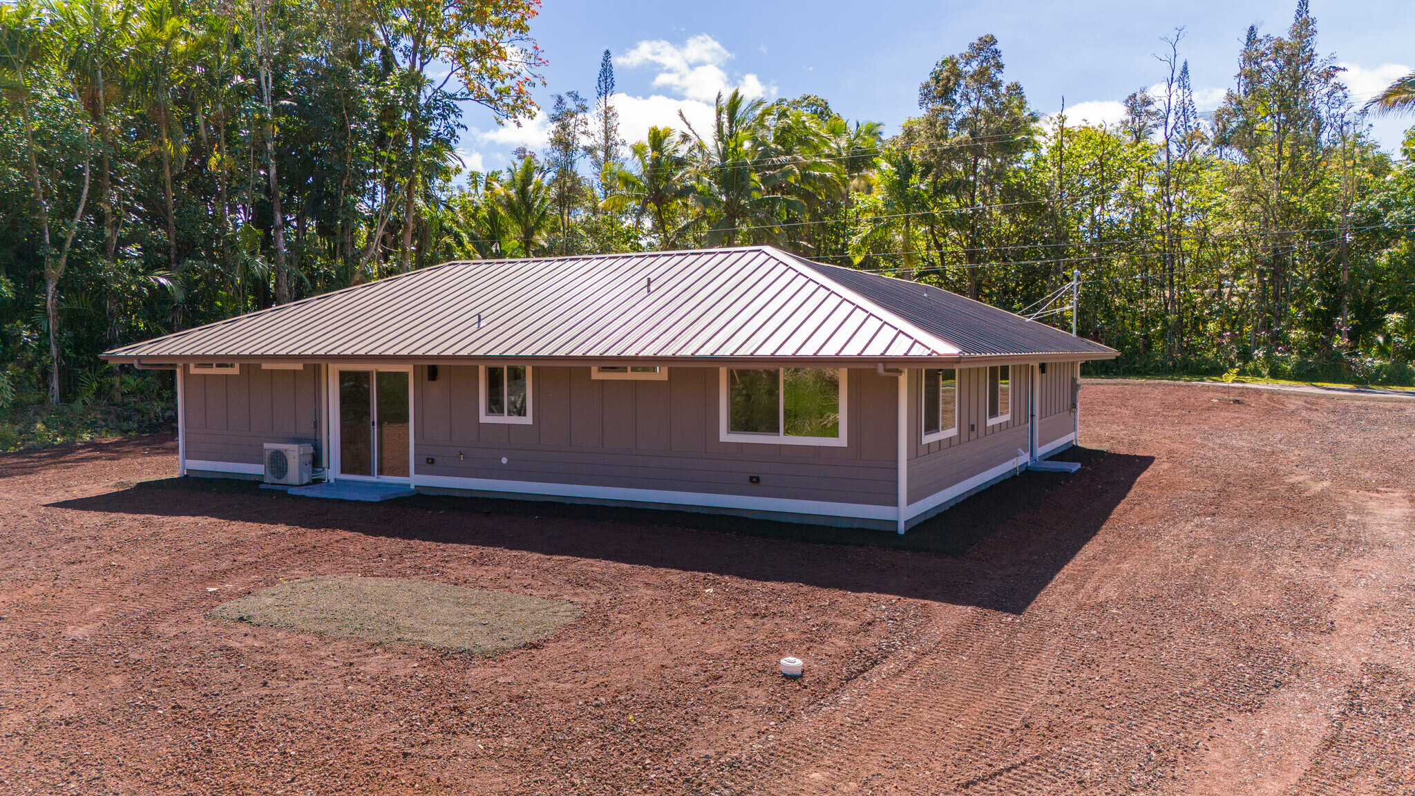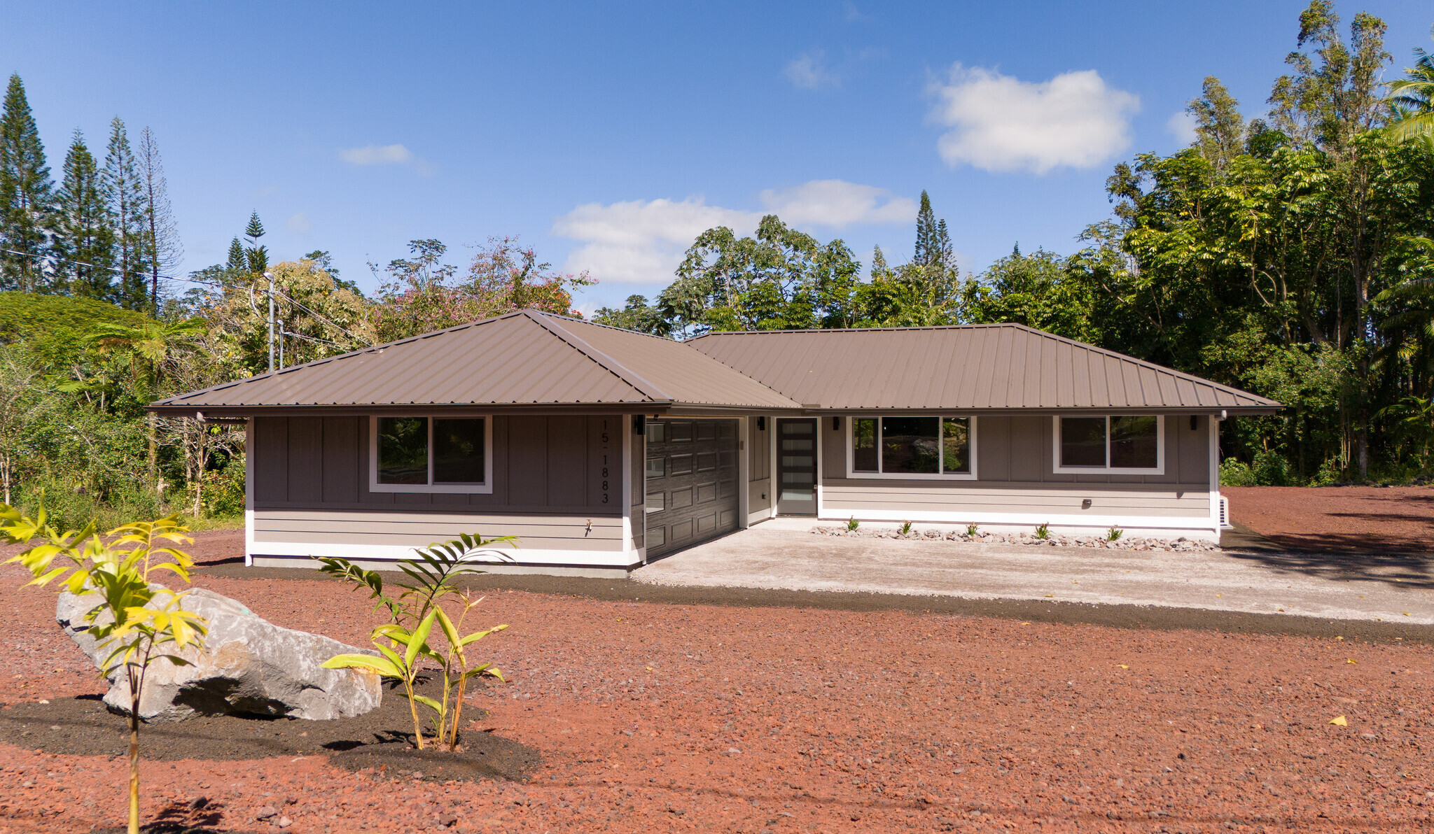 Brand-new construction in the desirable Hawaiian Paradise Park neighborhood! Located at the top of the subdivision for added convenience, this thoughtfully designed 3-bedroom, 2-bath residence is situated on a paved road and offers an ideal blend of privacy and functionality with its popular split floor plan. The open-concept kitchen is a standout, showcasing sleek high-gloss cabinetry, quartz countertops, a spacious island, and a walk-in pantry. The primary suite provides a private retreat with a walk-in closet and tiled walk-in shower with LED lighting in the shower niche. Additional highlights include a convenient mudroom off the garage entry featuring a built-in bench with hidden storage, split A/C units in the living room and primary suite for year-round comfort, and quality finishes throughout the home. Move-in ready and thoughtfully appointed, this is a must-see opportunity in Hawaiian Paradise Park.