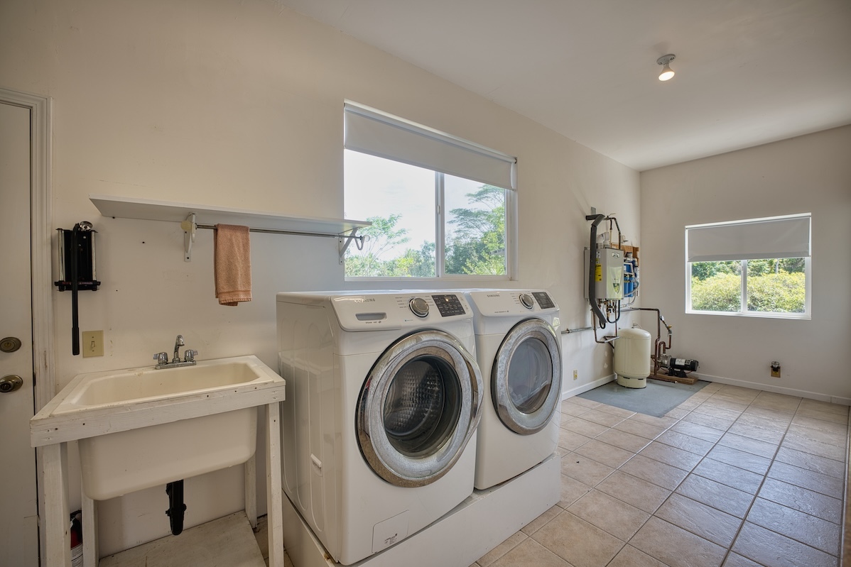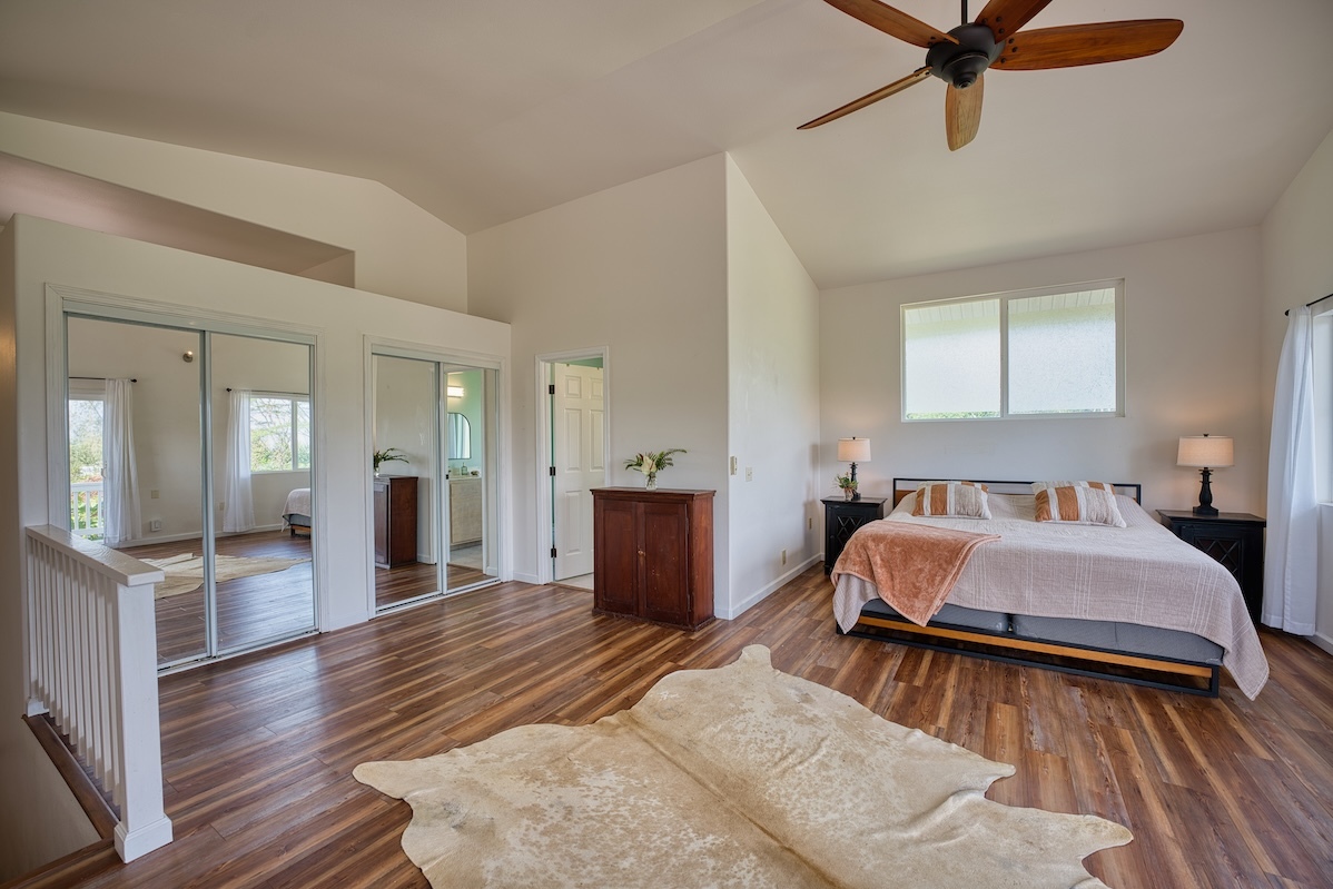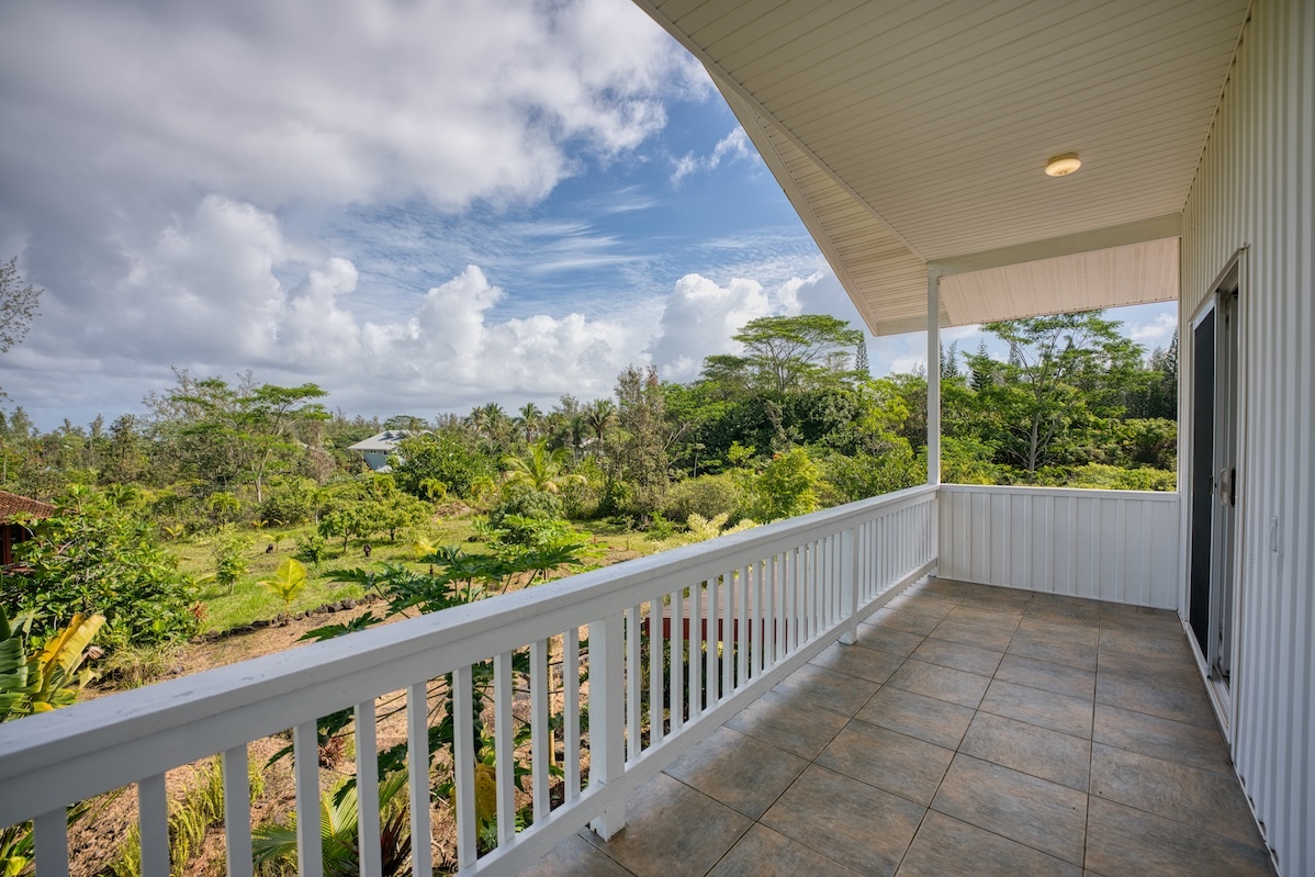 Step inside to find soaring vaulted ceilings and an open, airy living space that flows seamlessly to the expansive screened-in back lanai – perfect for indoor-outdoor living and entertaining. The deck of the screened in lanai is actually the cement catchment tanks for the house. A practical, functional and aesthetically appealing way to conceal the catchment tank. This innovative catchment system built under the concrete lanai helps maximize space and efficiency. The home features two primary suites, one upstairs and one downstairs, providing privacy and options for multi-generational living or guest accommodations.
