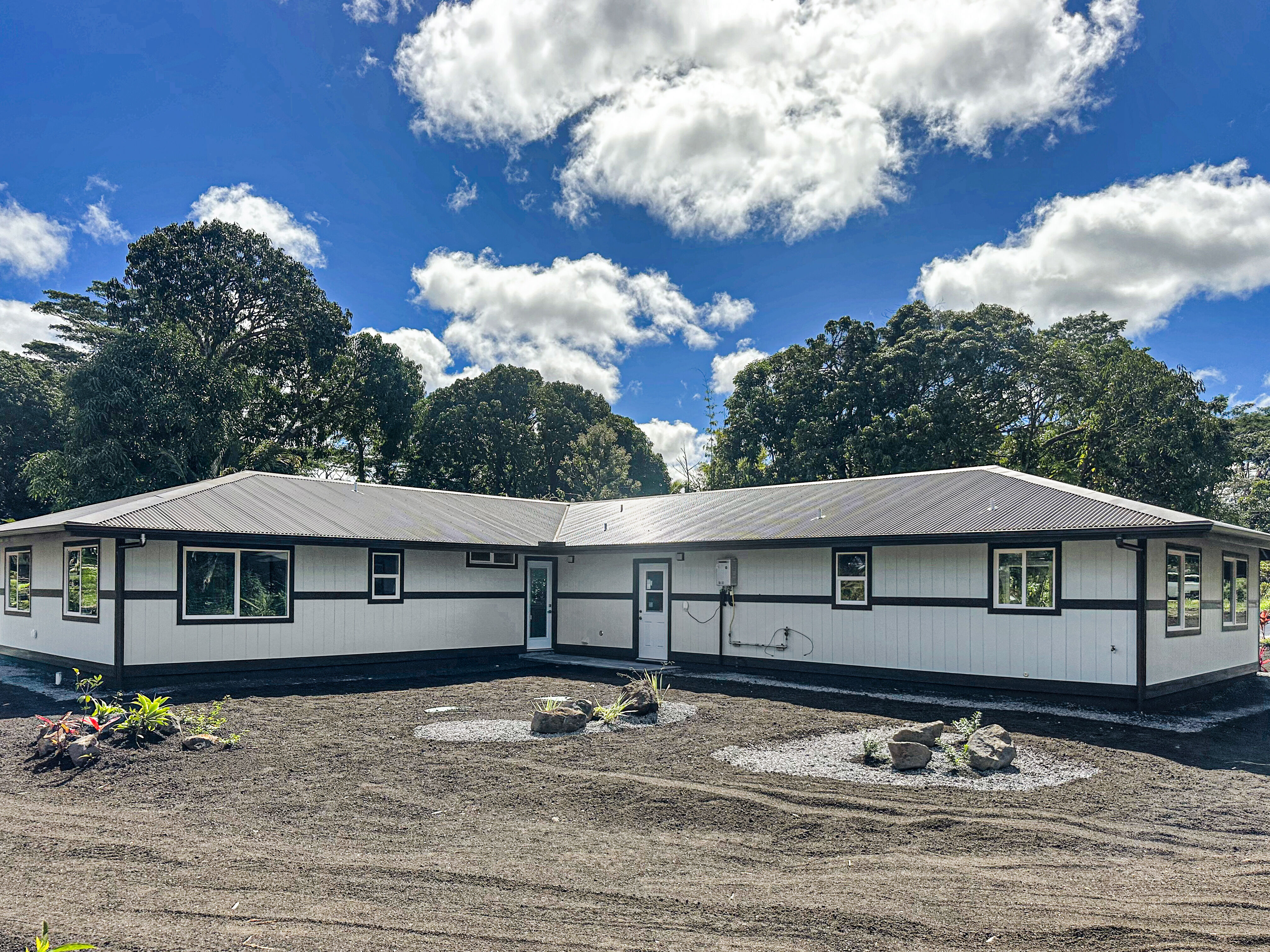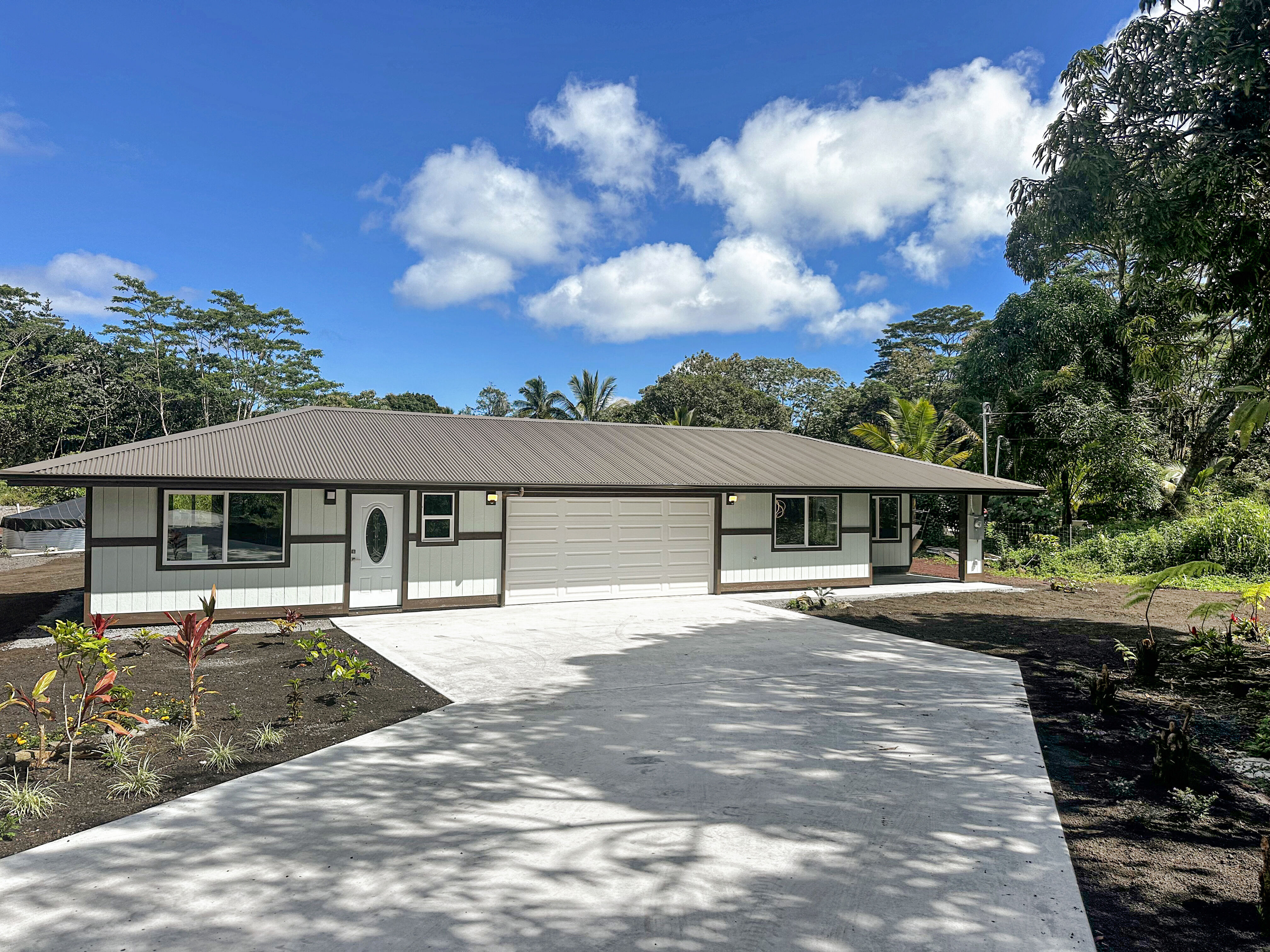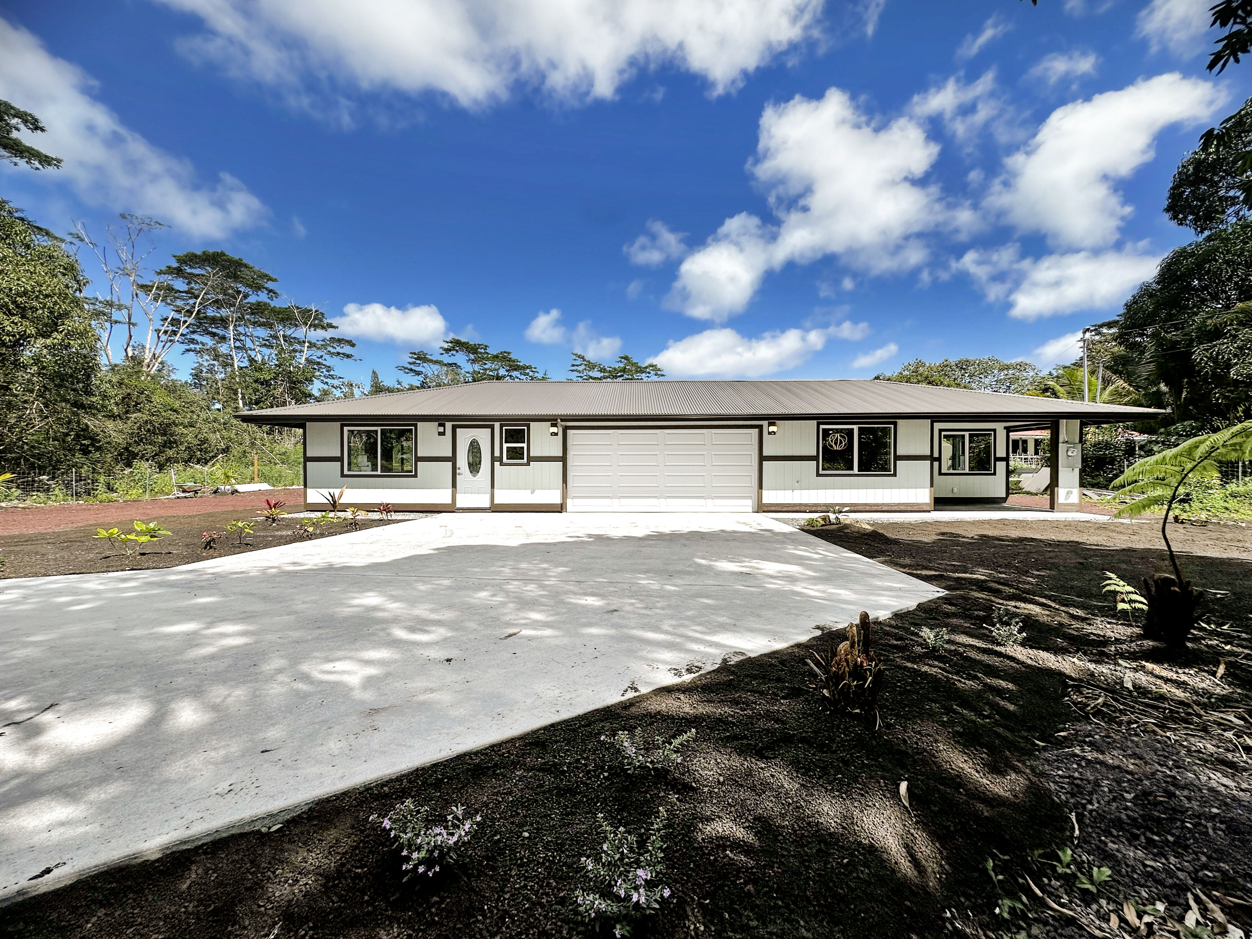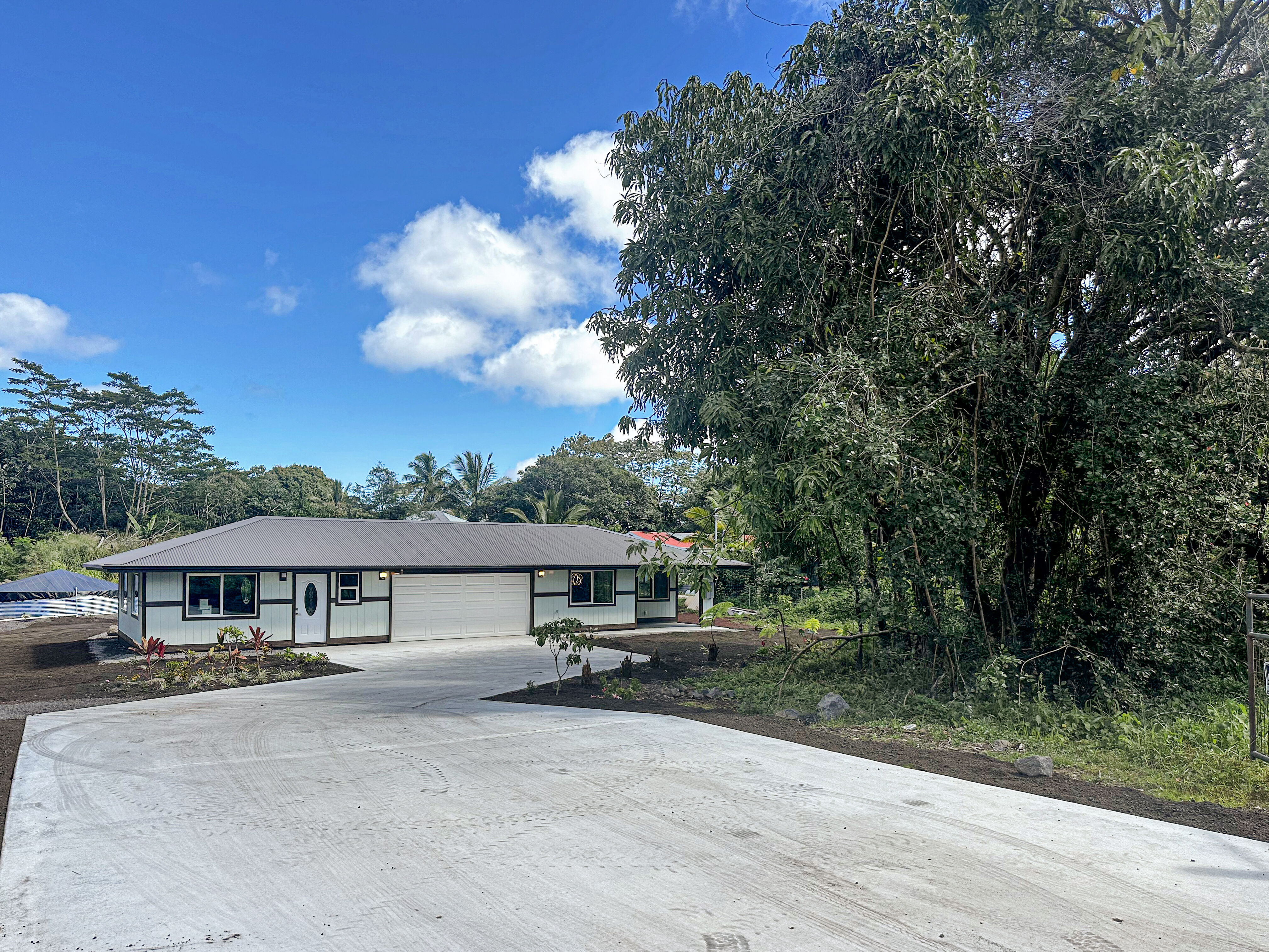 This new home built in the sought-after Hawaiian Paradise Park offers a practical and versatile layout on a peaceful lot. The main residence includes 3 bedrooms and 2 bathrooms, with an open living area that feels spacious and bright thanks to vaulted ceilings and a thoughtful color scheme. The kitchen stands out with ample counter and cabinet space, premium Kraftmaid cabinets (including extra-tall 39” uppers), two large pantries, and modern Samsung and LG stainless steel appliances. Durable Lifeproof vinyl plank flooring runs throughout the main areas for easy upkeep, paired with ceiling fans, sleek fixtures, and a balanced mix of cool surfaces and warm dark cabinetry. A key feature is the fully separate studio, complete with its own entrance, full bath (curbless shower), wet bar, and living space. This setup provides excellent privacy via the connecting enclosed 2-car garage – ideal for guests, multigenerational living, a home office, or potential rental income in this high-demand area. Outside, enjoy a spacious front lanai for relaxing or entertaining, a wide concrete driveway, low-maintenance partial landscaping -including tropical fruit trees (mango, papaya, banana) plus an eco-friendly photovoltaic UV water filtration system. Additional Highlights: - Curbless showers in both the primary suite and studio - Easy-to-maintain vinyl plank flooring - Stainless steel appliances and custom cabinetry - Private studio with separate entrance and wet bar - Tropical fruit trees and sustainable water system - Located in a convenient yet quiet part of Hawaiian Paradise Park, close to beaches, amenities, and everyday needs. -Long, wide concrete driveway - Approximate 1/2 acre fenced and gated in front and back This home combines modern comfort, flexibility, and low-maintenance island living. Information herein deemed reliable but not guaranteed. Buyer and buyer's agent to do their own due diligence on all pertinent facts.