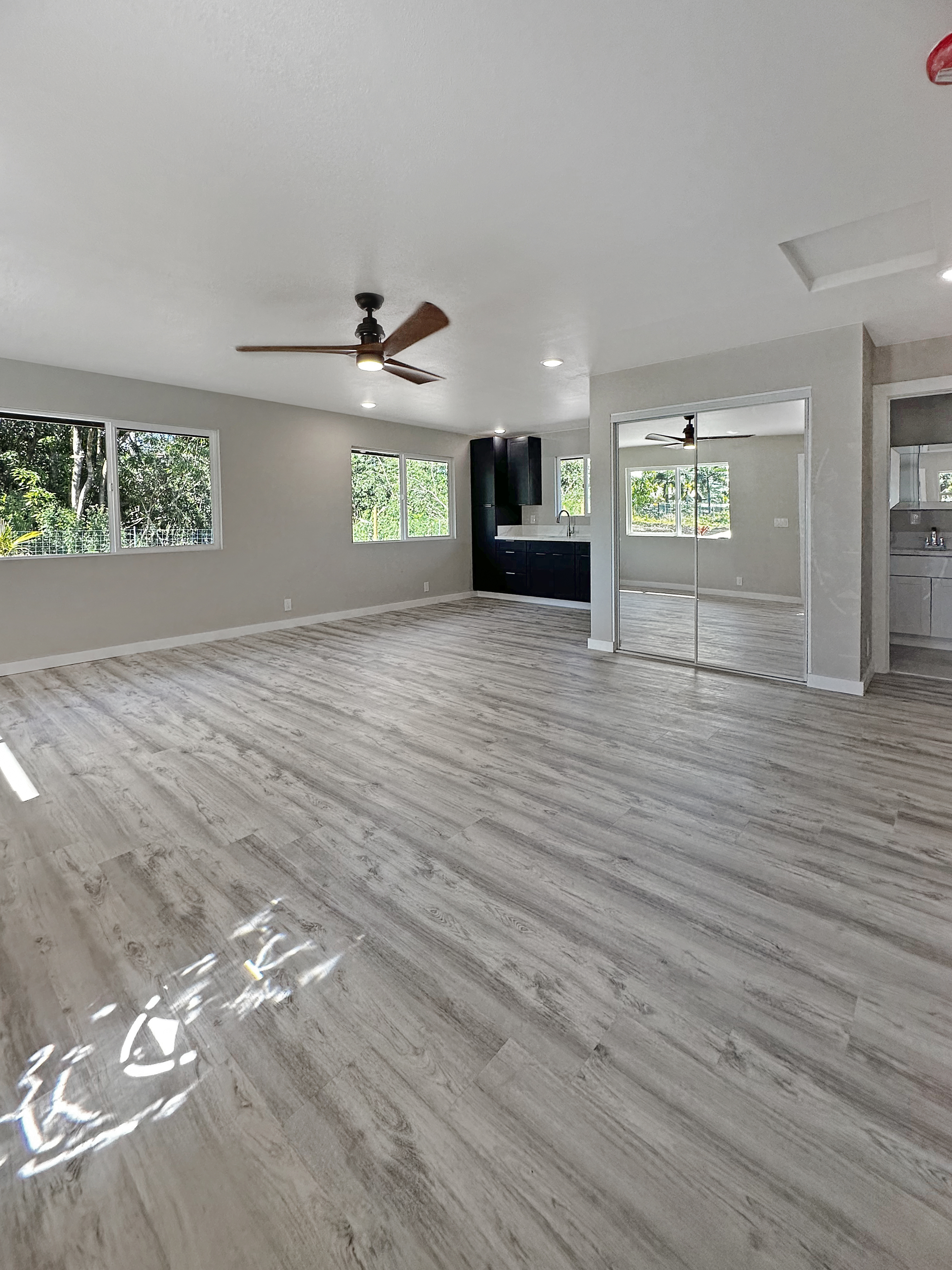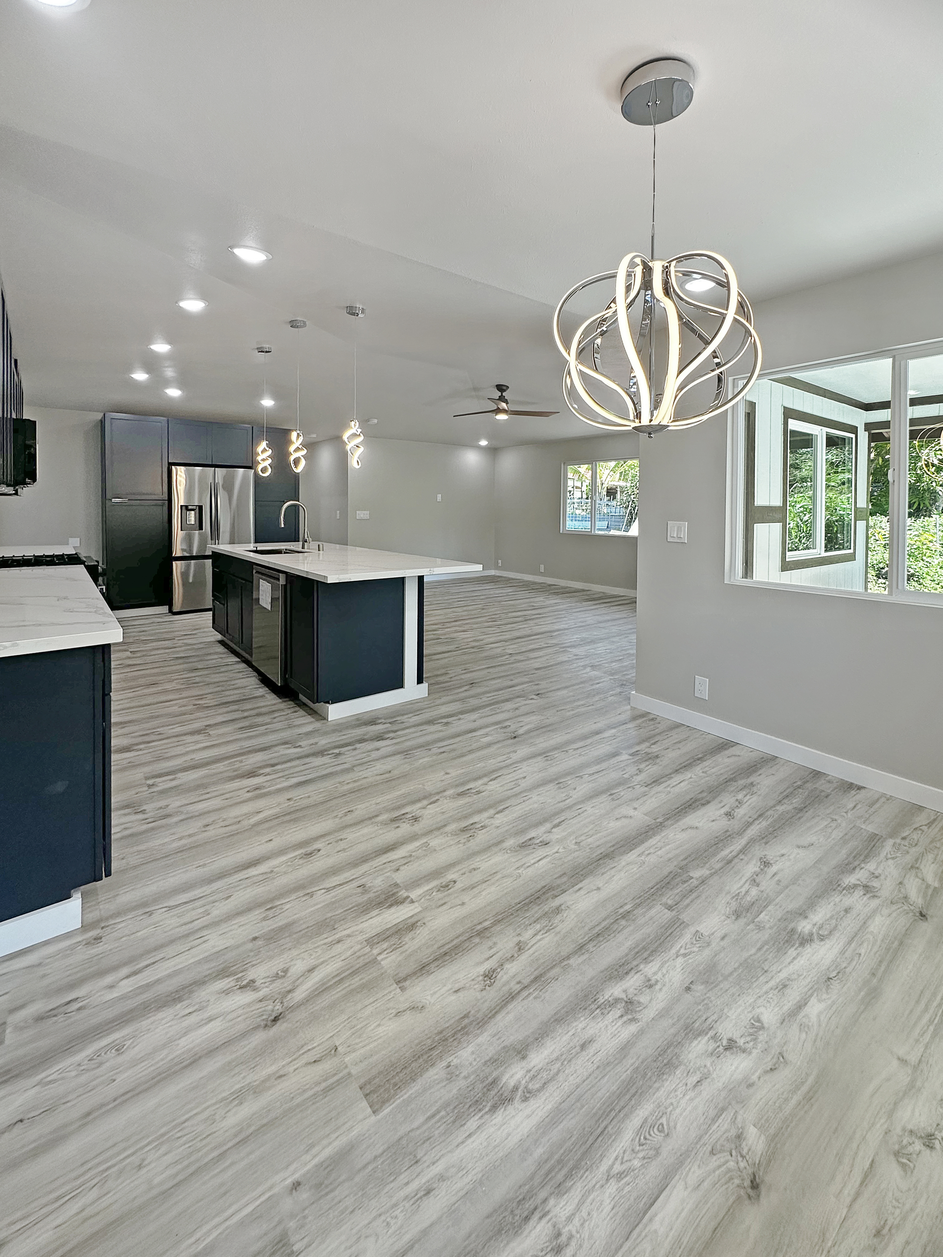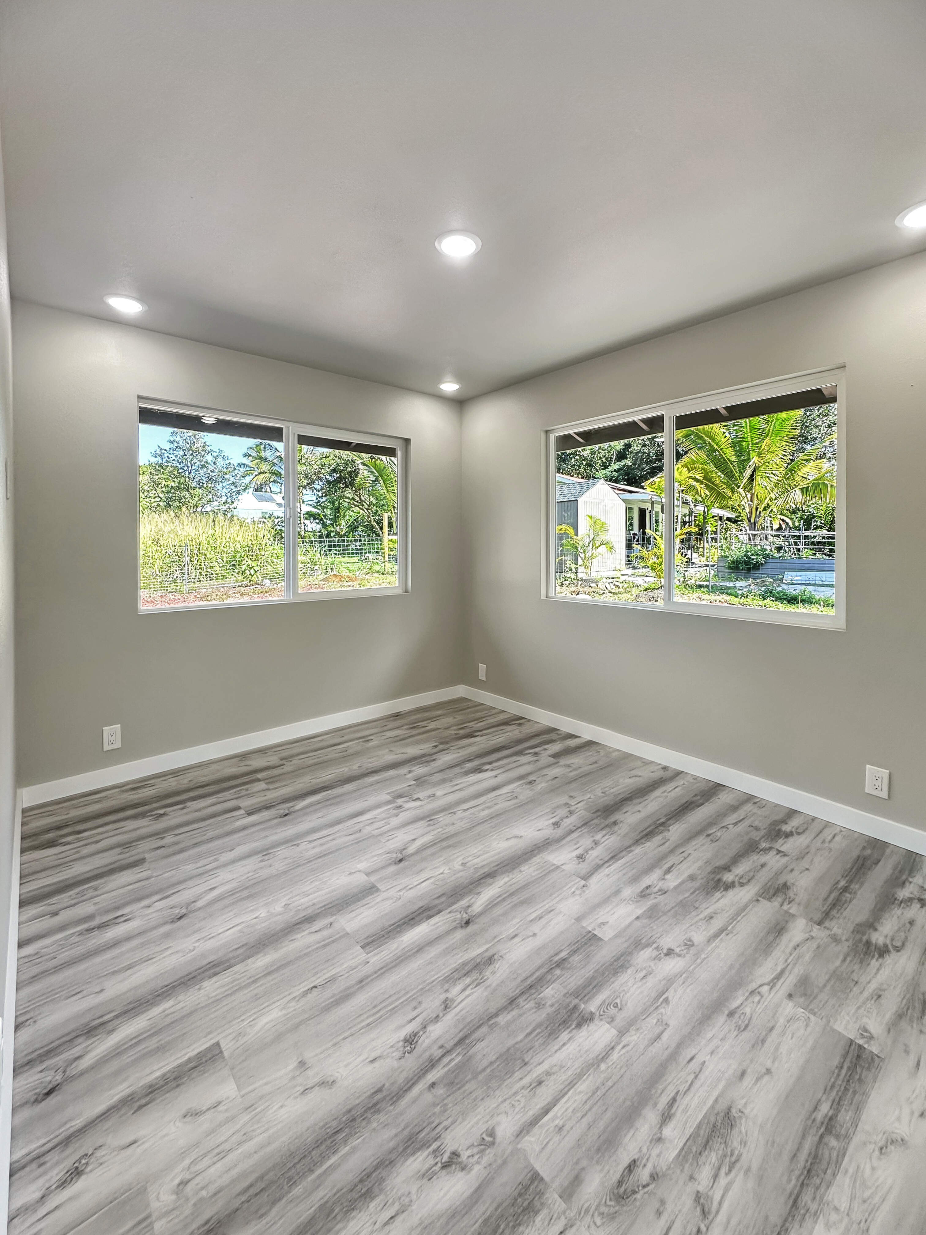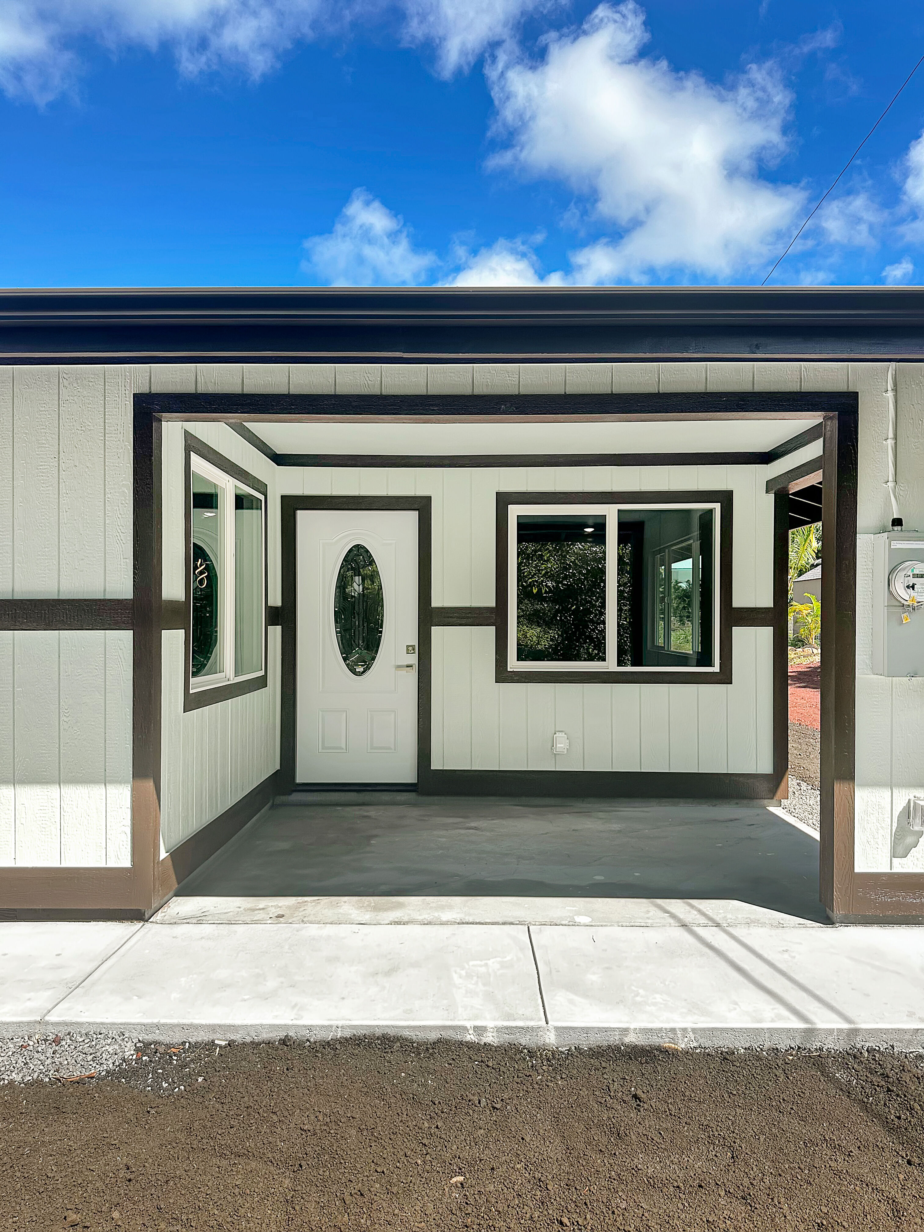 This new home built in the sought-after Hawaiian Paradise Park offers a practical and versatile layout on a peaceful lot. The main residence includes 3 bedrooms and 2 bathrooms, with an open living area that feels spacious and bright thanks to vaulted ceilings and a thoughtful color scheme. The kitchen stands out with ample counter and cabinet space, premium Kraftmaid cabinets (including extra-tall 39” uppers), two large pantries, and modern Samsung and LG stainless steel appliances. Durable Lifeproof vinyl plank flooring runs throughout the main areas for easy upkeep, paired with ceiling fans, sleek fixtures, and a balanced mix of cool surfaces and warm dark cabinetry. A key feature is the fully separate studio, complete with its own entrance, full bath (curbless shower), wet bar, and living space. This setup provides excellent privacy via the connecting enclosed 2-car garage – ideal for guests, multigenerational living, a home office, or potential rental income in this high-demand area. Outside, enjoy a spacious front lanai for relaxing or entertaining, a wide concrete driveway, low-maintenance partial landscaping -including tropical fruit trees (mango, papaya, banana) plus an eco-friendly photovoltaic UV water filtration system. Additional Highlights: - Curbless showers in both the primary suite and studio - Easy-to-maintain vinyl plank flooring - Stainless steel appliances and custom cabinetry - Private studio with separate entrance and wet bar - Tropical fruit trees and sustainable water system - Located in a convenient yet quiet part of Hawaiian Paradise Park, close to beaches, amenities, and everyday needs. -Long, wide concrete driveway - Approximate 1/2 acre fenced and gated in front and back This home combines modern comfort, flexibility, and low-maintenance island living. Information herein deemed reliable but not guaranteed. Buyer and buyer's agent to do their own due diligence on all pertinent facts.
