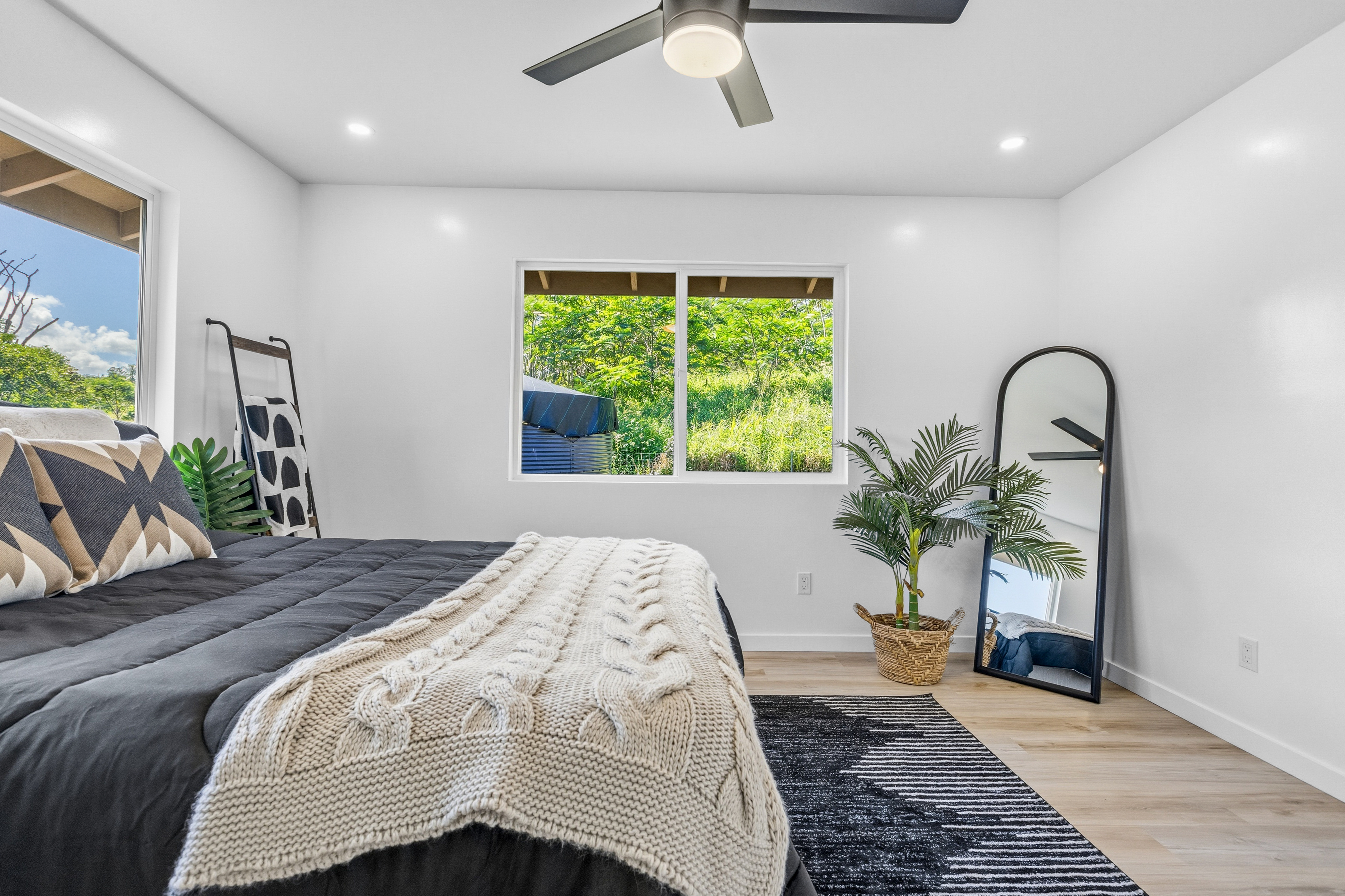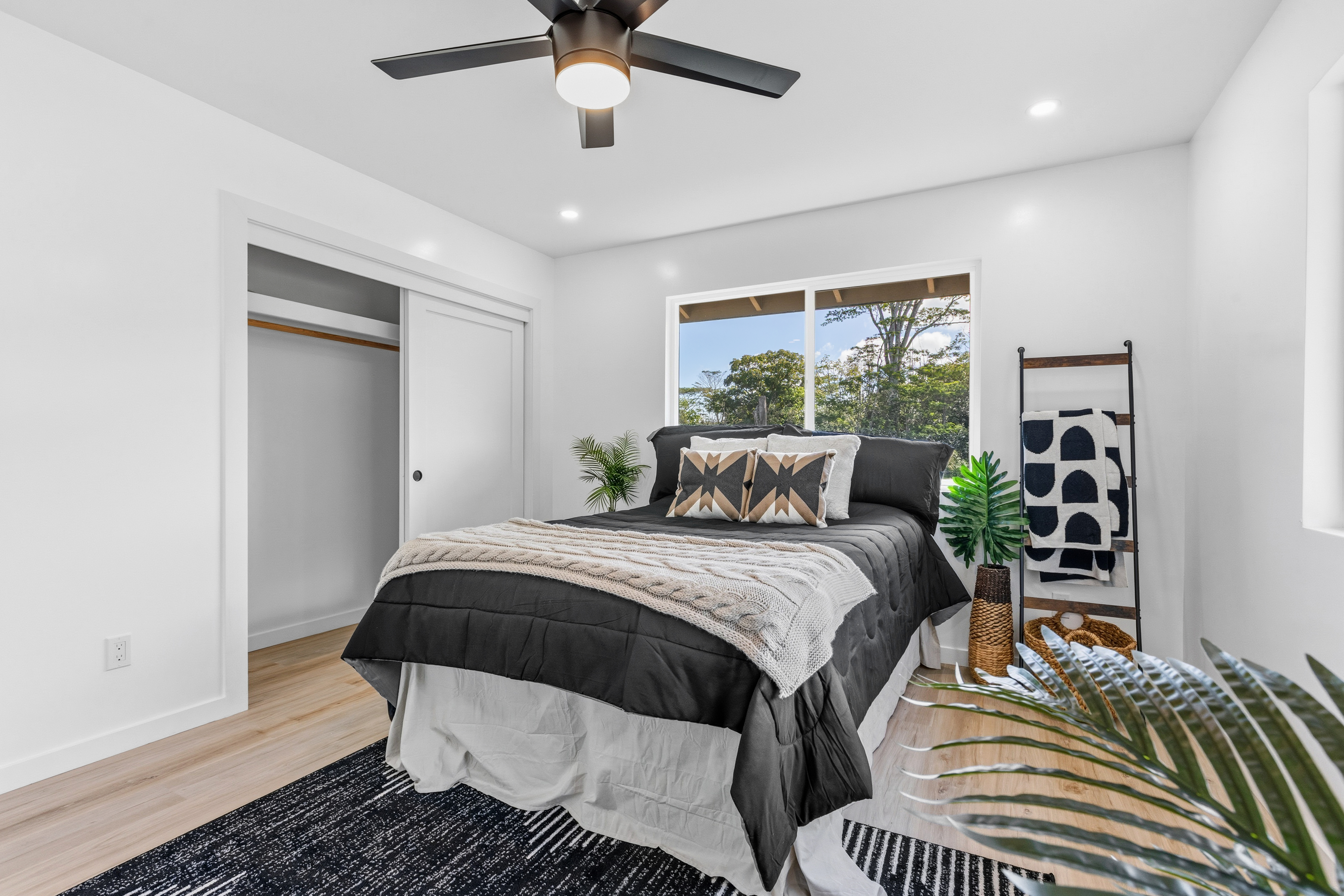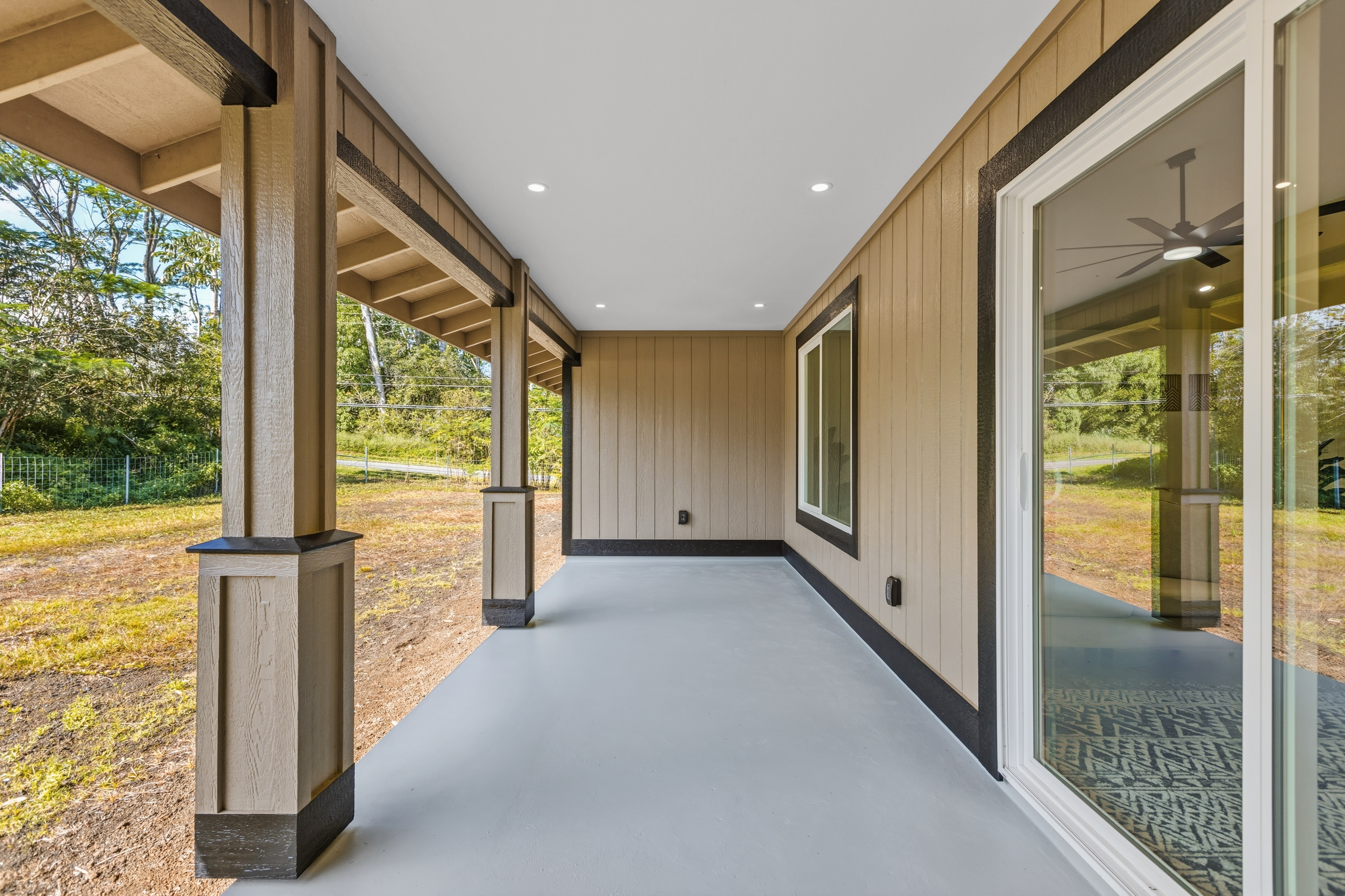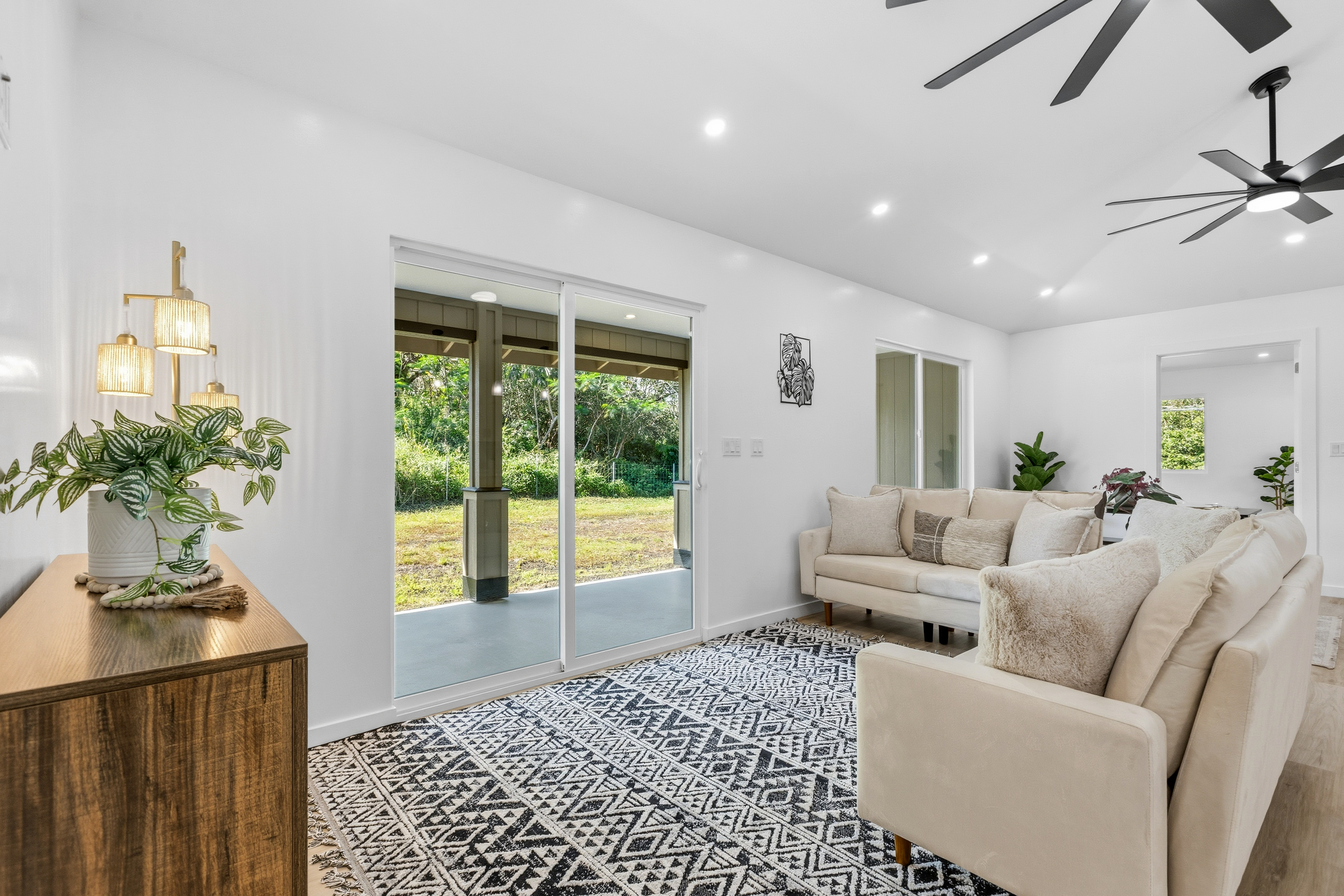 Welcome to this beautifully built 2025 home located in the highly sought-after Hawaiian Paradise Park subdivision. Situated on a half-cleared, 1-acre corner lot, this 3-bedroom, 2-bath property is priced to sell. As you arrive, you’ll appreciate the paved driveway leading to a fully fenced yard, offering both security and peace of mind. The landscaping is thoughtfully designed with young podocarpus trees lining the roadside for future privacy. Inside, you’ll find a desirable split floor plan, providing excellent separation between the primary suite and guest bedrooms. The primary suite is a true retreat, featuring a spacious walk-in closet with a built-in makeup vanity area, as well as a beautifully appointed ensuite bathroom with double-vanity sinks and modern finishes. This newer home offers the space, style, and location you’ve been searching for.