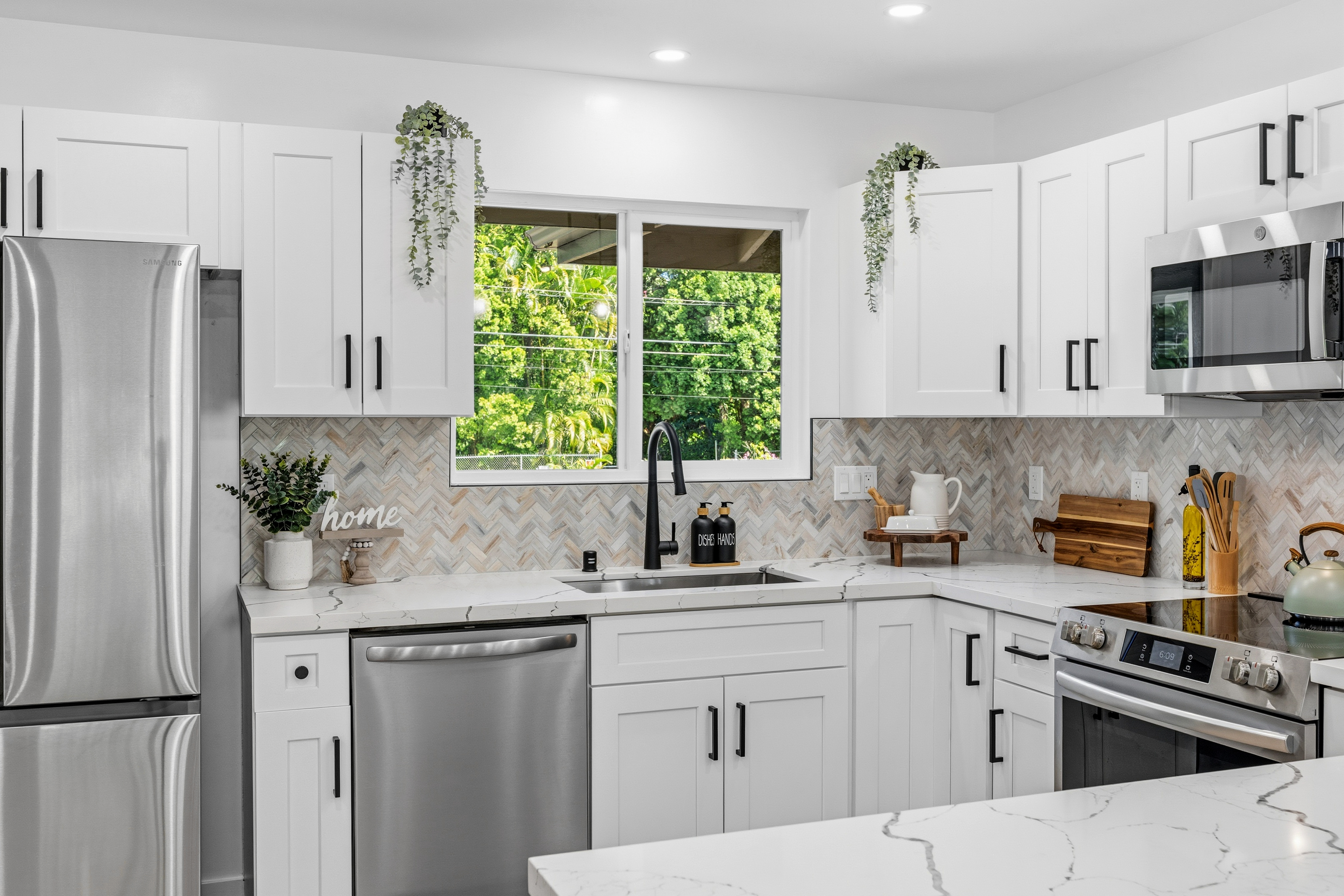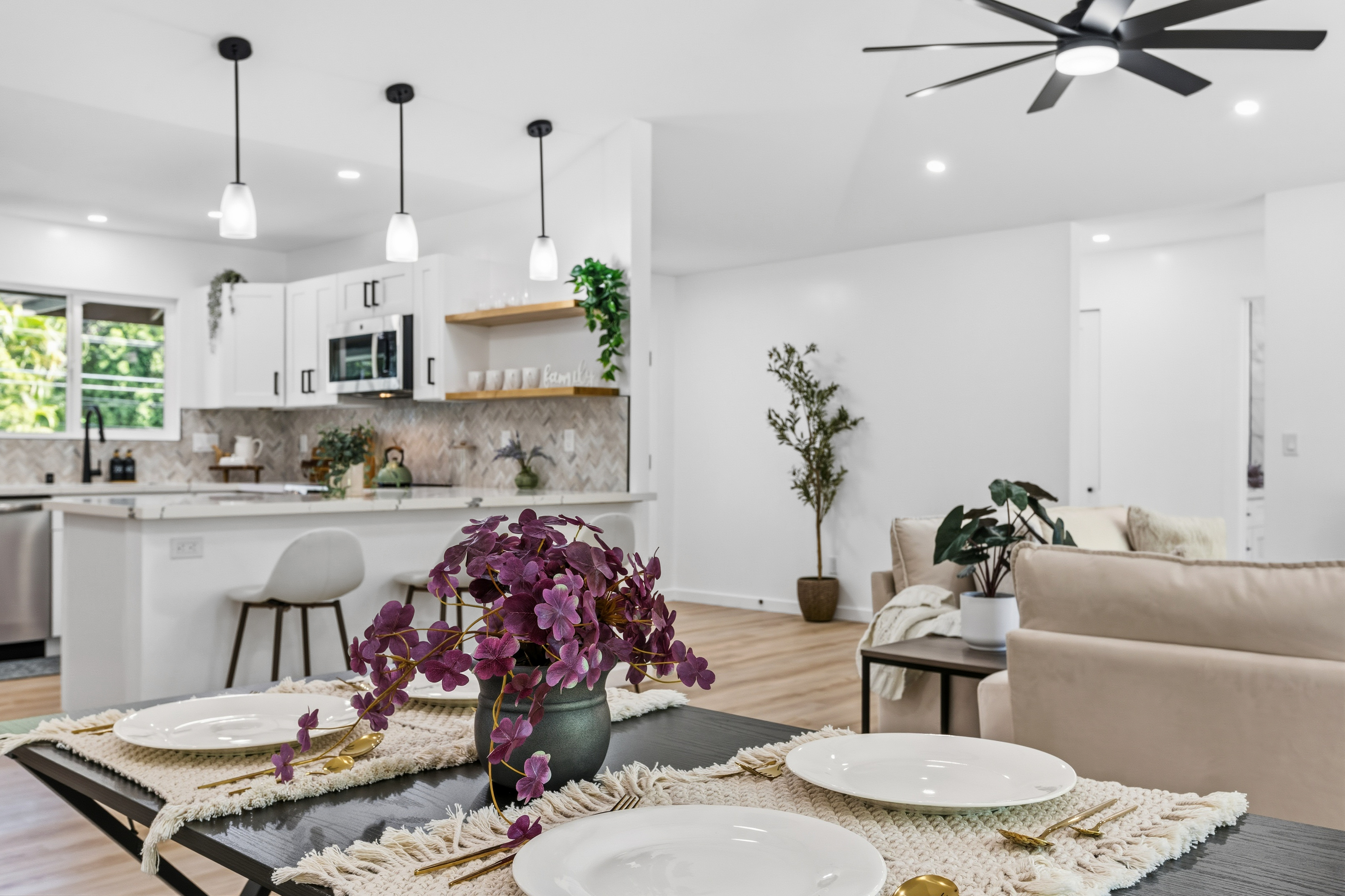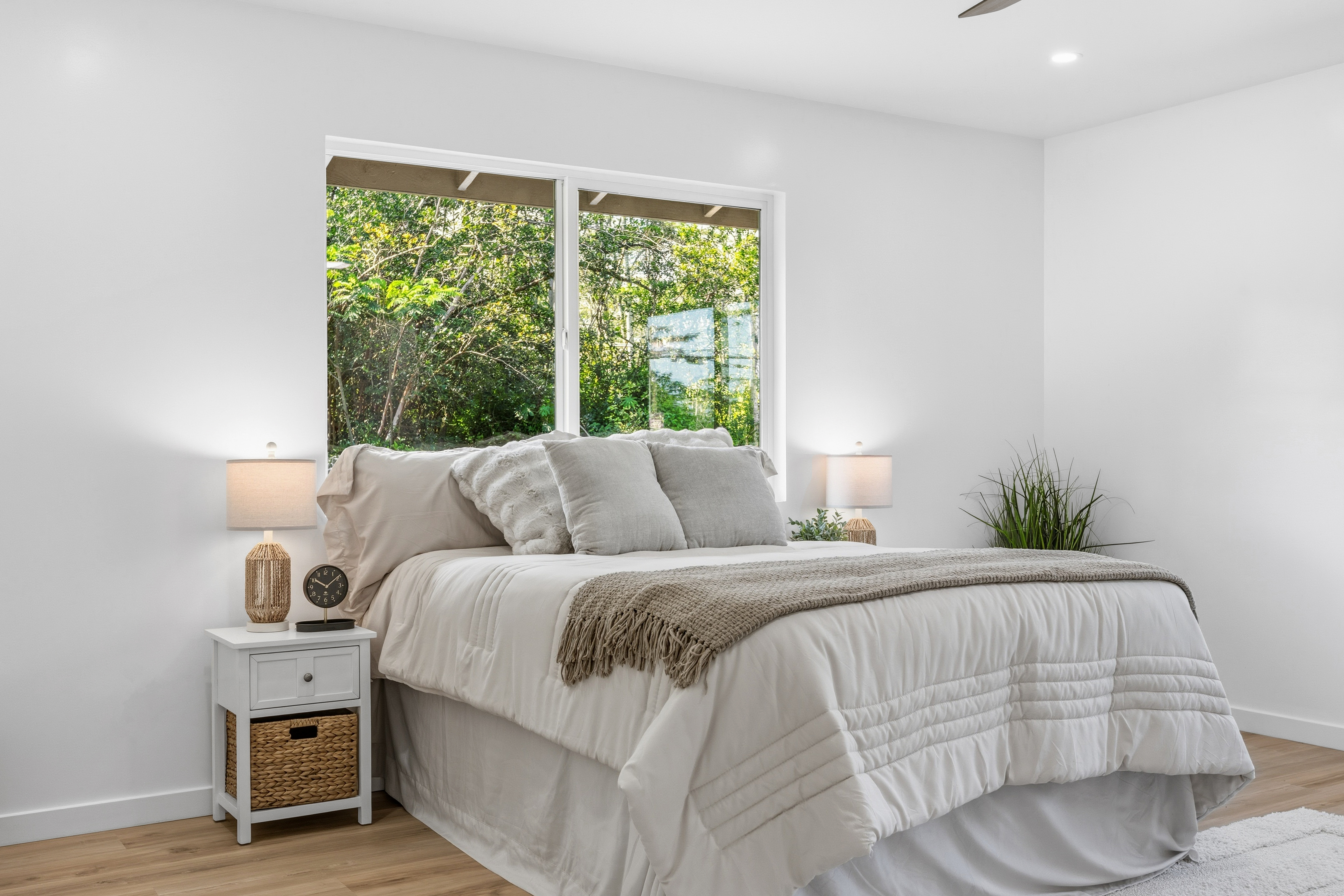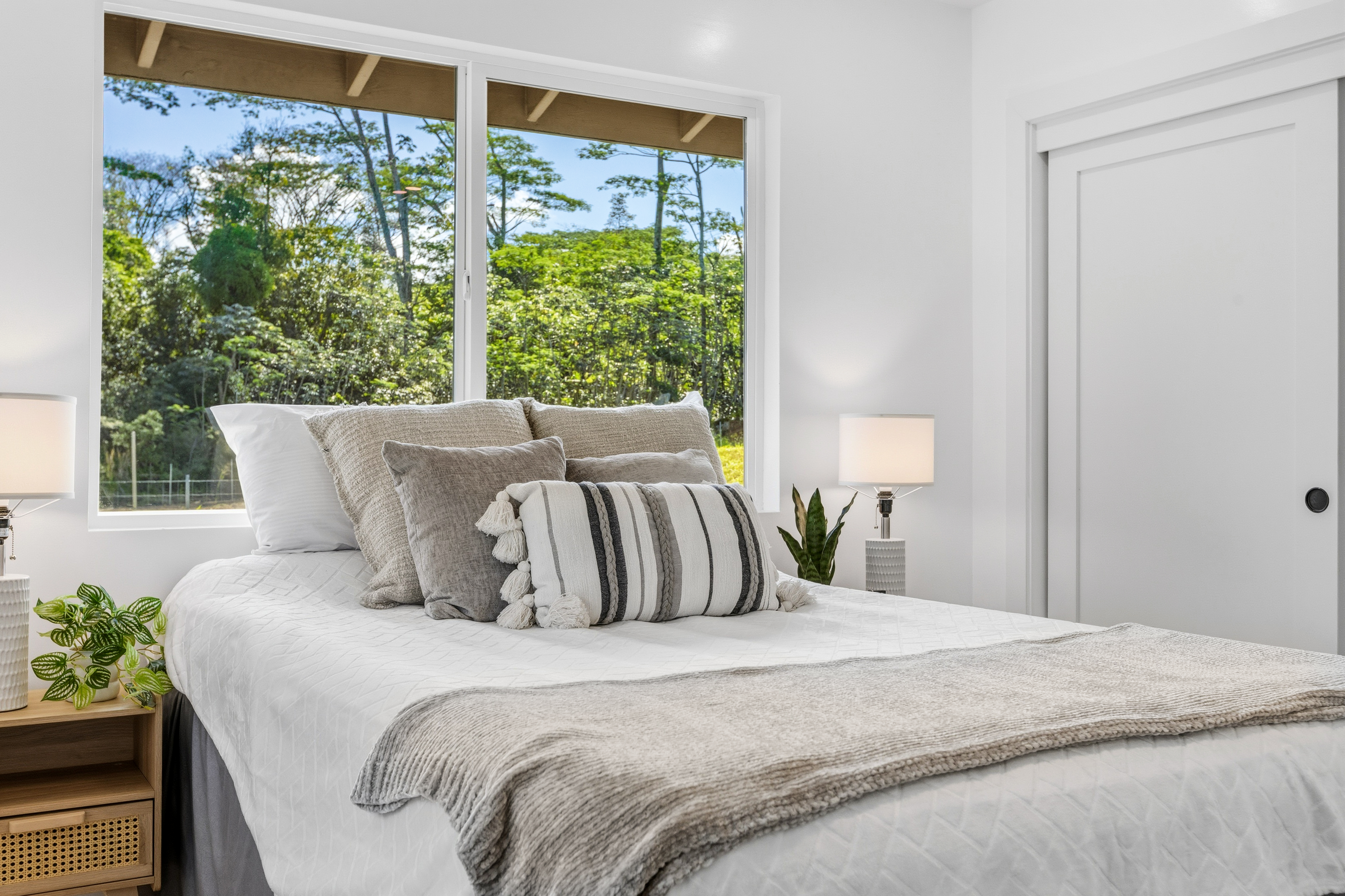Welcome to this beautifully built 2025 home located in the highly sought-after Hawaiian Paradise Park subdivision. Situated on a half-cleared, 1-acre corner lot, this 3-bedroom, 2-bath property is priced to sell. As you arrive, you’ll appreciate the paved driveway leading to a fully fenced yard, offering both security and peace of mind. The landscaping is thoughtfully designed with young podocarpus trees lining the roadside for future privacy. Inside, you’ll find a desirable split floor plan, providing excellent separation between the primary suite and guest bedrooms. The primary suite is a true retreat, featuring a spacious walk-in closet with a built-in makeup vanity area, as well as a beautifully appointed ensuite bathroom with double-vanity sinks and modern finishes. This newer home offers the space, style, and location you’ve been searching for.