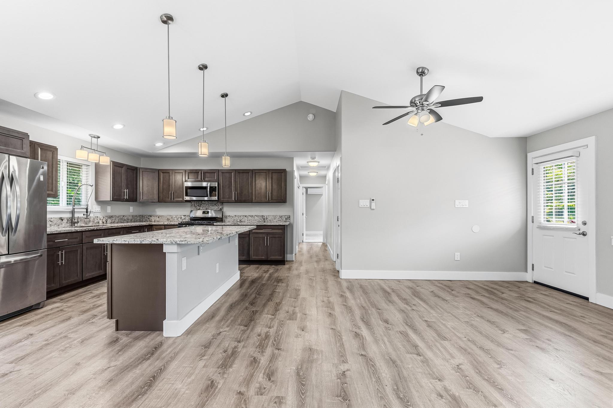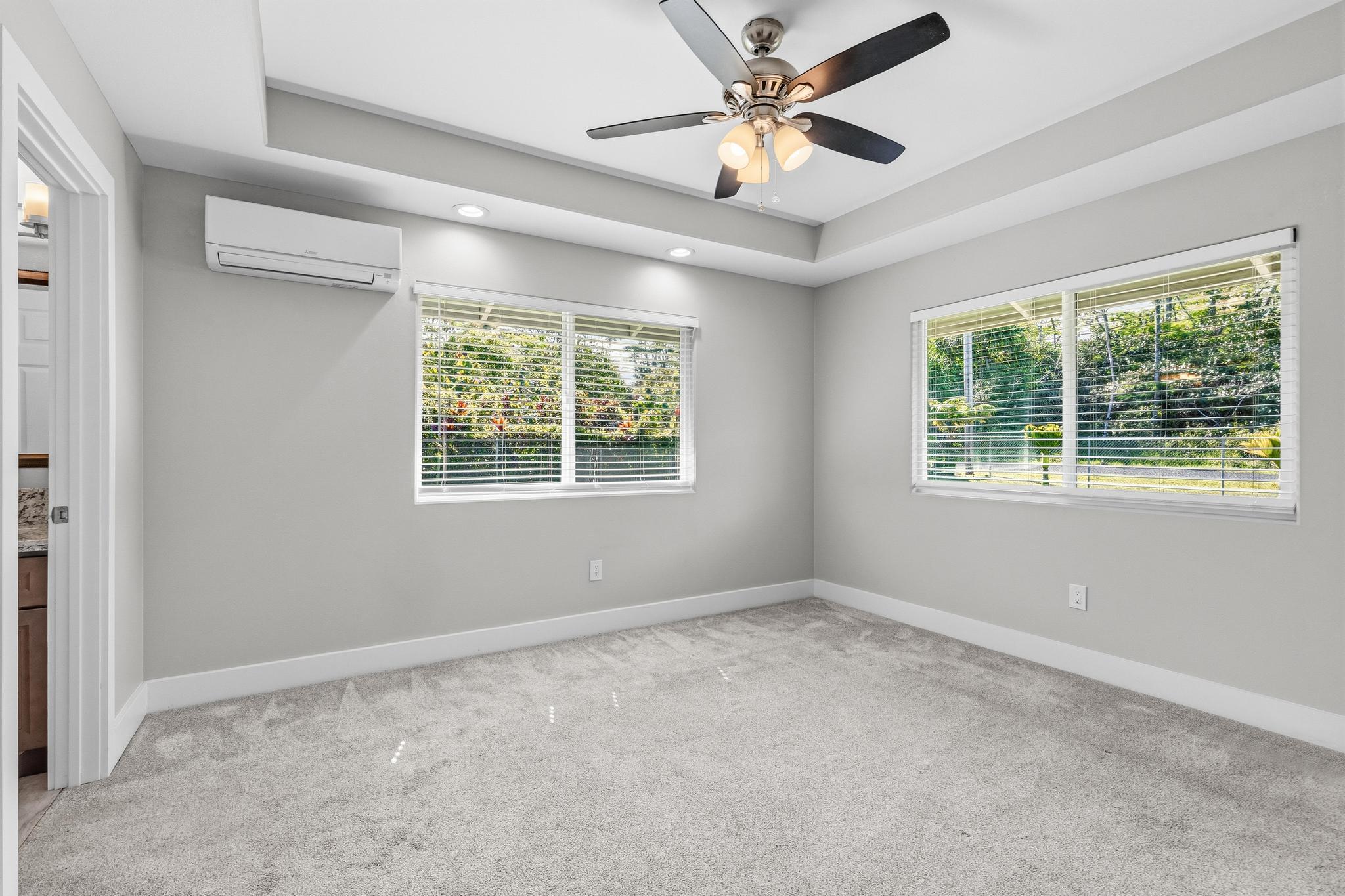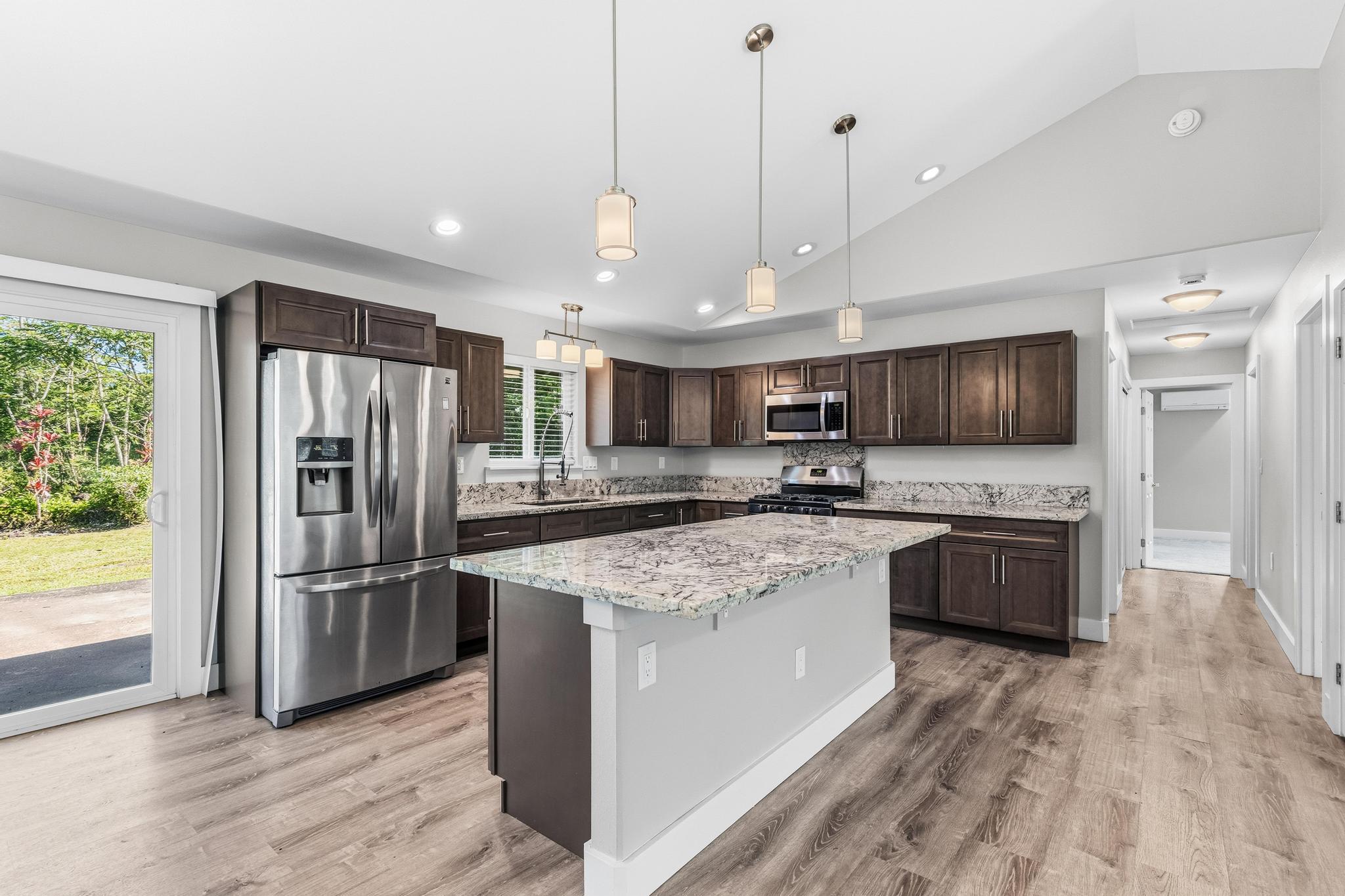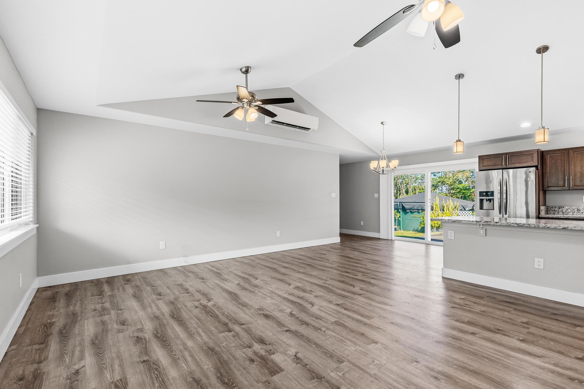 Welcome to this well maintained 3-bedroom, 2-bathroom home situated on a one-acre lot. From the moment you enter through the automated front gate, you are greeted by a private landscaped yard with banana, papaya, and pineapple plants. Inside, the home boasts airy vaulted ceilings and a seamless open-concept design. The kitchen is a true centerpiece, featuring elegant granite countertops, a large center island, stainless steel appliances, and a gas/propane range. Stay cool year-round with two efficient split AC units–one in the main living area and another in the spacious primary suite, which also features a generous walk-in closet and an en-suite bathroom with dual vanities. Practicality meets modern upgrades including on-demand hot water, a UV water filtration system, and a separate storage shed. The property is partially fenced for privacy, includes a two-car garage with a dedicated laundry area, and features a recently serviced septic system. This home is move-in ready and waiting for you.