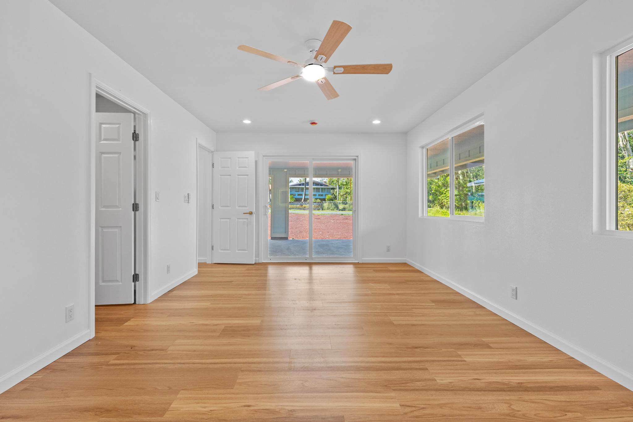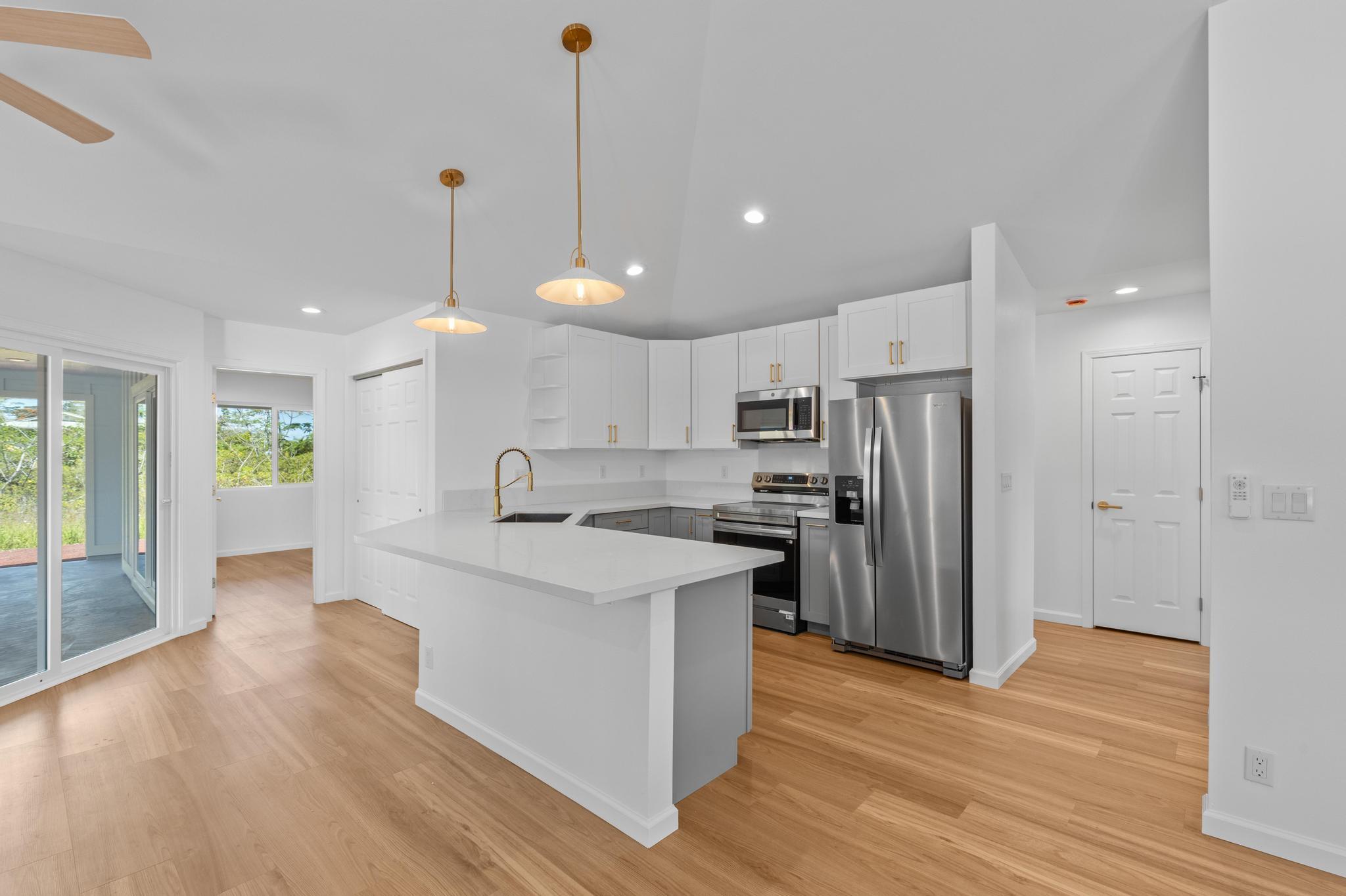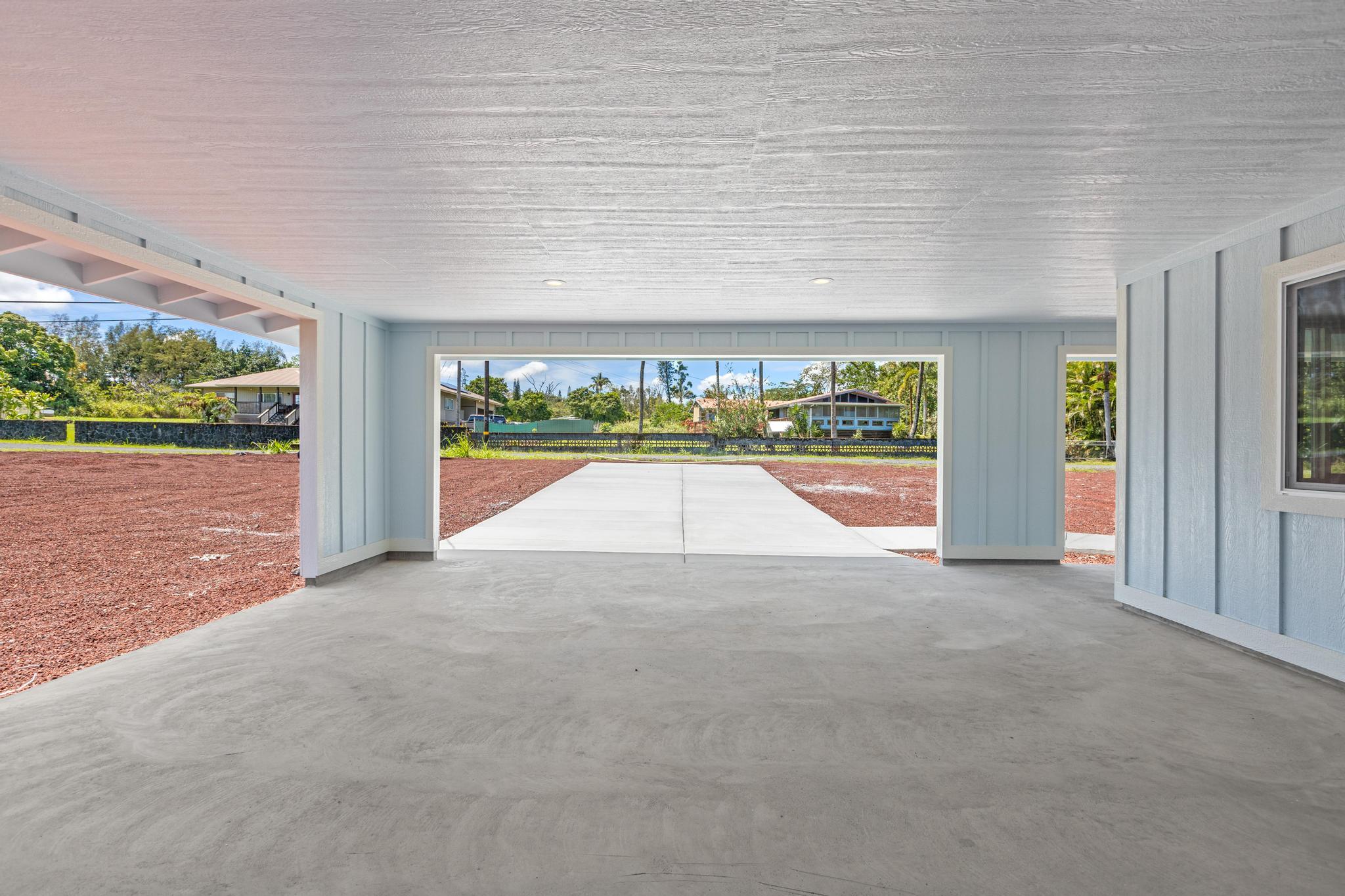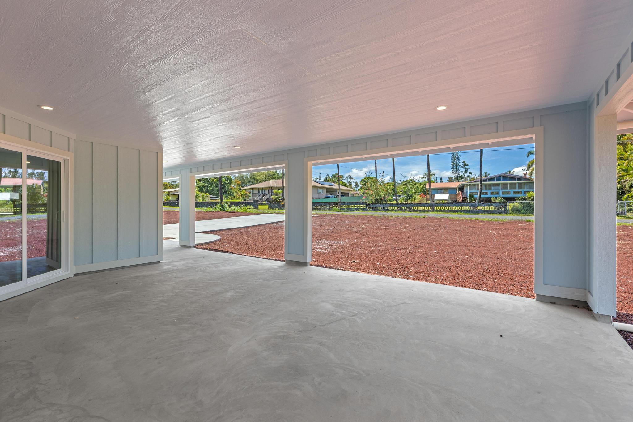 Your One Acre Canvas for Outdoor Living in Hawaiian Paradise Park. This property begins with a clear one acre lot, a true blank canvas for whatever outdoor lifestyle you envision. A brand new concrete driveway welcomes you, leading to a wide walkway and into a thoughtful design that prioritizes open air living. Instead of an enclosed garage, the builder created an open carport and wrapped the home with a continuous, covered concrete walkway. This design invites flow, functionality, and connection to the outdoors. The primary suite extends this vision with sliding doors that open onto a spacious, covered lanai. The perfect spot to relax, gather, or entertain. More concrete means less maintenance and more time to enjoy your outdoor experience. Toward the back of the acre, the land has already been mulched, setting you up for future possibilities. Whether it’s sustainable farming, creating a home garden, or simply enjoying the rich soil potential, the groundwork has been started for you. Altogether, the exterior living space spans an impressive 1,600 sq. ft. Inside, the home is the cherry on top. This 1334 sq. ft. split floor plan centers around the kitchen, offering balance between shared moments and privacy. Oversized bedrooms provide flexibility for a growing household or guests. The primary bedroom is especially generous, complete with a beautifully finished bathroom featuring custom tile work and a sleek glass shower door. Finally, location makes this home even more attractive. Situated in the upper section of Hawaiian Paradise Park, you’re just three streets from the main highway, a perfect blend of space, accessibility, and convenience. This home offers so many extras, but at its heart, it’s designed for the lifestyle that makes Hawaii living special: connection to the land, comfort indoors, and endless possibilities outside.