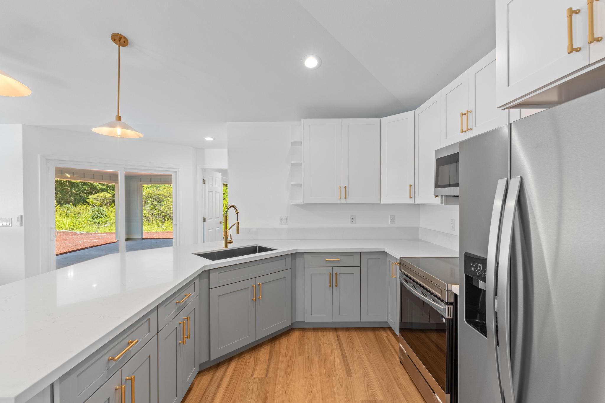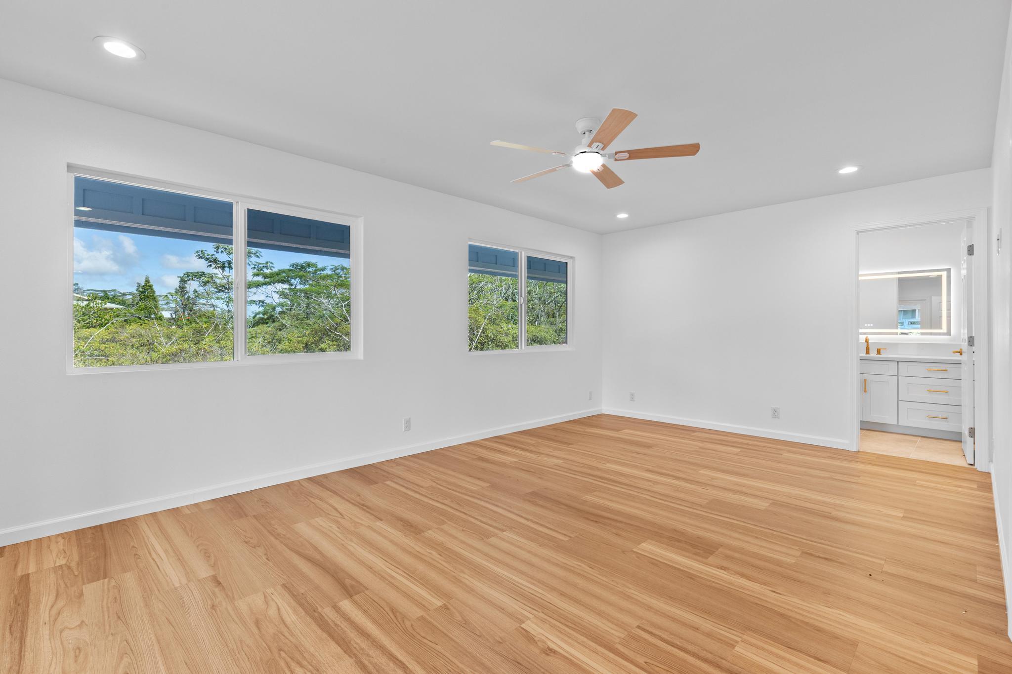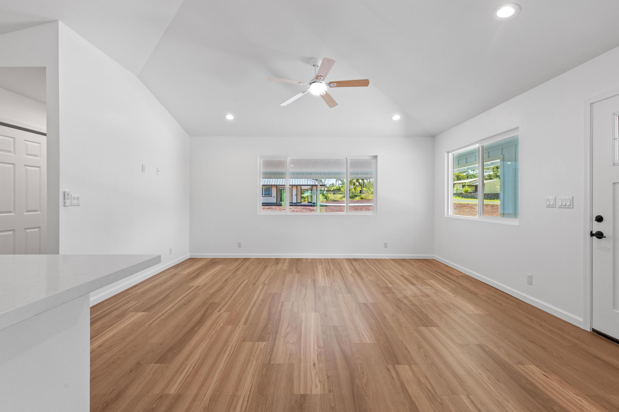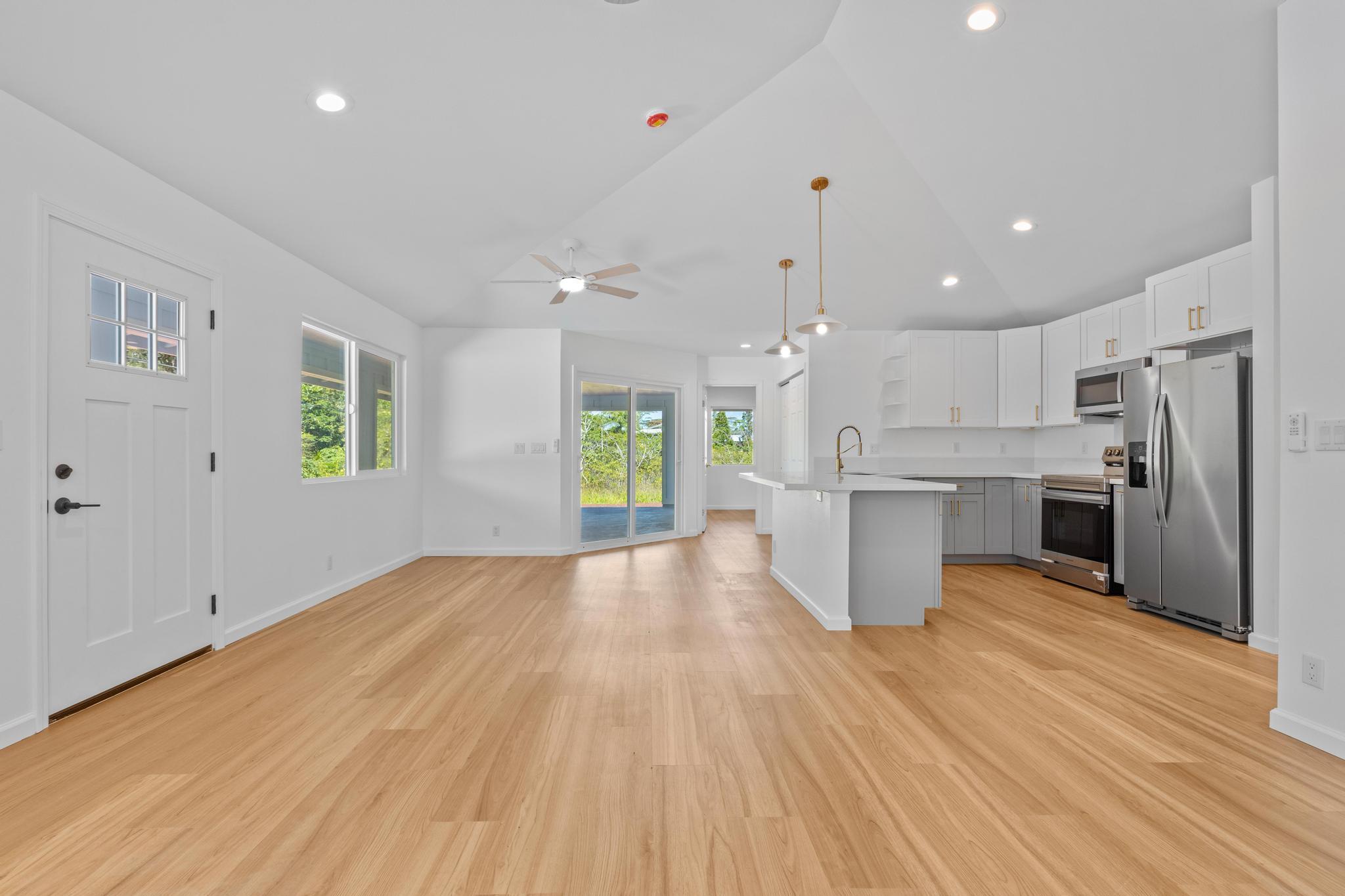 Your One Acre Canvas for Outdoor Living in Hawaiian Paradise Park. This property begins with a clear one acre lot, a true blank canvas for whatever outdoor lifestyle you envision. A brand new concrete driveway welcomes you, leading to a wide walkway and into a thoughtful design that prioritizes open air living. Instead of an enclosed garage, the builder created an open carport and wrapped the home with a continuous, covered concrete walkway. This design invites flow, functionality, and connection to the outdoors. The primary suite extends this vision with sliding doors that open onto a spacious, covered lanai. The perfect spot to relax, gather, or entertain. More concrete means less maintenance and more time to enjoy your outdoor experience. Toward the back of the acre, the land has already been mulched, setting you up for future possibilities. Whether it’s sustainable farming, creating a home garden, or simply enjoying the rich soil potential, the groundwork has been started for you. Altogether, the exterior living space spans an impressive 1,600 sq. ft. Inside, the home is the cherry on top. This 1334 sq. ft. split floor plan centers around the kitchen, offering balance between shared moments and privacy. Oversized bedrooms provide flexibility for a growing household or guests. The primary bedroom is especially generous, complete with a beautifully finished bathroom featuring custom tile work and a sleek glass shower door. Finally, location makes this home even more attractive. Situated in the upper section of Hawaiian Paradise Park, you’re just three streets from the main highway, a perfect blend of space, accessibility, and convenience. This home offers so many extras, but at its heart, it’s designed for the lifestyle that makes Hawaii living special: connection to the land, comfort indoors, and endless possibilities outside.