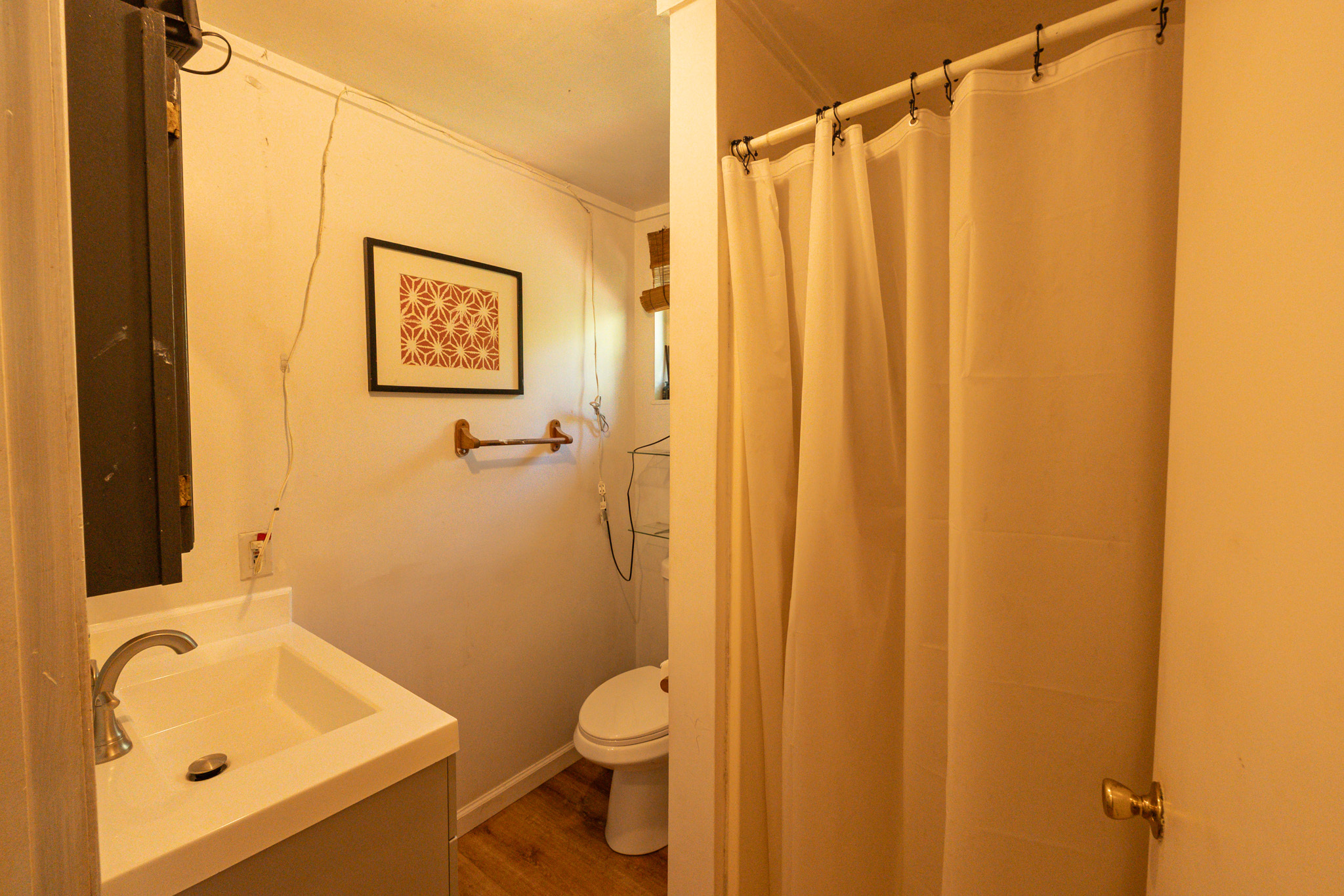 The back house offers a serene studio-style layout with new wiring, new breakers, and recent updates. Upstairs features a large soaking tub with peaceful garden views. Downstairs includes storage, a deep sink, a laundry area with a new GE washer and dryer, and covered parking with floodlights.