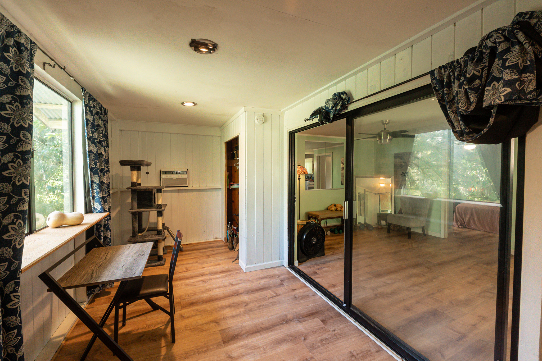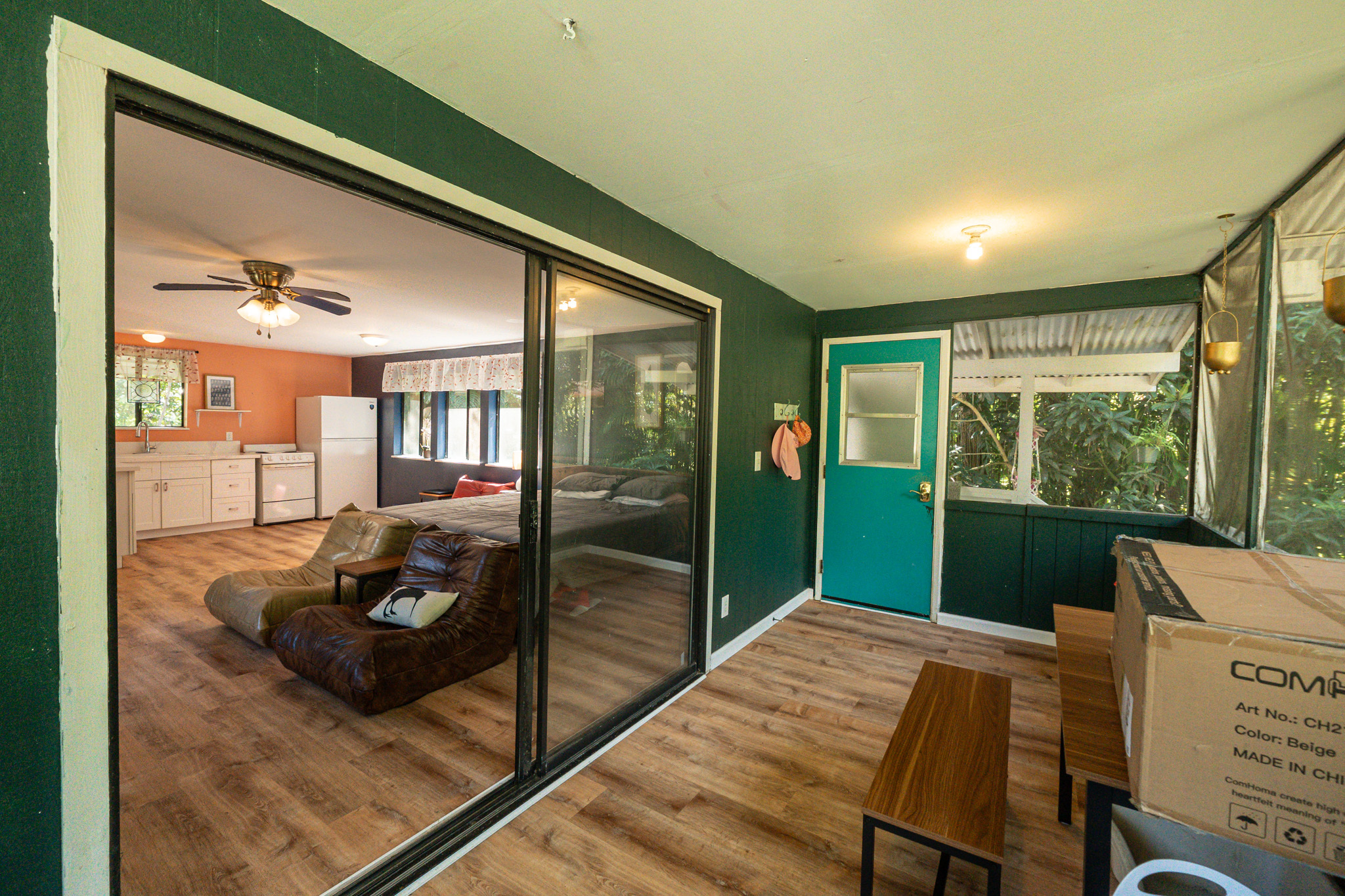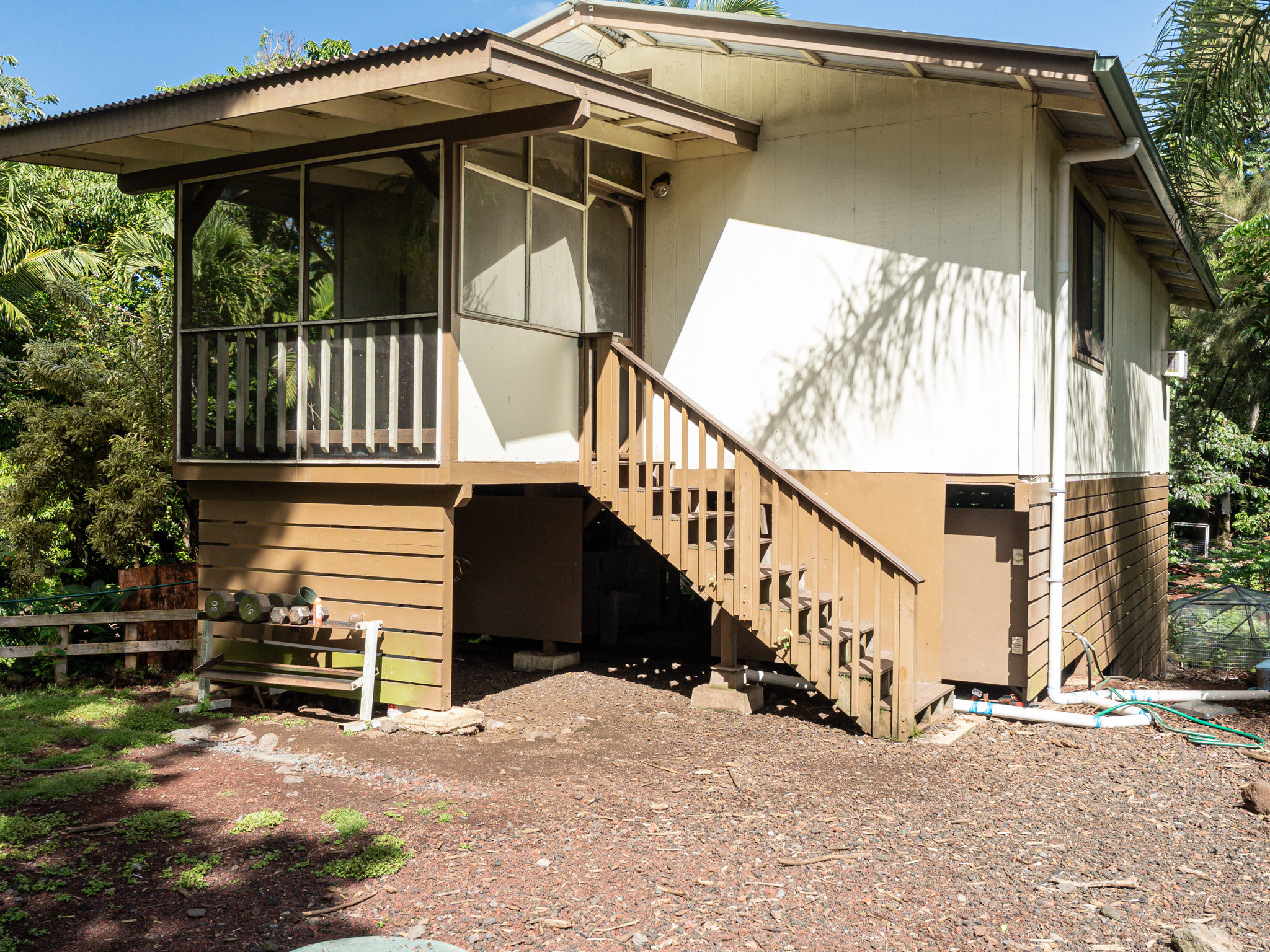 The front house was previously used as a Hosted Vacation Rental and has been newly remodeled with new cabinets, life-proof flooring, quartz countertops, a new fridge, and updated bathroom fixtures. It is fully furnished with appliances and décor and includes an enclosed lanai that can function as a second bedroom. Outdoor features include whimsical trees, a gazebo, a hammock chair, seamless metal gutters, and a fully fenced front garden area. A former 165,000-gallon pond has been filled with soil and planted with sweet potatoes. The surrounding garden space includes squash, opo, kanocha, lilikoi, papaya, chili peppers, and more, with approximately 12,000 sq ft of fenced garden area enriched by sixteen 12-yard loads of quality soil.