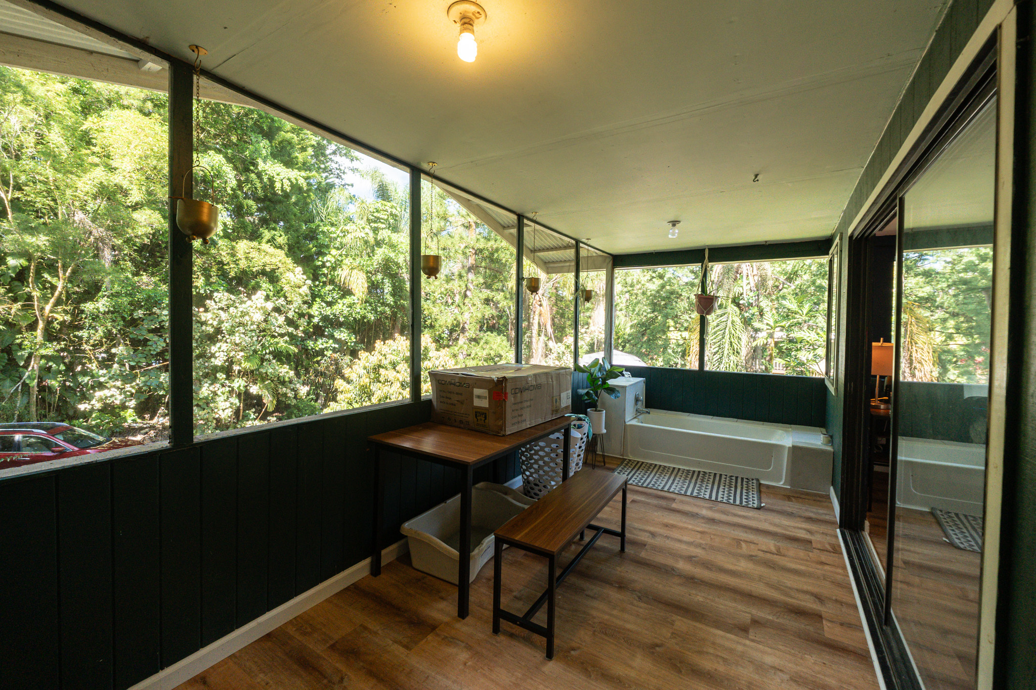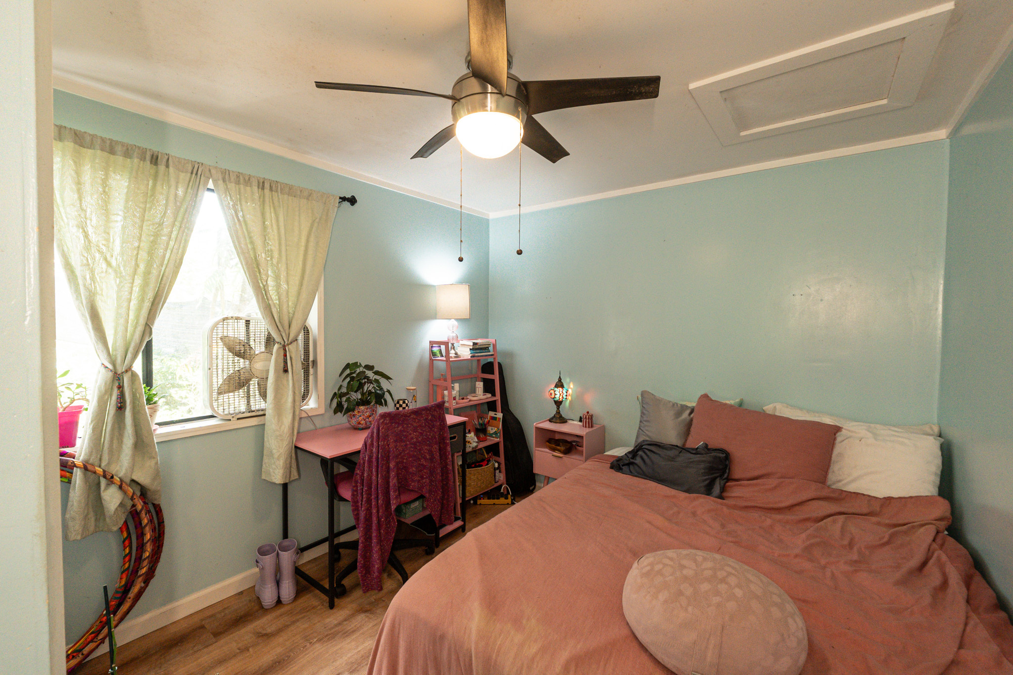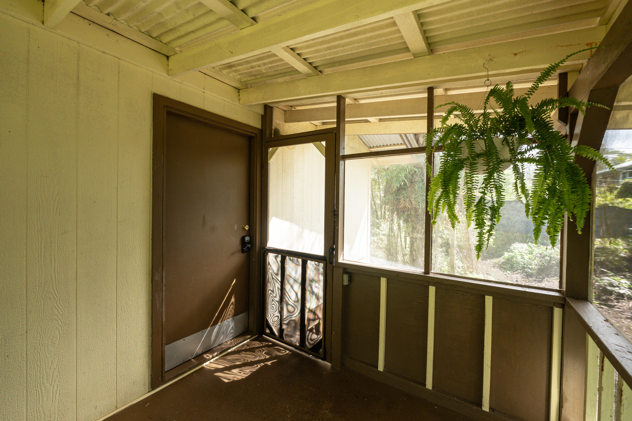 The front house was previously used as a Hosted Vacation Rental and has been newly remodeled with new cabinets, life-proof flooring, quartz countertops, a new fridge, and updated bathroom fixtures. It is fully furnished with appliances and décor and includes an enclosed lanai that can function as a second bedroom. Outdoor features include whimsical trees, a gazebo, a hammock chair, seamless metal gutters, and a fully fenced front garden area. A former 165,000-gallon pond has been filled with soil and planted with sweet potatoes. The surrounding garden space includes squash, opo, kanocha, lilikoi, papaya, chili peppers, and more, with approximately 12,000 sq ft of fenced garden area enriched by sixteen 12-yard loads of quality soil.