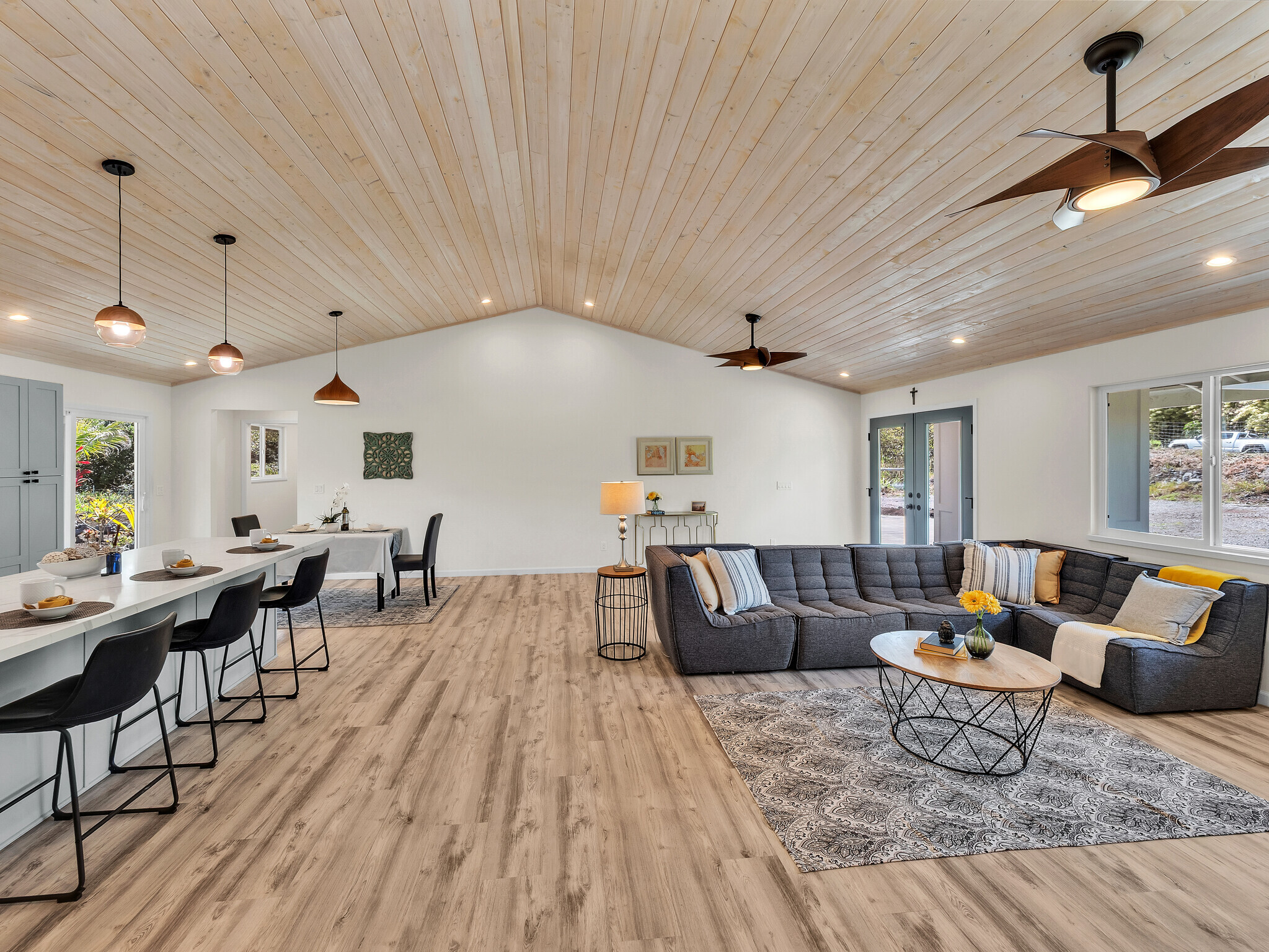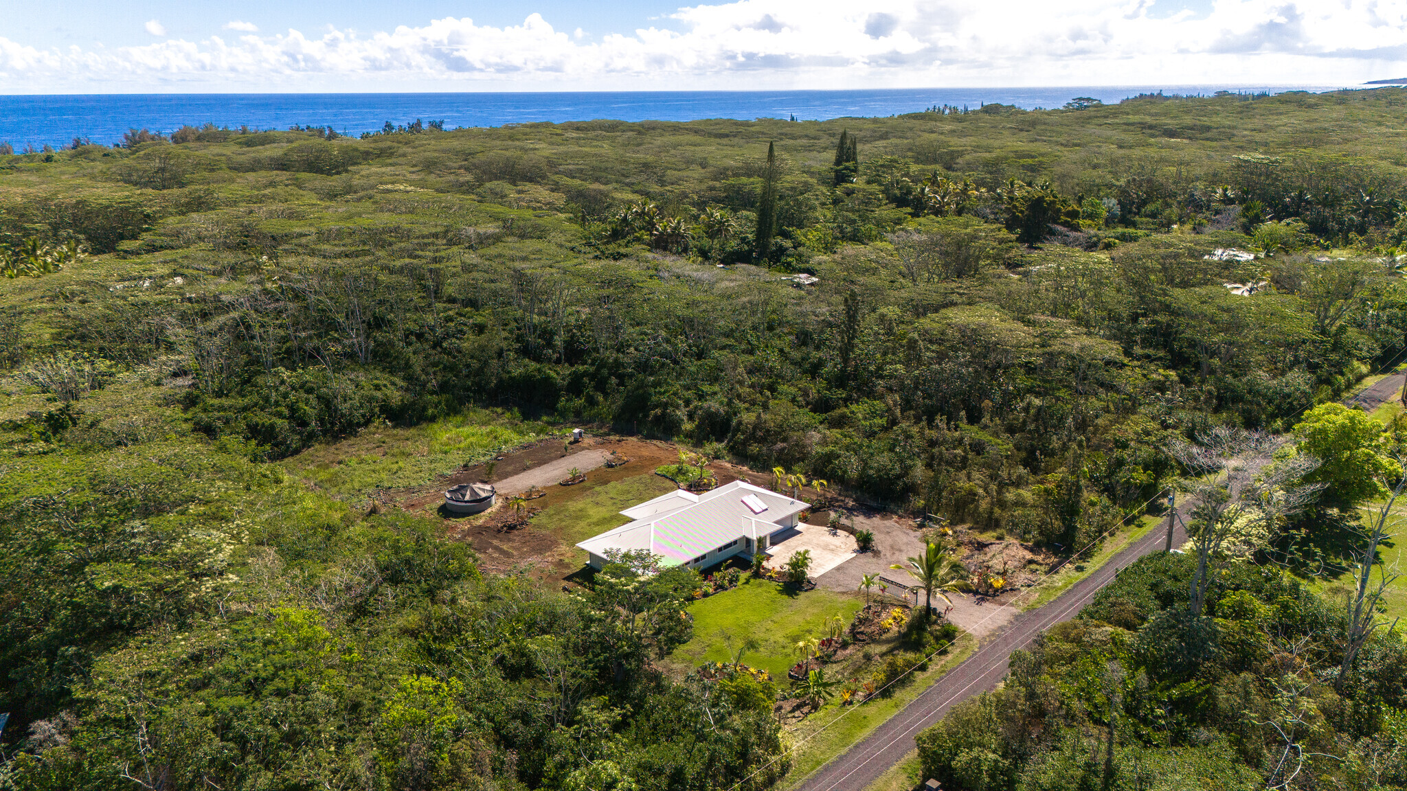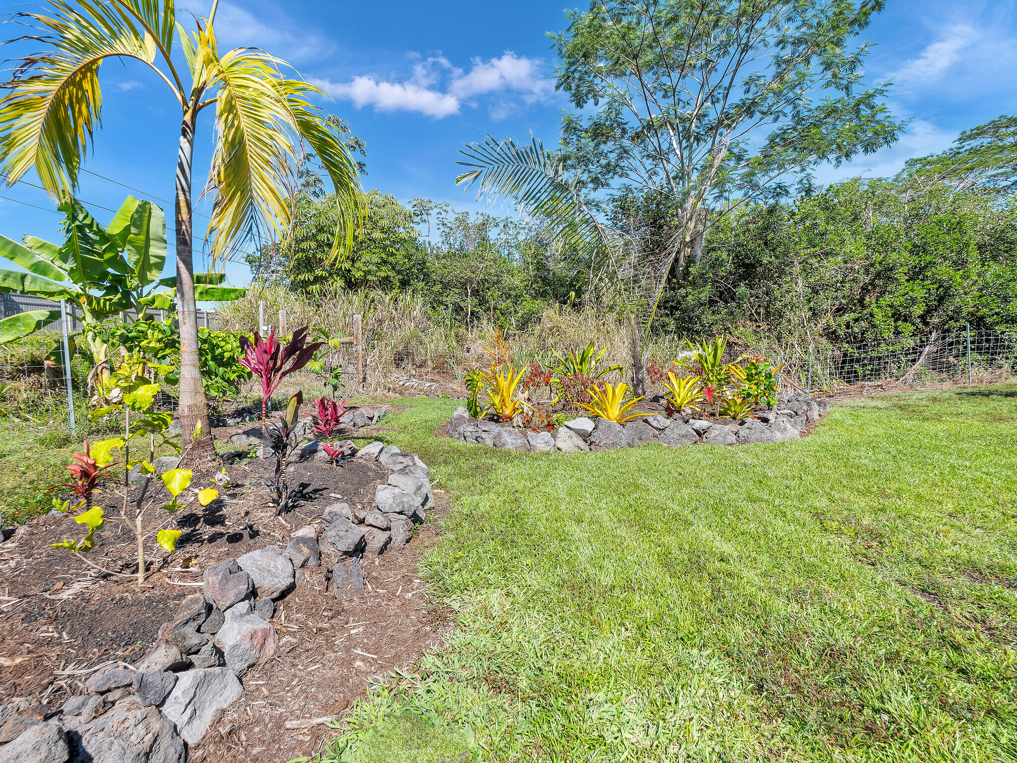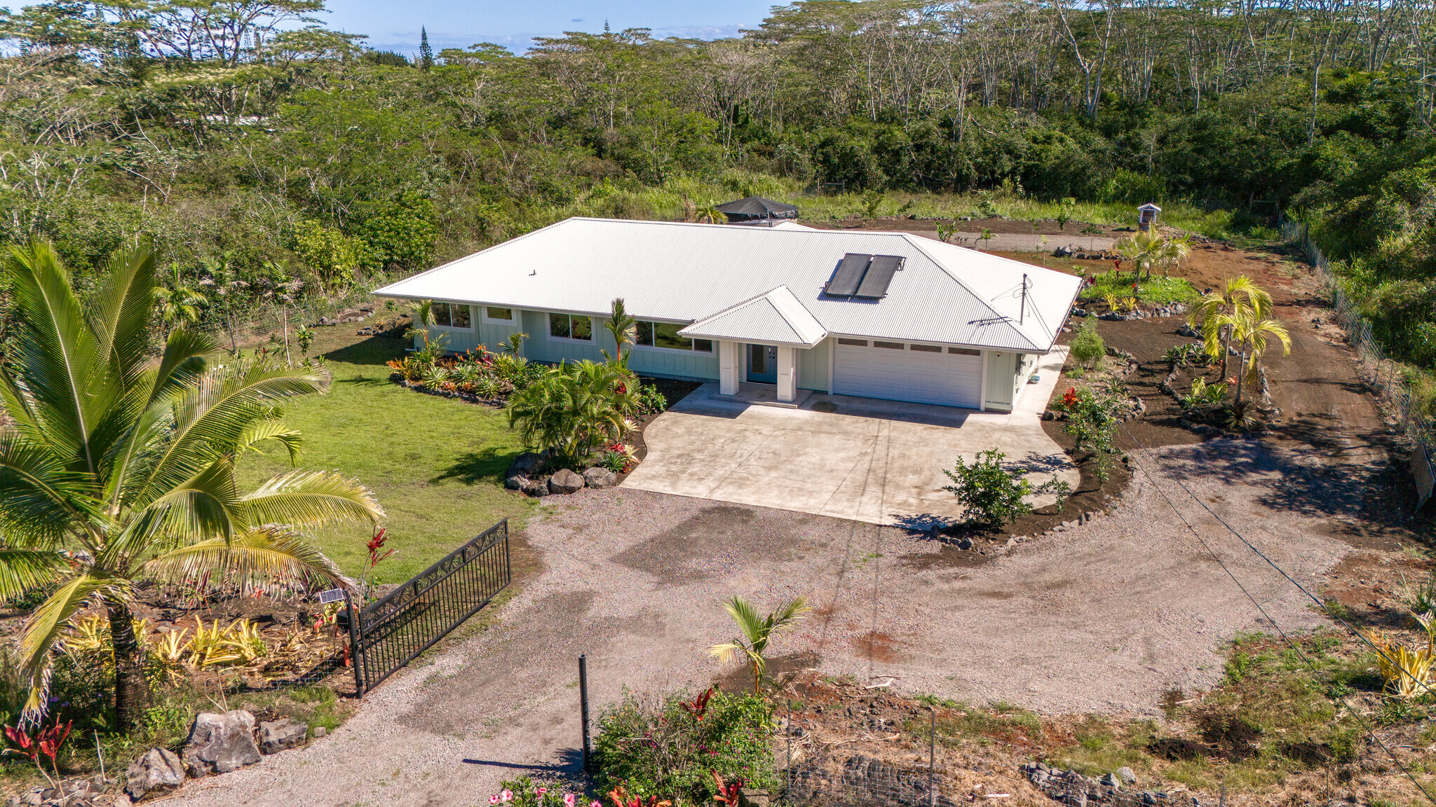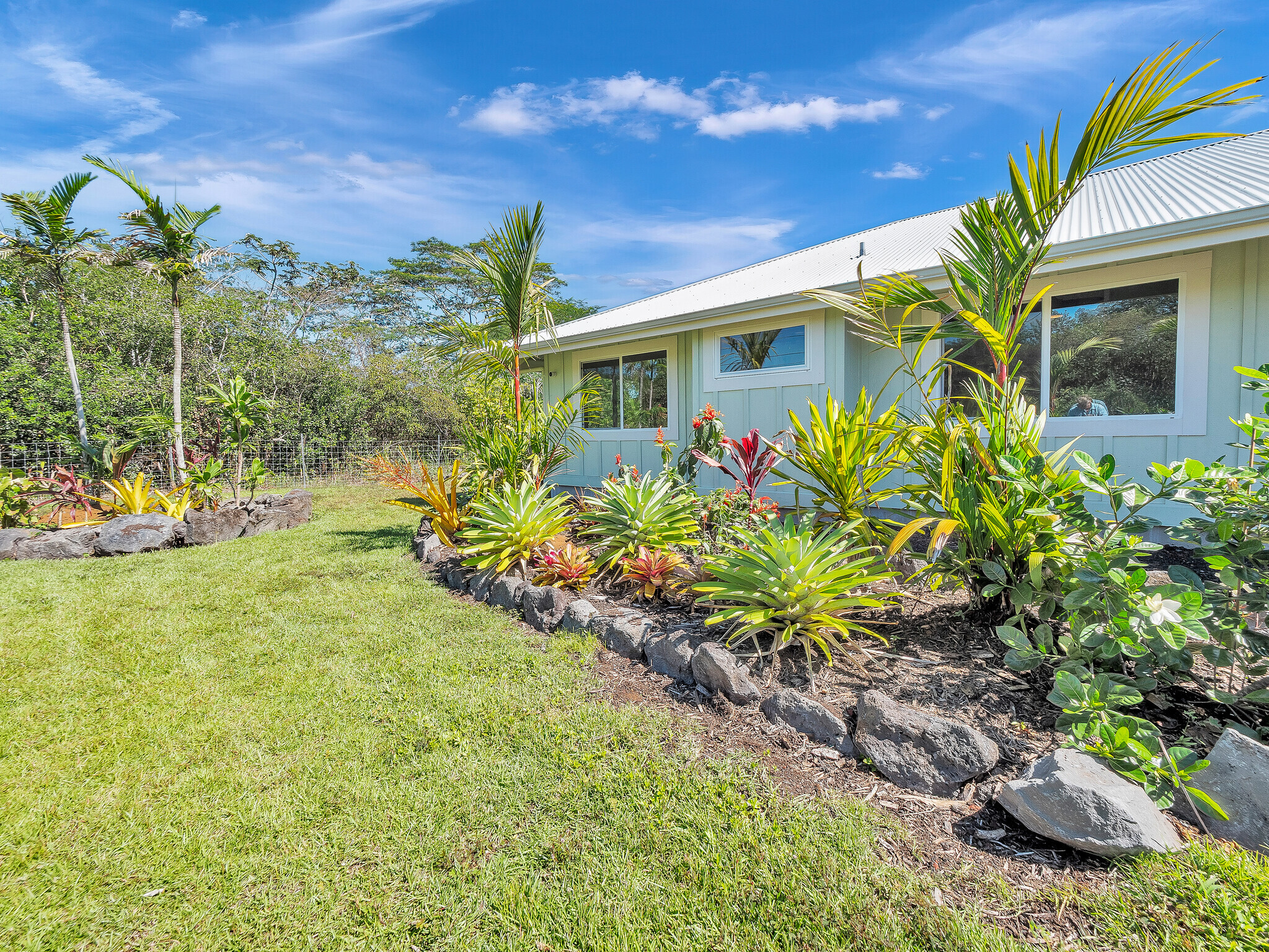 Hawaiian Paradise Park living on a fully fenced acre near the end of a low-traffic street. Contemporary single-level home with open-concept living, T&G ceilings, classy premium finishes, and expansive outdoor space. The large covered lanai extends the living area outdoors for gatherings, dining, or quiet evenings that flow into the backyard. The kitchen centers the home with a quartz island, hardwood shaker cabinetry, soft-close hardware, tiled backsplash, undermount sinks, and a full stainless appliance suite. Level 4 smooth walls provide a refined, flat finish - easy to maintain and elevates the modern look. The primary suite sits apart with its own hallway entry. Closet and bath are to one side, while the bedroom feels nearly stand-alone w/ direct lanai and backyard access. For Hawai?i’s climate, the home includes hurricane-rated low-e windows, insulated ceilings, ceiling fans throughout, and a white reflective roof oriented to capture cooling trade winds. The oversized two-car garage includes a half bath, convenient for use when working outdoors, or serving guests at outdoor gatherings. A gated entry opens to the one-acre parcel landscaped with fruit trees and ornamentals. Edibles include banana, star fruit, lime, dwarf lime, white pineapple, strawberry papaya, giant lilikoi, coconut palm, pomelo, oranges, tangerine, Raposa mango, and Ma‘afala breadfruit. Ornamentals include heliconia, plumeria, Tahitian gardenia, red ti, collectors’ ti, bromeliads, monstera, hybrid hibiscus, red sealing wax palms, and other palms for year-round color. Sustainable utility systems include a 10,000-gallon galvanized steel rainwater catchment, UV filtration, and solar-heated water. About 20 minutes to Hilo and 15 to Pahoa for shopping, dining, schools, and services. Nearby coastline access includes the Maku?u shoreline and the Ha‘ena (Shipman) Beach trail. Located near the dead end with nicer homes in the area.