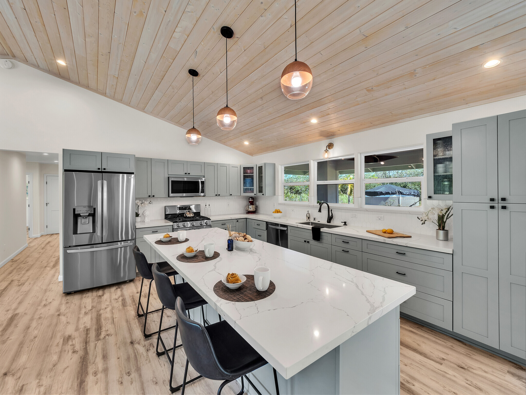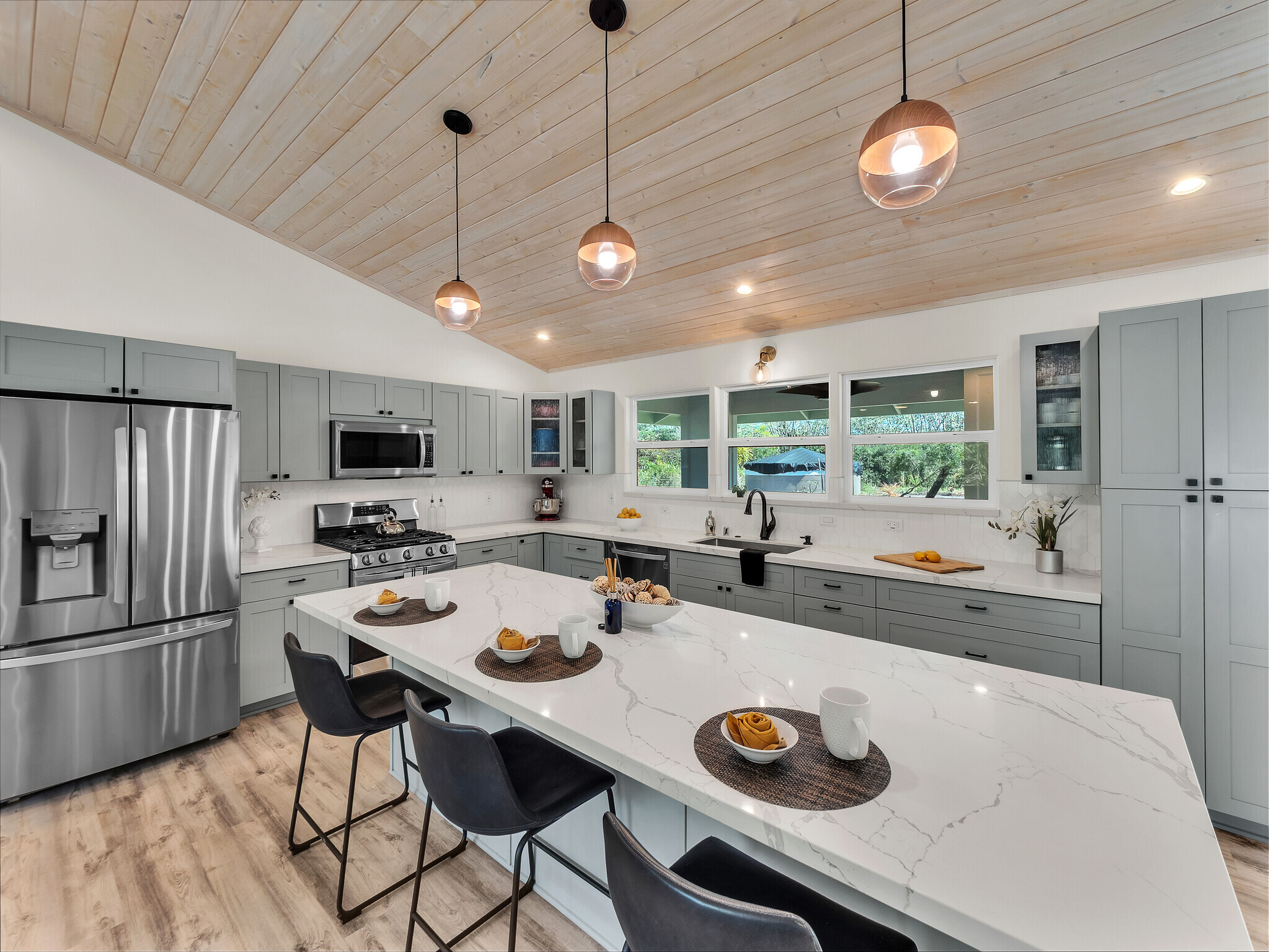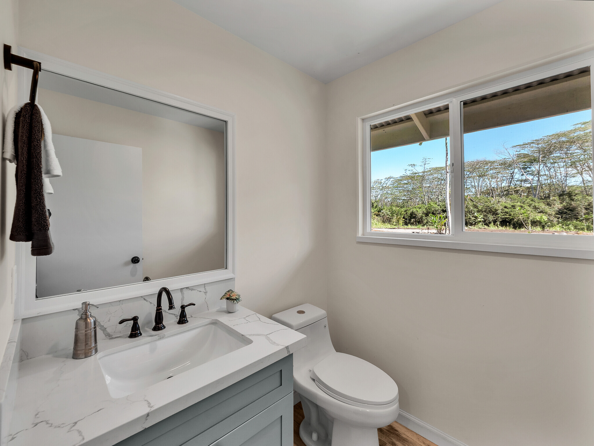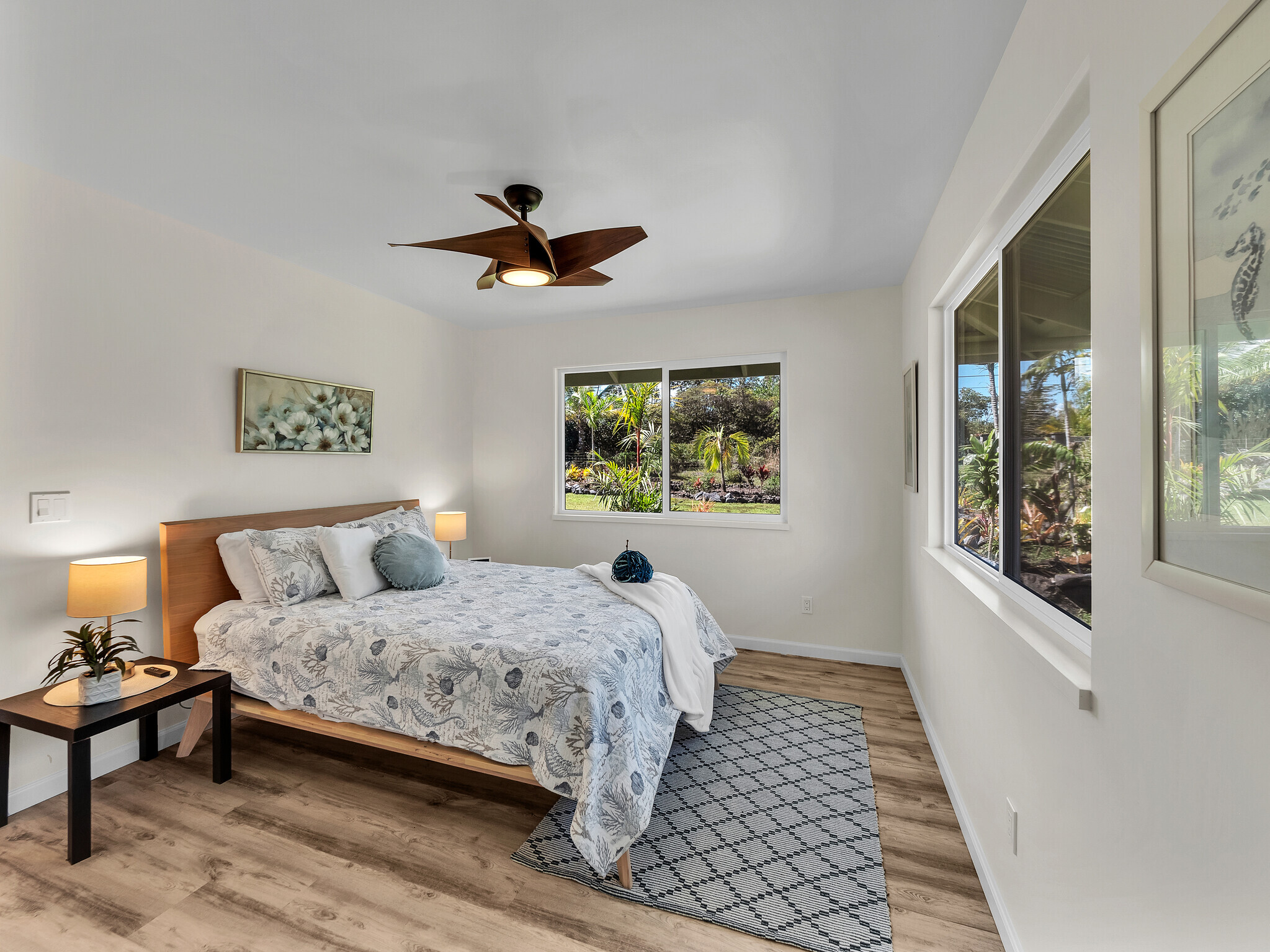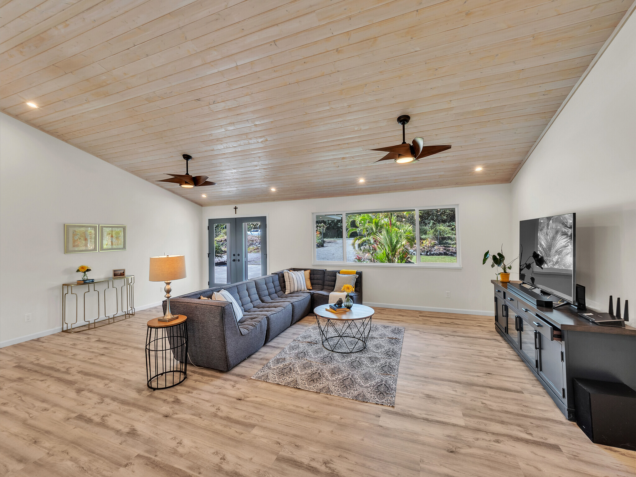 Hawaiian Paradise Park living on a fully fenced acre near the end of a low-traffic street. Contemporary single-level home with open-concept living, T&G ceilings, classy premium finishes, and expansive outdoor space. The large covered lanai extends the living area outdoors for gatherings, dining, or quiet evenings that flow into the backyard. The kitchen centers the home with a quartz island, hardwood shaker cabinetry, soft-close hardware, tiled backsplash, undermount sinks, and a full stainless appliance suite. Level 4 smooth walls provide a refined, flat finish - easy to maintain and elevates the modern look. The primary suite sits apart with its own hallway entry. Closet and bath are to one side, while the bedroom feels nearly stand-alone w/ direct lanai and backyard access. For Hawai?i’s climate, the home includes hurricane-rated low-e windows, insulated ceilings, ceiling fans throughout, and a white reflective roof oriented to capture cooling trade winds. The oversized two-car garage includes a half bath, convenient for use when working outdoors, or serving guests at outdoor gatherings. A gated entry opens to the one-acre parcel landscaped with fruit trees and ornamentals. Edibles include banana, star fruit, lime, dwarf lime, white pineapple, strawberry papaya, giant lilikoi, coconut palm, pomelo, oranges, tangerine, Raposa mango, and Ma‘afala breadfruit. Ornamentals include heliconia, plumeria, Tahitian gardenia, red ti, collectors’ ti, bromeliads, monstera, hybrid hibiscus, red sealing wax palms, and other palms for year-round color. Sustainable utility systems include a 10,000-gallon galvanized steel rainwater catchment, UV filtration, and solar-heated water. About 20 minutes to Hilo and 15 to Pahoa for shopping, dining, schools, and services. Nearby coastline access includes the Maku?u shoreline and the Ha‘ena (Shipman) Beach trail. Located near the dead end with nicer homes in the area.