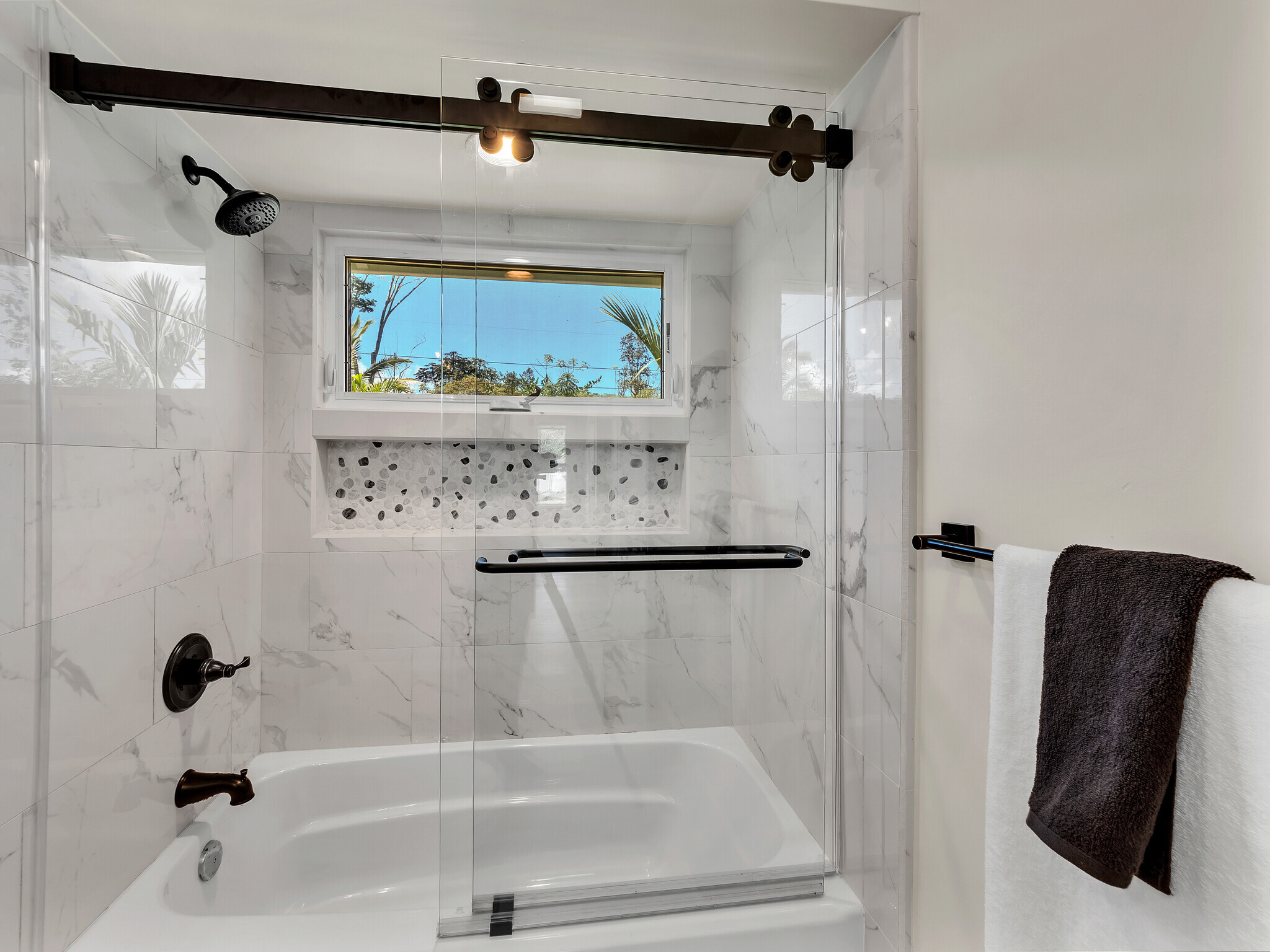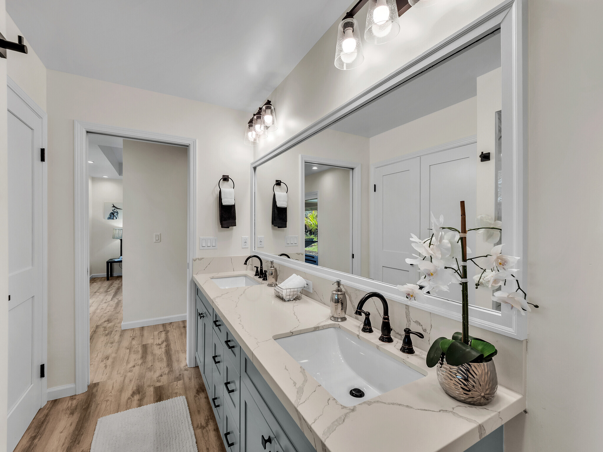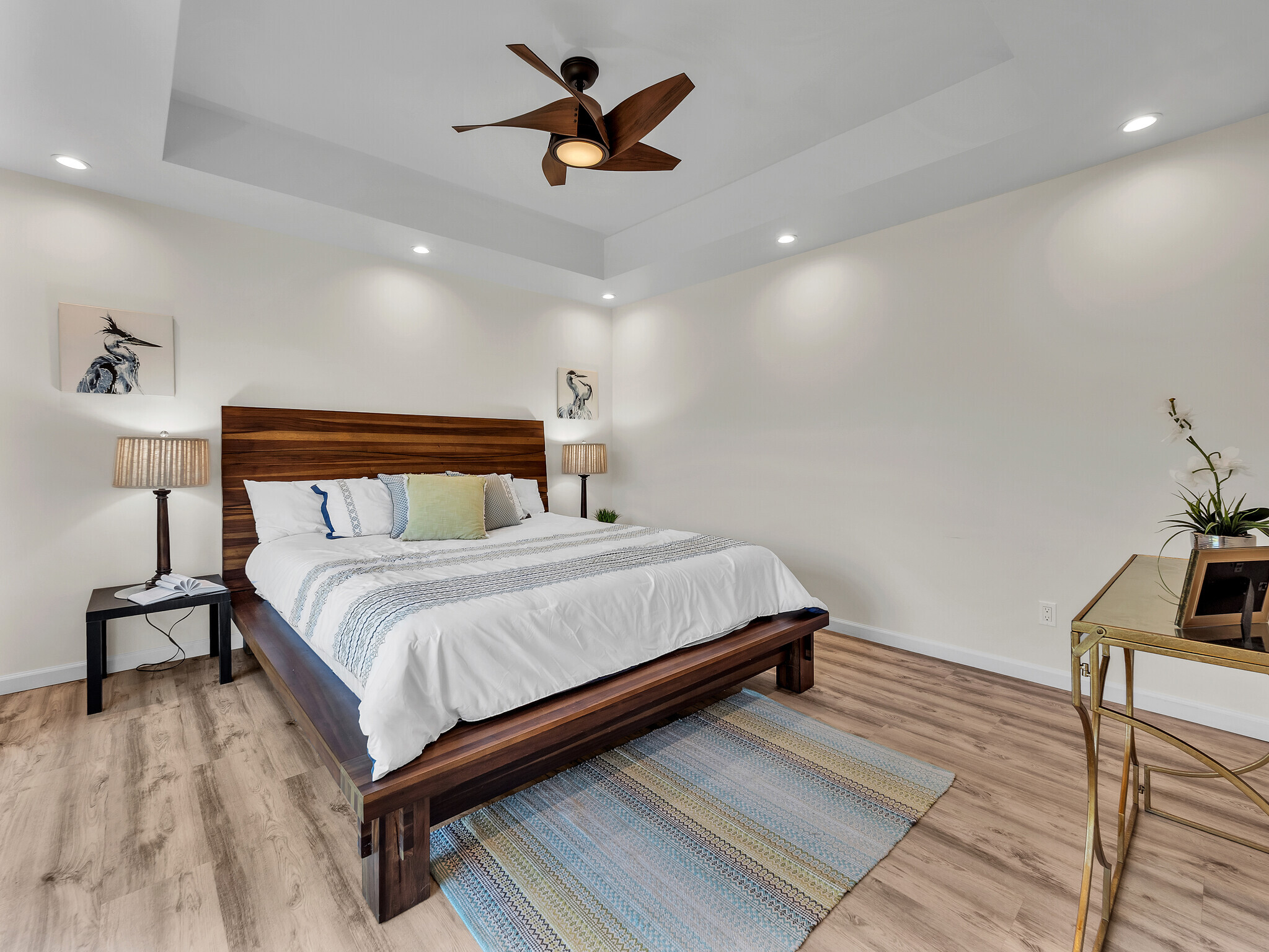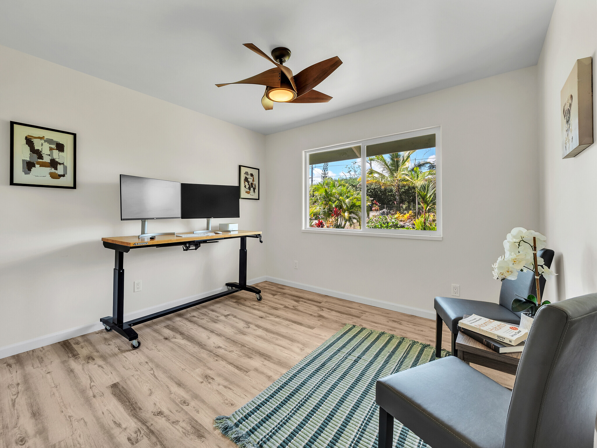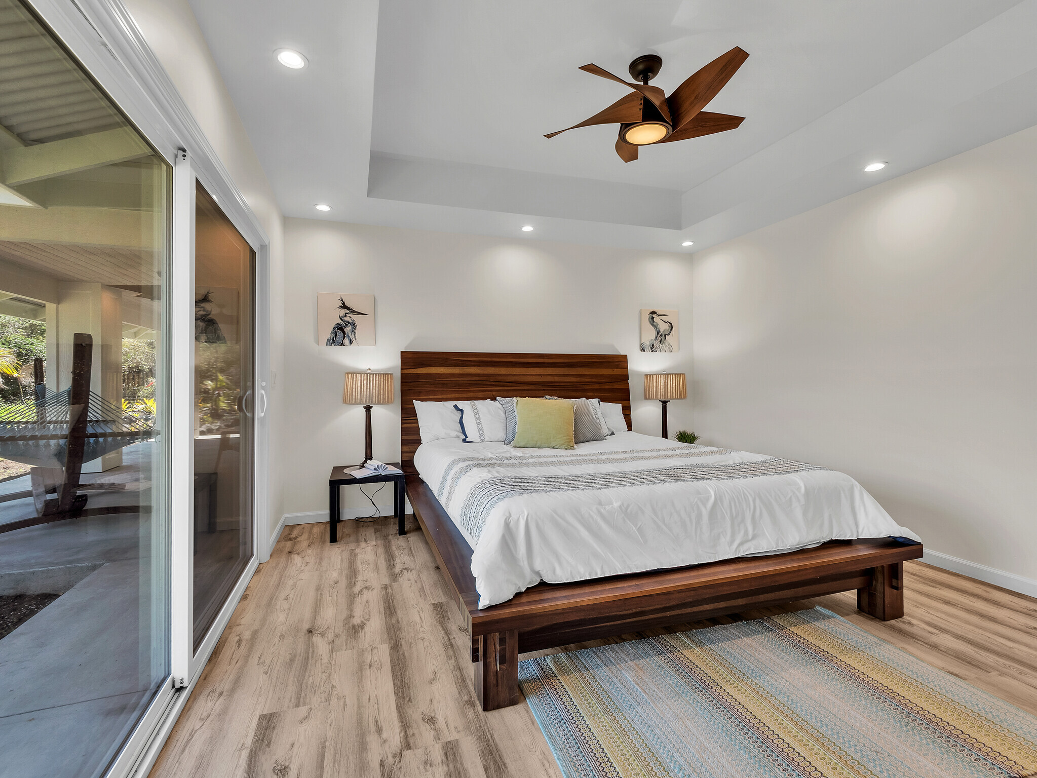 Hawaiian Paradise Park living on a fully fenced acre near the end of a low-traffic street. Contemporary single-level home with open-concept living, T&G ceilings, classy premium finishes, and expansive outdoor space. The large covered lanai extends the living area outdoors for gatherings, dining, or quiet evenings that flow into the backyard. The kitchen centers the home with a quartz island, hardwood shaker cabinetry, soft-close hardware, tiled backsplash, undermount sinks, and a full stainless appliance suite. Level 4 smooth walls provide a refined, flat finish - easy to maintain and elevates the modern look. The primary suite sits apart with its own hallway entry. Closet and bath are to one side, while the bedroom feels nearly stand-alone w/ direct lanai and backyard access. For Hawai?i’s climate, the home includes hurricane-rated low-e windows, insulated ceilings, ceiling fans throughout, and a white reflective roof oriented to capture cooling trade winds. The oversized two-car garage includes a half bath, convenient for use when working outdoors, or serving guests at outdoor gatherings. A gated entry opens to the one-acre parcel landscaped with fruit trees and ornamentals. Edibles include banana, star fruit, lime, dwarf lime, white pineapple, strawberry papaya, giant lilikoi, coconut palm, pomelo, oranges, tangerine, Raposa mango, and Ma‘afala breadfruit. Ornamentals include heliconia, plumeria, Tahitian gardenia, red ti, collectors’ ti, bromeliads, monstera, hybrid hibiscus, red sealing wax palms, and other palms for year-round color. Sustainable utility systems include a 10,000-gallon galvanized steel rainwater catchment, UV filtration, and solar-heated water. About 20 minutes to Hilo and 15 to Pahoa for shopping, dining, schools, and services. Nearby coastline access includes the Maku?u shoreline and the Ha‘ena (Shipman) Beach trail. Located near the dead end with nicer homes in the area.
