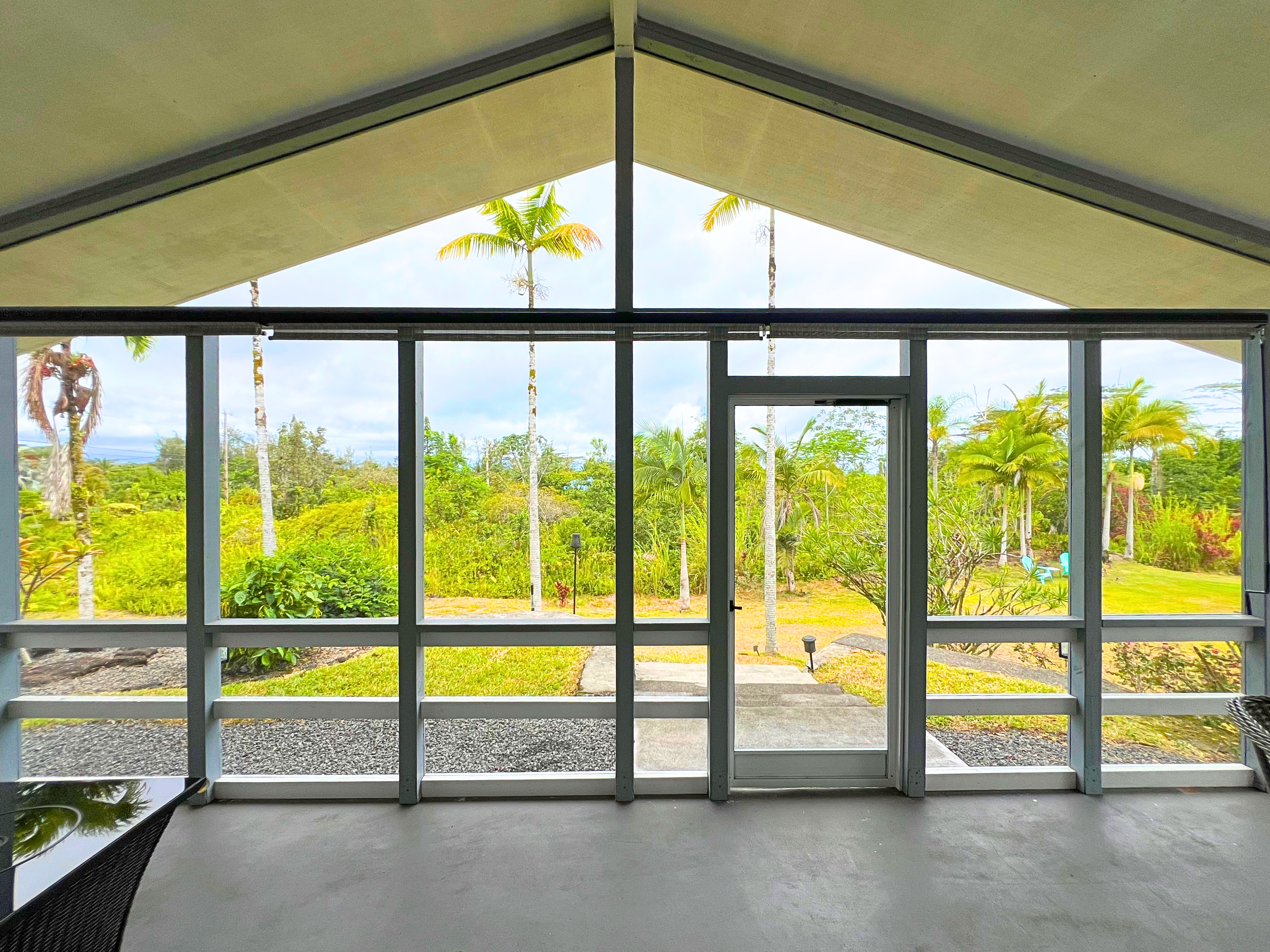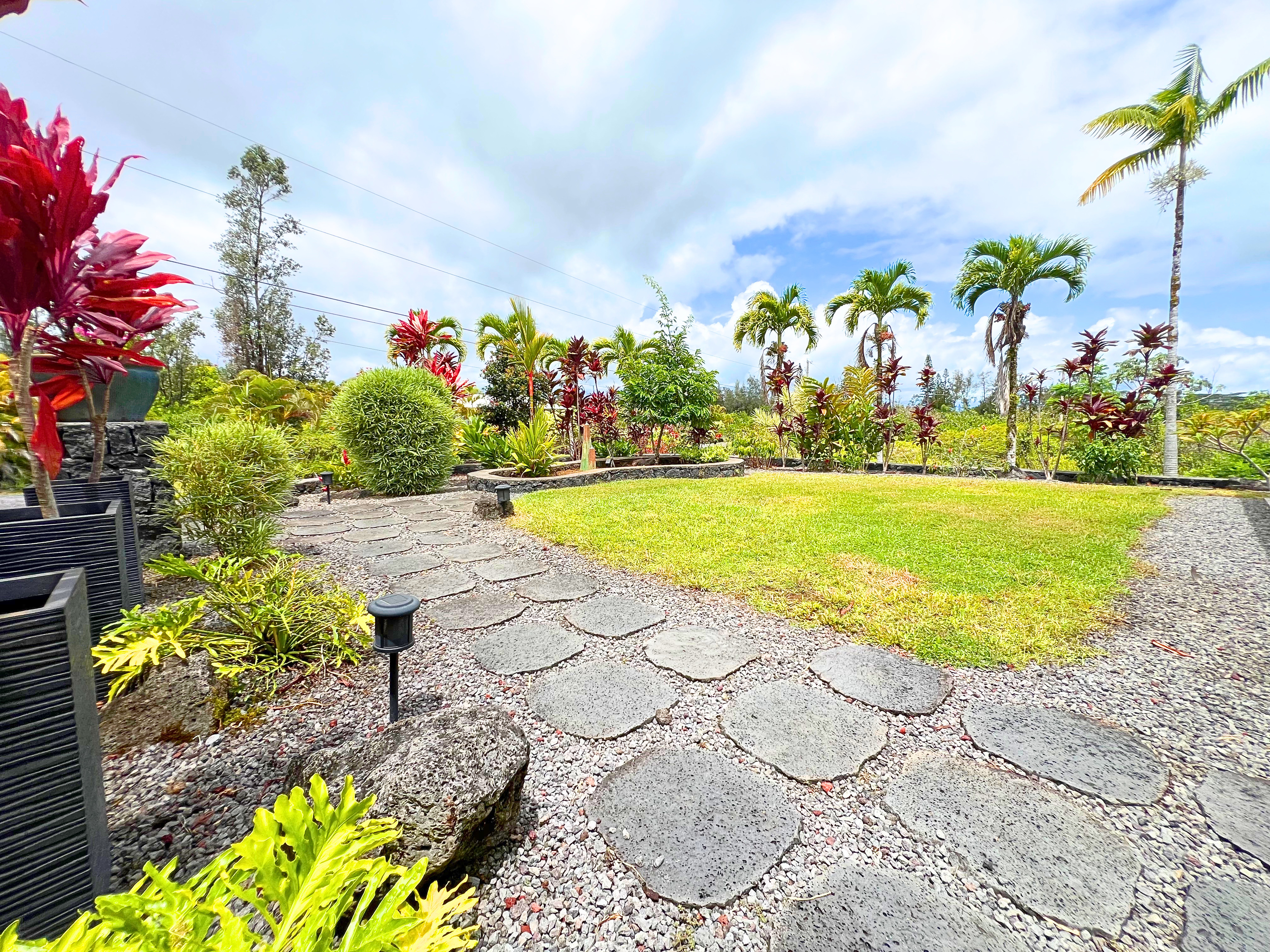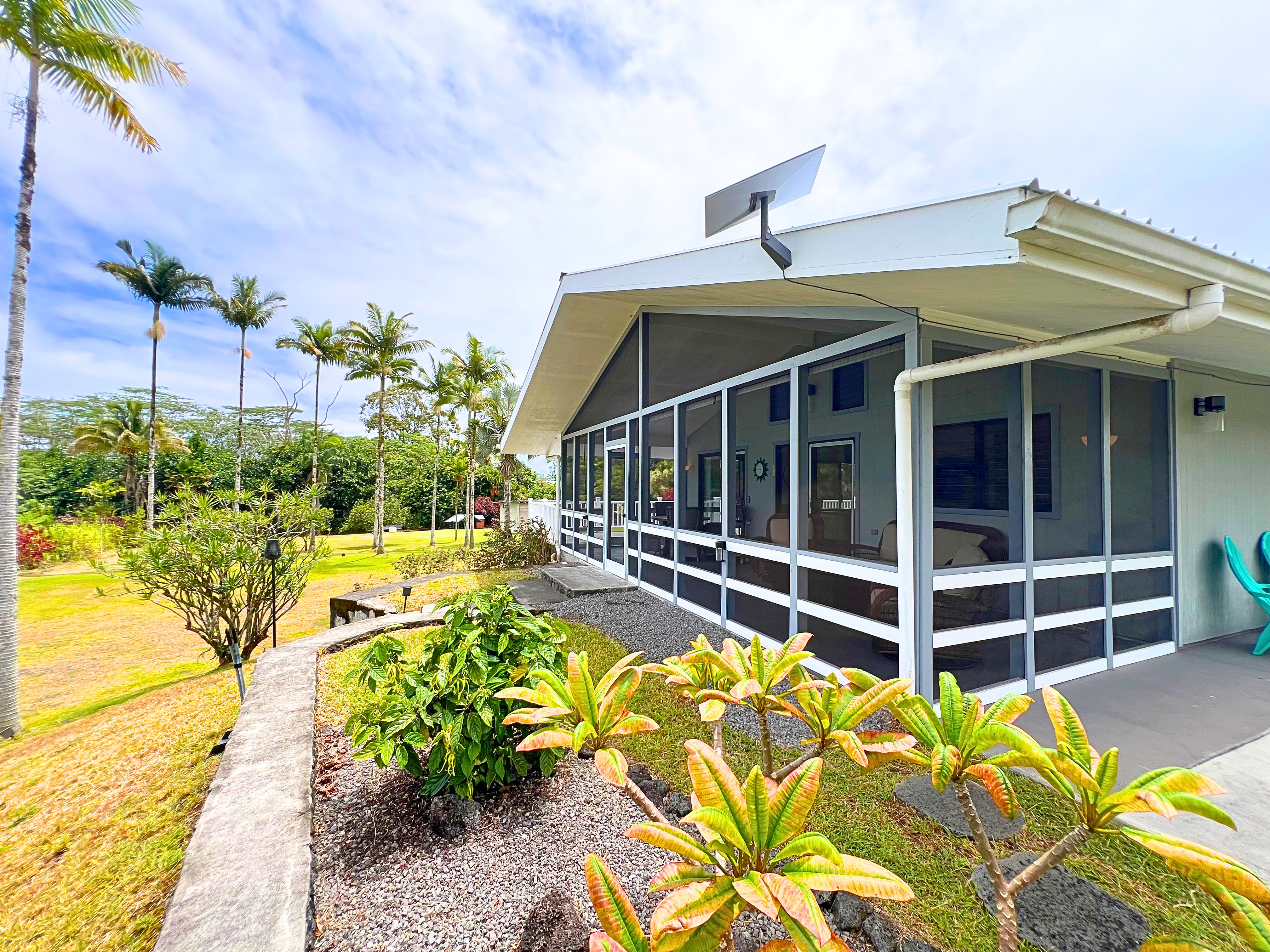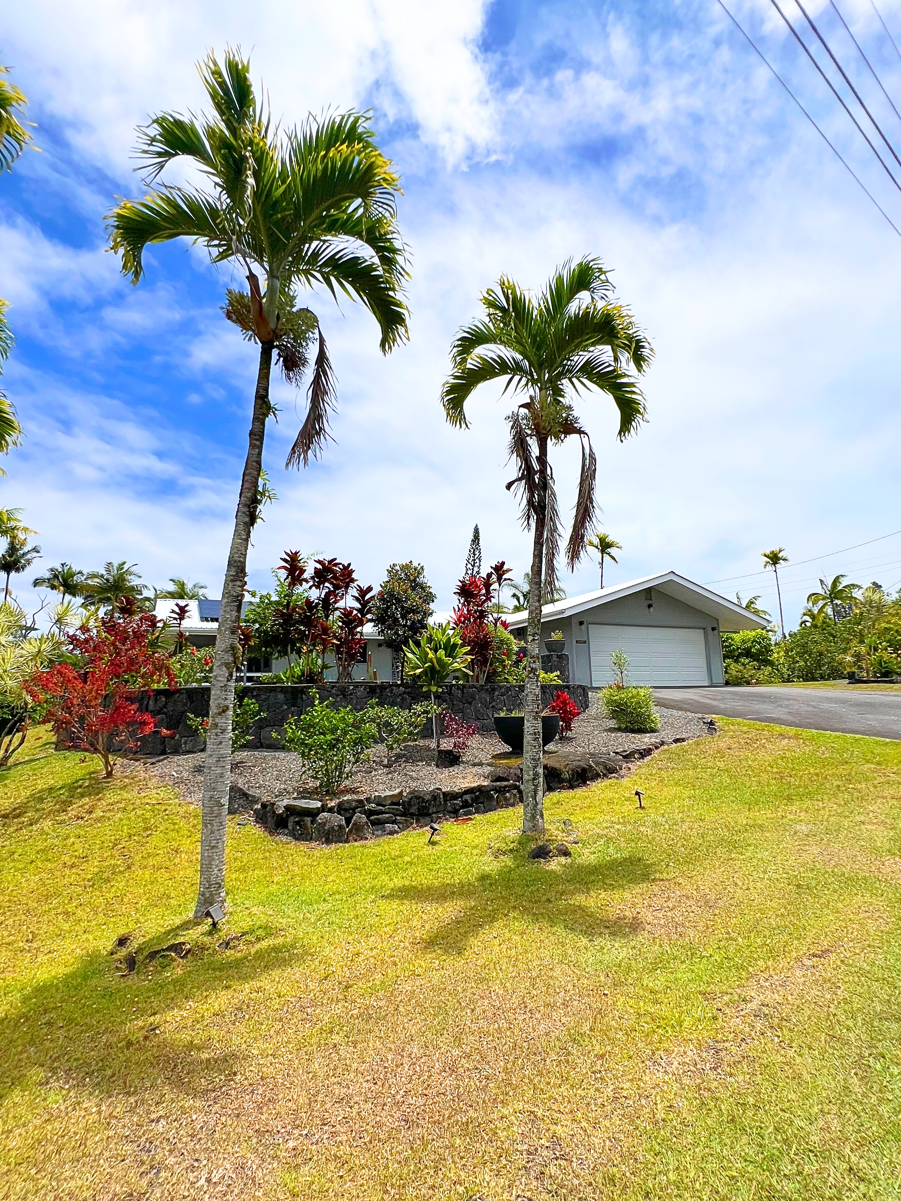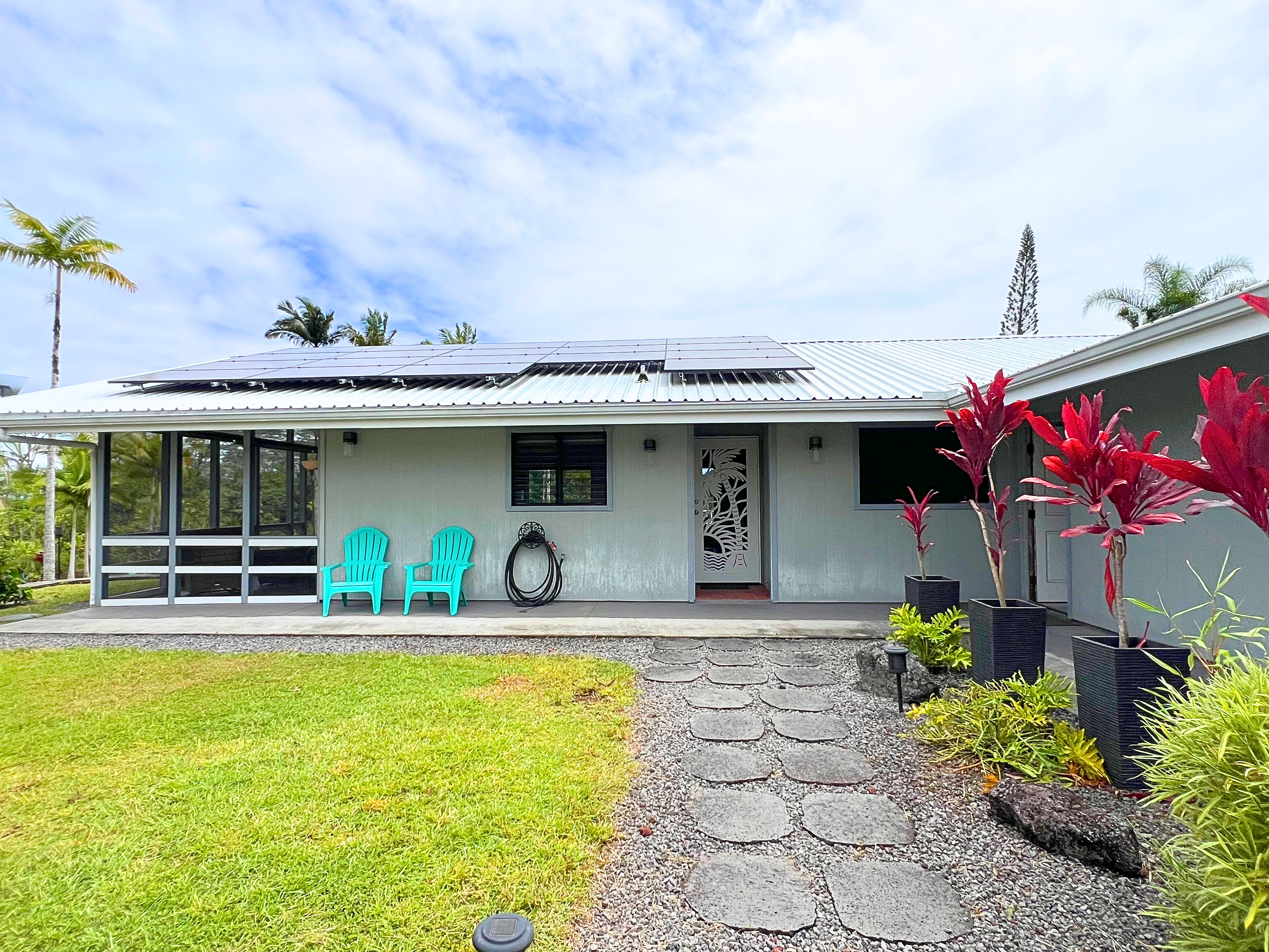 Beautifully upgraded 3-bedroom, 2.5-bath home situated on a full acre in Hawaiian Paradise Park. This well-maintained single-level property offers 1,384 square feet of living space and combines modern updates with peaceful island living. Recent 2023 upgrades include a new SunRun solar system (leased), a brand-new roof, an 80-gallon hybrid hot water heater, and a fully screened-in lanai–perfect for relaxing or entertaining while enjoying garden and mountain views. The open-concept floor plan features vaulted ceilings, abundant natural light, and sliding glass doors that open to a spacious, partially wraparound lanai. The remodeled kitchen is equipped with LG stainless steel appliances, a large peninsula with bar seating, and generous cabinetry. Durable life-proof flooring, wood trim accents, and built-in shelving add both charm and function throughout the home. Wide doorways and hallways provide wheelchair accessibility. The attached two-car garage includes a half bath, a utility sink, a storage room, and an air compressor, making it ideal for a home workshop. Additional improvements include new lighting, faucets, sinks, door hardware, window coverings, and a new front entrance door. A fully fenced dog run and attractively landscaped yard with decorative lava rock walls and walkways add both privacy and curb appeal. Water is supplied by a 10,000-gallon enclosed catchment tank paired with an Uncle Tilo’s UV filtration system and pump. The home is serviced by electricity, phone, cable, and a cesspool system. Zoned A-1A and sold fee simple. Partially furnished and move-in ready. Pre-home inspection available upon request. Seller is offering a $10,000 credit with full-price offer. Located just a short drive from Hilo, Pahoa, beaches, shopping, and the airport, this home offers the perfect blend of privacy and convenience in one of East Hawai‘i’s most desirable communities.