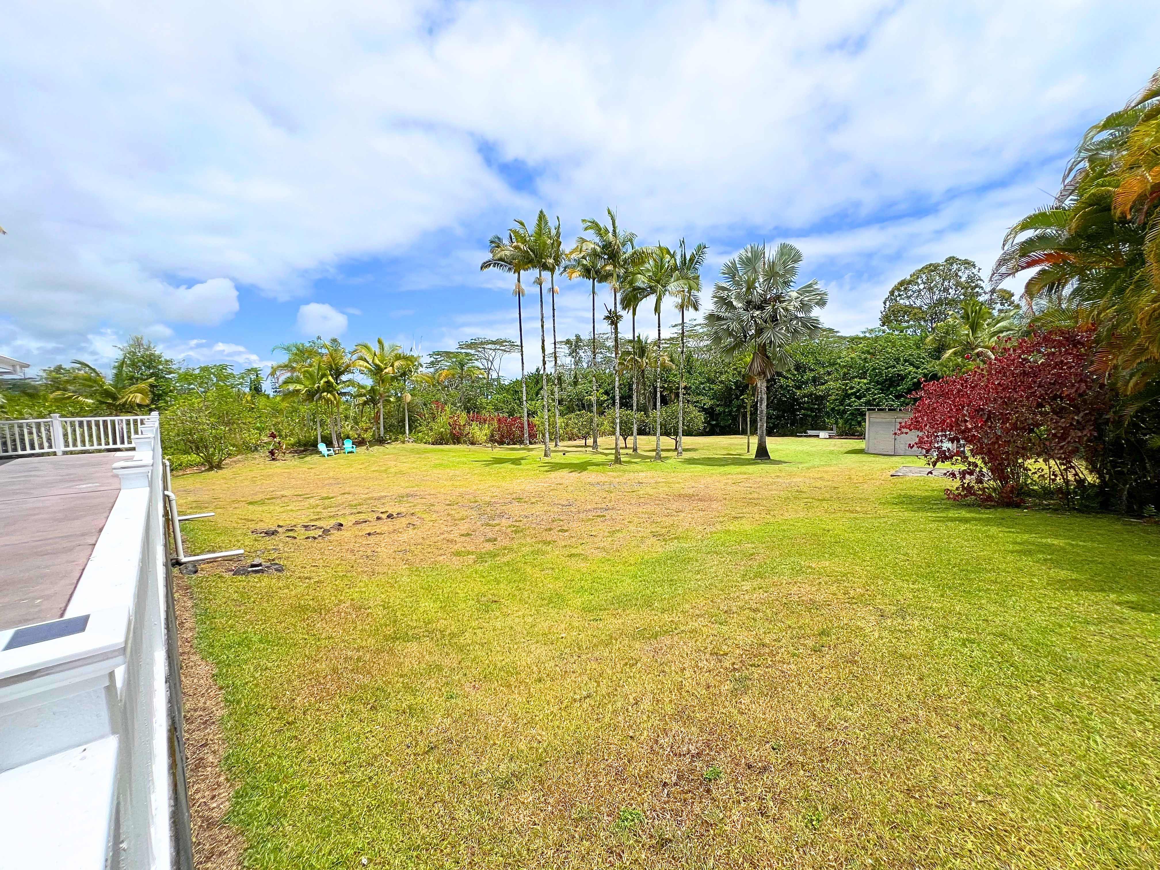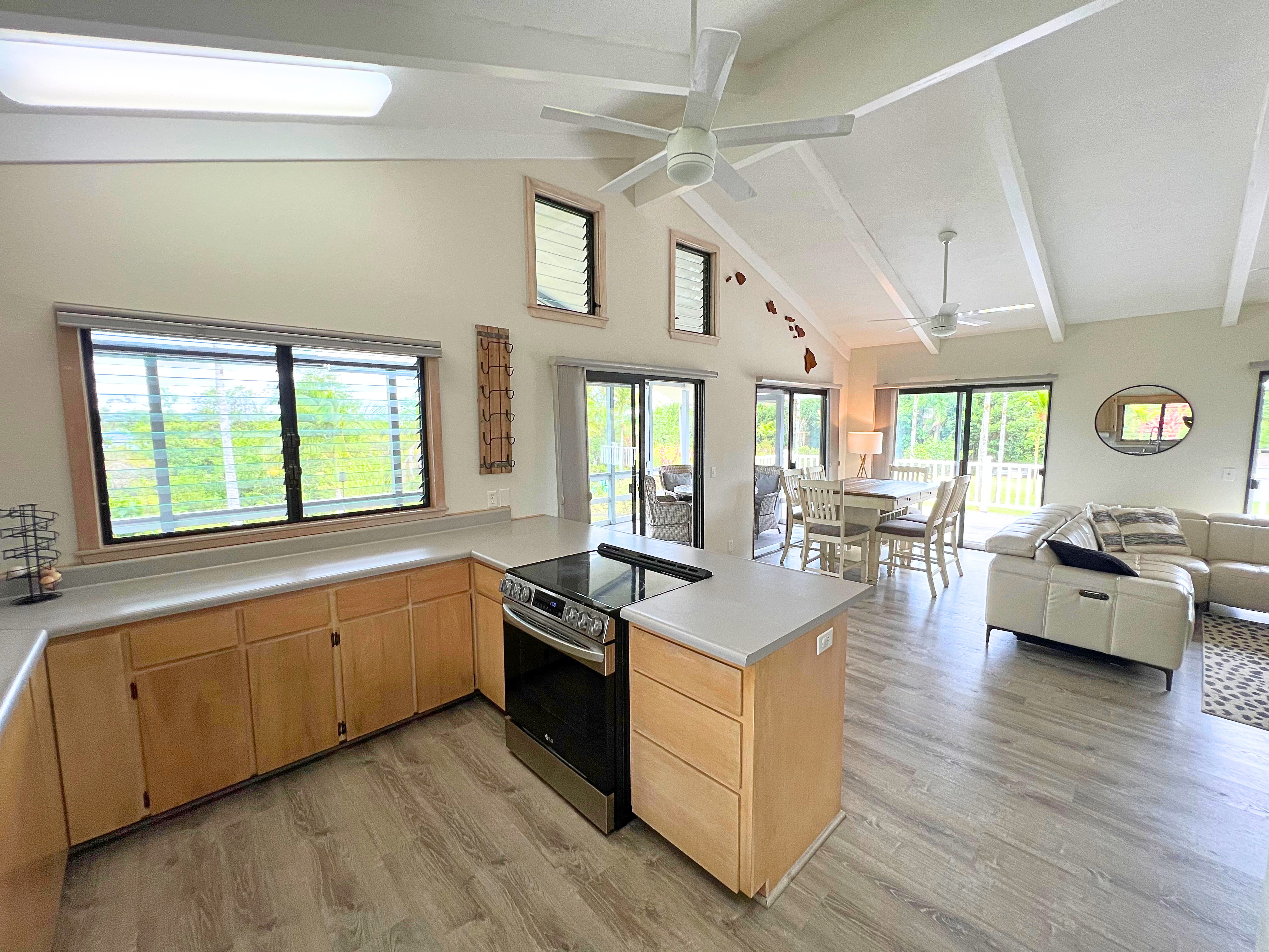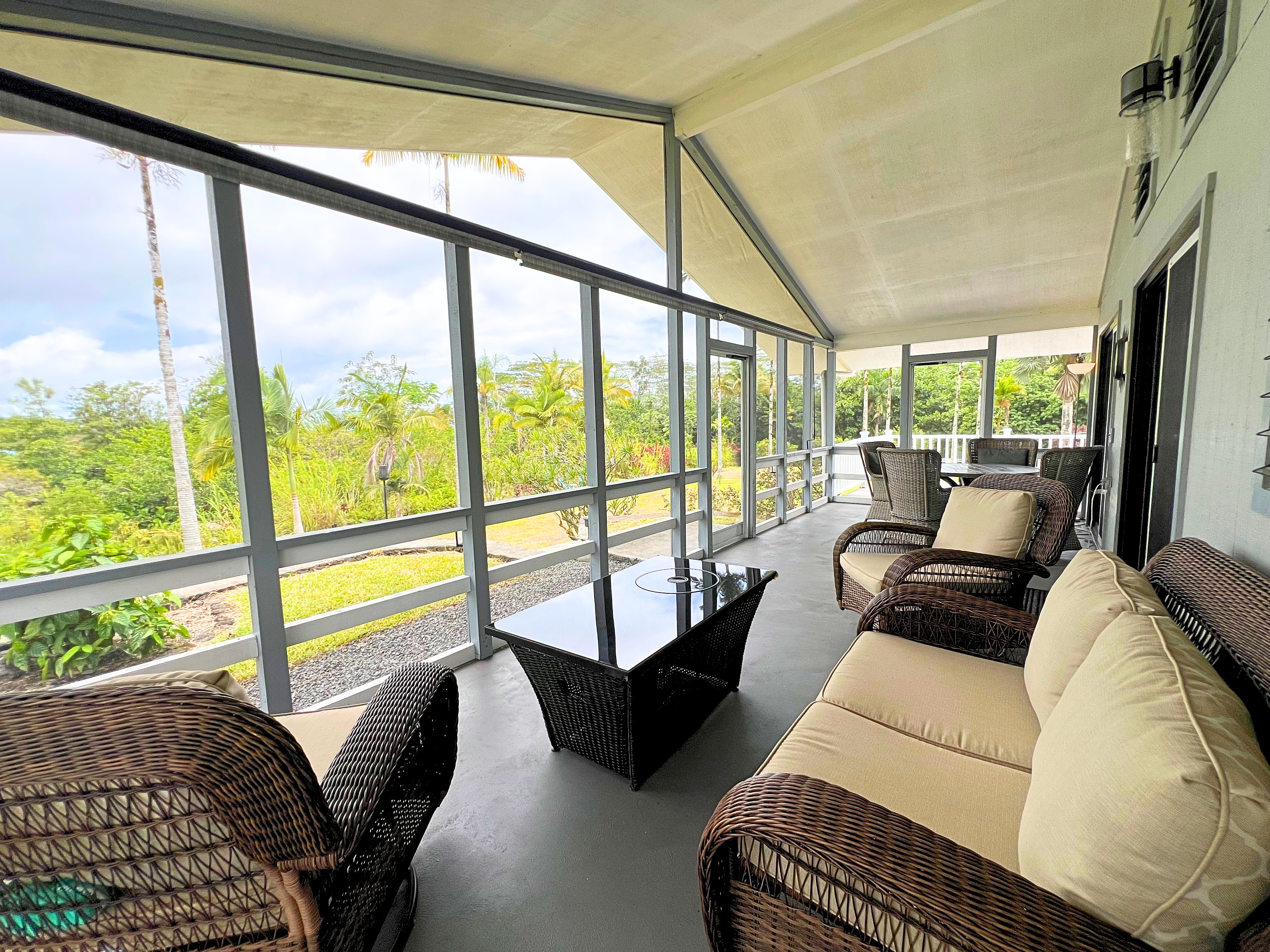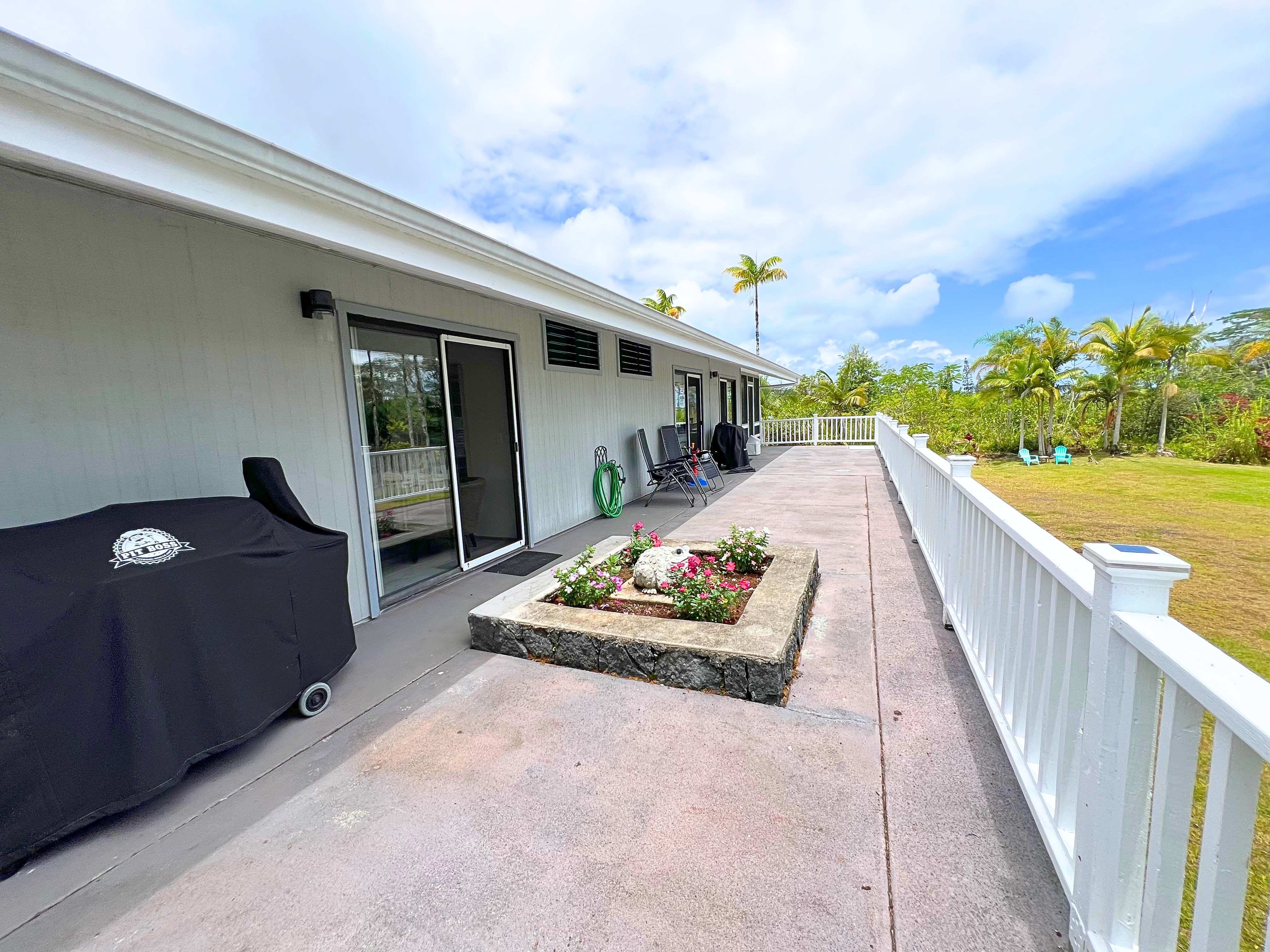 Beautifully upgraded 3-bedroom, 2.5-bath home situated on a full acre in Hawaiian Paradise Park. This well-maintained single-level property offers 1,384 square feet of living space and combines modern updates with peaceful island living. Recent 2023 upgrades include a new SunRun solar system (leased), a brand-new roof, an 80-gallon hybrid hot water heater, and a fully screened-in lanai–perfect for relaxing or entertaining while enjoying garden and mountain views. The open-concept floor plan features vaulted ceilings, abundant natural light, and sliding glass doors that open to a spacious, partially wraparound lanai. The remodeled kitchen is equipped with LG stainless steel appliances, a large peninsula with bar seating, and generous cabinetry. Durable life-proof flooring, wood trim accents, and built-in shelving add both charm and function throughout the home. Wide doorways and hallways provide wheelchair accessibility. The attached two-car garage includes a half bath, a utility sink, a storage room, and an air compressor, making it ideal for a home workshop. Additional improvements include new lighting, faucets, sinks, door hardware, window coverings, and a new front entrance door. A fully fenced dog run and attractively landscaped yard with decorative lava rock walls and walkways add both privacy and curb appeal. Water is supplied by a 10,000-gallon enclosed catchment tank paired with an Uncle Tilo’s UV filtration system and pump. The home is serviced by electricity, phone, cable, and a cesspool system. Zoned A-1A and sold fee simple. Partially furnished and move-in ready. Pre-home inspection available upon request. Seller is offering a $10,000 credit with full-price offer. Located just a short drive from Hilo, Pahoa, beaches, shopping, and the airport, this home offers the perfect blend of privacy and convenience in one of East Hawai‘i’s most desirable communities.